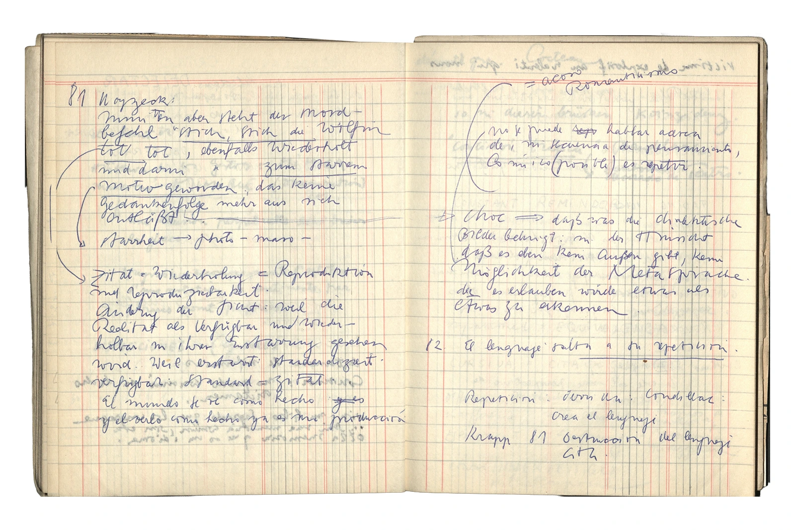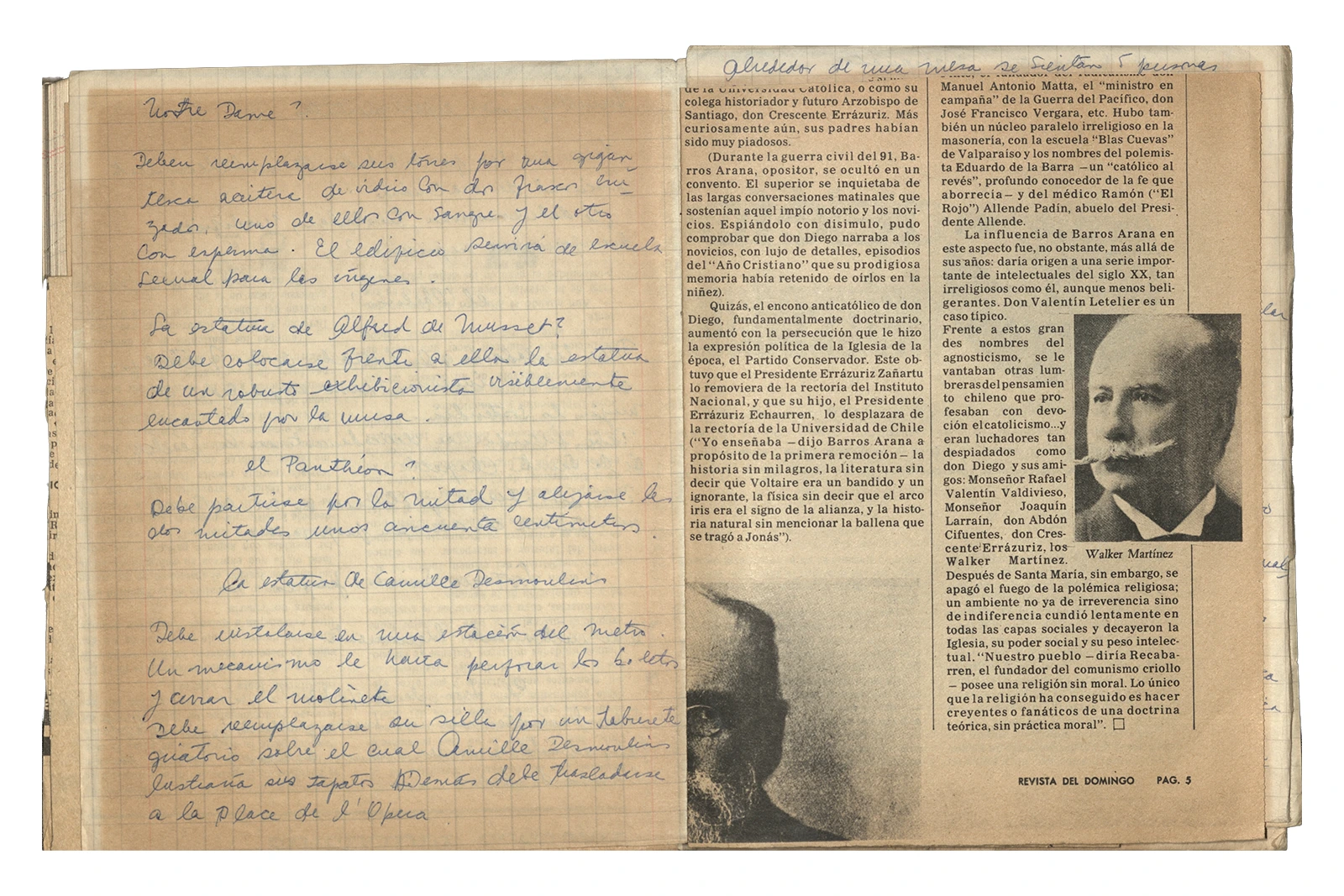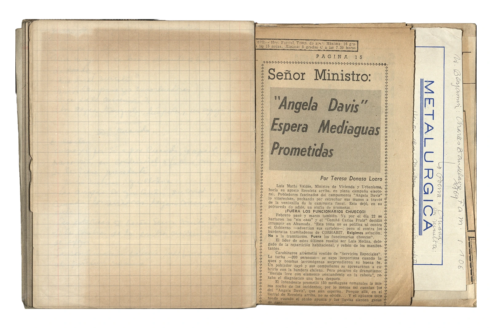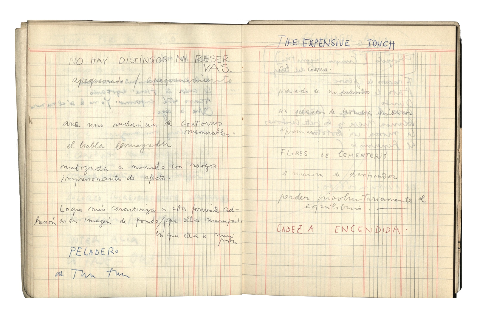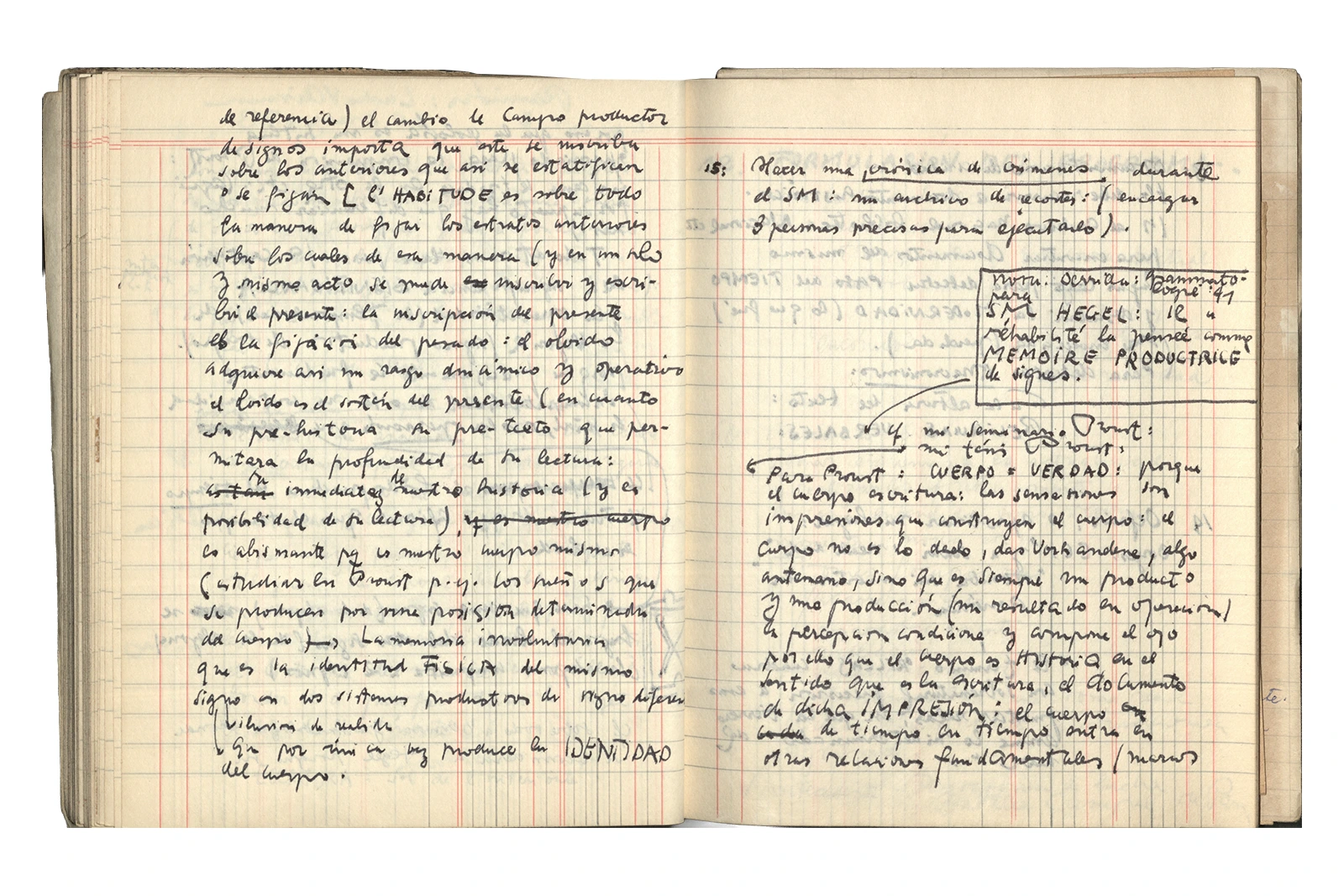 Este cuaderno reúne apuntes del primer semestre de 1973, período en el que Ronald Kay dicta el seminario Análisis del tratado teórico de Walter Benjamin “La obra de arte en la época de la reproducción mecánica” y el curso “La estructuración sígnica del tiempo en la “Récherche du temps perdu” de Marcel Proust” en el Departamento de Estudios Humanísticos de la Universidad de Chile. Incluye notas y listas de materiales para la realización práctica del curso, donde los estudiantes debían documentar espacios públicos. Este cuaderno contiene además una lista extensa de frases extraídas posiblemente de medios de comunicación masiva, recortes de diario, definiciones del concepto de “azar” y referencias a S. Mallarmé, M. Proust, C. Baudelaire, A. Breton, M. Heidegger, J. Beuys, J. Cocteau, F. Bacon, R. Ruiz y N. Parra, entre otros.
