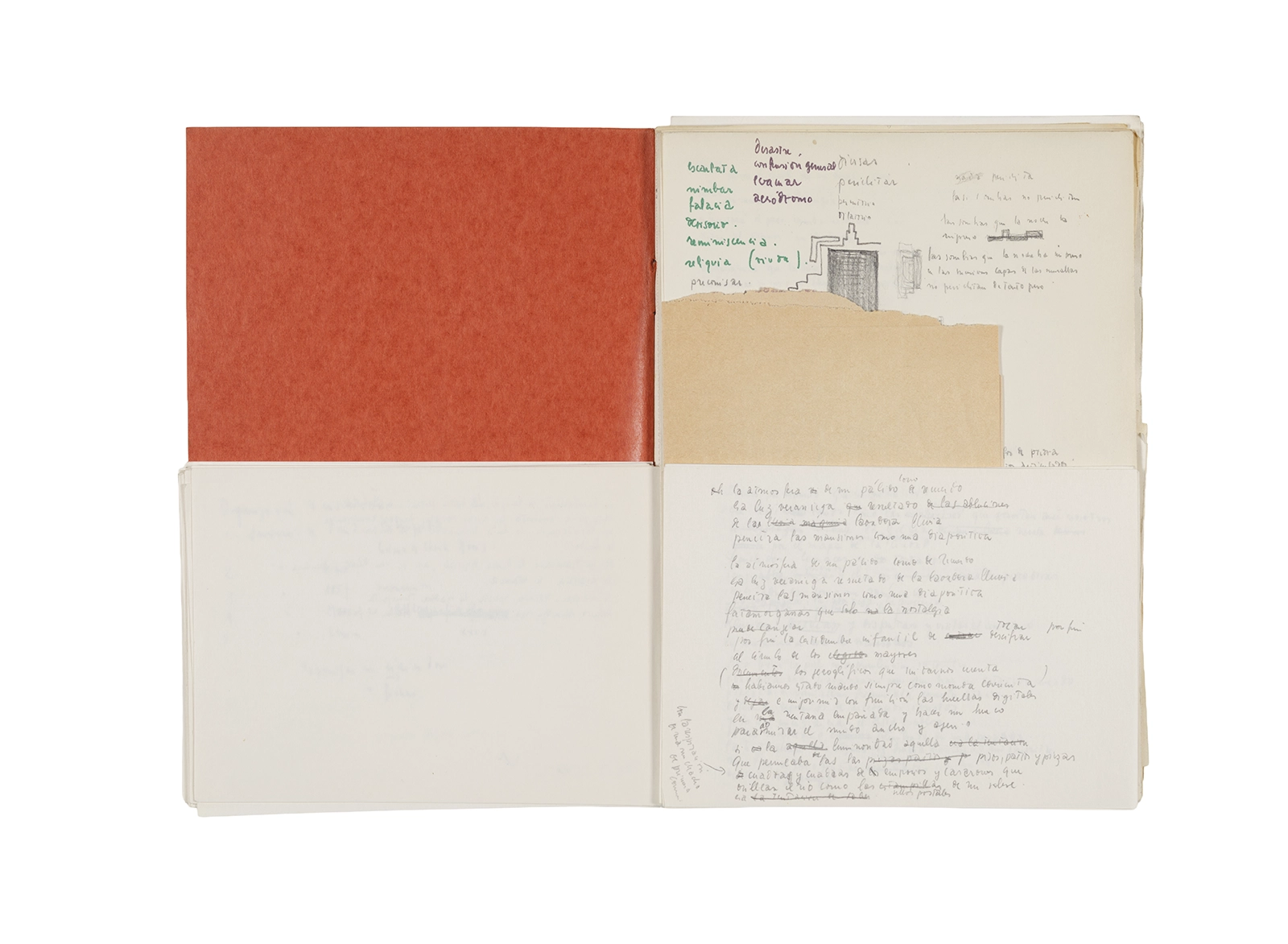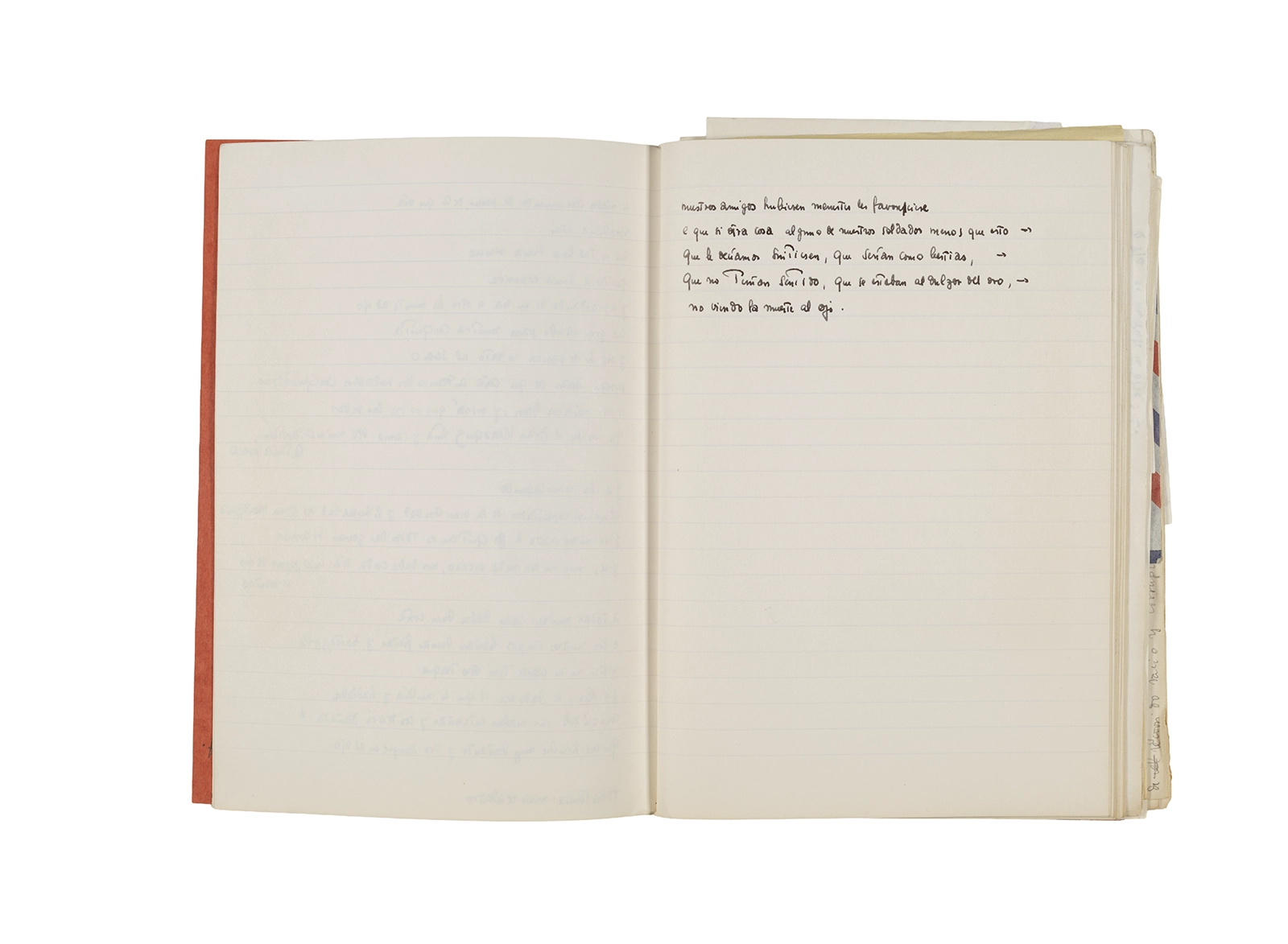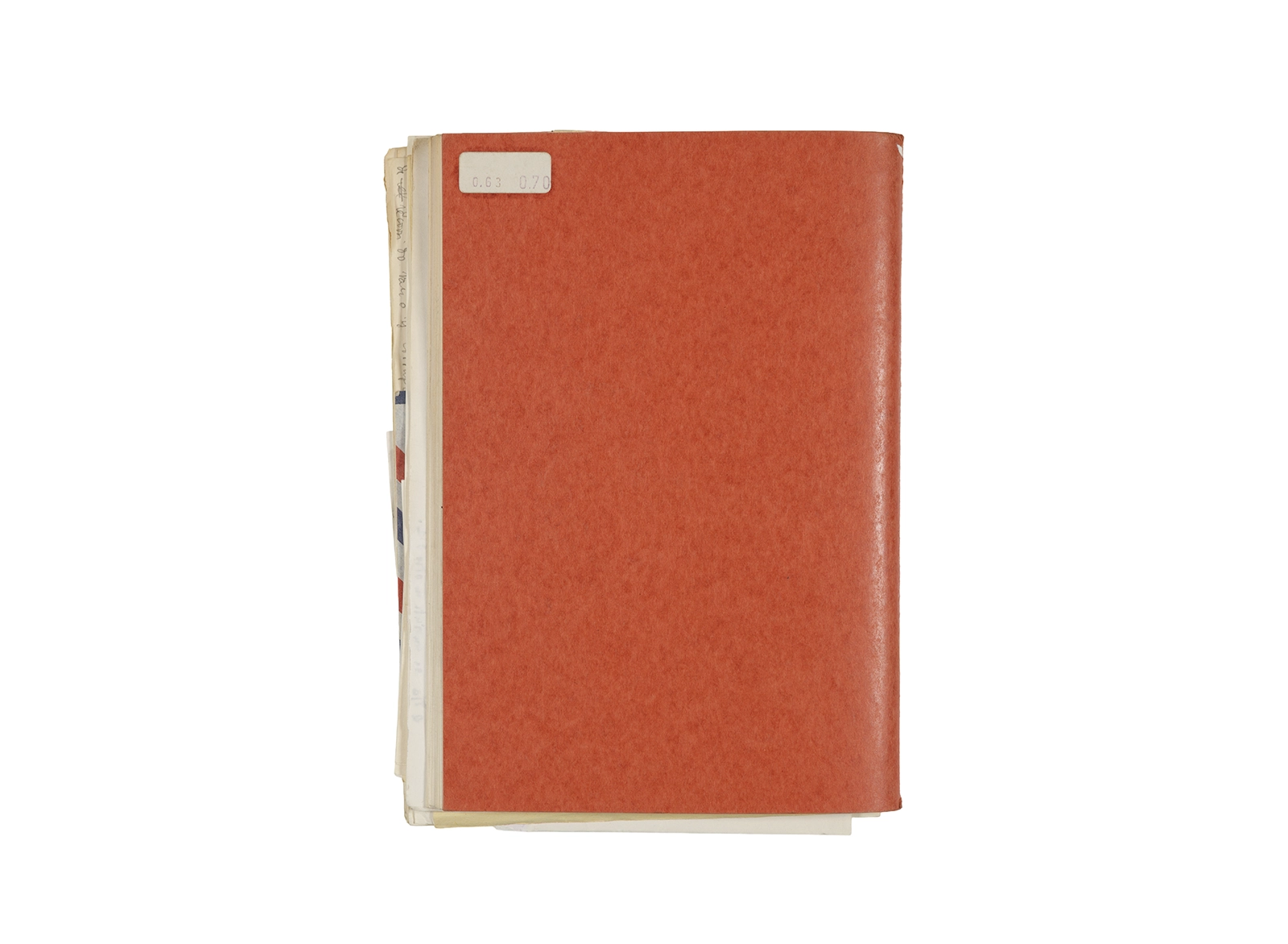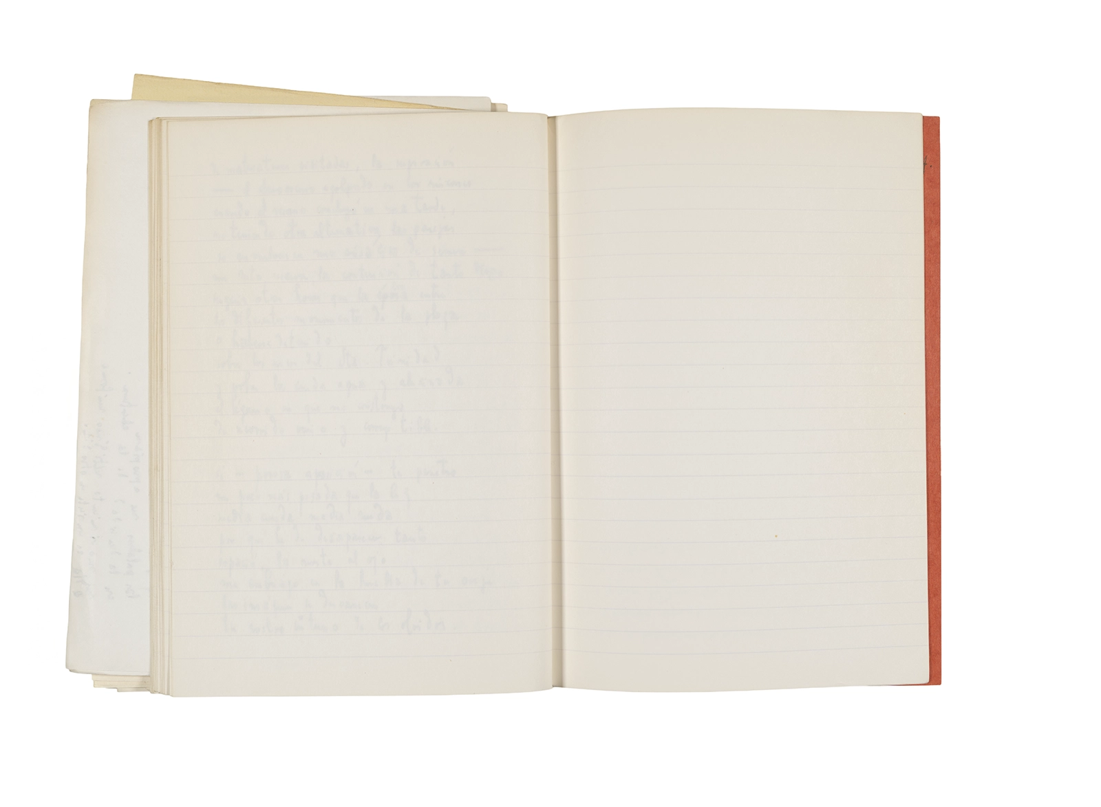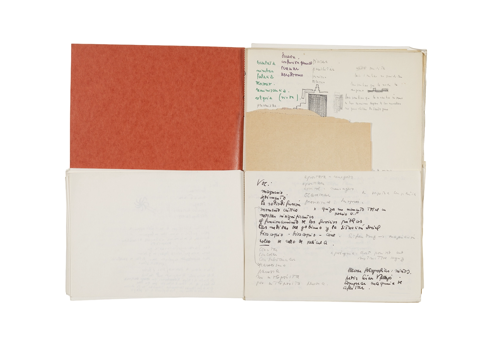 Cuaderno con tapa de cartón rojo unido al lomo por clips metálicos. Contiene en su interior, hojas manuscritas con tinta, lapiz grafito, scripto; hojas de roneo con texto manuscrito; hojas tamaño oficio perforada con anotaciones en tinta; hojas mecanografiadas y con anotaciones en tinta; ficha bibliográfica con texto escrito a mano; boleta con texto escrito en grafito; sobre con texto escrito en grafito.