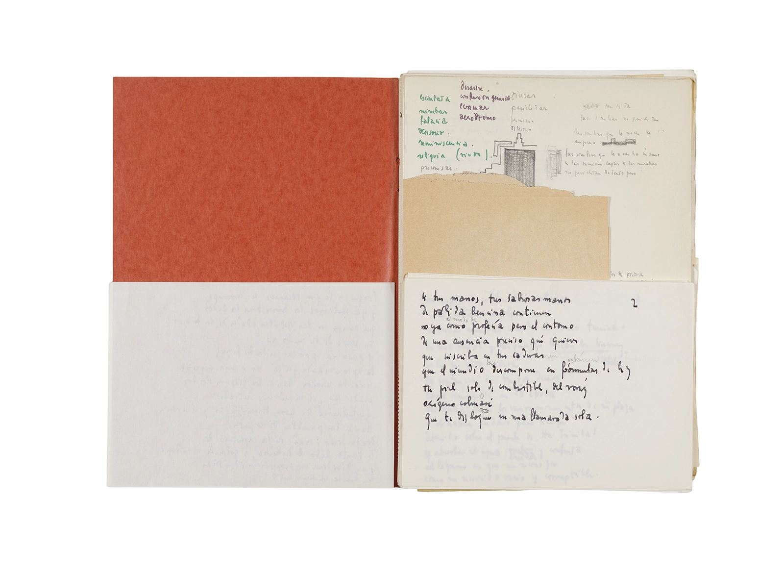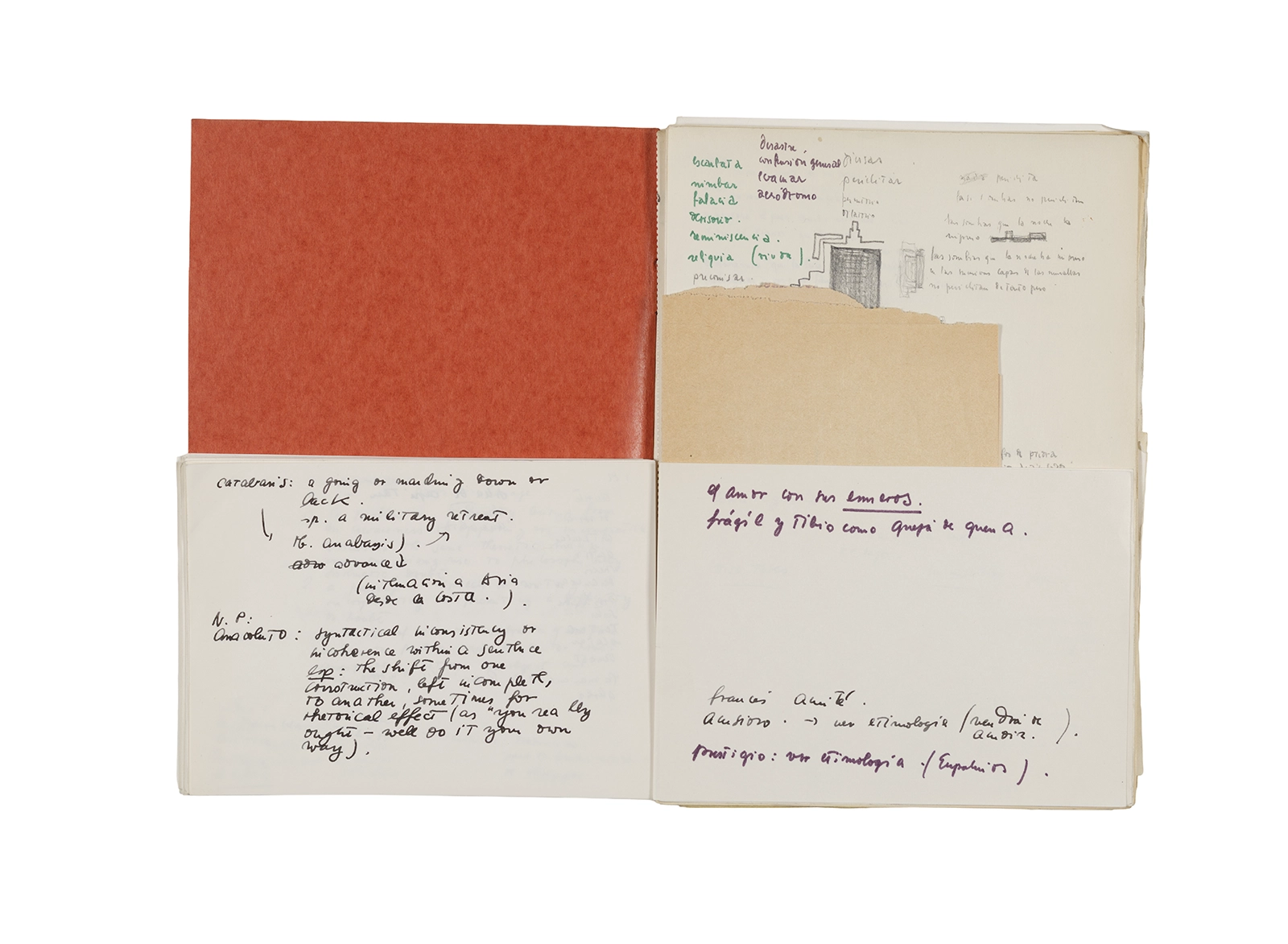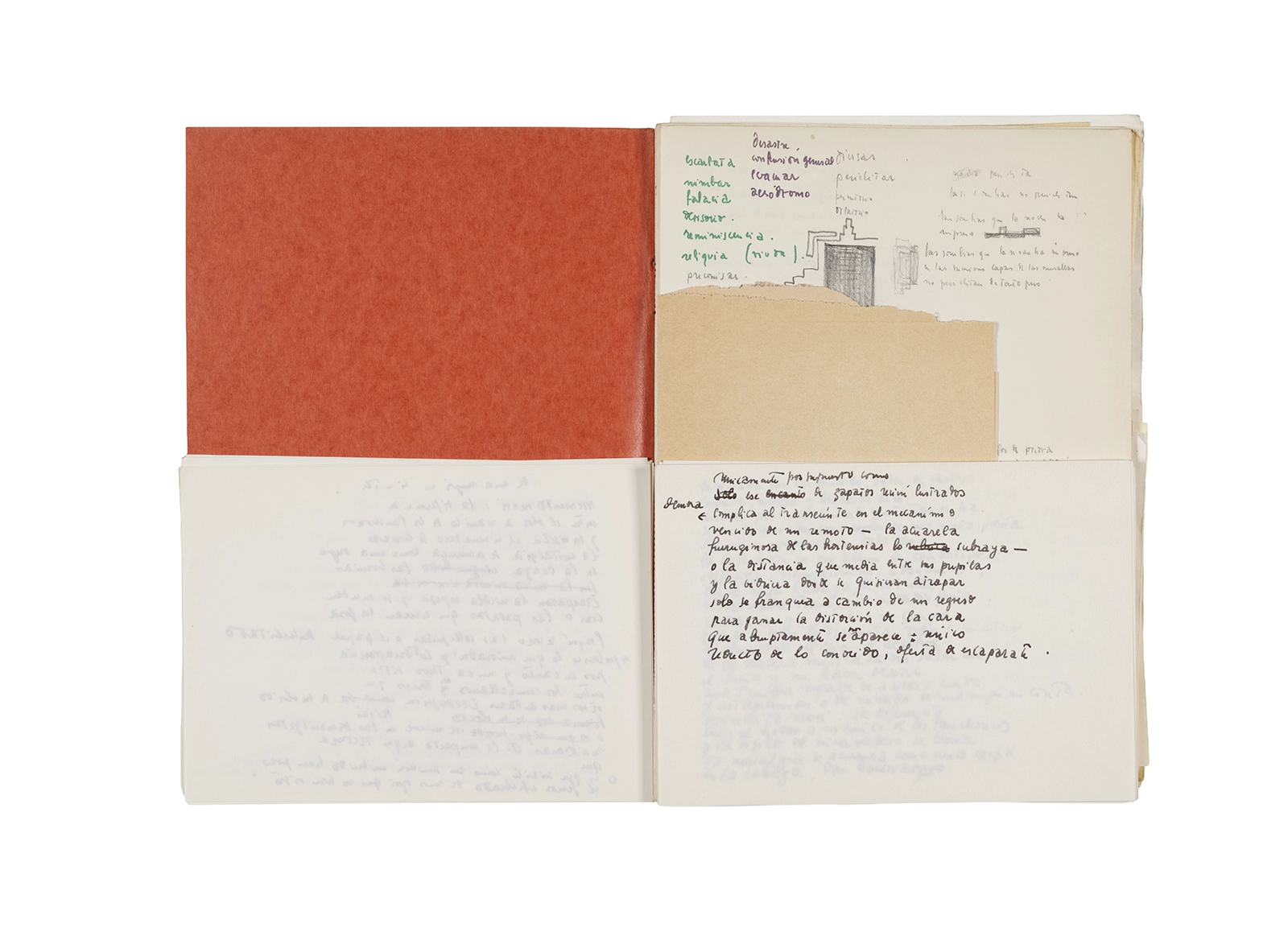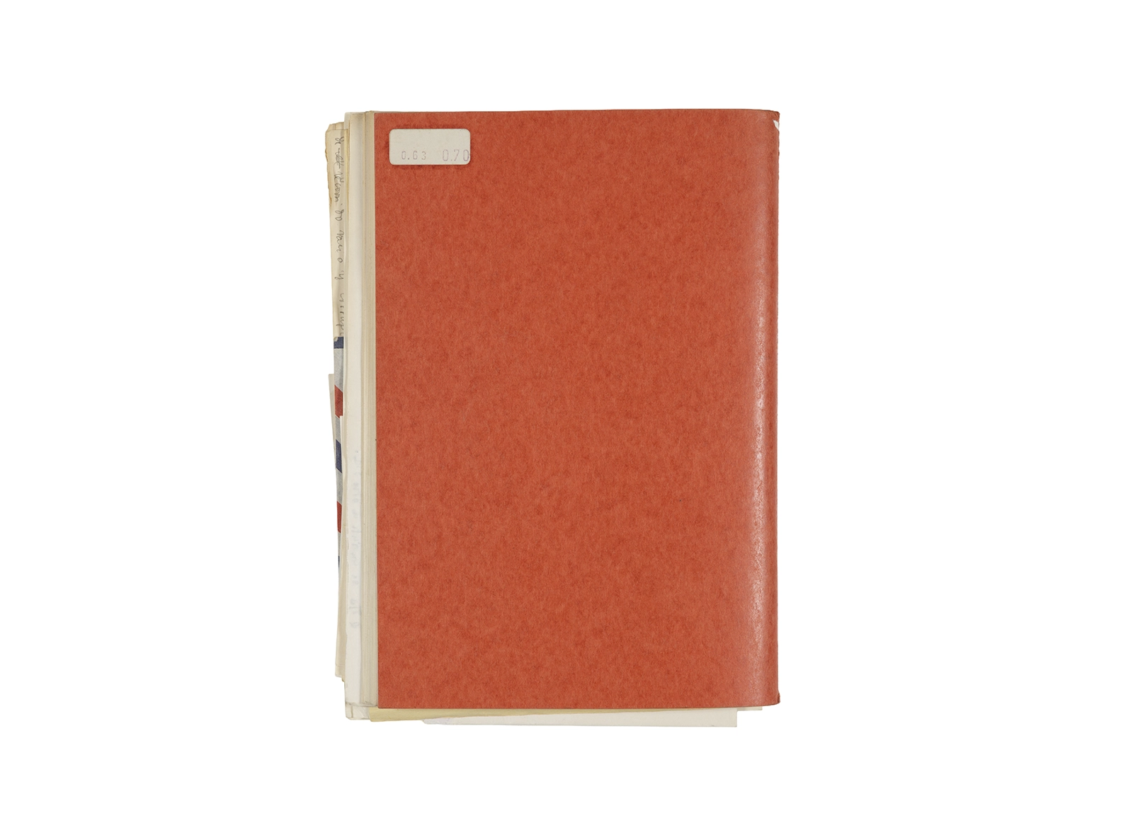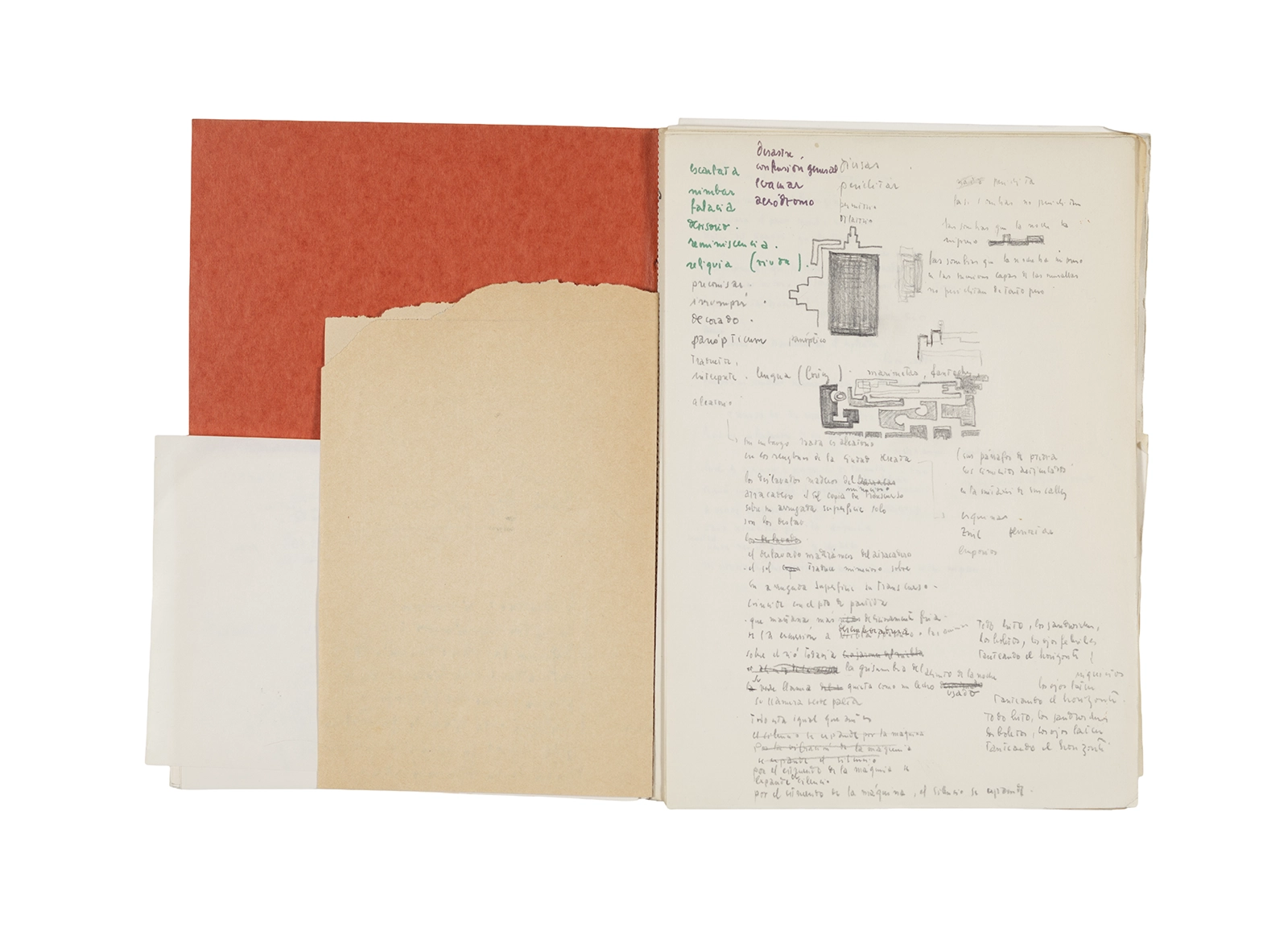 Cuaderno con tapa de cartón rojo unido al lomo por clips metálicos. Contiene en su interior, hojas manuscritas con tinta, lapiz grafito, scripto; hojas de roneo con texto manuscrito; hojas tamaño oficio perforada con anotaciones en tinta; hojas mecanografiadas y con anotaciones en tinta; ficha bibliográfica con texto escrito a mano; boleta con texto escrito en grafito; sobre con texto escrito en grafito.