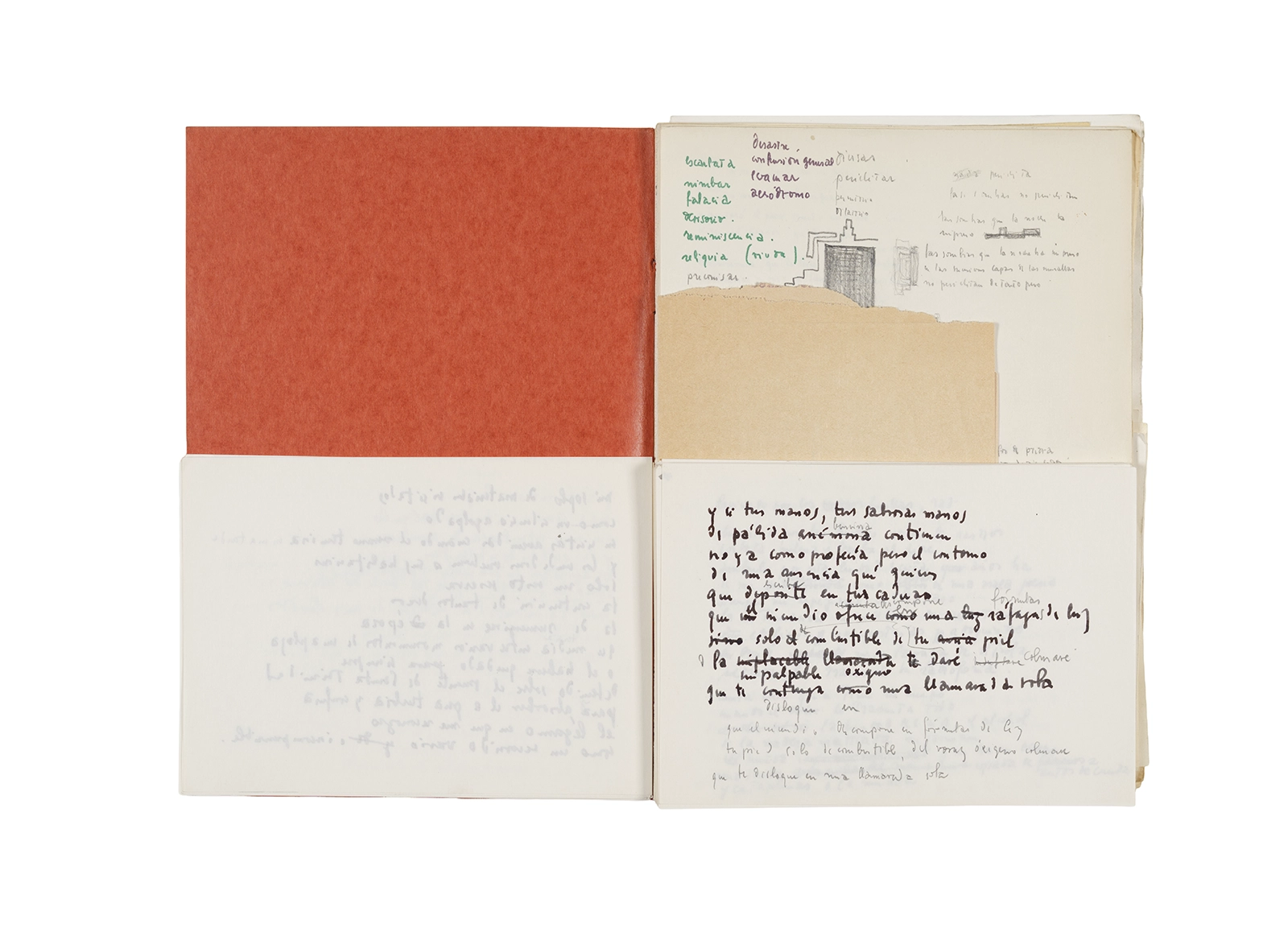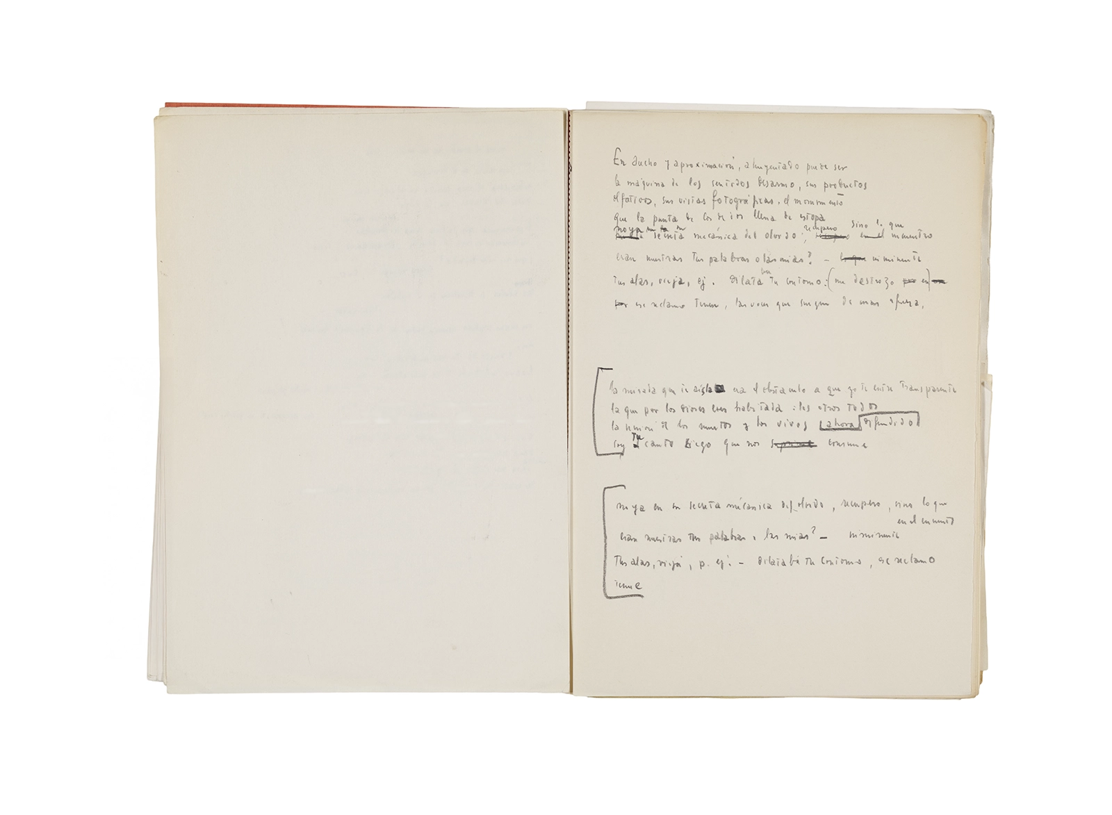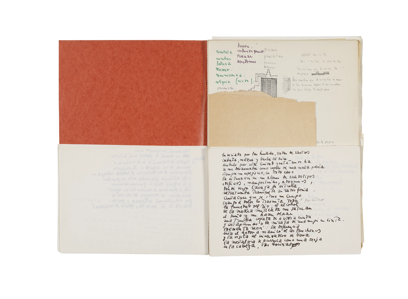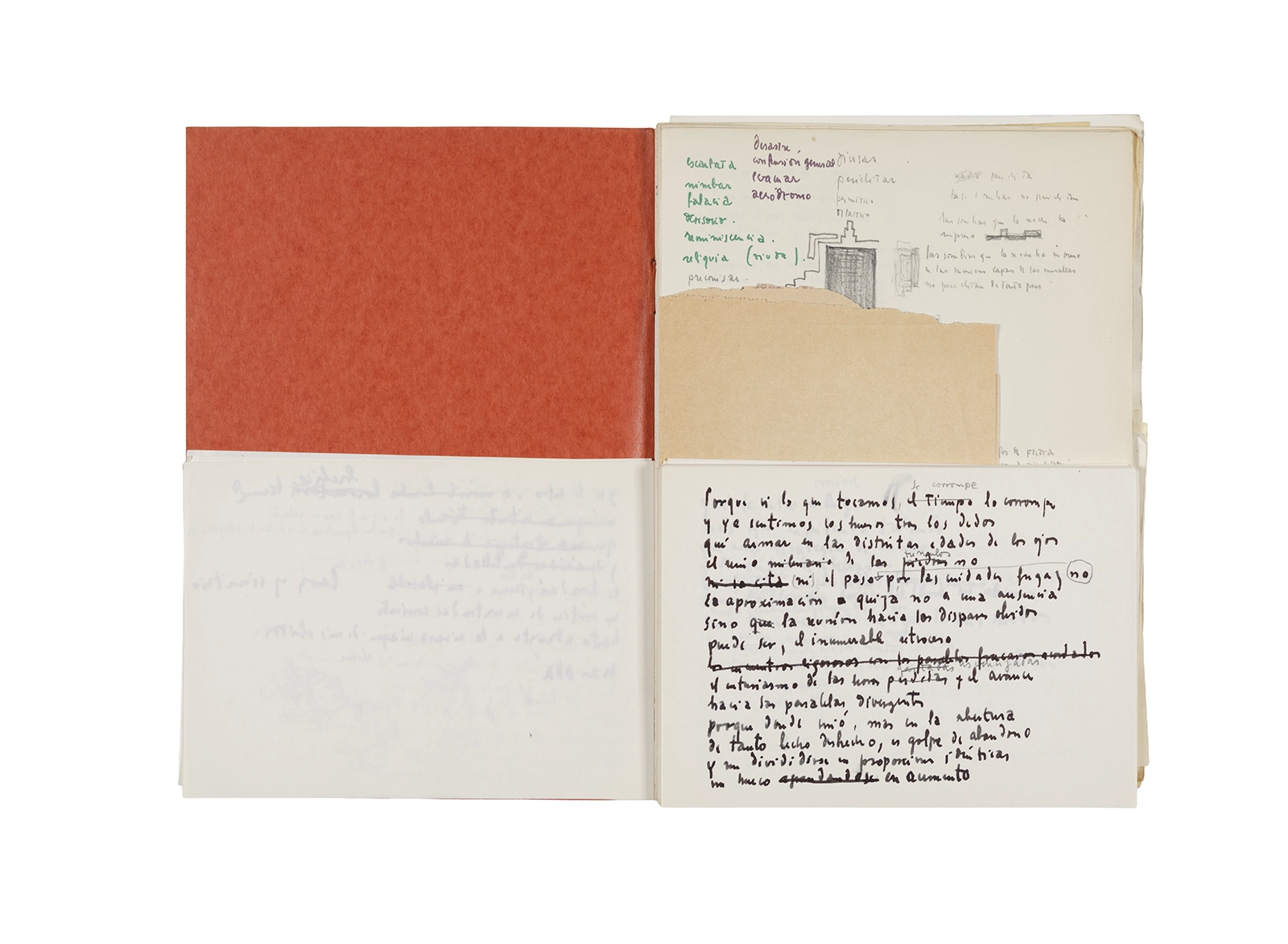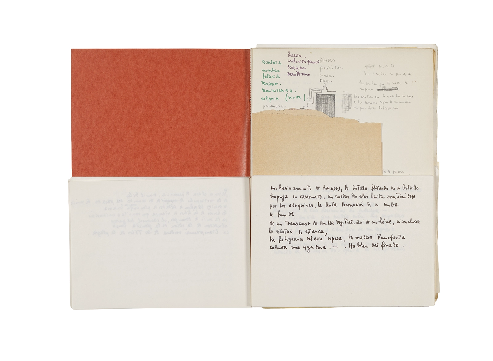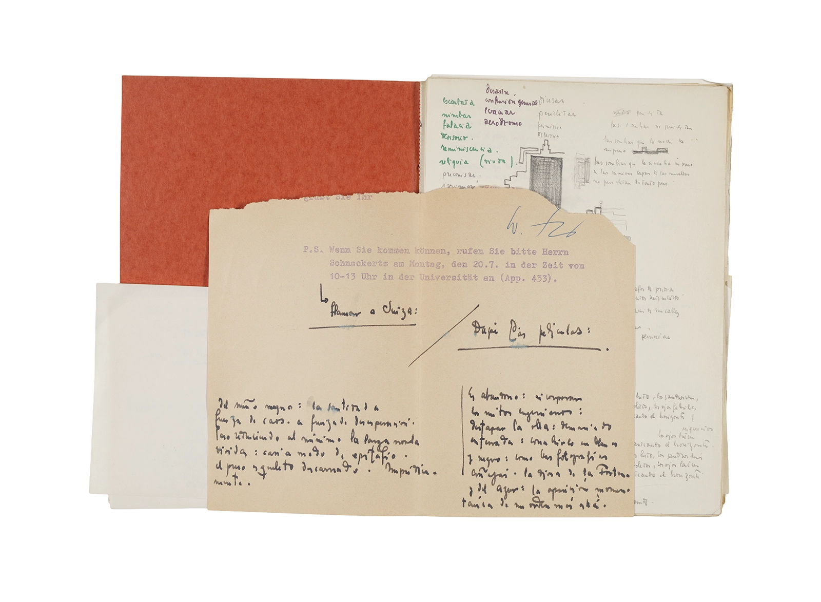 Cuaderno con tapa de cartón rojo unido al lomo por clips metálicos. Contiene en su interior, hojas manuscritas con tinta, lapiz grafito, scripto; hojas de roneo con texto manuscrito; hojas tamaño oficio perforada con anotaciones en tinta; hojas mecanografiadas y con anotaciones en tinta; ficha bibliográfica con texto escrito a mano; boleta con texto escrito en grafito; sobre con texto escrito en grafito.