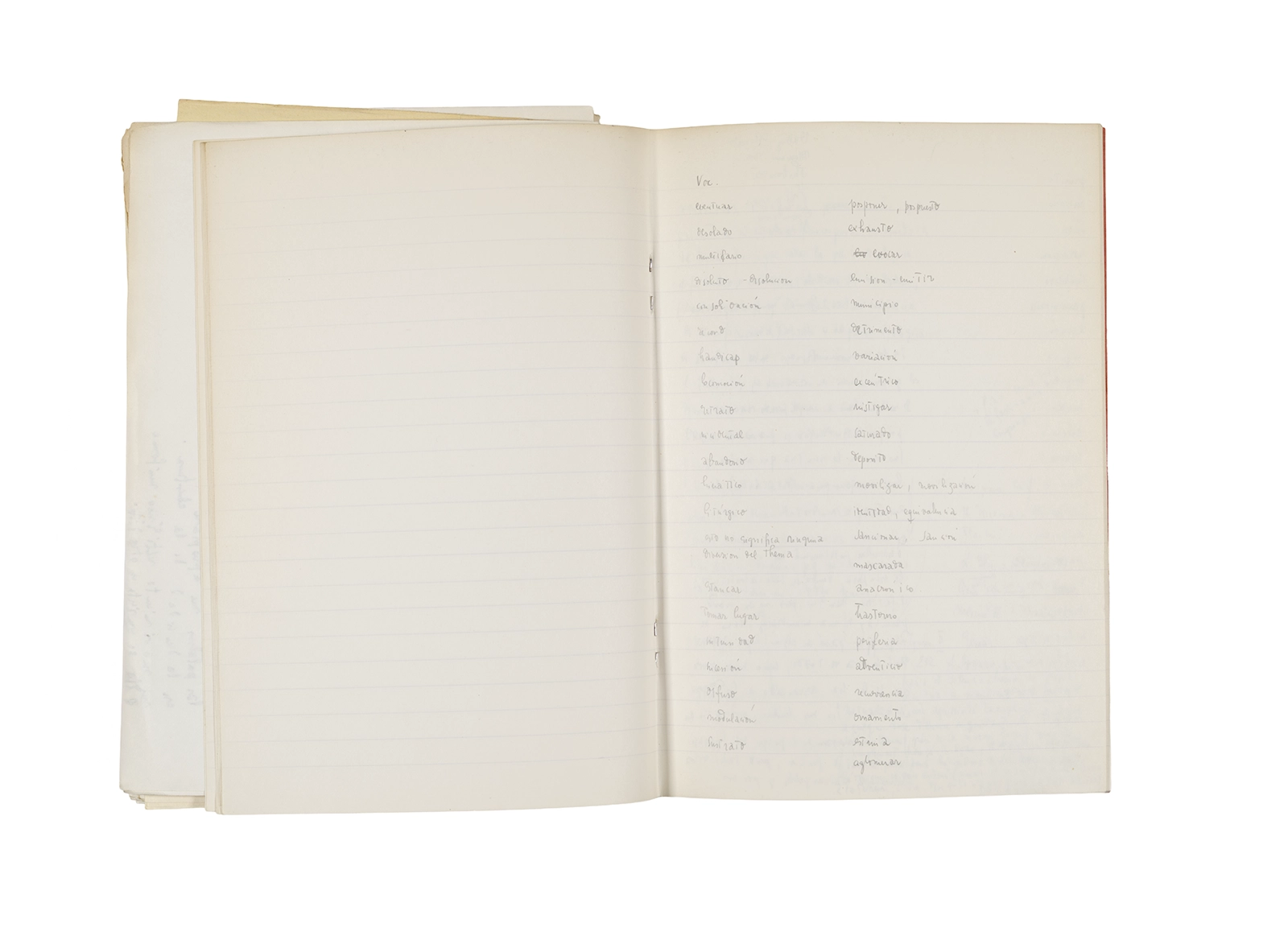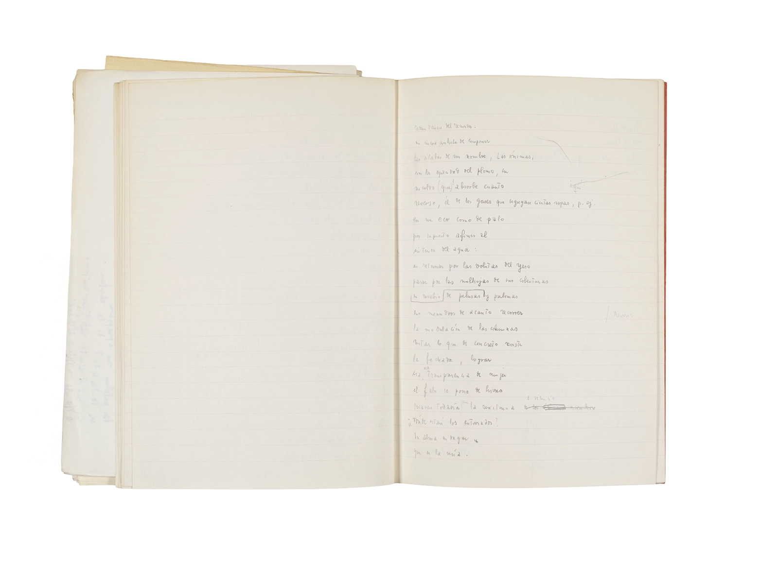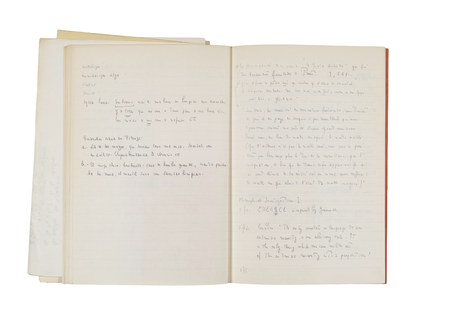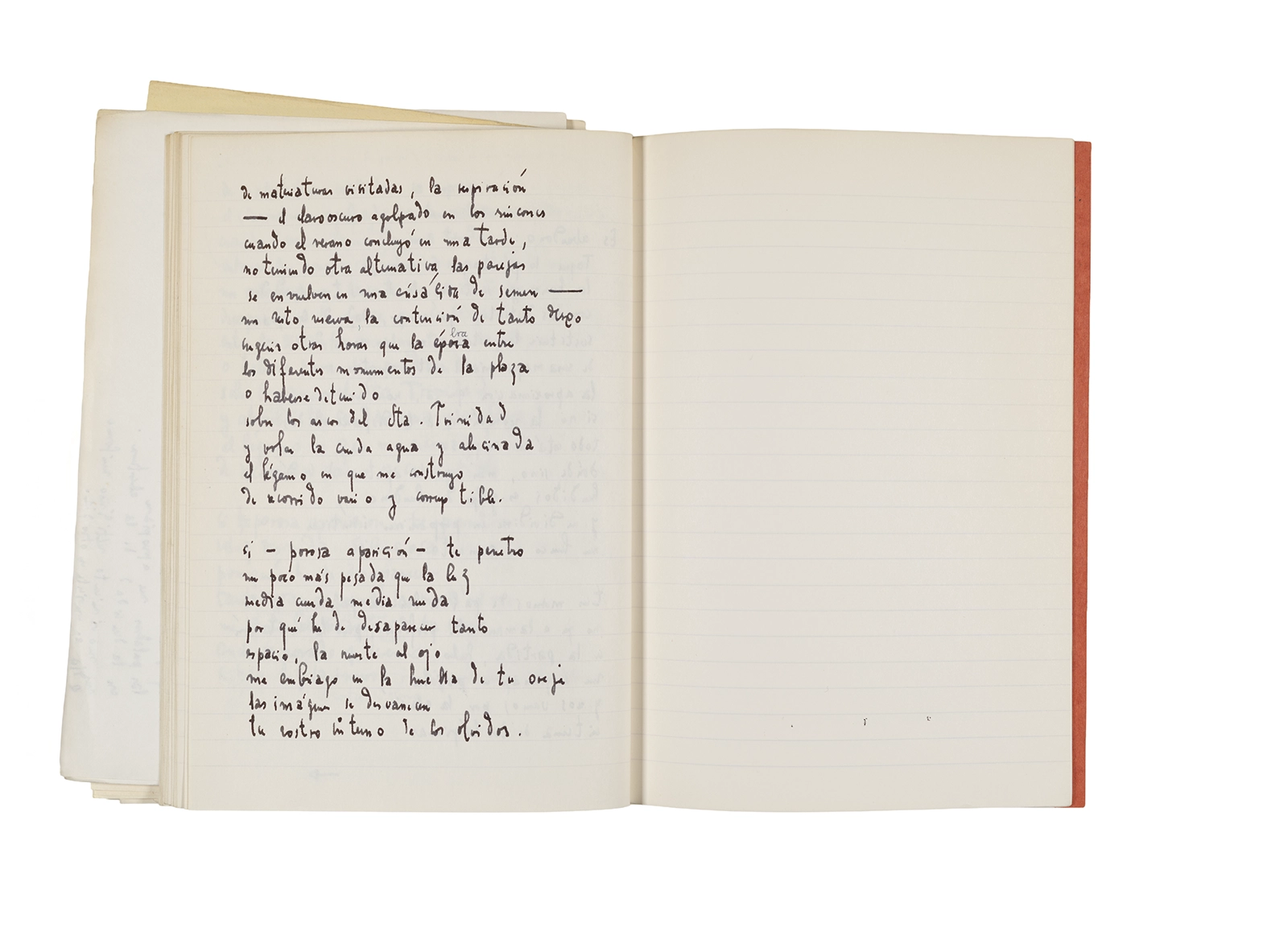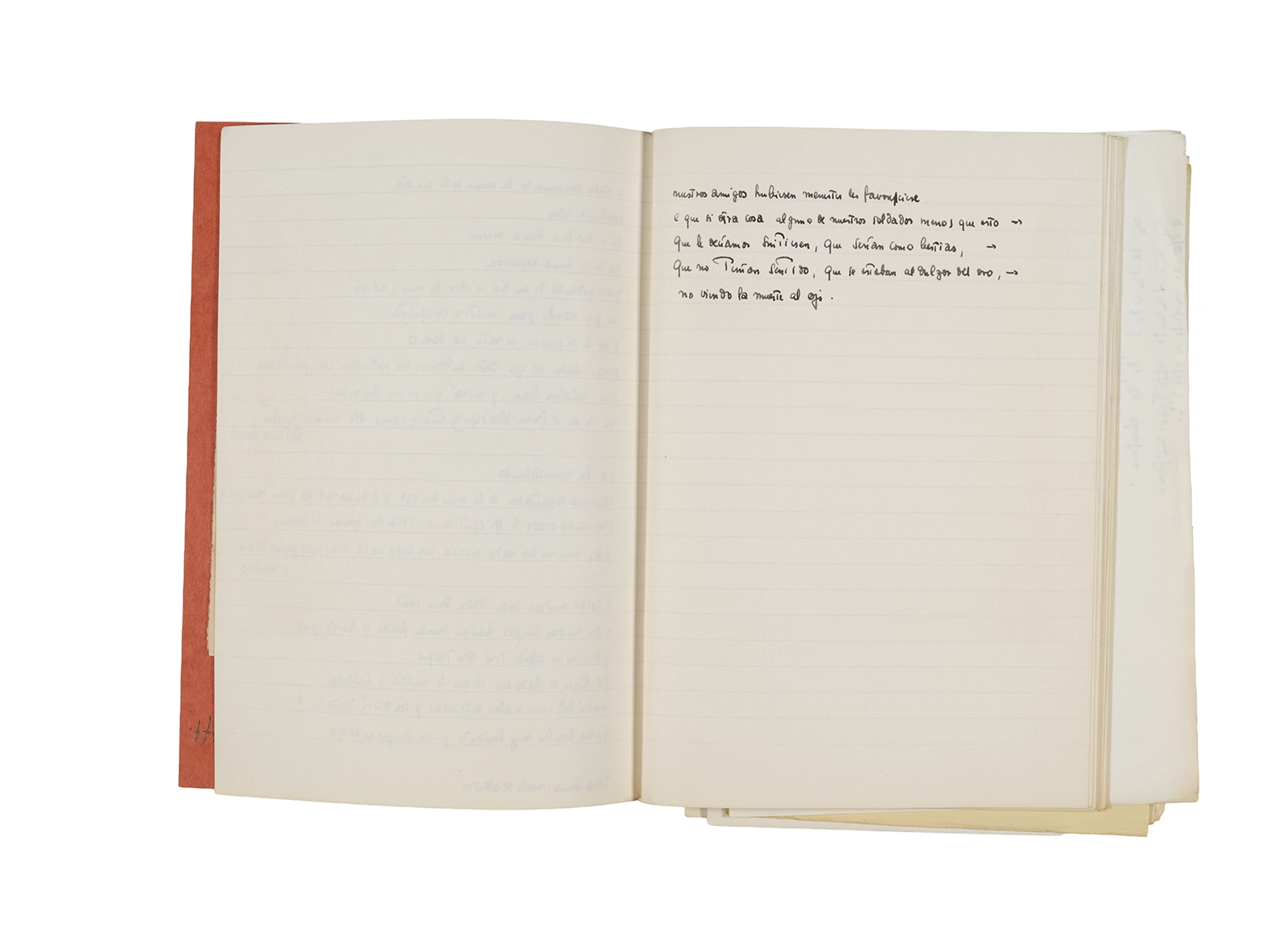 Cuaderno con tapa de cartón rojo unido al lomo por clips metálicos. Contiene en su interior, hojas manuscritas con tinta, lapiz grafito, scripto; hojas de roneo con texto manuscrito; hojas tamaño oficio perforada con anotaciones en tinta; hojas mecanografiadas y con anotaciones en tinta; ficha bibliográfica con texto escrito a mano; boleta con texto escrito en grafito; sobre con texto escrito en grafito.