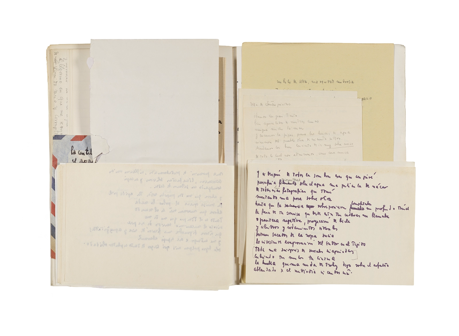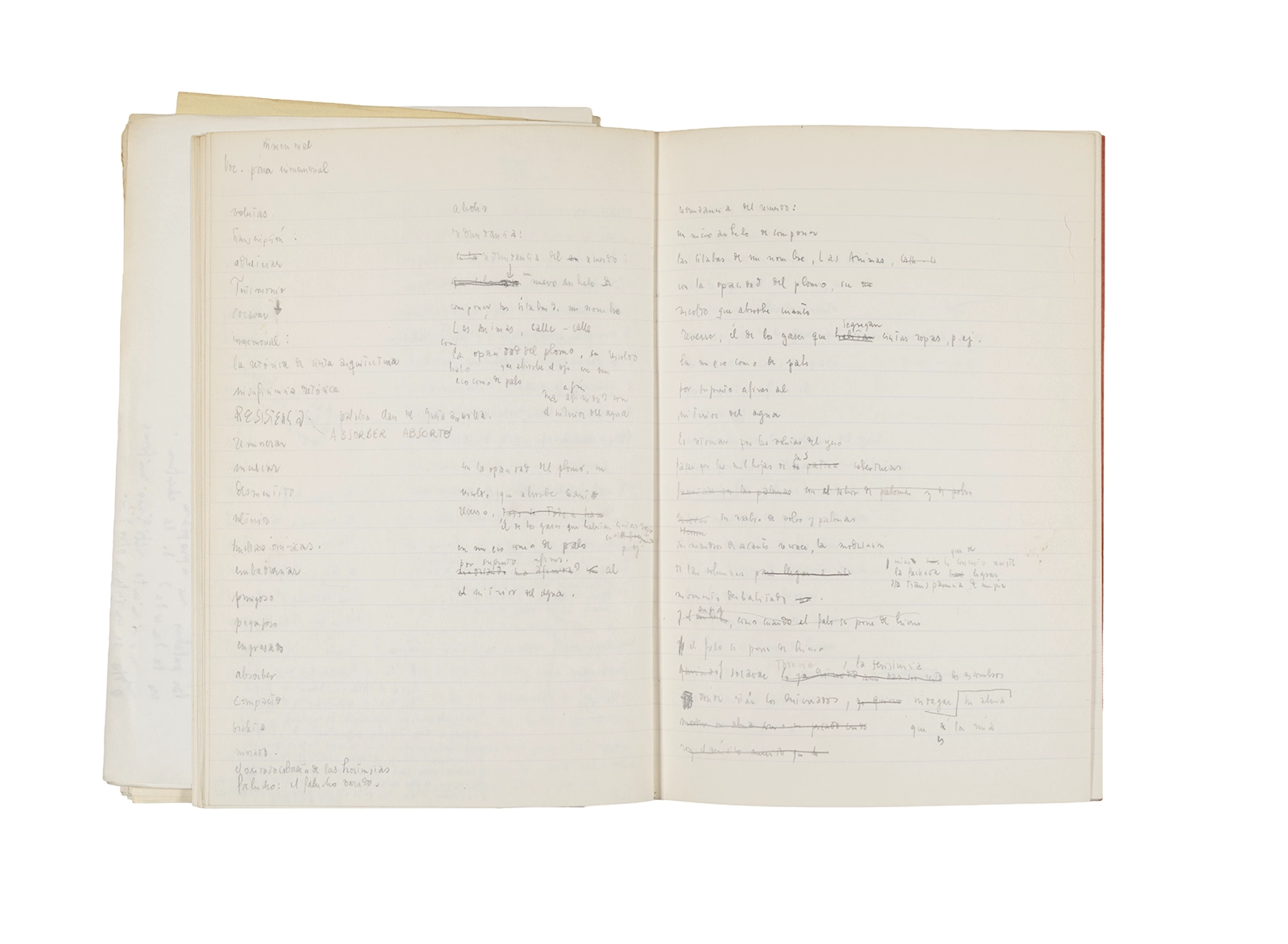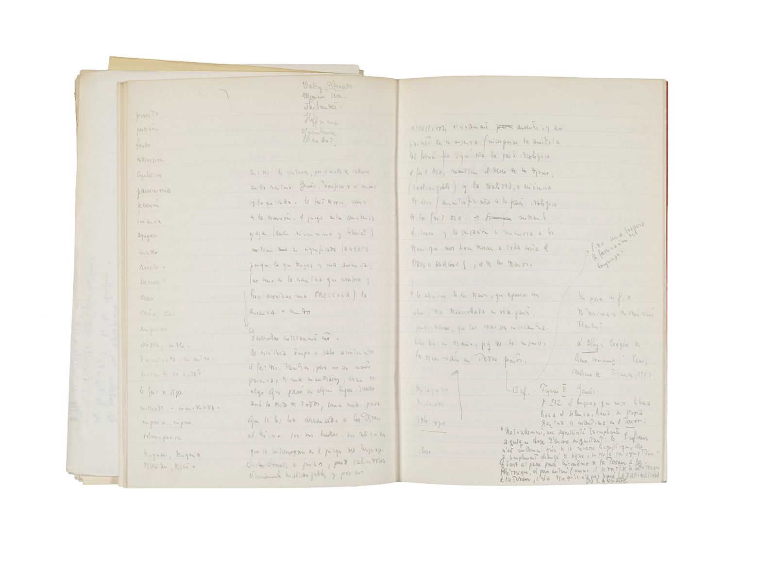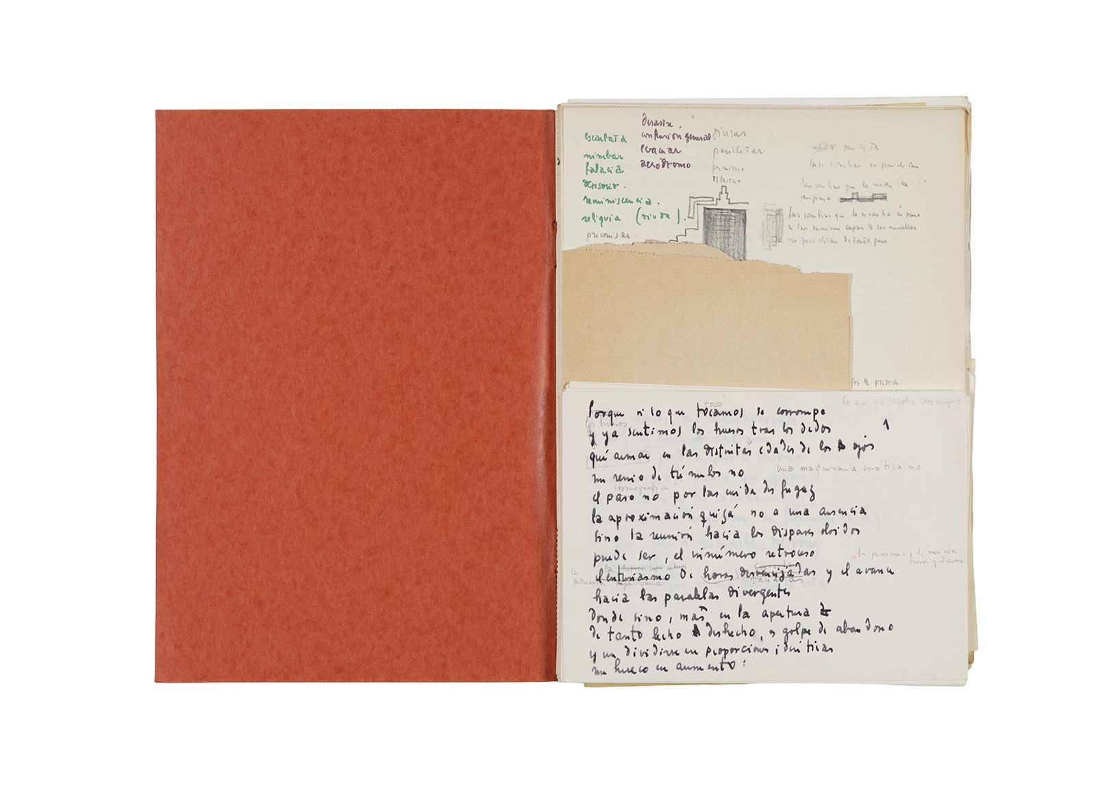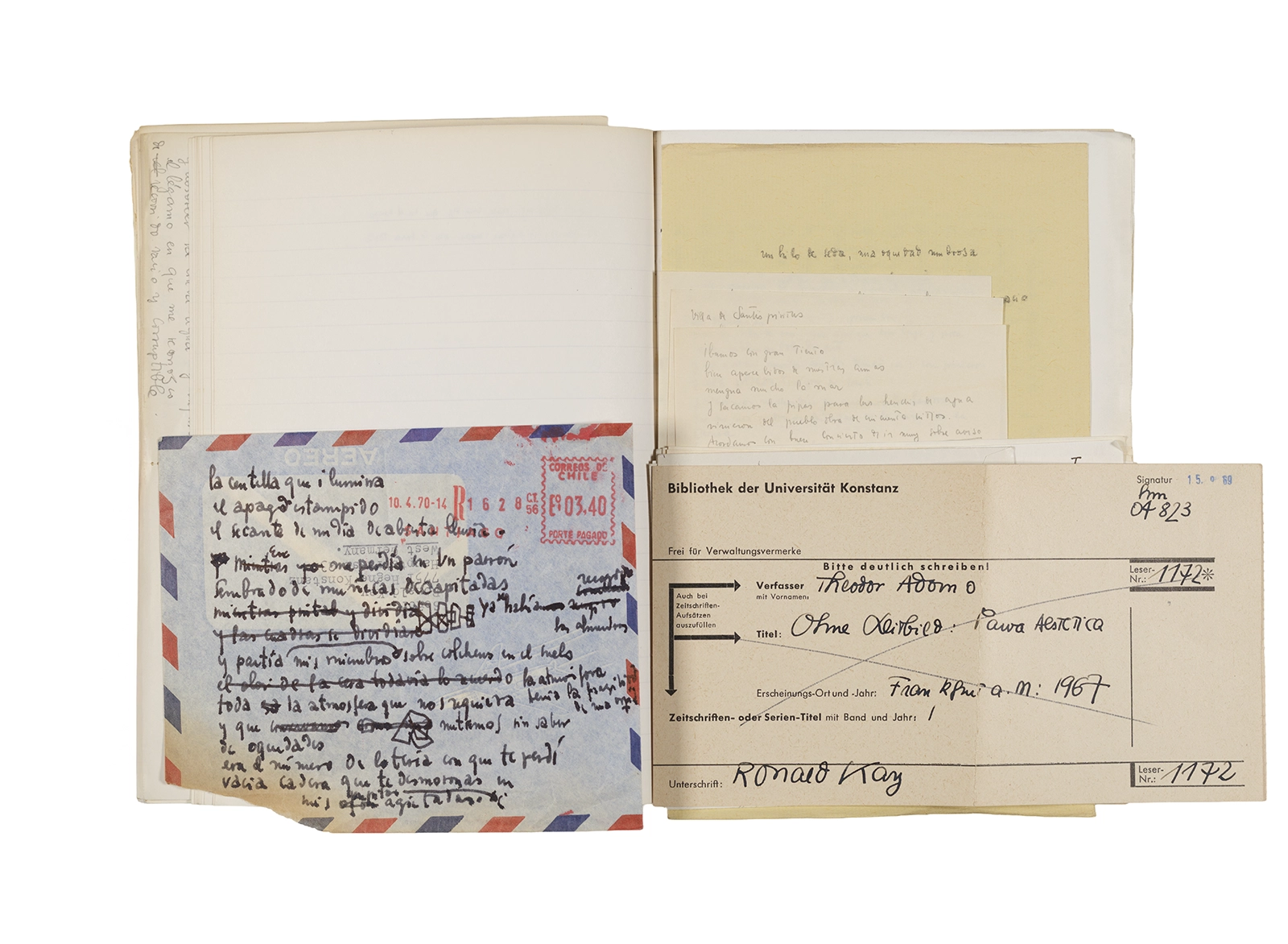 Cuaderno con tapa de cartón rojo unido al lomo por clips metálicos. Contiene en su interior, hojas manuscritas con tinta, lapiz grafito, scripto; hojas de roneo con texto manuscrito; hojas tamaño oficio perforada con anotaciones en tinta; hojas mecanografiadas y con anotaciones en tinta; ficha bibliográfica con texto escrito a mano; boleta con texto escrito en grafito; sobre con texto escrito en grafito.