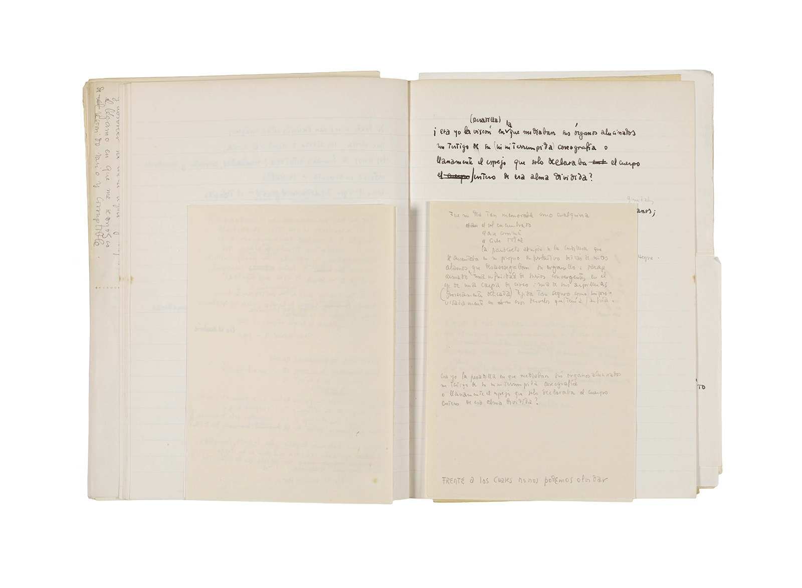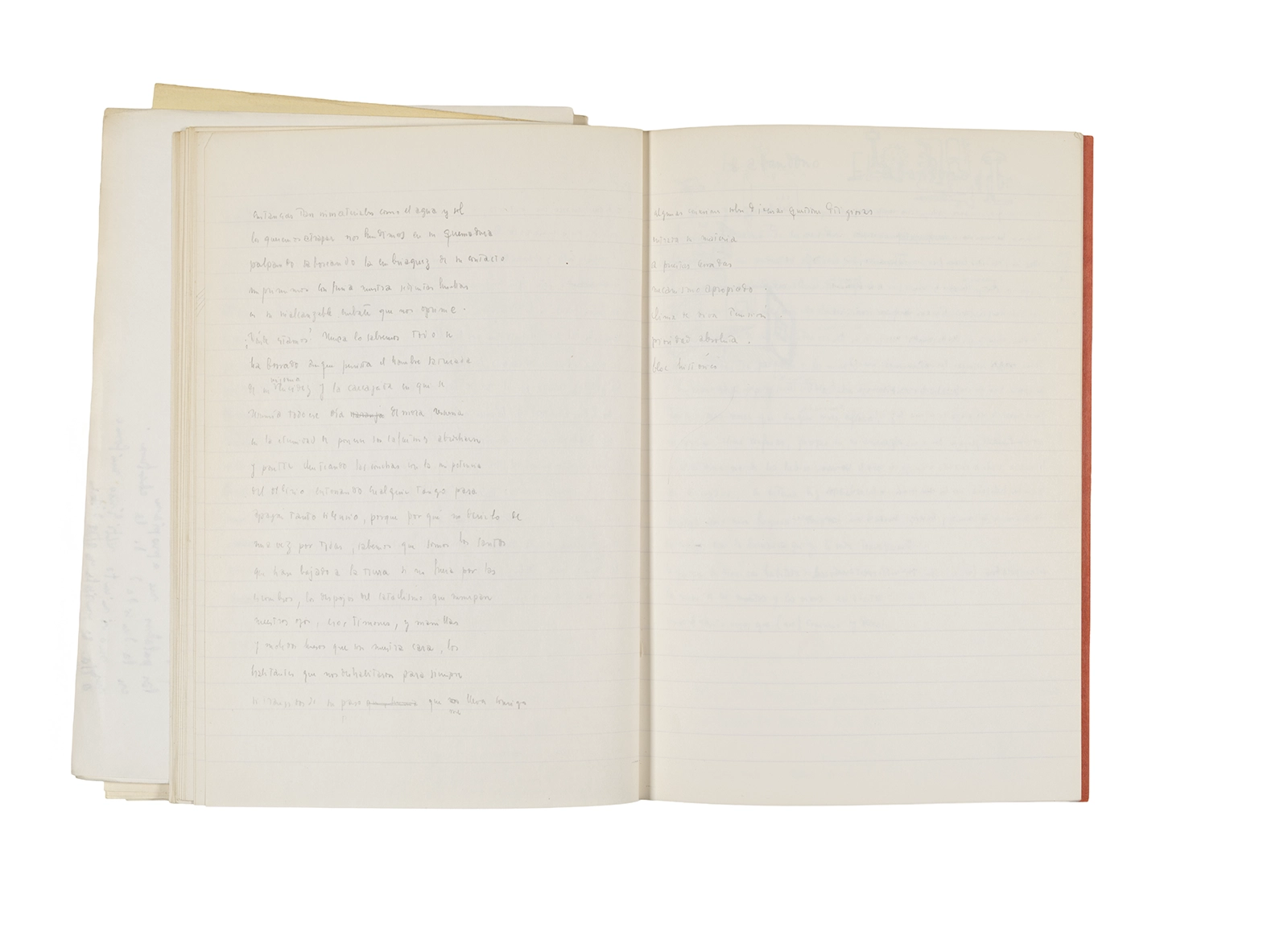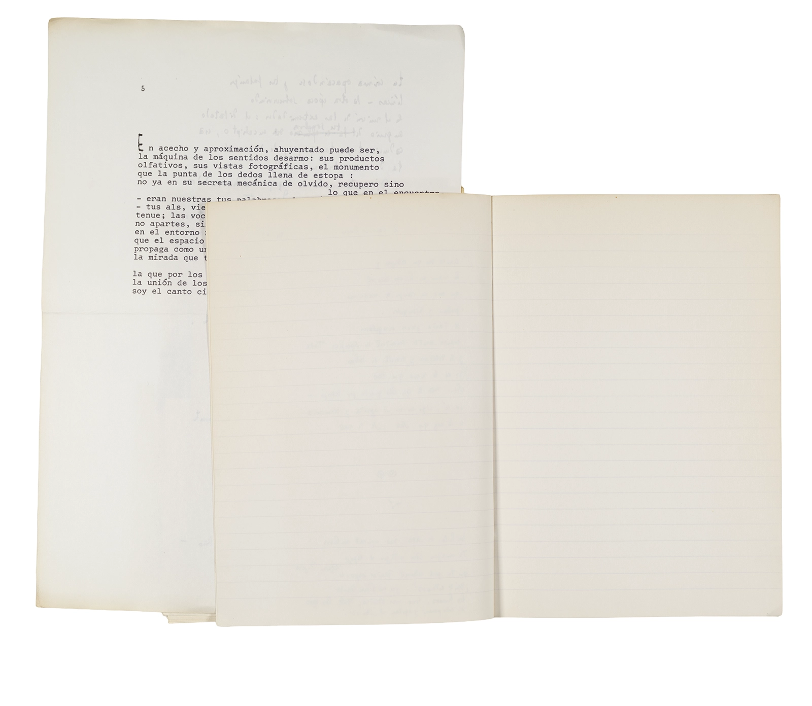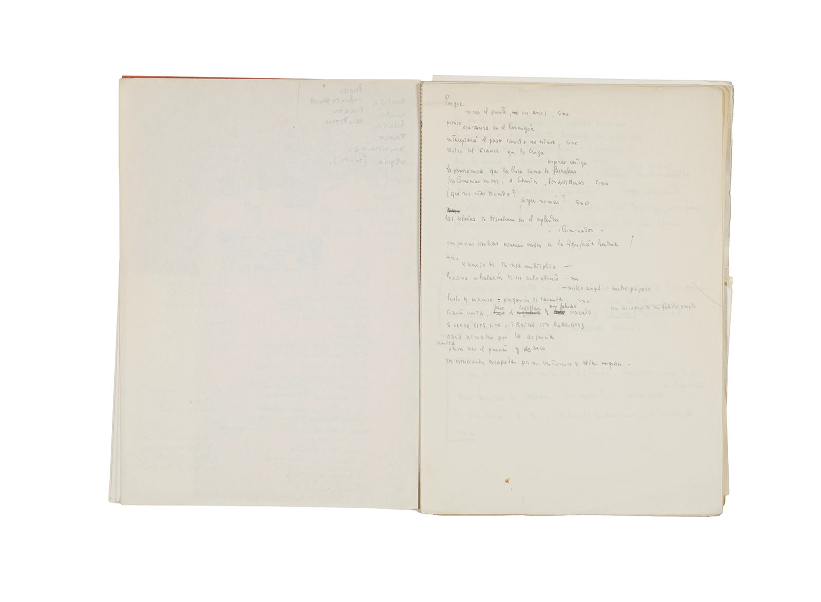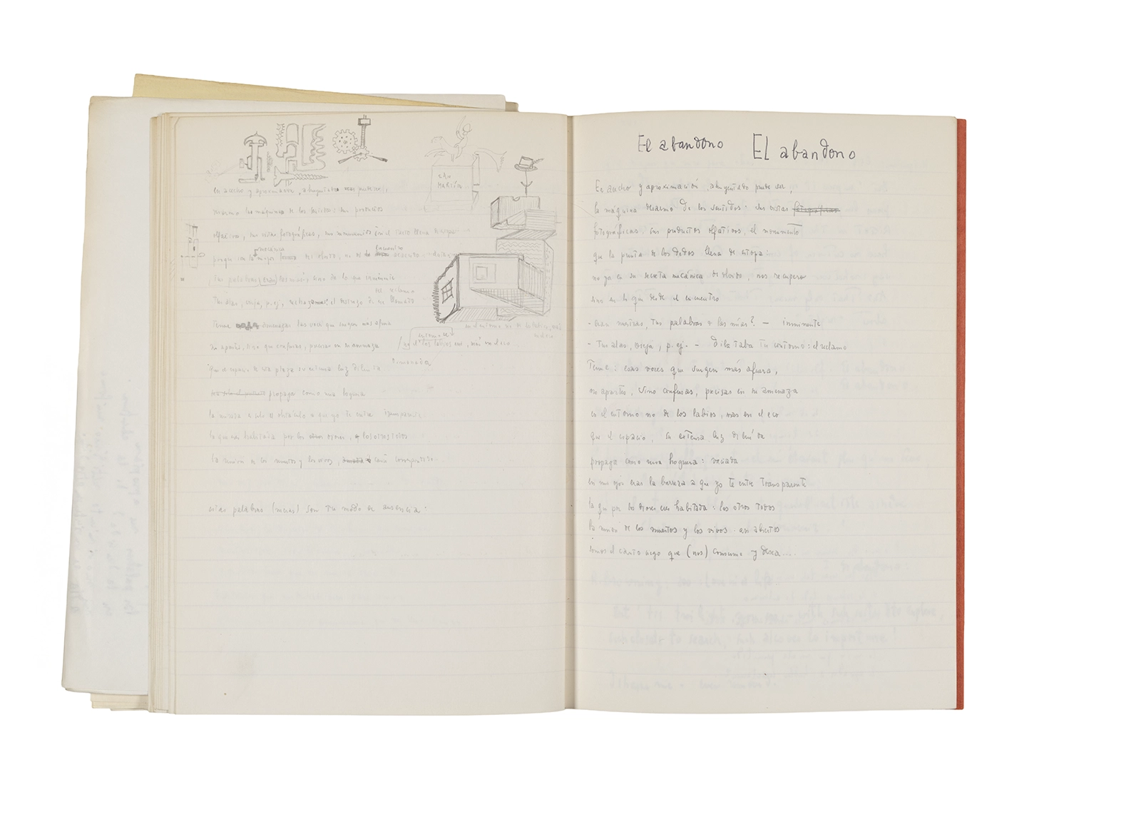 Cuaderno con tapa de cartón rojo unido al lomo por clips metálicos. Contiene en su interior, hojas manuscritas con tinta, lapiz grafito, scripto; hojas de roneo con texto manuscrito; hojas tamaño oficio perforada con anotaciones en tinta; hojas mecanografiadas y con anotaciones en tinta; ficha bibliográfica con texto escrito a mano; boleta con texto escrito en grafito; sobre con texto escrito en grafito.