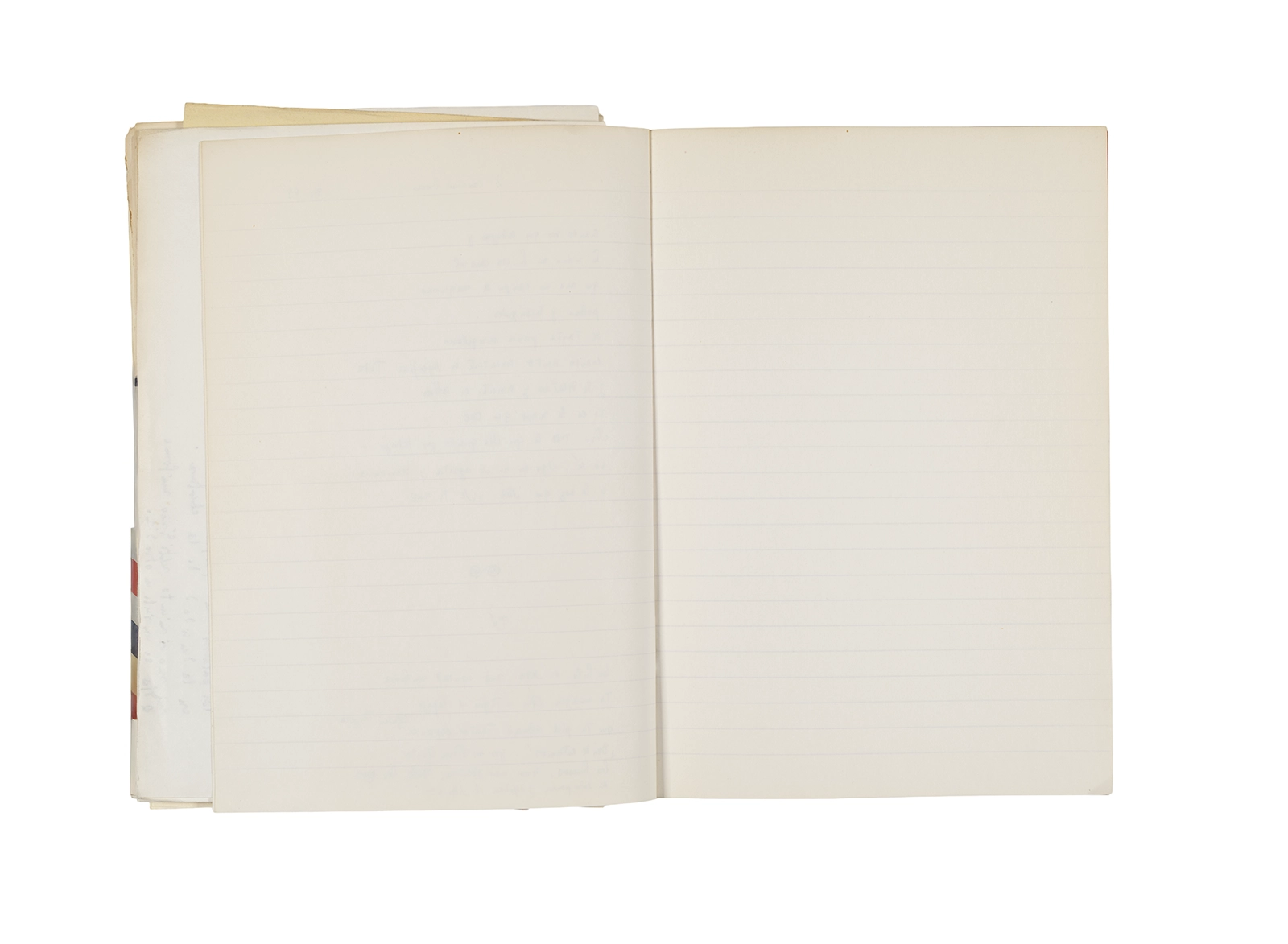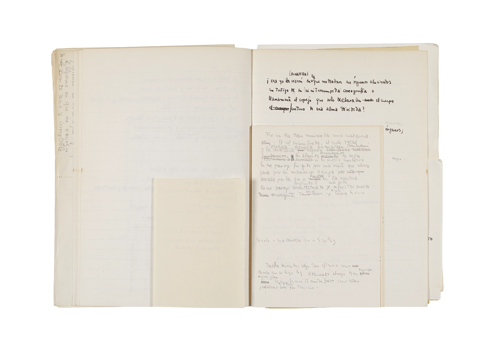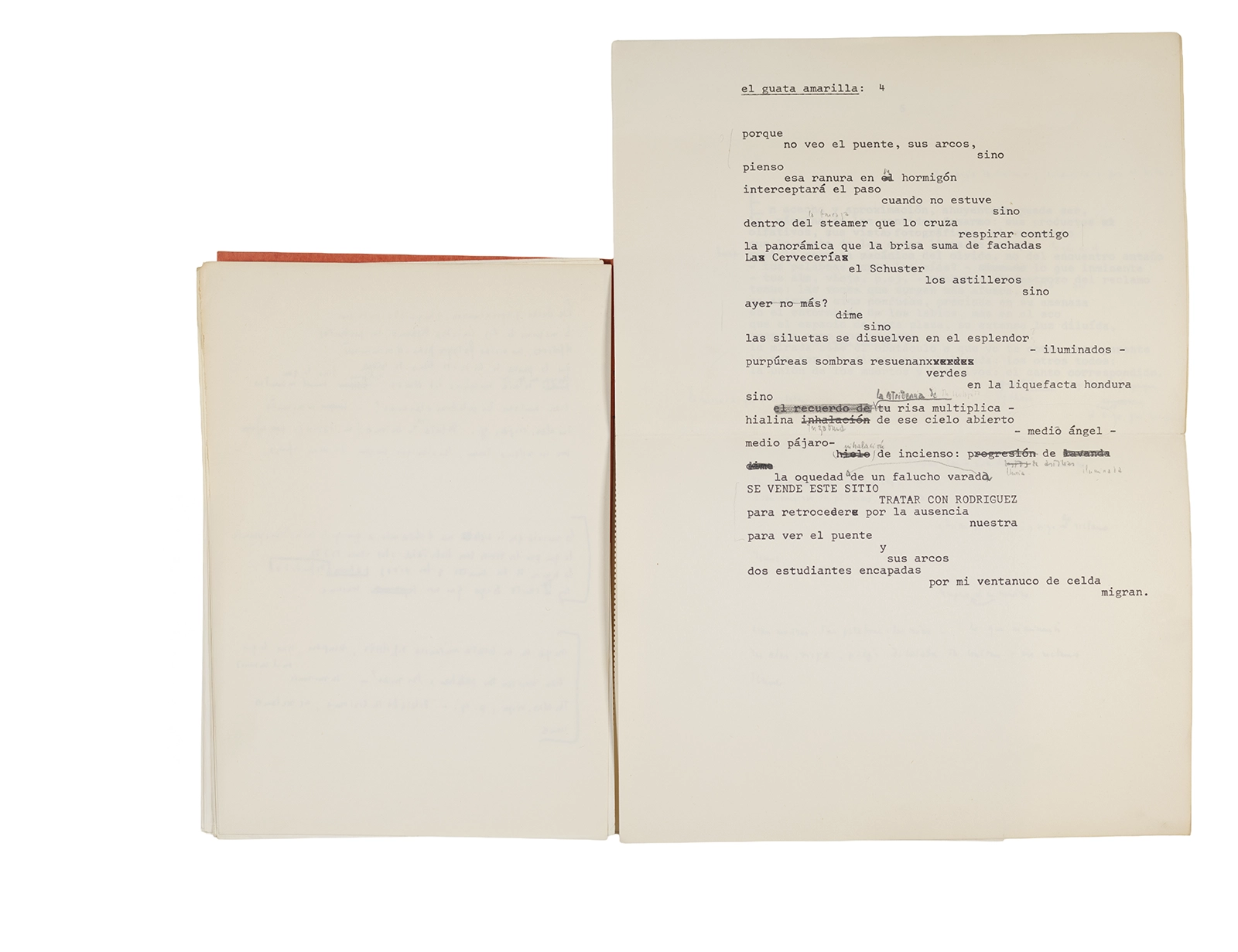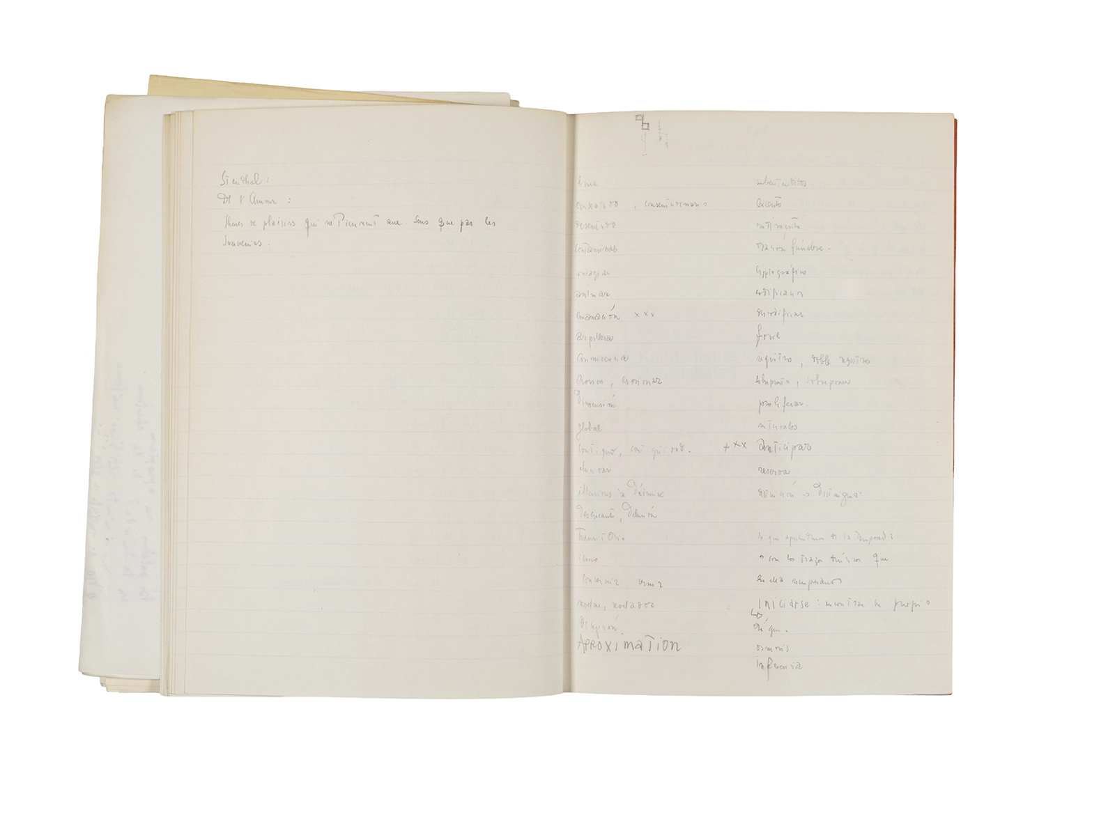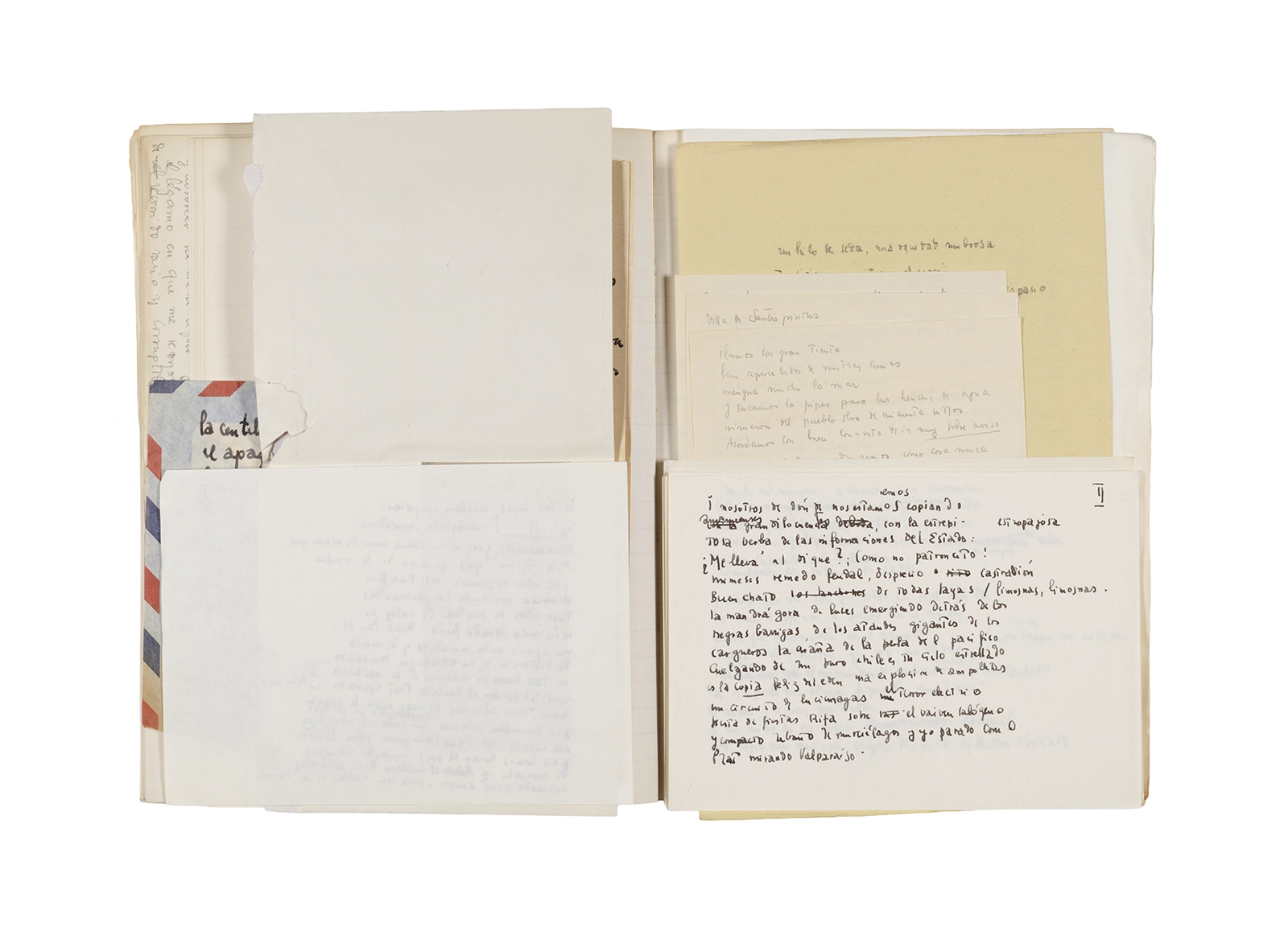Cuaderno con tapa de cartón rojo unido al lomo por clips metálicos. Contiene en su interior, hojas manuscritas con tinta, lapiz grafito, scripto; hojas de roneo con texto manuscrito; hojas tamaño oficio perforada con anotaciones en tinta; hojas mecanografiadas y con anotaciones en tinta; ficha bibliográfica con texto escrito a mano; boleta con texto escrito en grafito; sobre con texto escrito en grafito.