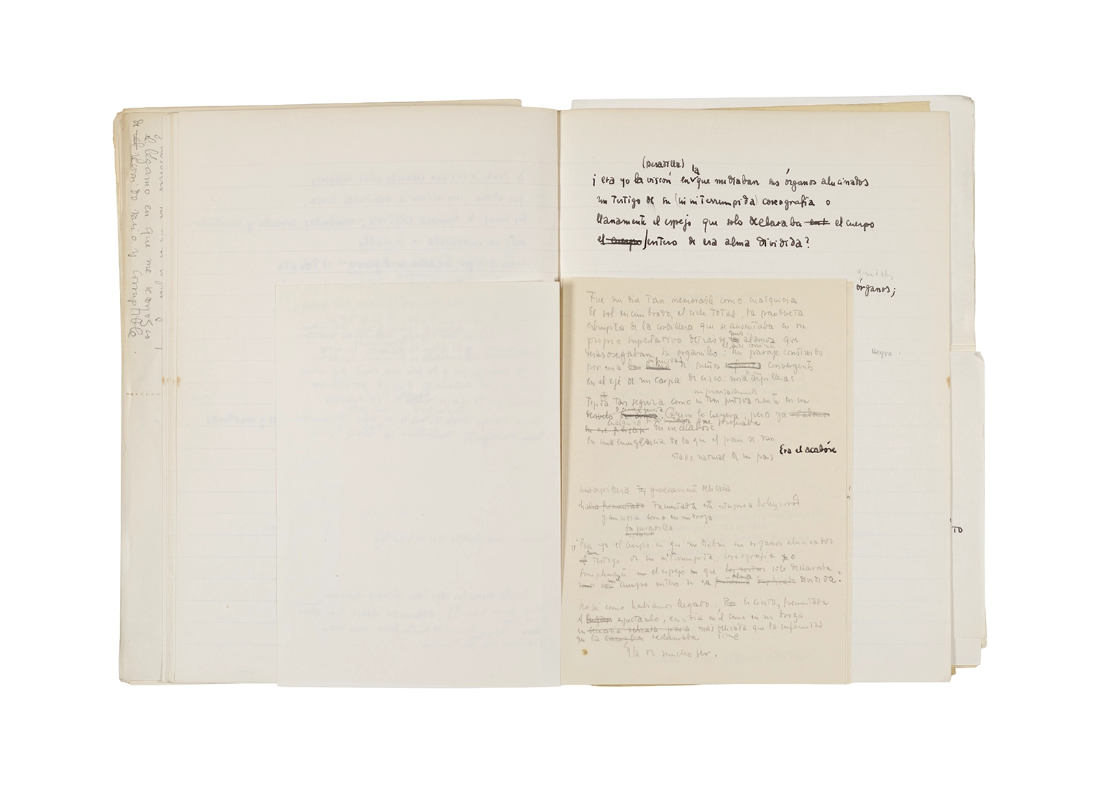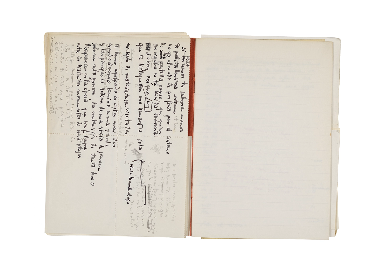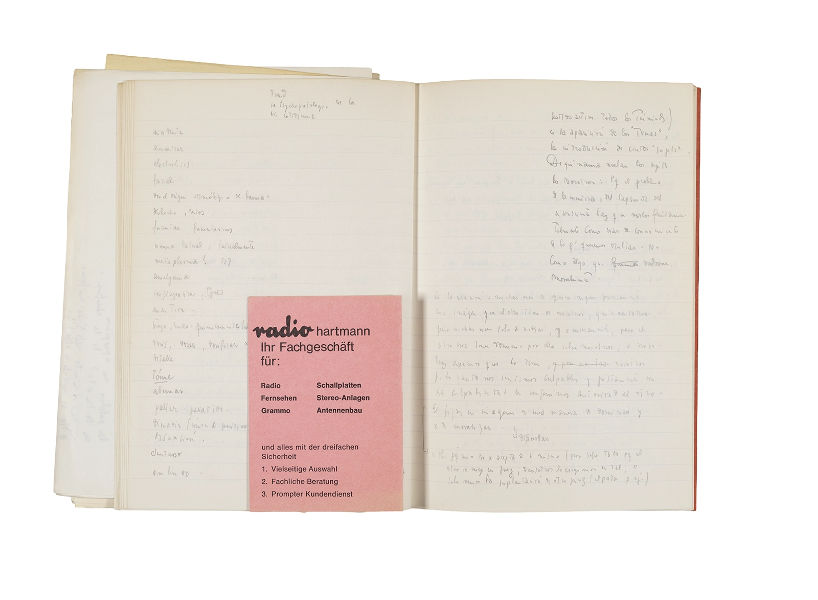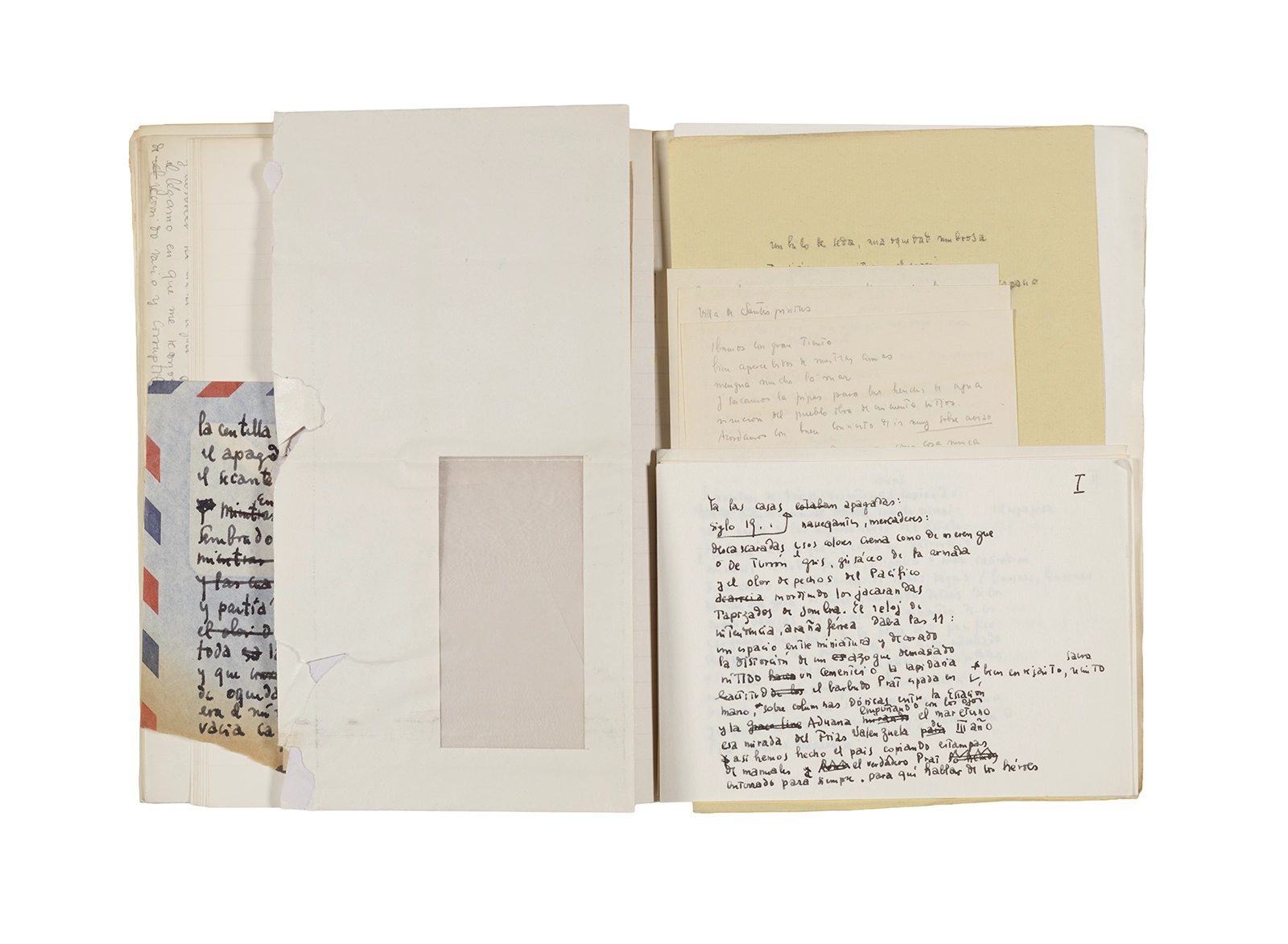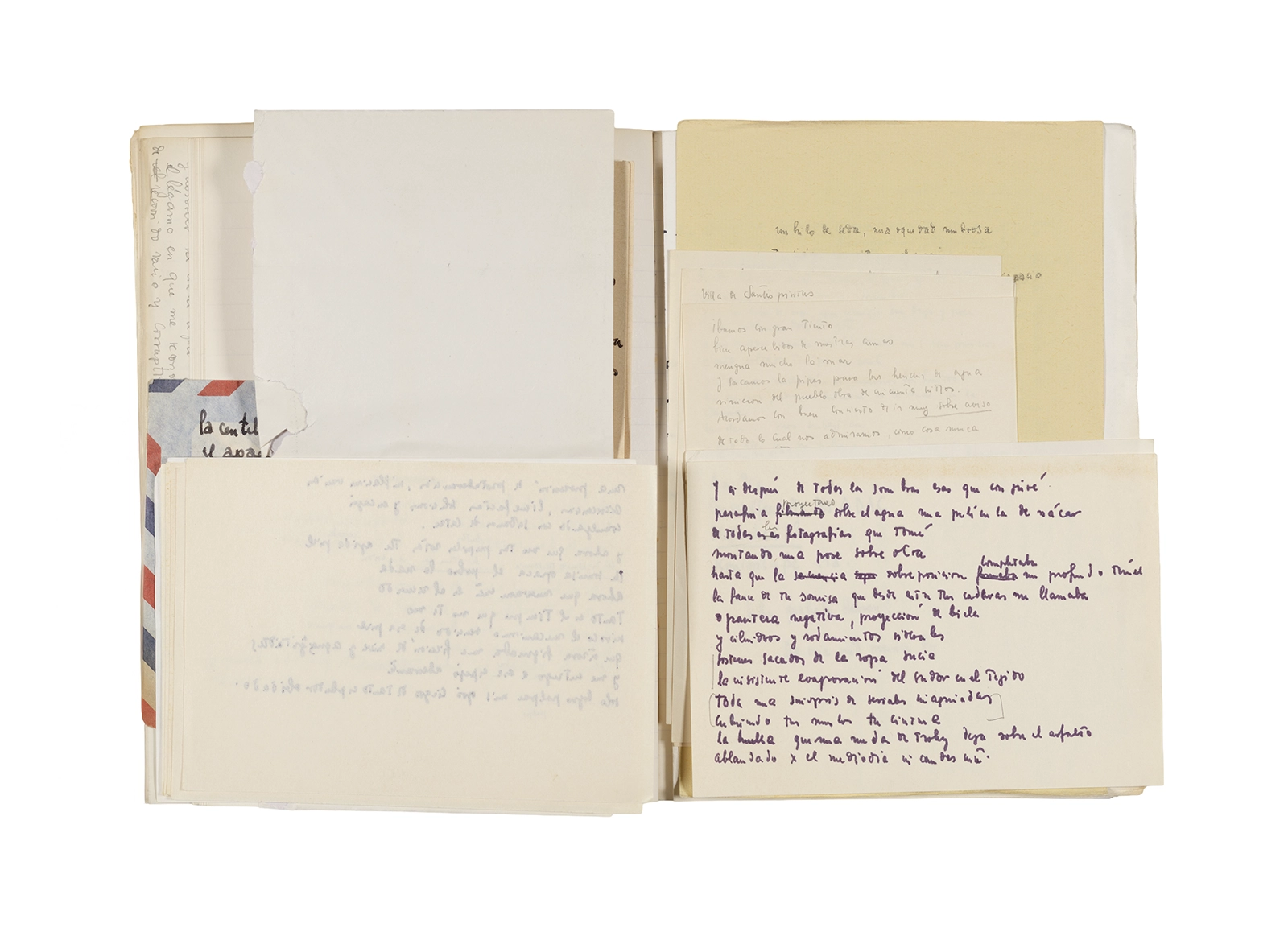 Cuaderno con tapa de cartón rojo unido al lomo por clips metálicos. Contiene en su interior, hojas manuscritas con tinta, lapiz grafito, scripto; hojas de roneo con texto manuscrito; hojas tamaño oficio perforada con anotaciones en tinta; hojas mecanografiadas y con anotaciones en tinta; ficha bibliográfica con texto escrito a mano; boleta con texto escrito en grafito; sobre con texto escrito en grafito.