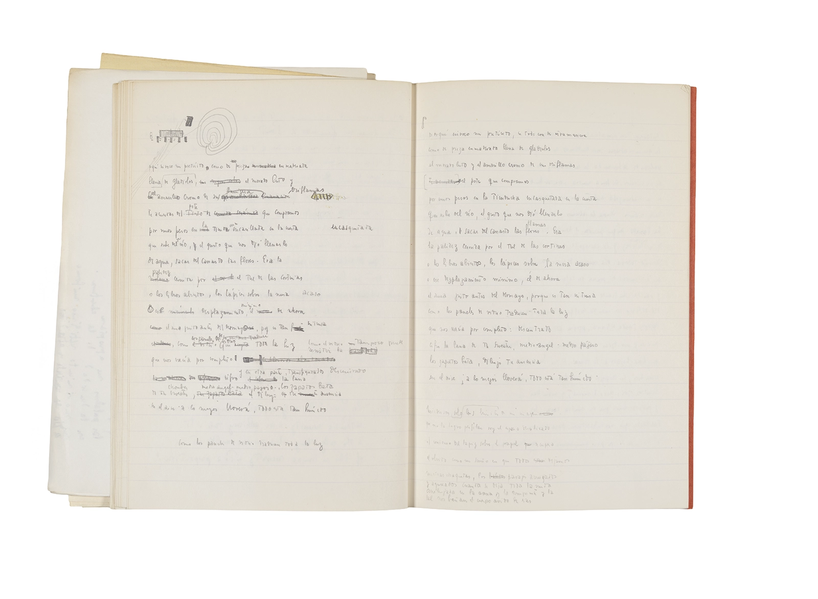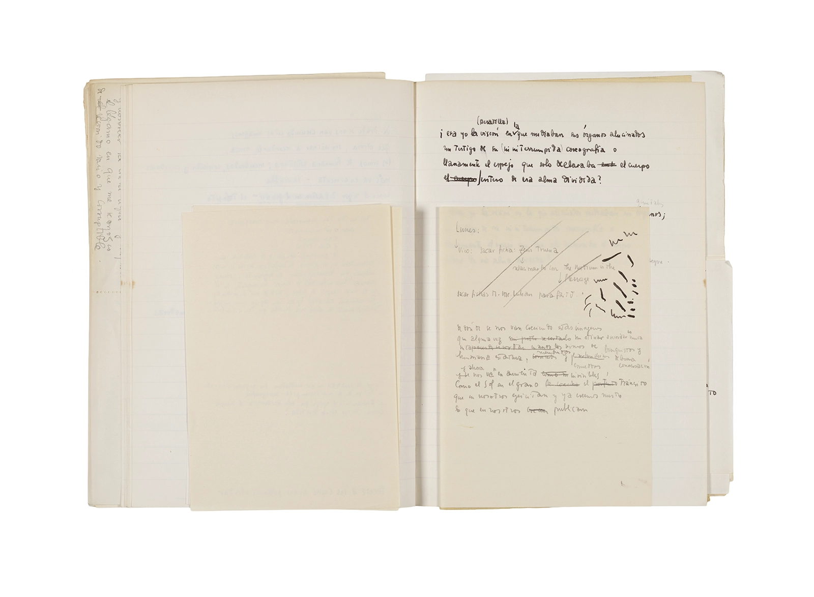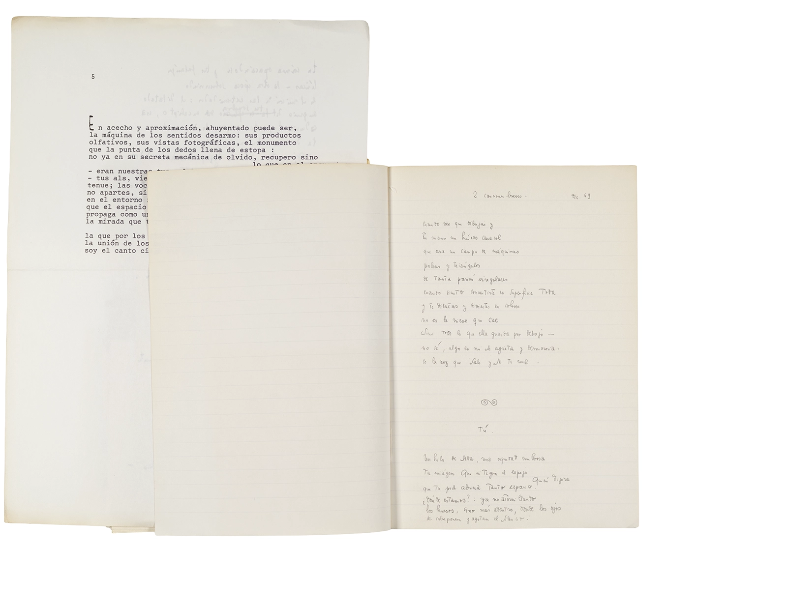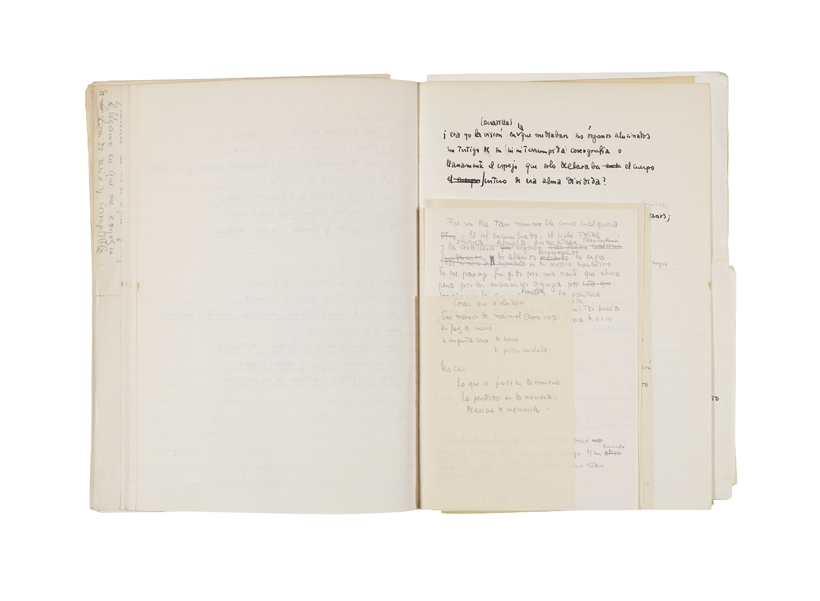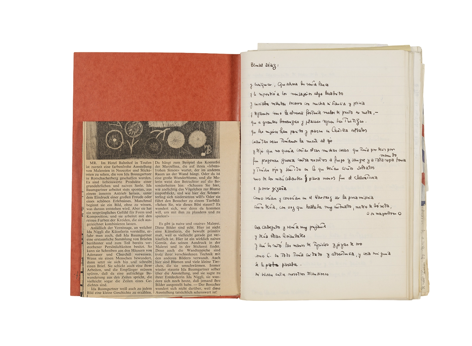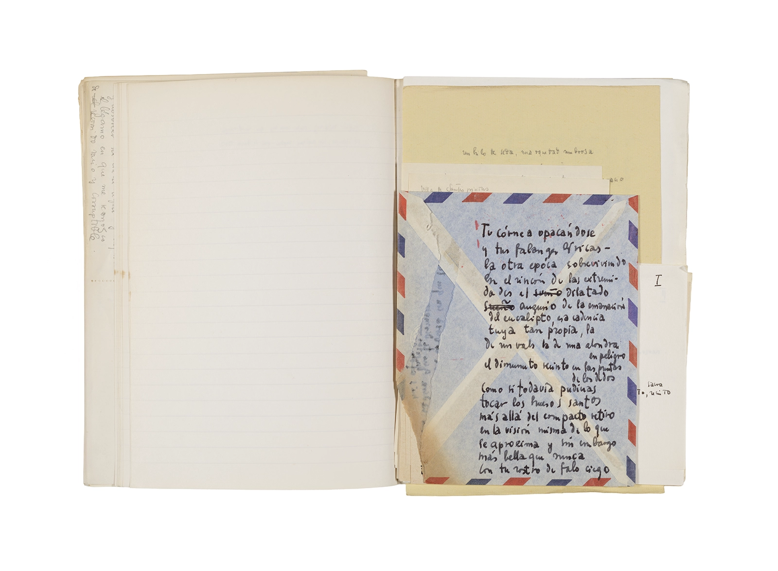 Cuaderno con tapa de cartón rojo unido al lomo por clips metálicos. Contiene en su interior, hojas manuscritas con tinta, lapiz grafito, scripto; hojas de roneo con texto manuscrito; hojas tamaño oficio perforada con anotaciones en tinta; hojas mecanografiadas y con anotaciones en tinta; ficha bibliográfica con texto escrito a mano; boleta con texto escrito en grafito; sobre con texto escrito en grafito.