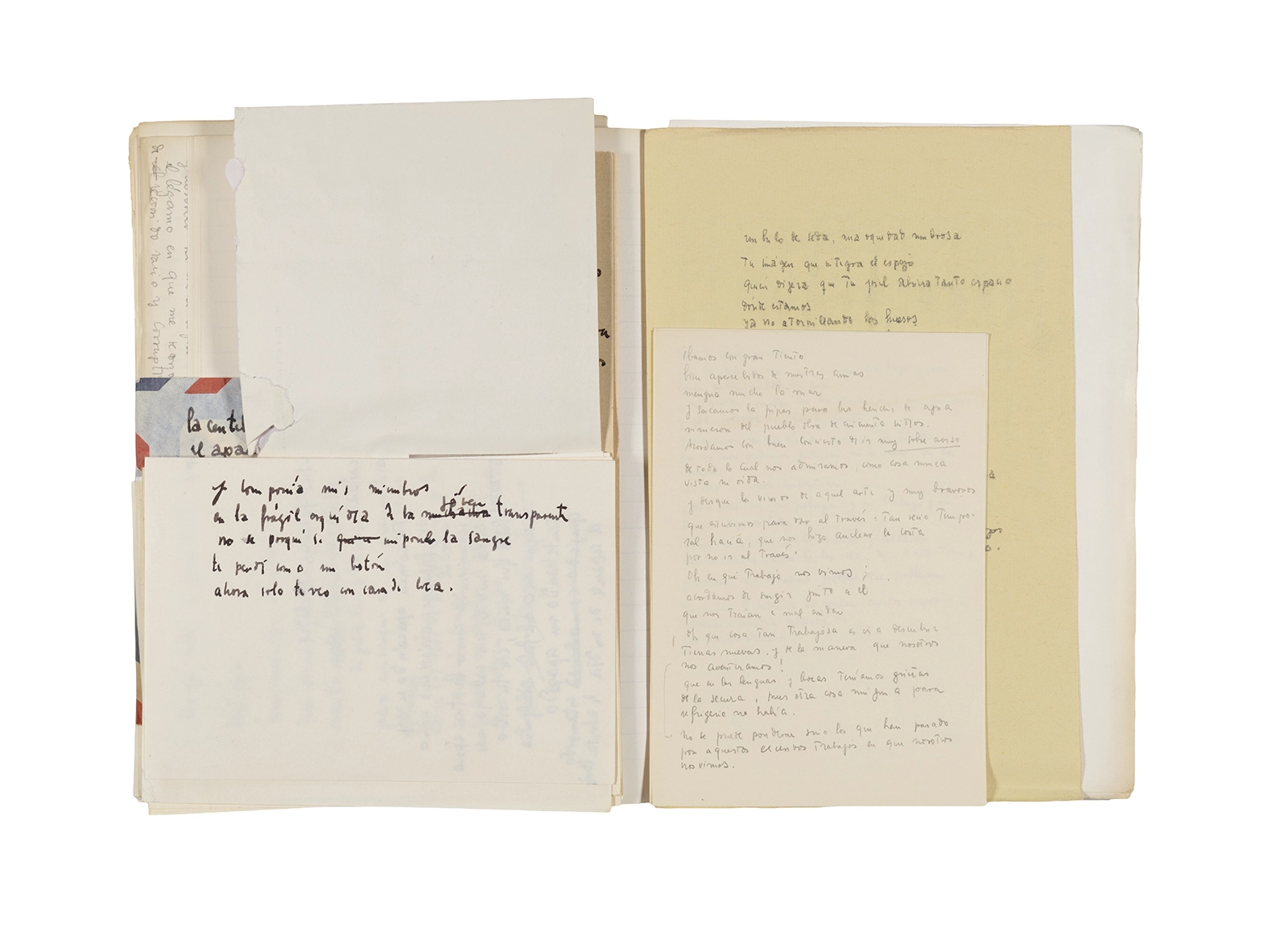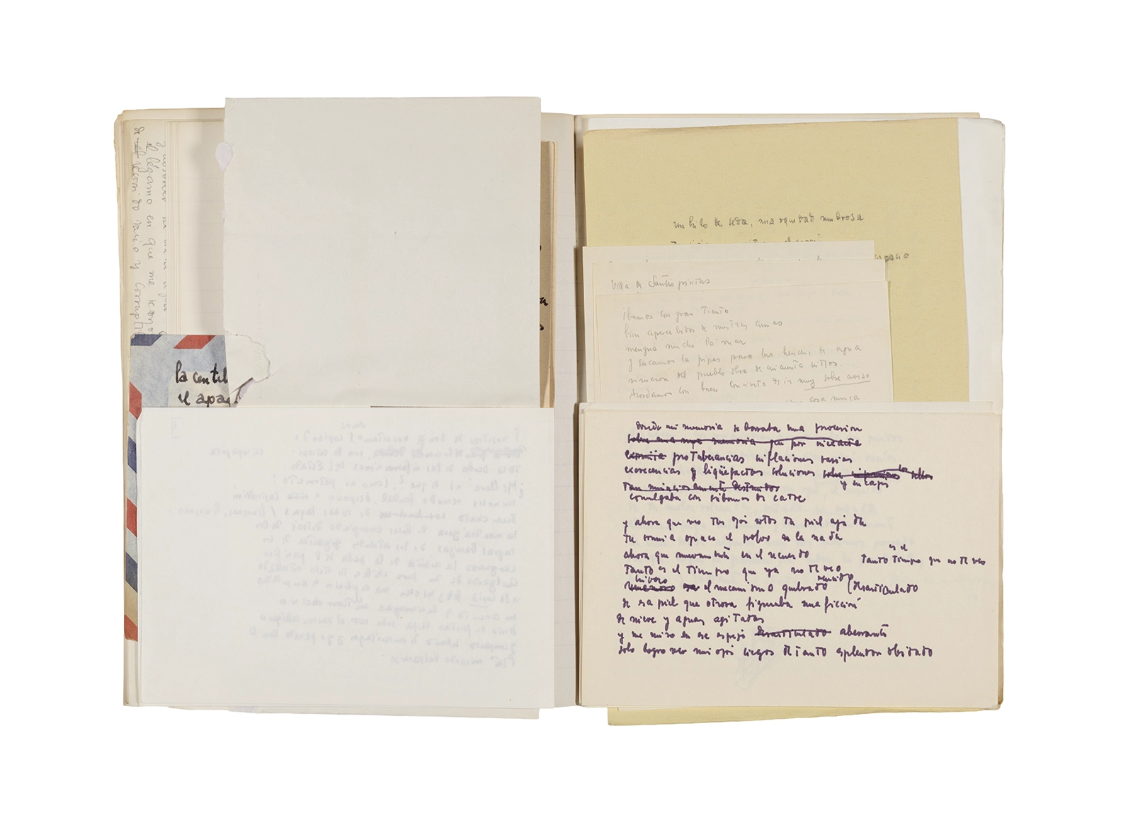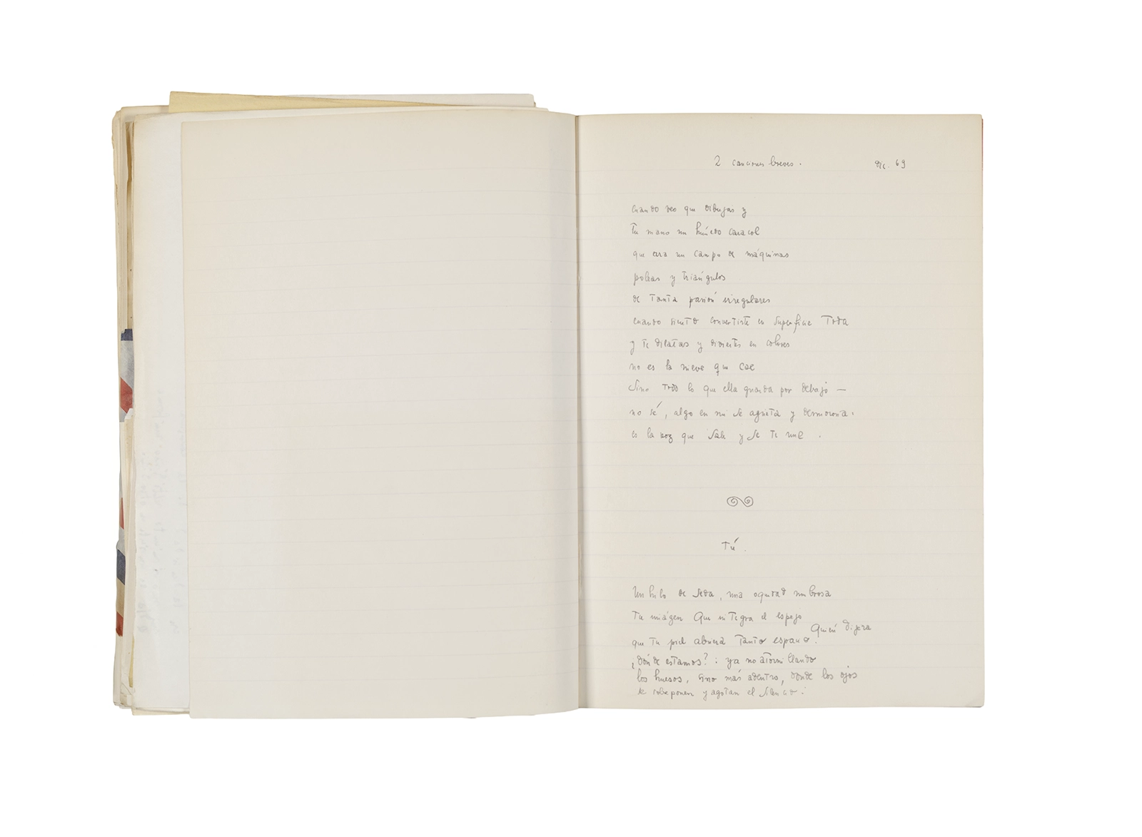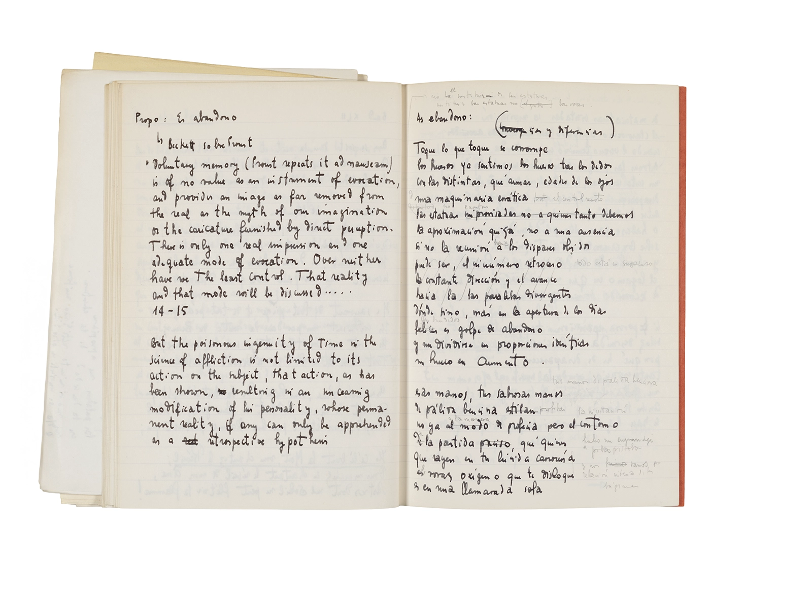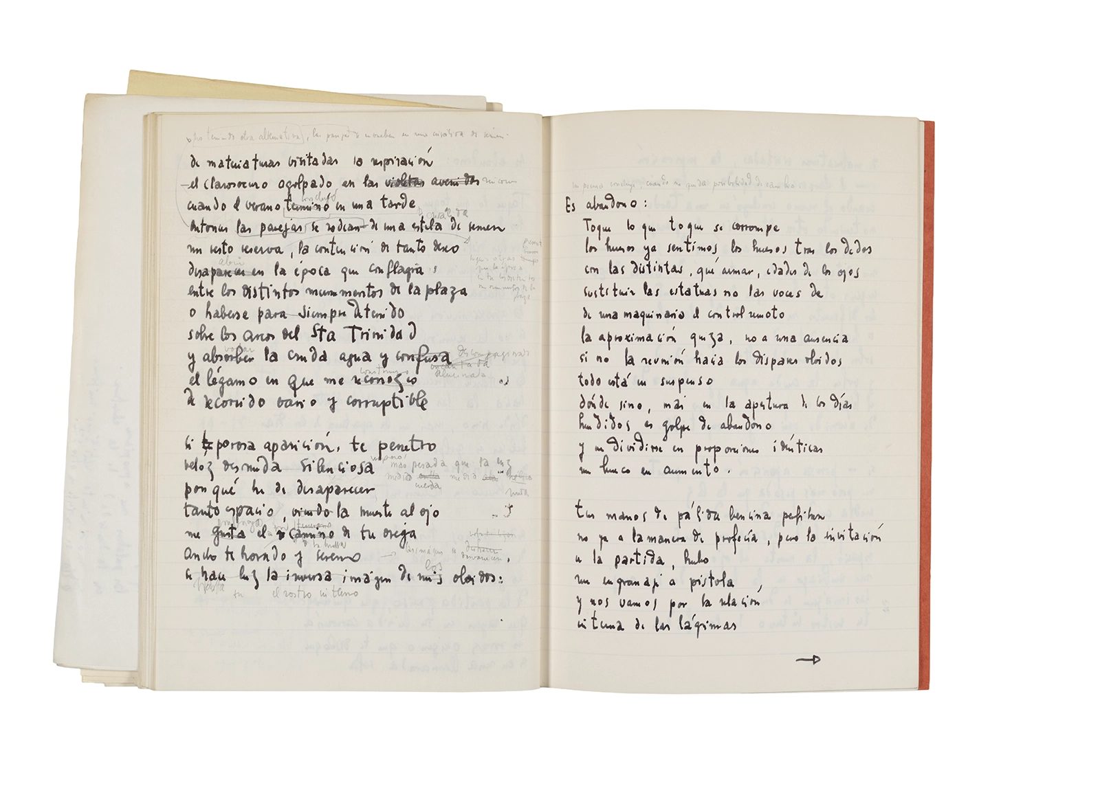 Cuaderno con tapa de cartón rojo unido al lomo por clips metálicos. Contiene en su interior, hojas manuscritas con tinta, lapiz grafito, scripto; hojas de roneo con texto manuscrito; hojas tamaño oficio perforada con anotaciones en tinta; hojas mecanografiadas y con anotaciones en tinta; ficha bibliográfica con texto escrito a mano; boleta con texto escrito en grafito; sobre con texto escrito en grafito.