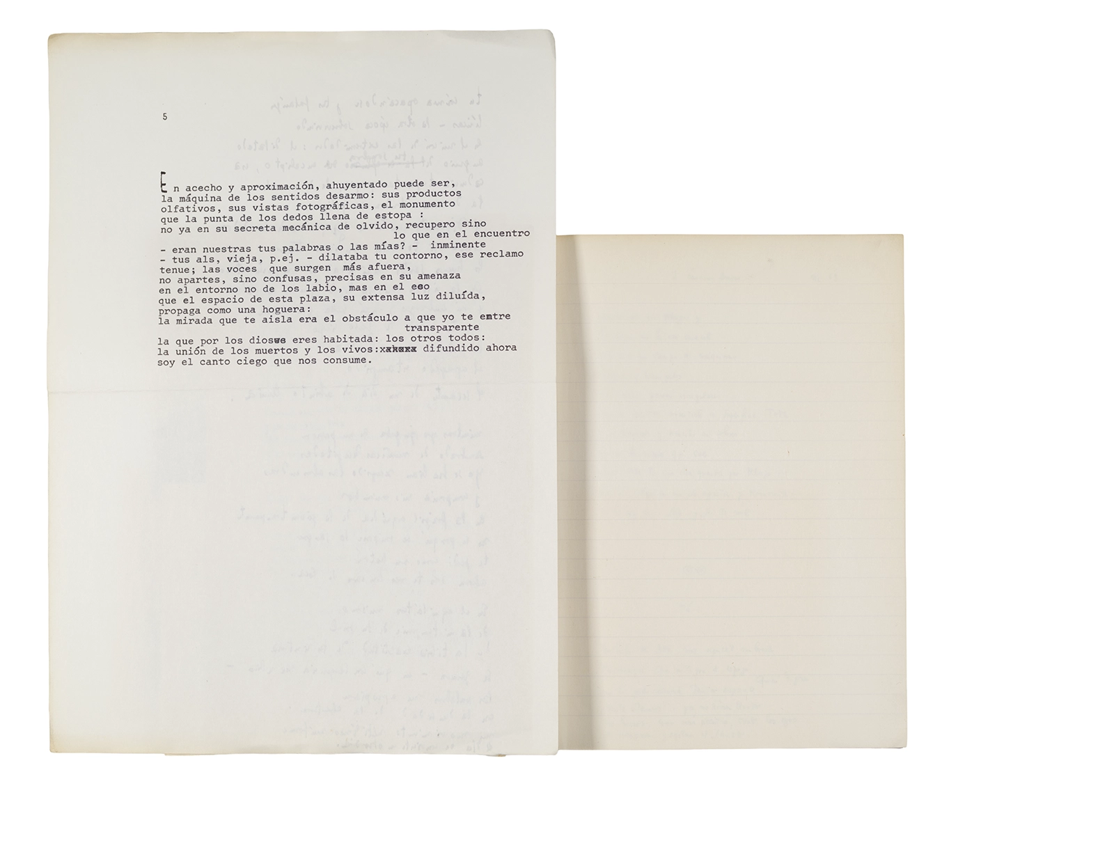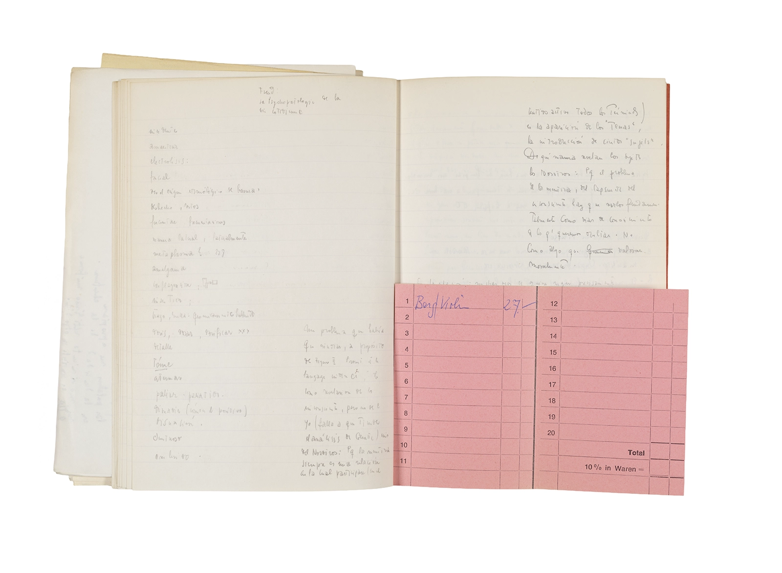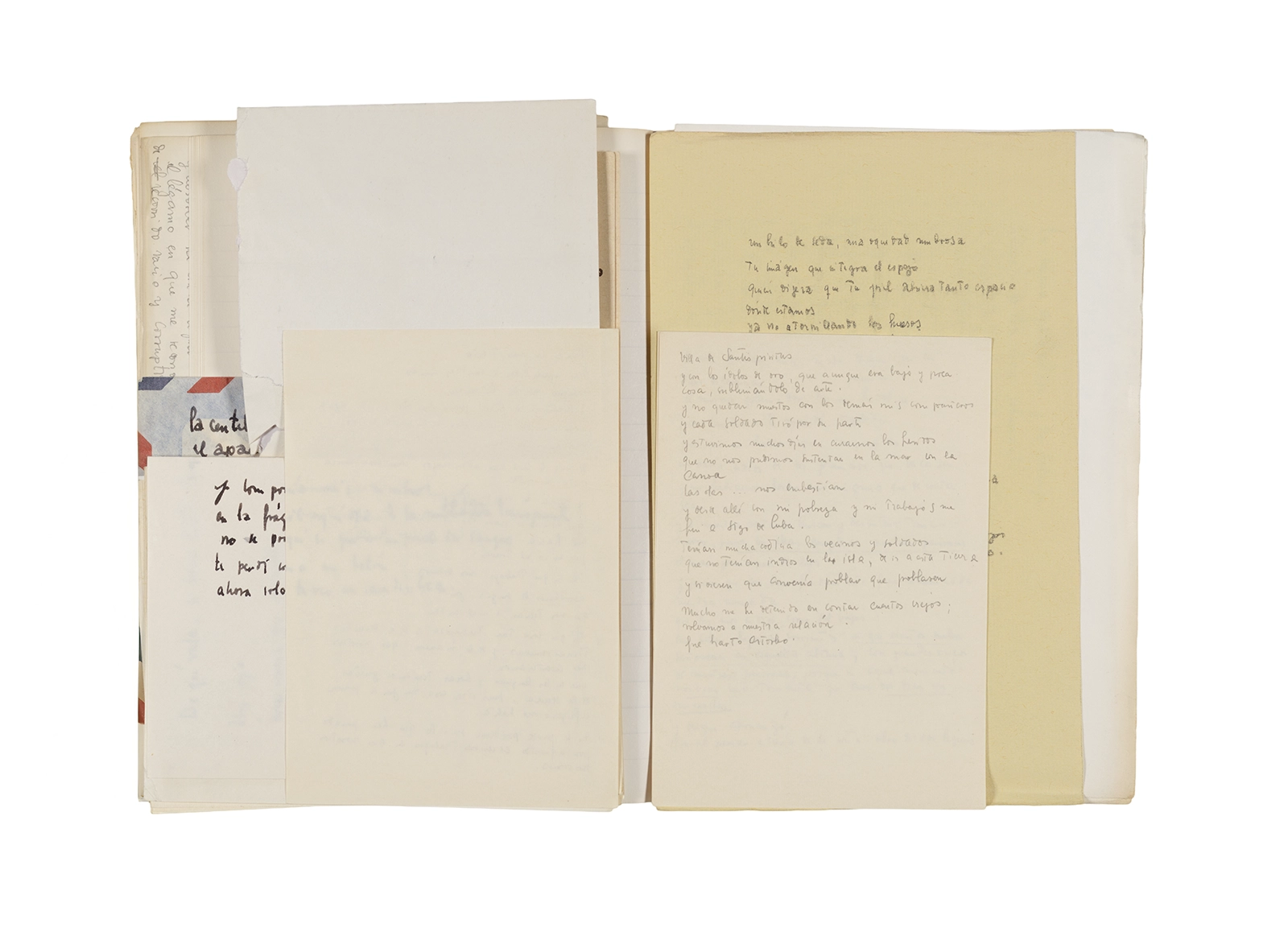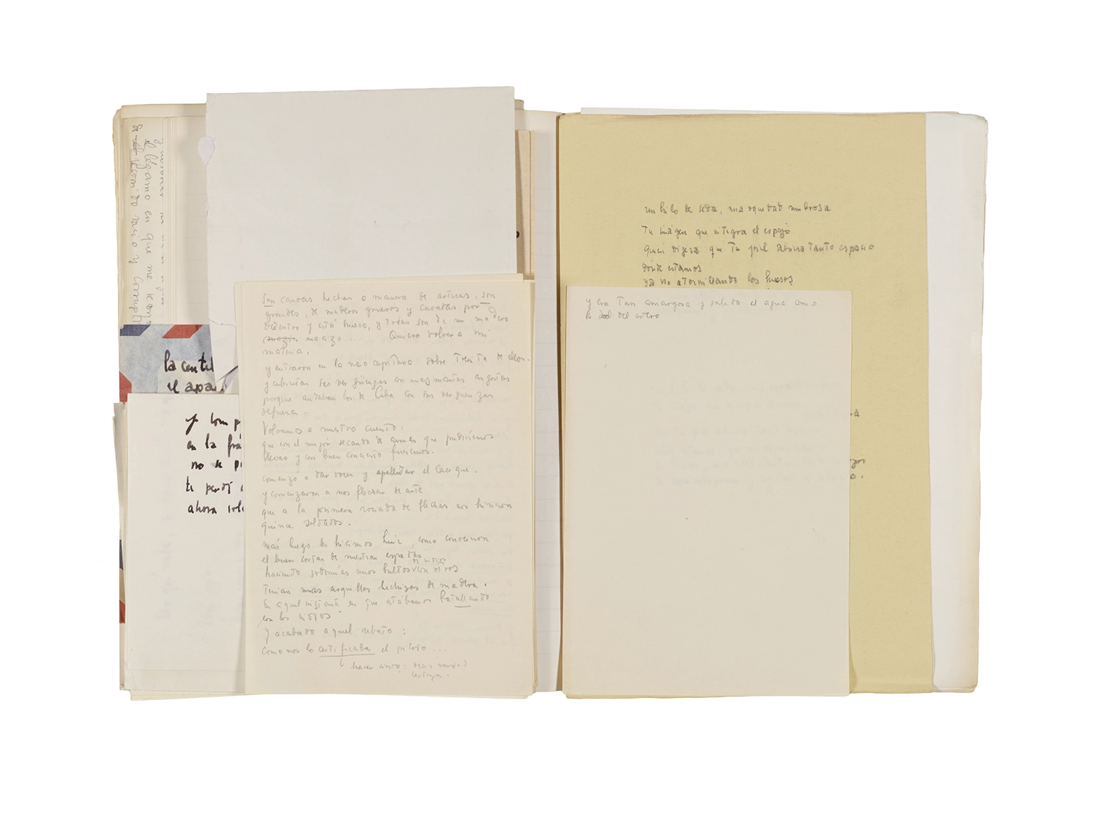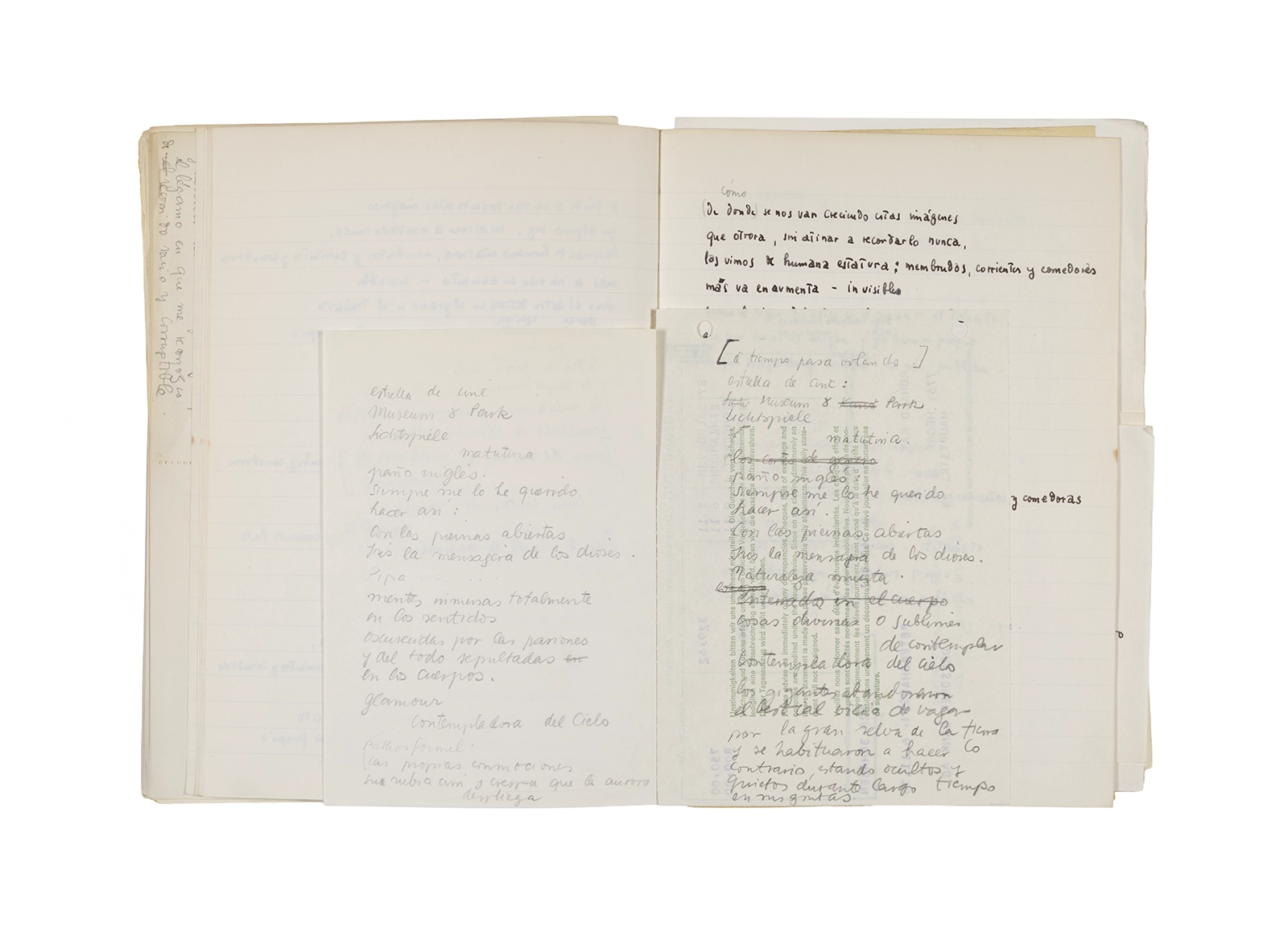 Cuaderno con tapa de cartón rojo unido al lomo por clips metálicos. Contiene en su interior, hojas manuscritas con tinta, lapiz grafito, scripto; hojas de roneo con texto manuscrito; hojas tamaño oficio perforada con anotaciones en tinta; hojas mecanografiadas y con anotaciones en tinta; ficha bibliográfica con texto escrito a mano; boleta con texto escrito en grafito; sobre con texto escrito en grafito.