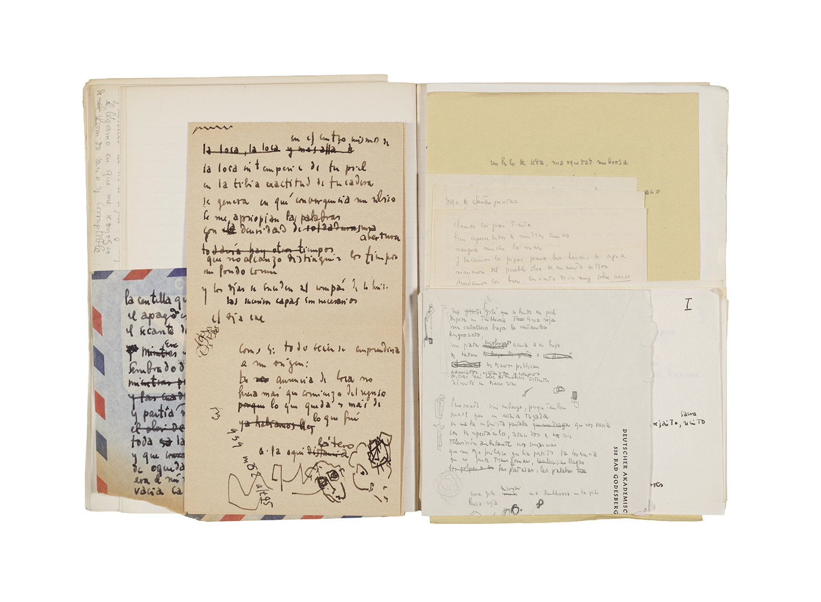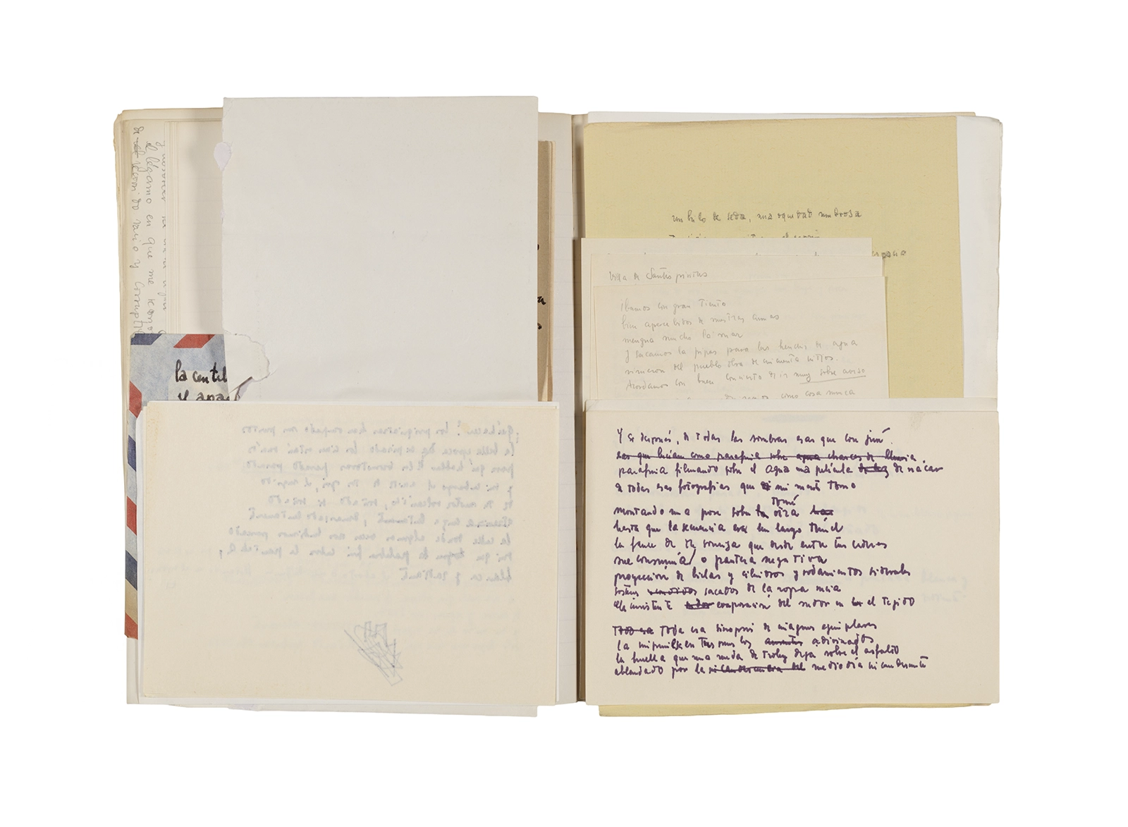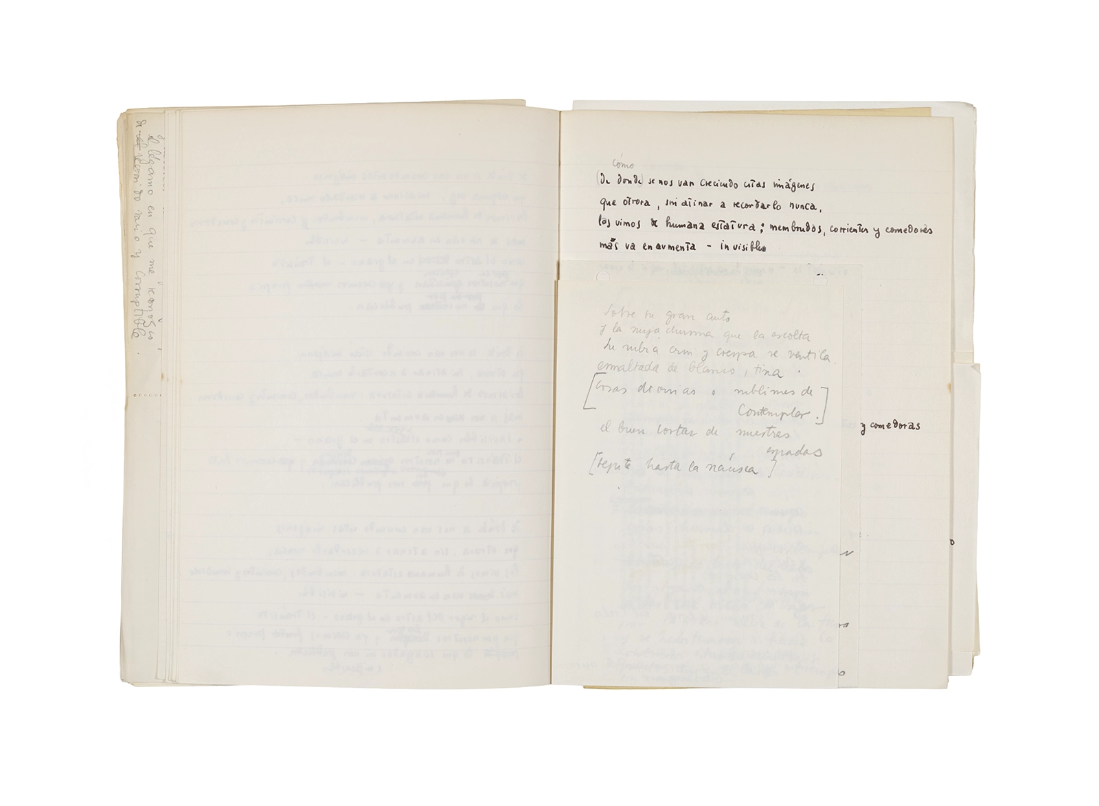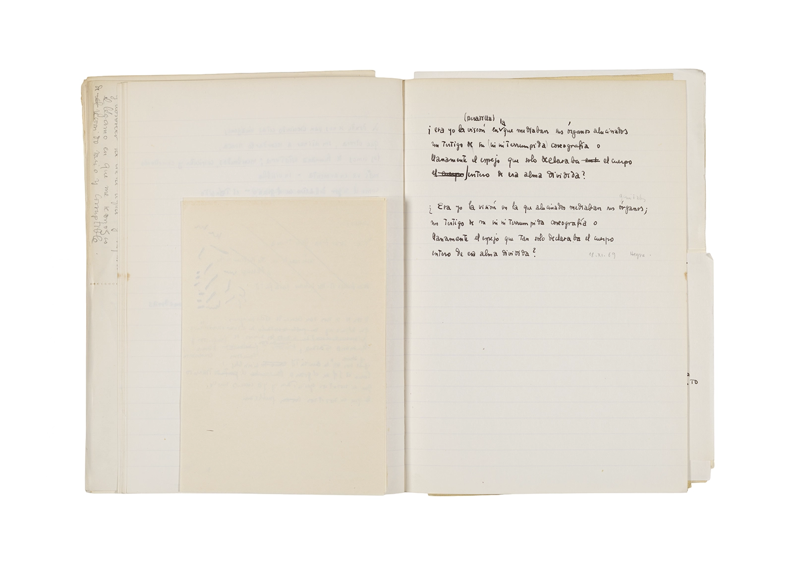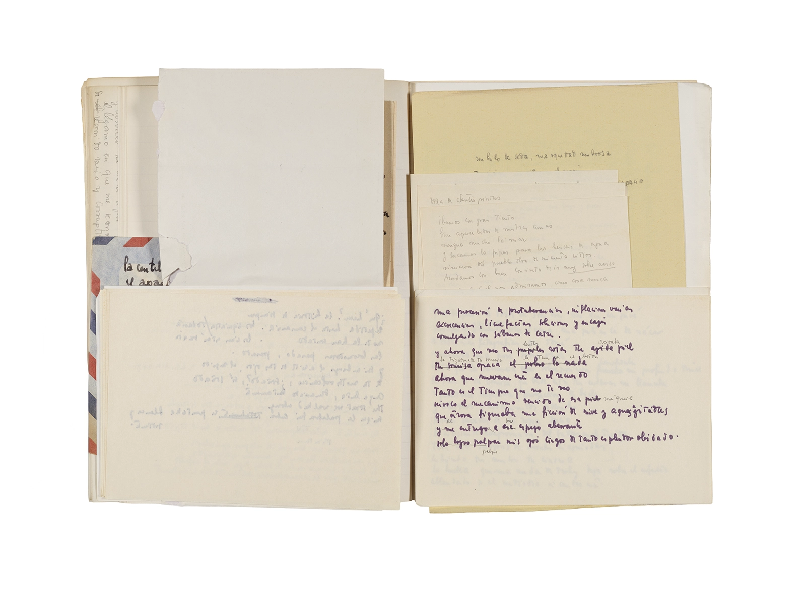 Cuaderno con tapa de cartón rojo unido al lomo por clips metálicos. Contiene en su interior, hojas manuscritas con tinta, lapiz grafito, scripto; hojas de roneo con texto manuscrito; hojas tamaño oficio perforada con anotaciones en tinta; hojas mecanografiadas y con anotaciones en tinta; ficha bibliográfica con texto escrito a mano; boleta con texto escrito en grafito; sobre con texto escrito en grafito.