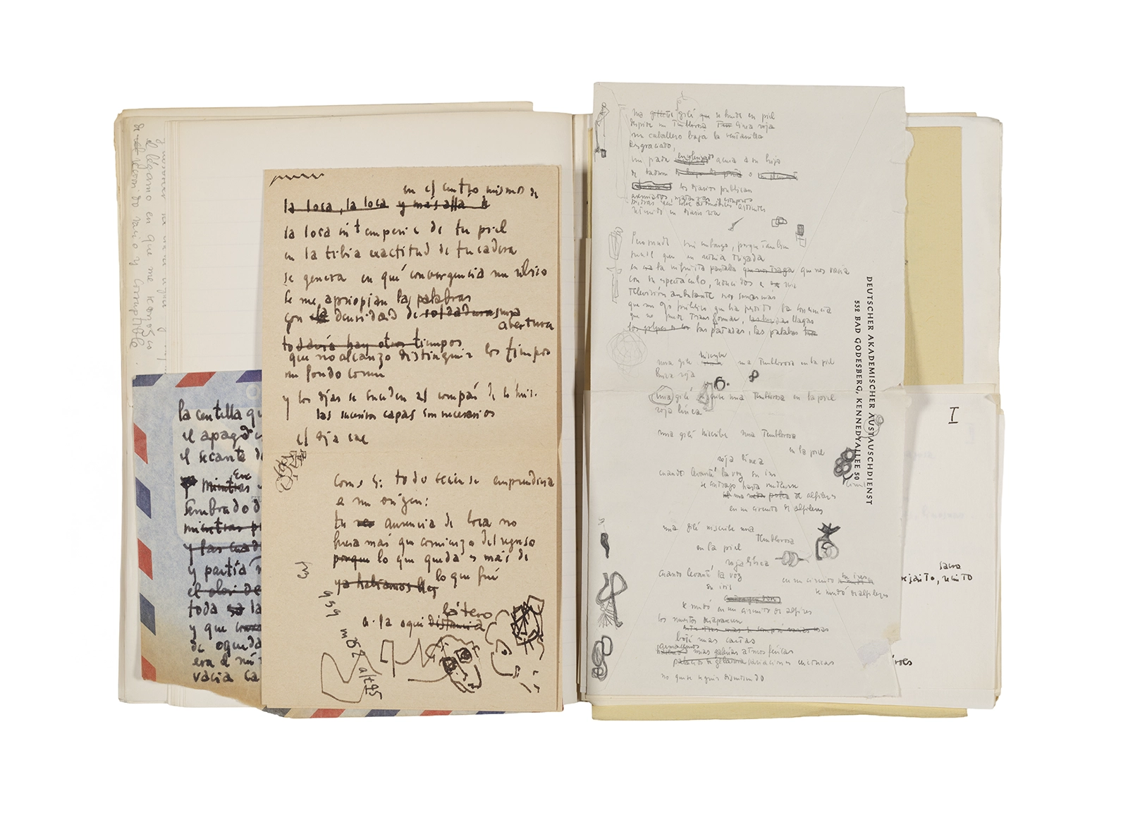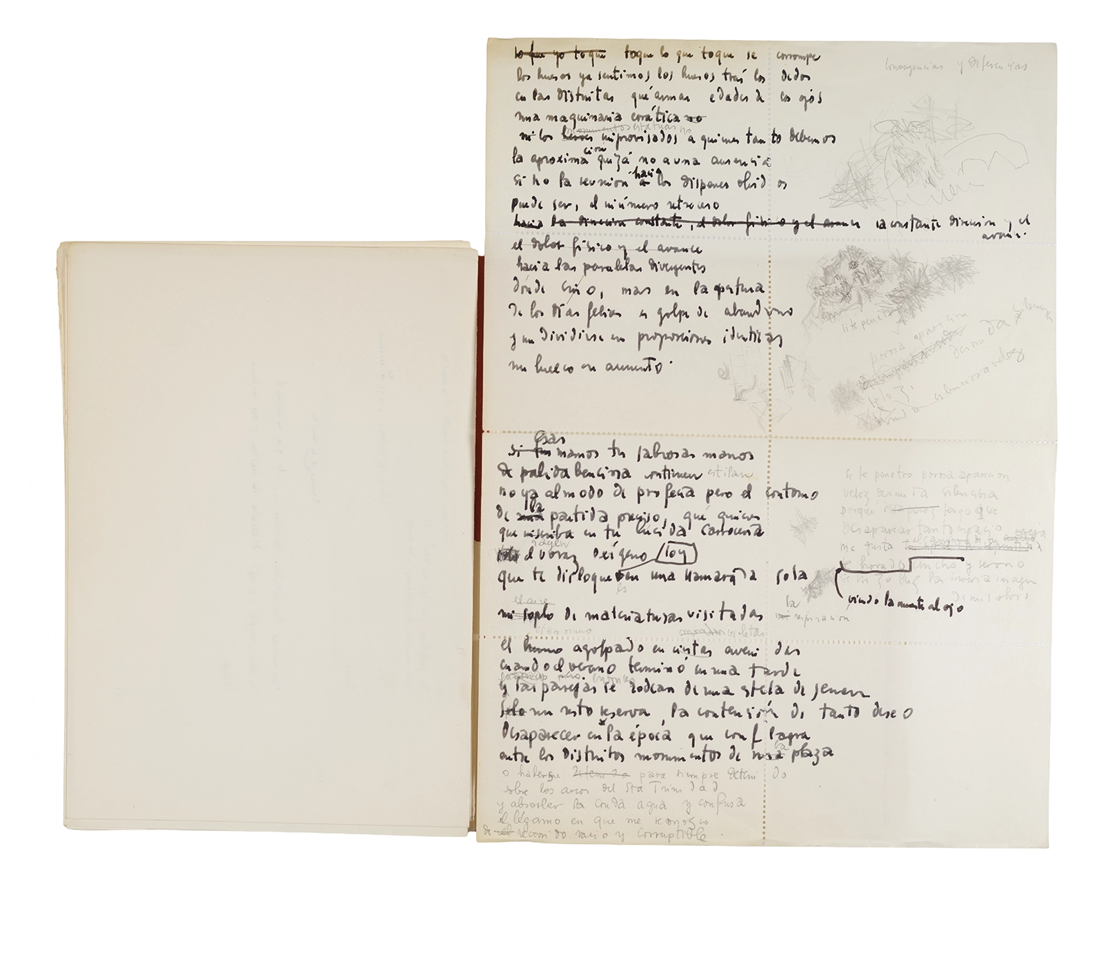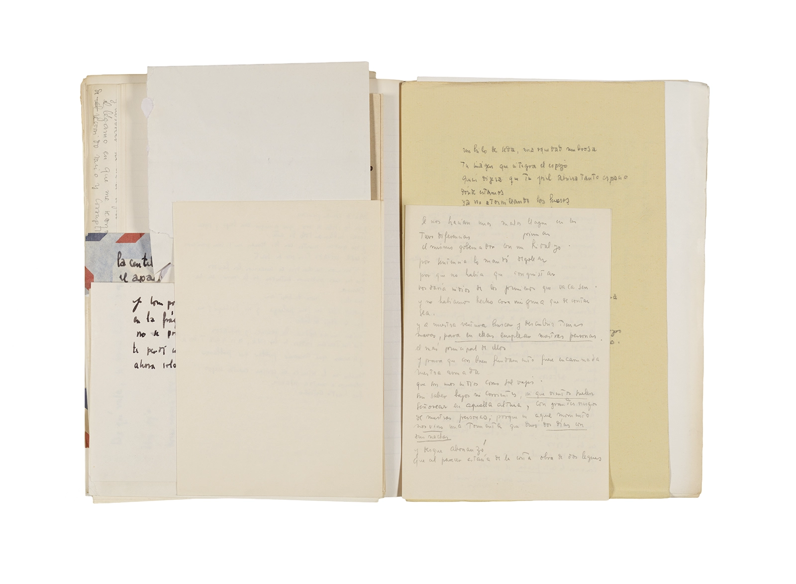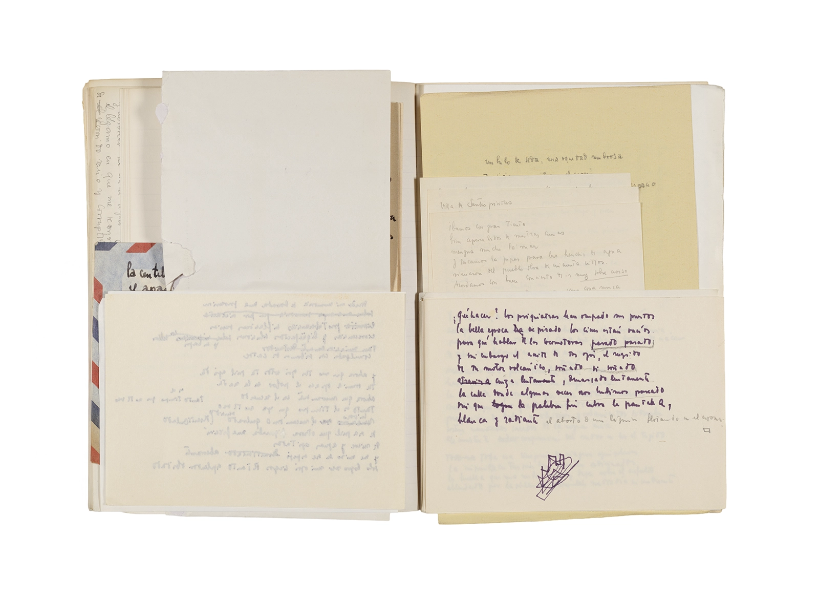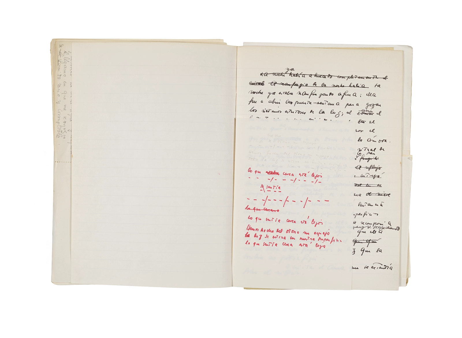 Cuaderno con tapa de cartón rojo unido al lomo por clips metálicos. Contiene en su interior, hojas manuscritas con tinta, lapiz grafito, scripto; hojas de roneo con texto manuscrito; hojas tamaño oficio perforada con anotaciones en tinta; hojas mecanografiadas y con anotaciones en tinta; ficha bibliográfica con texto escrito a mano; boleta con texto escrito en grafito; sobre con texto escrito en grafito.