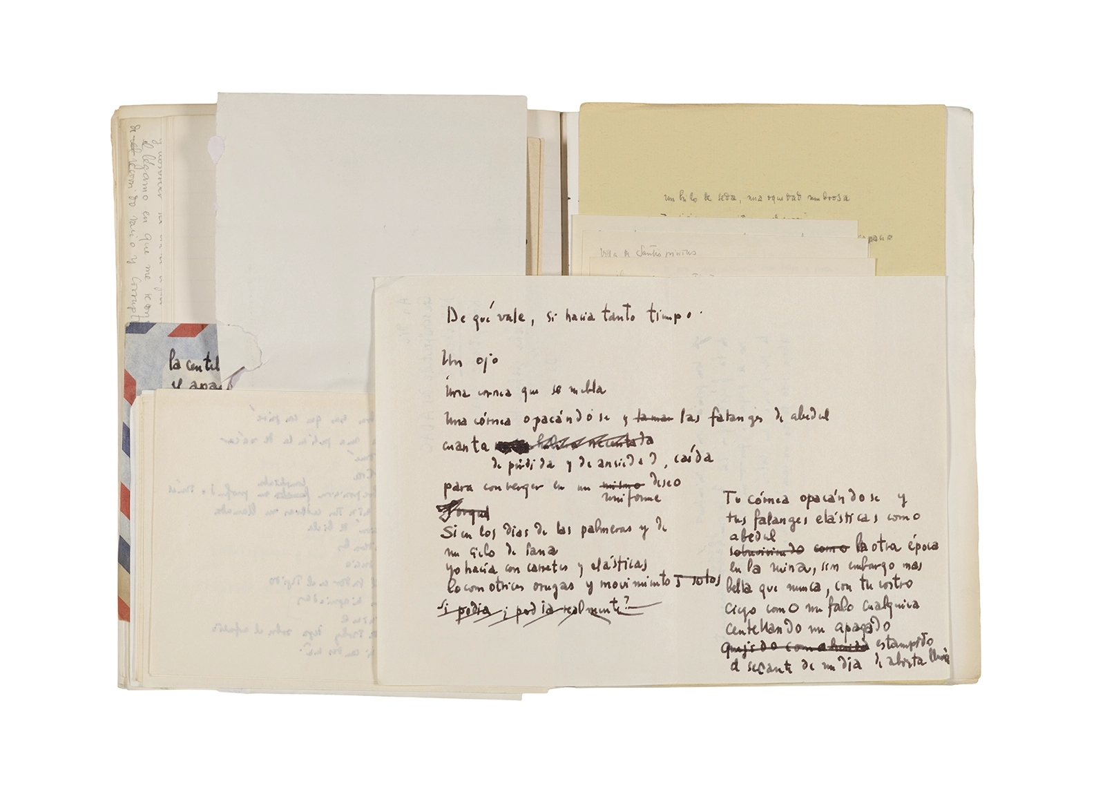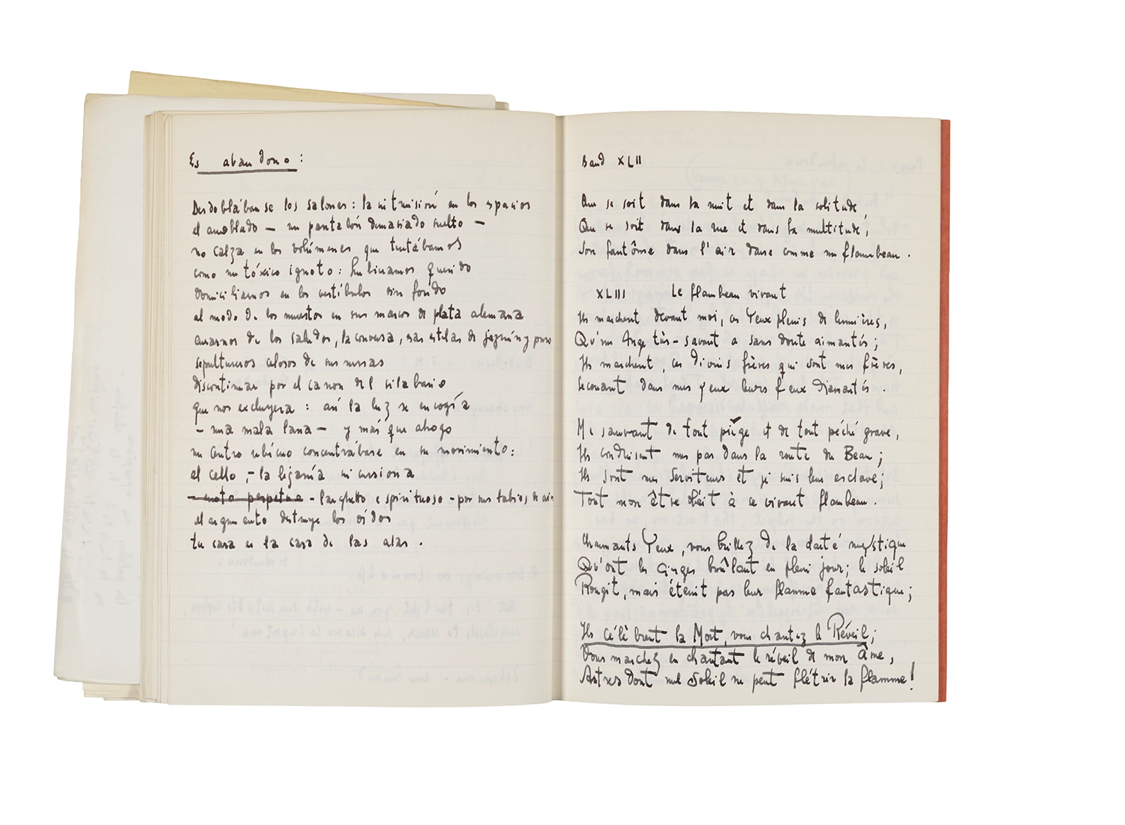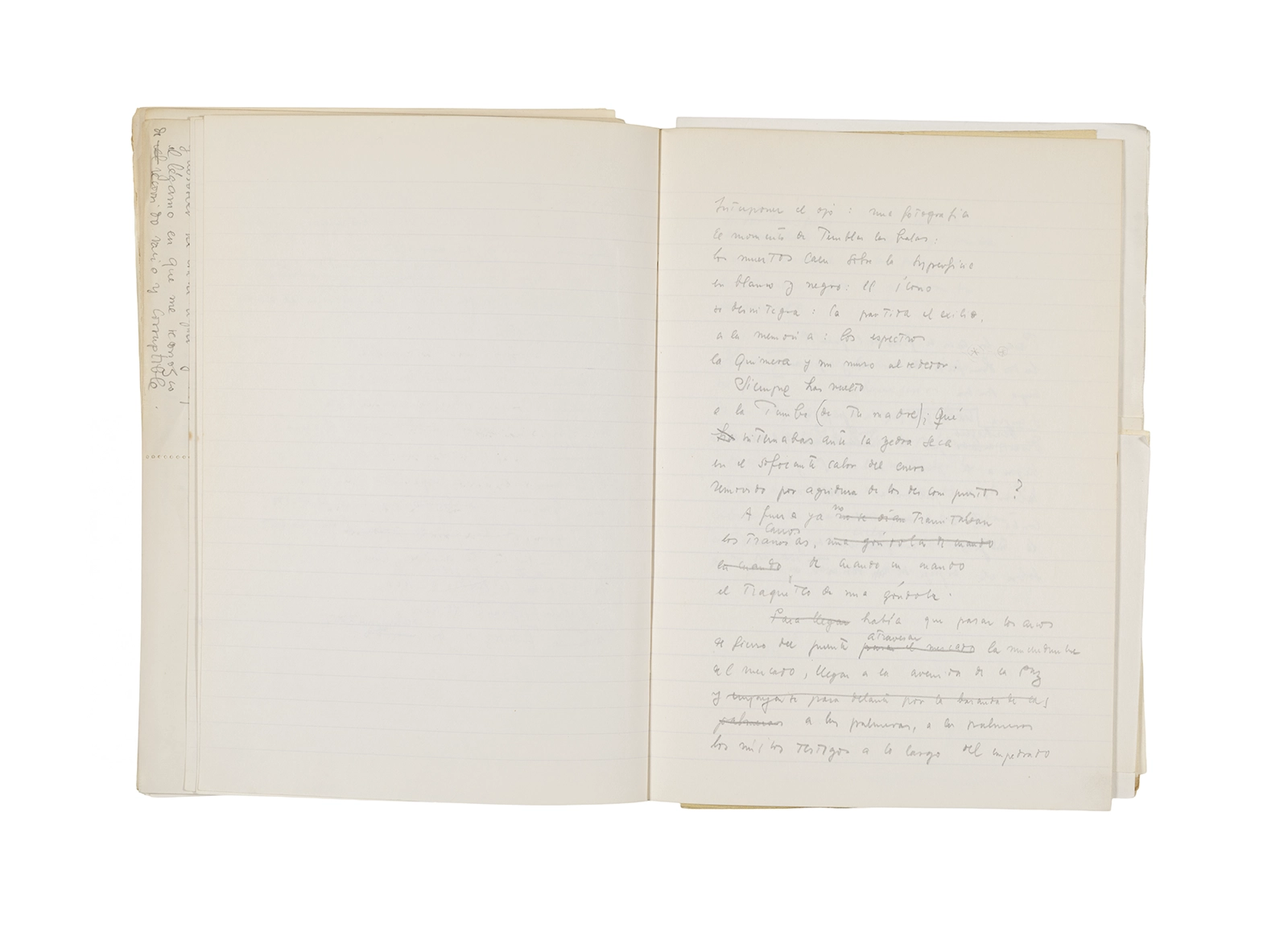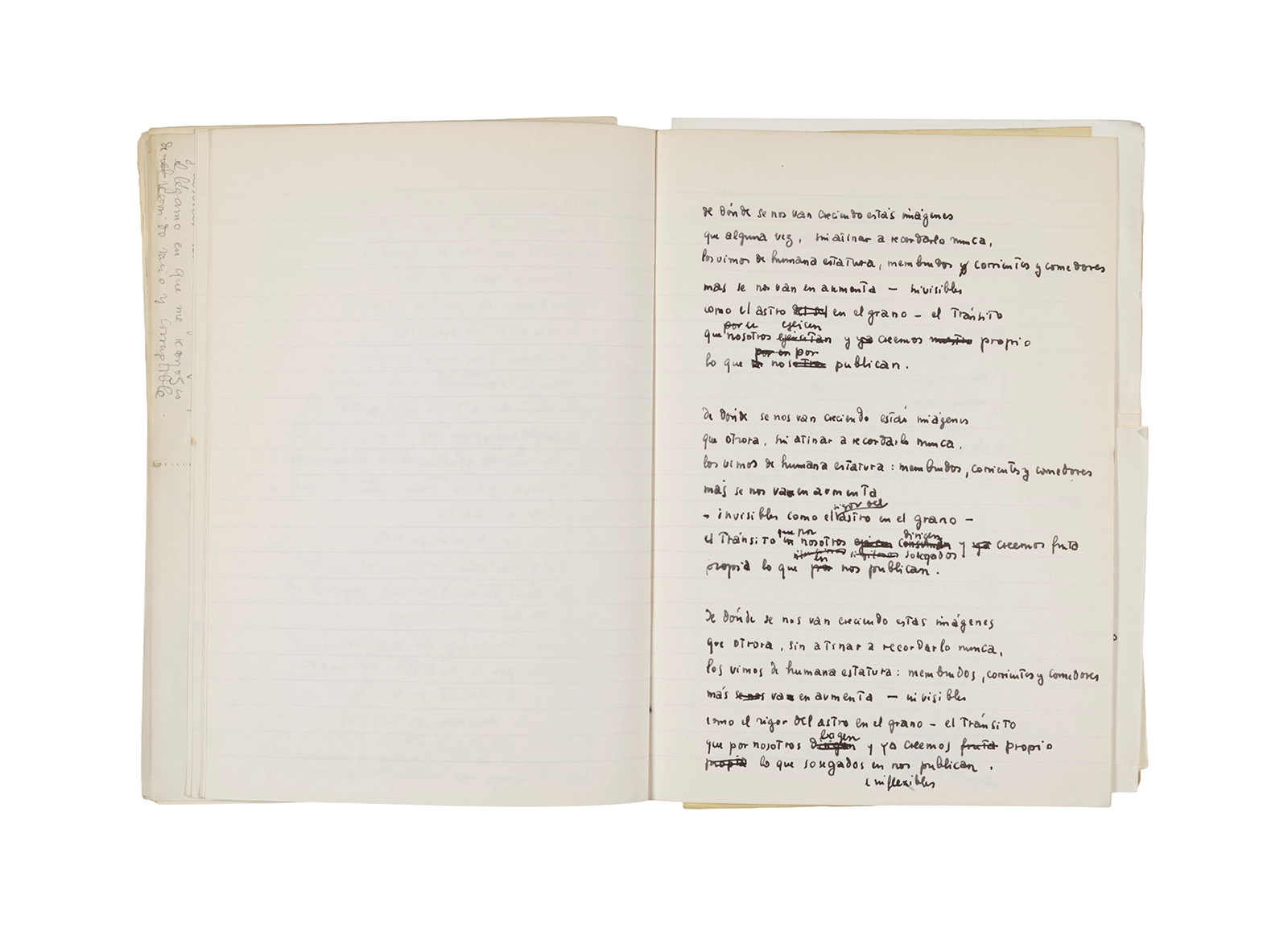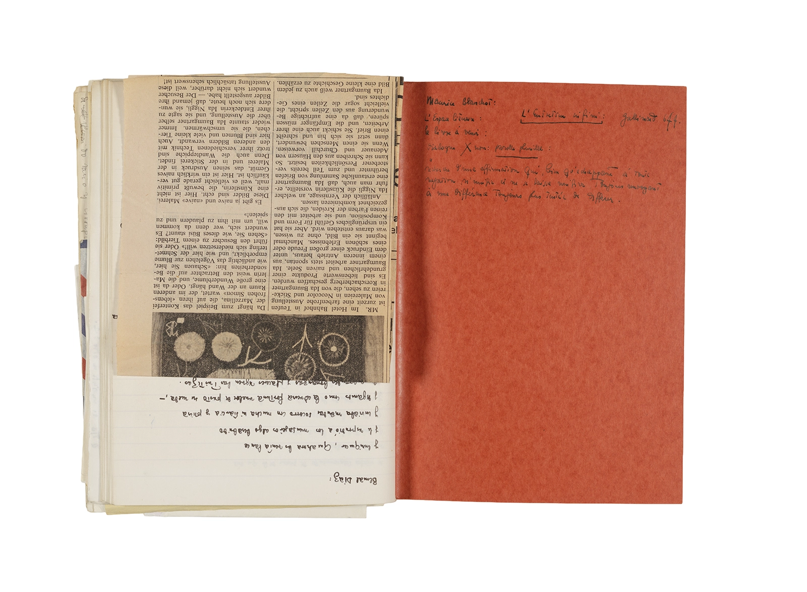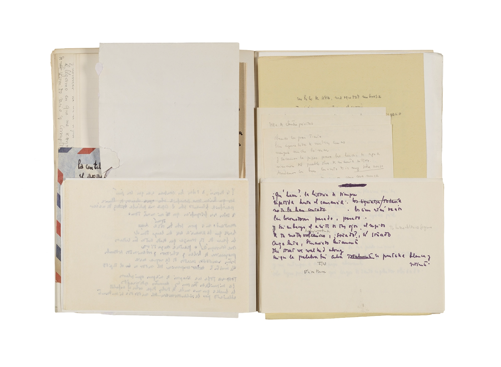 Cuaderno con tapa de cartón rojo unido al lomo por clips metálicos. Contiene en su interior, hojas manuscritas con tinta, lapiz grafito, scripto; hojas de roneo con texto manuscrito; hojas tamaño oficio perforada con anotaciones en tinta; hojas mecanografiadas y con anotaciones en tinta; ficha bibliográfica con texto escrito a mano; boleta con texto escrito en grafito; sobre con texto escrito en grafito.