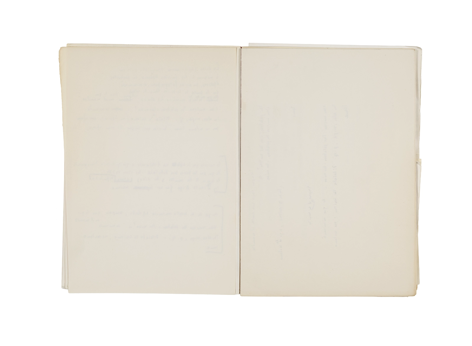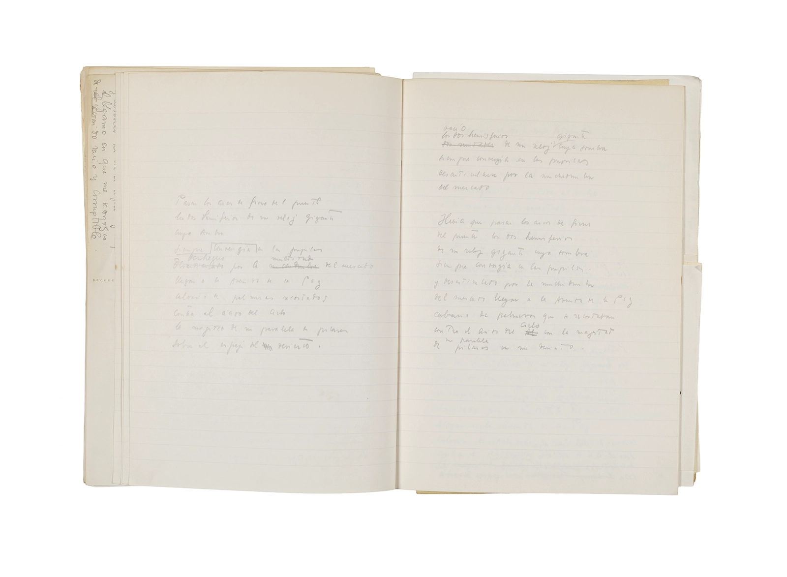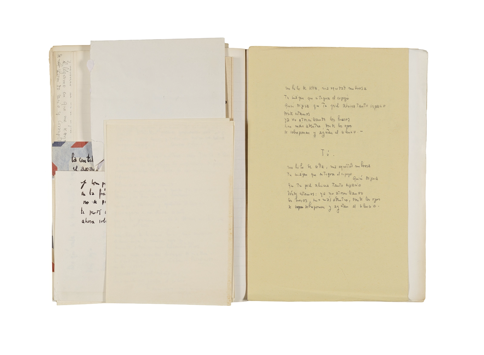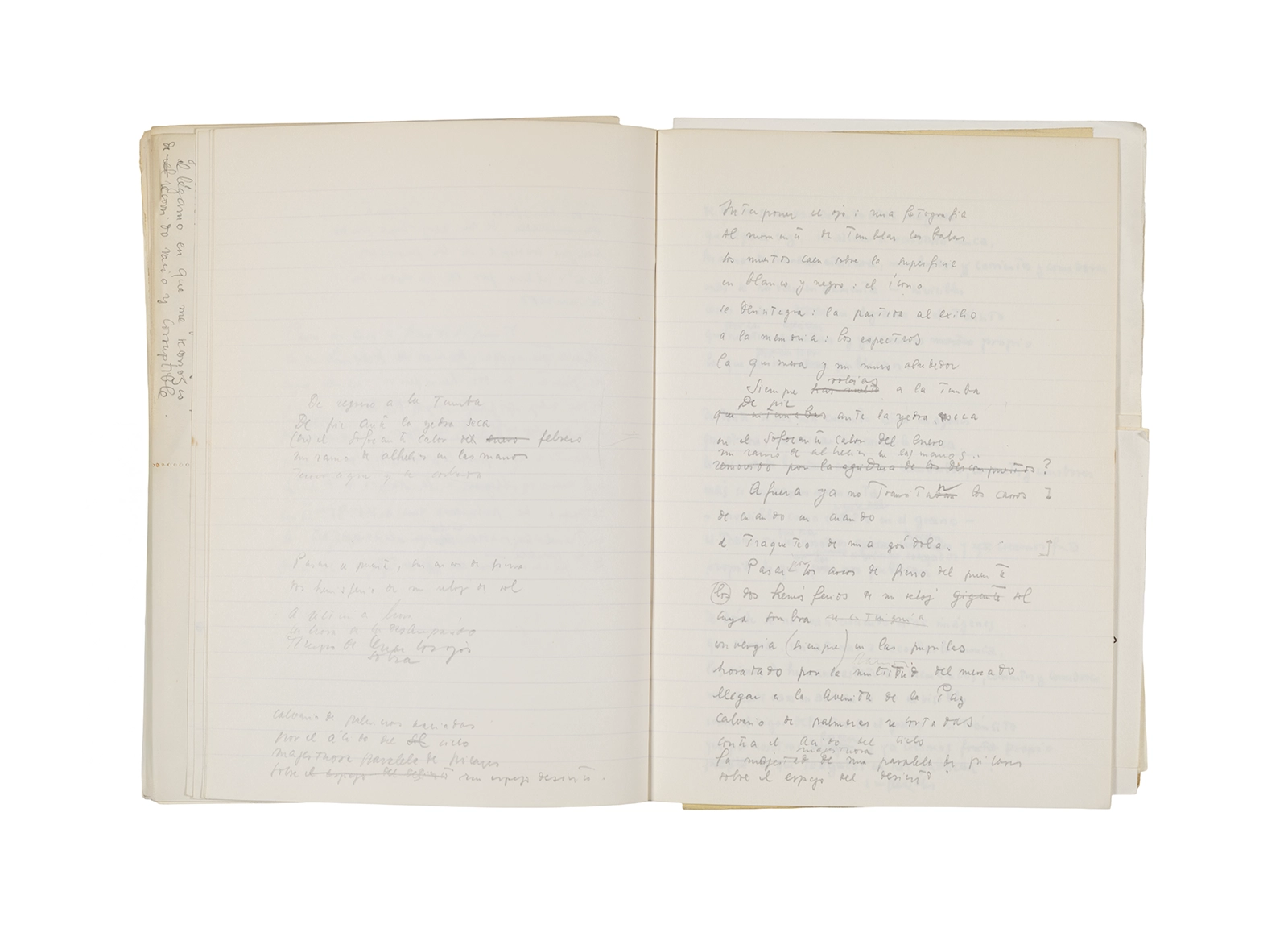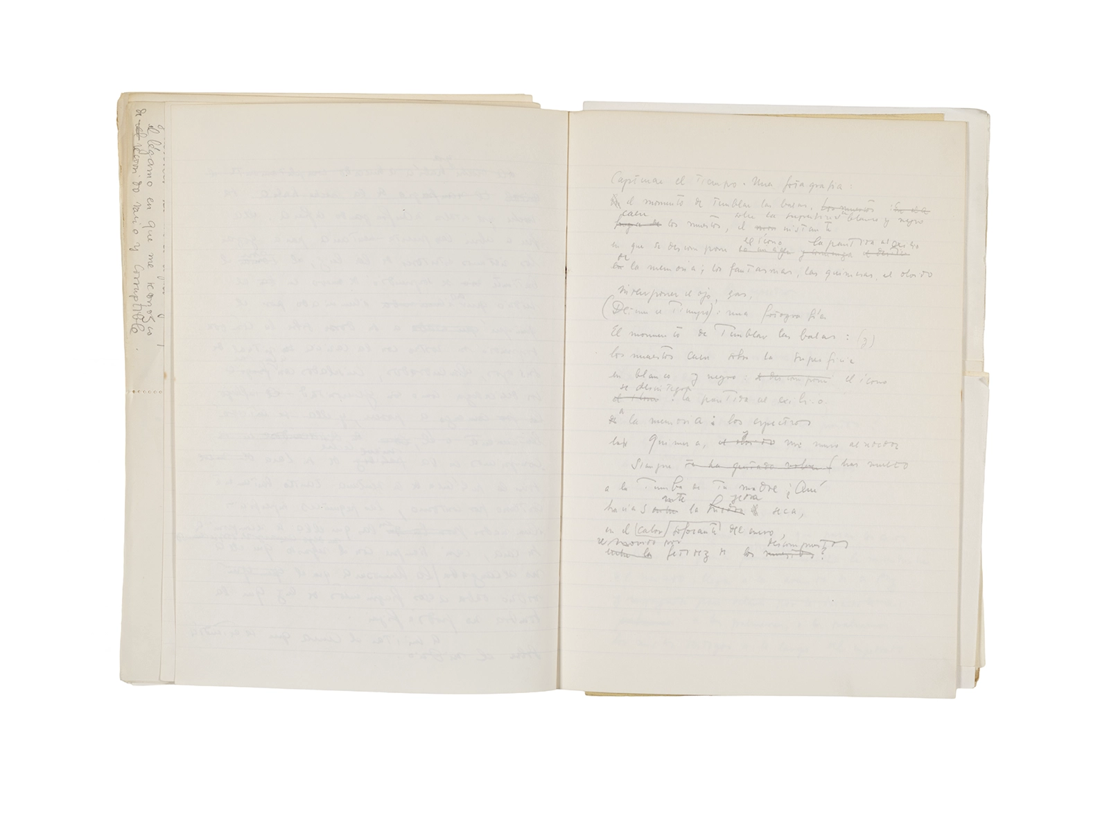 Cuaderno con tapa de cartón rojo unido al lomo por clips metálicos. Contiene en su interior, hojas manuscritas con tinta, lapiz grafito, scripto; hojas de roneo con texto manuscrito; hojas tamaño oficio perforada con anotaciones en tinta; hojas mecanografiadas y con anotaciones en tinta; ficha bibliográfica con texto escrito a mano; boleta con texto escrito en grafito; sobre con texto escrito en grafito.