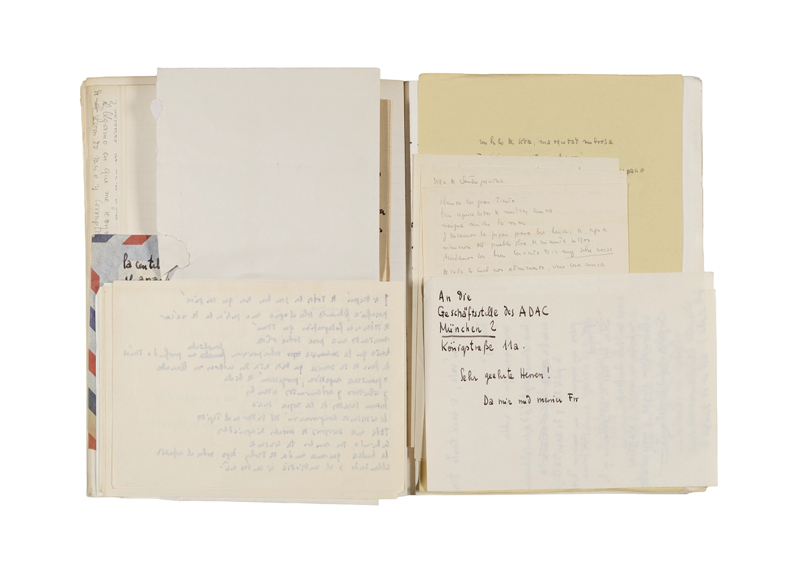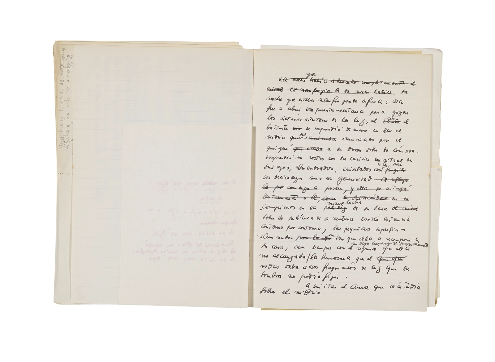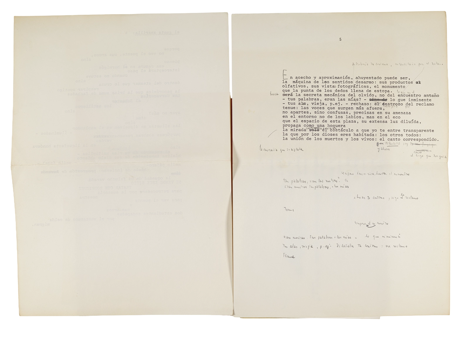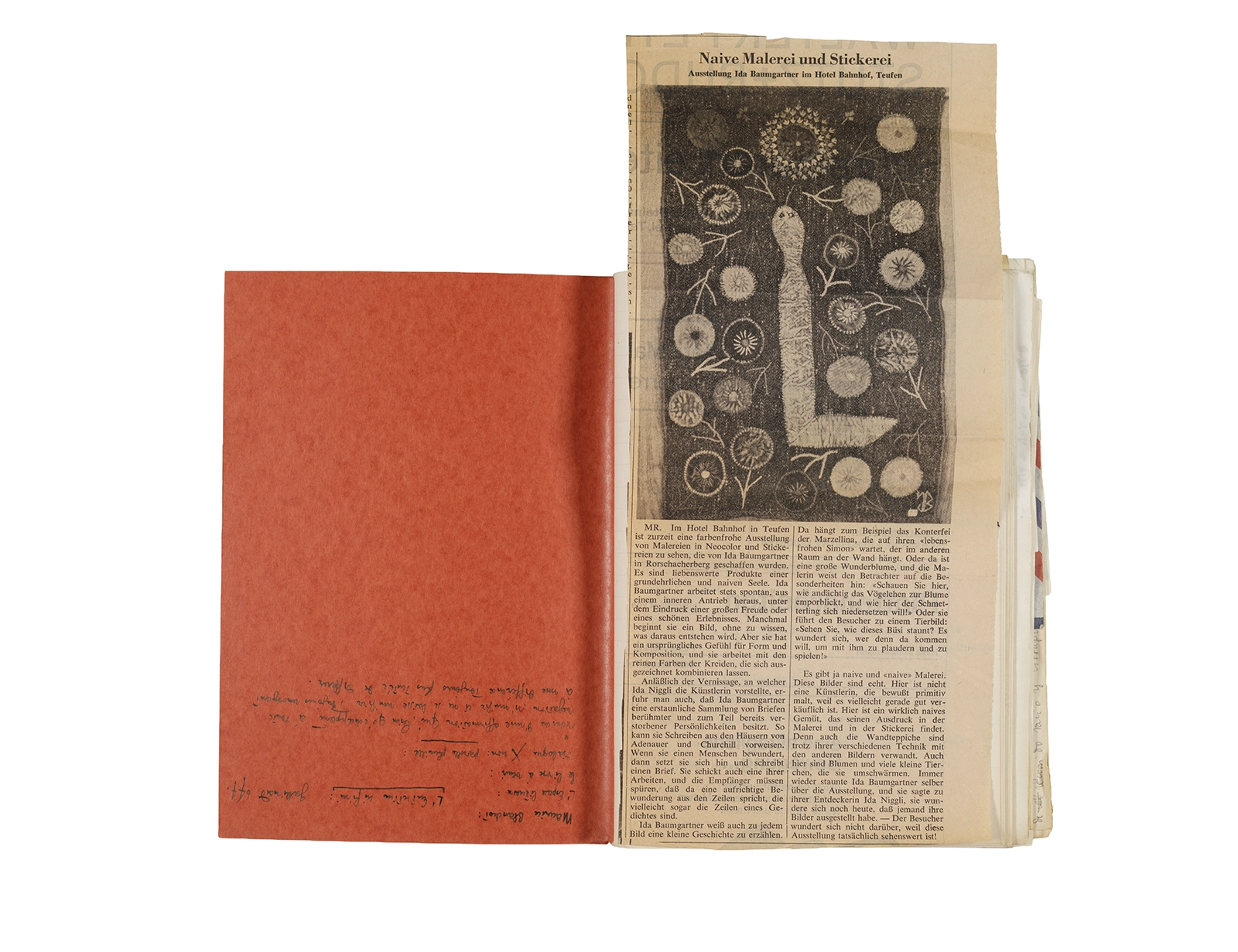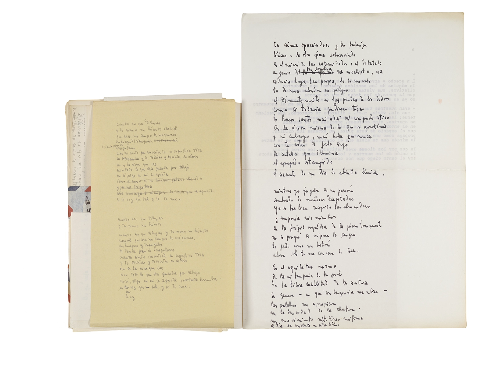 Cuaderno con tapa de cartón rojo unido al lomo por clips metálicos. Contiene en su interior, hojas manuscritas con tinta, lapiz grafito, scripto; hojas de roneo con texto manuscrito; hojas tamaño oficio perforada con anotaciones en tinta; hojas mecanografiadas y con anotaciones en tinta; ficha bibliográfica con texto escrito a mano; boleta con texto escrito en grafito; sobre con texto escrito en grafito.