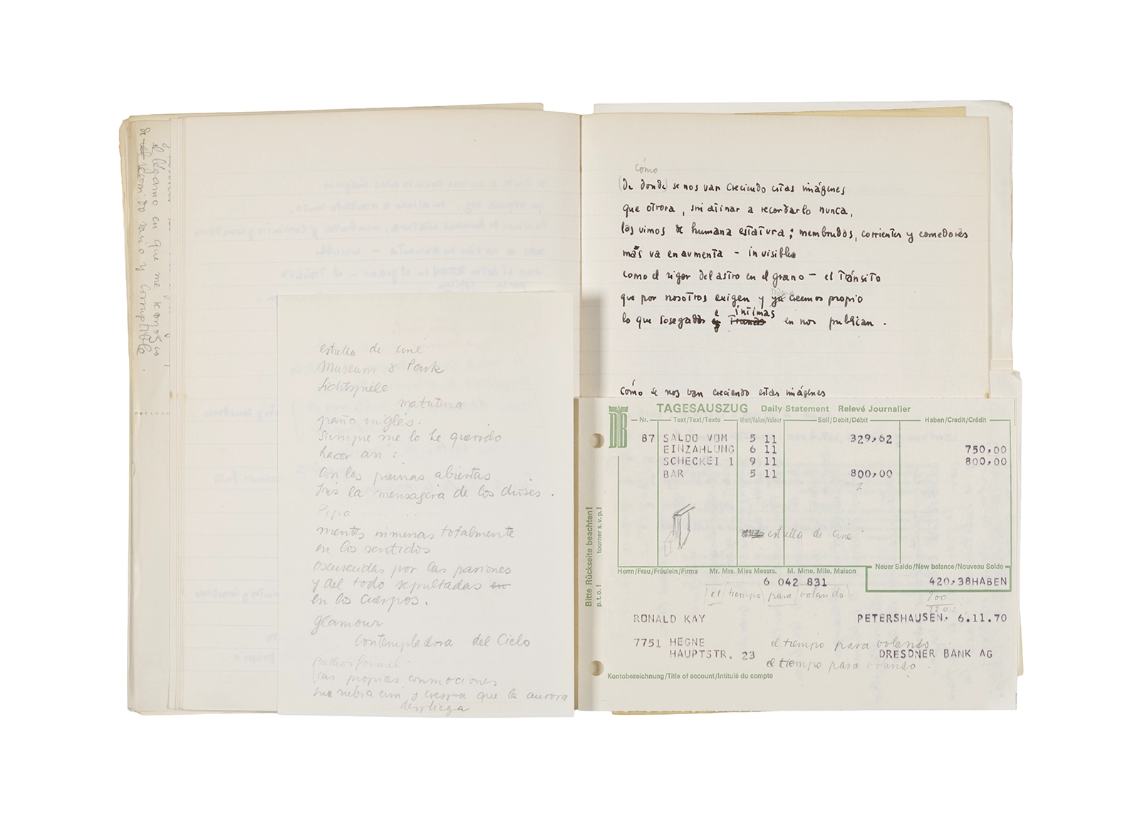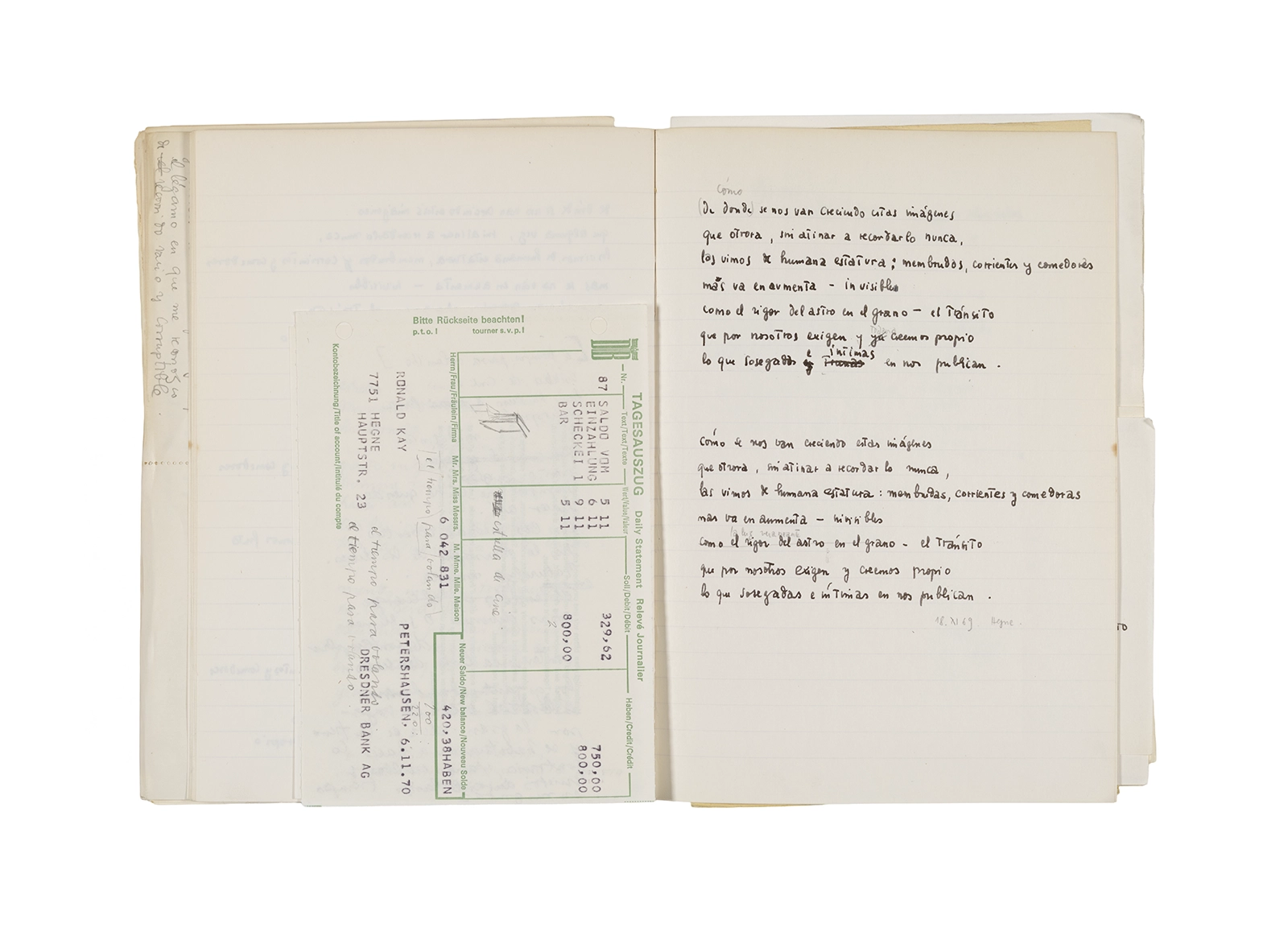 El cuaderno recopila palabras de vocabulario, poemas inéditos como otros poemas de Ronald Kay que posteriormente fueron editados para Deep Freeze y apuntes sobre Proust, Baudelaire y Beckett. Junto con esto, en su interior el cuaderno guarda hojas sueltas, sobre, boleta, fichas bibliográficas con poesía manuscrita de Kay, una una lista de deberes del día y un recorte de diario sobre una exhibición de Ida Baumgartner.