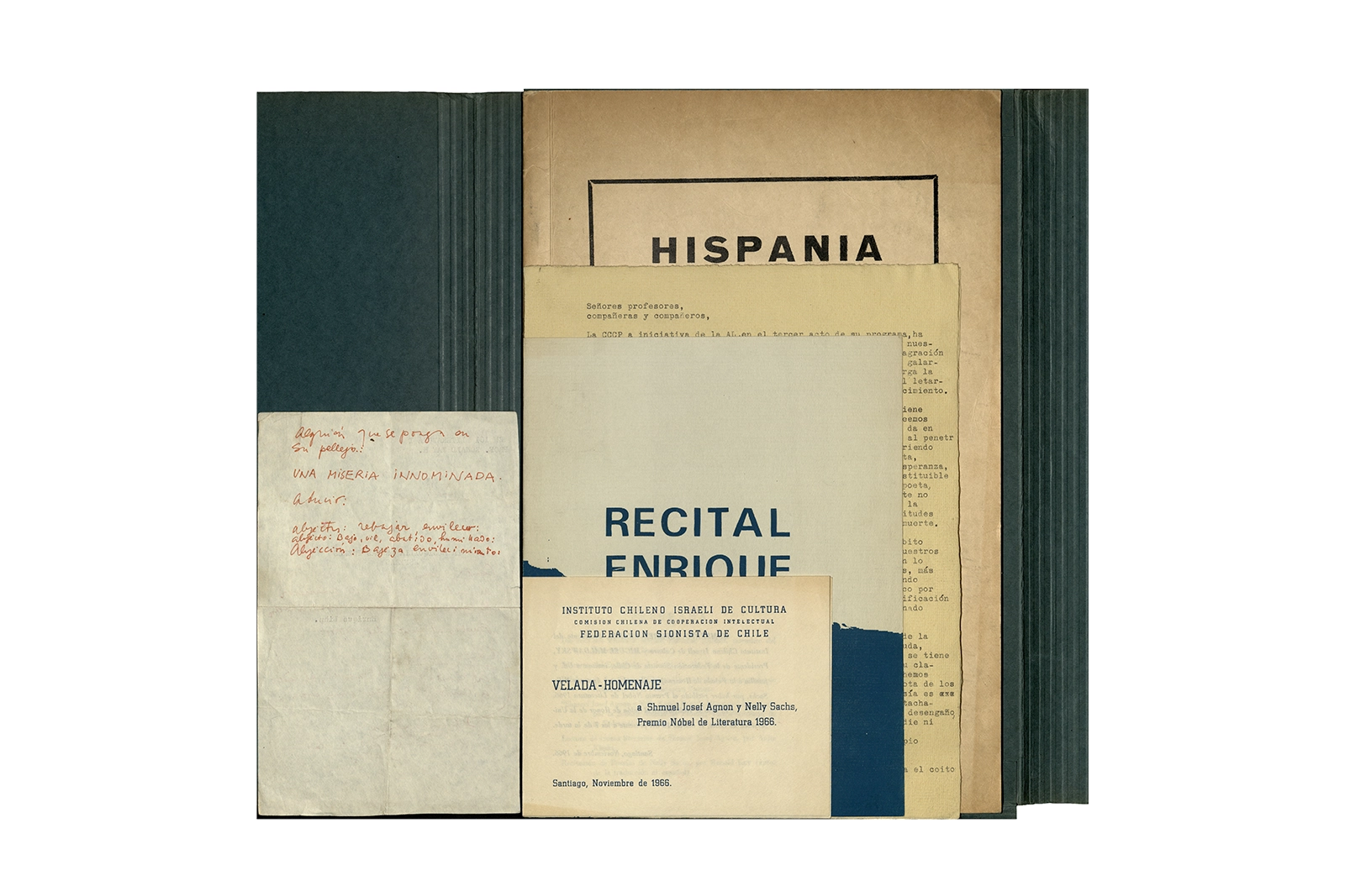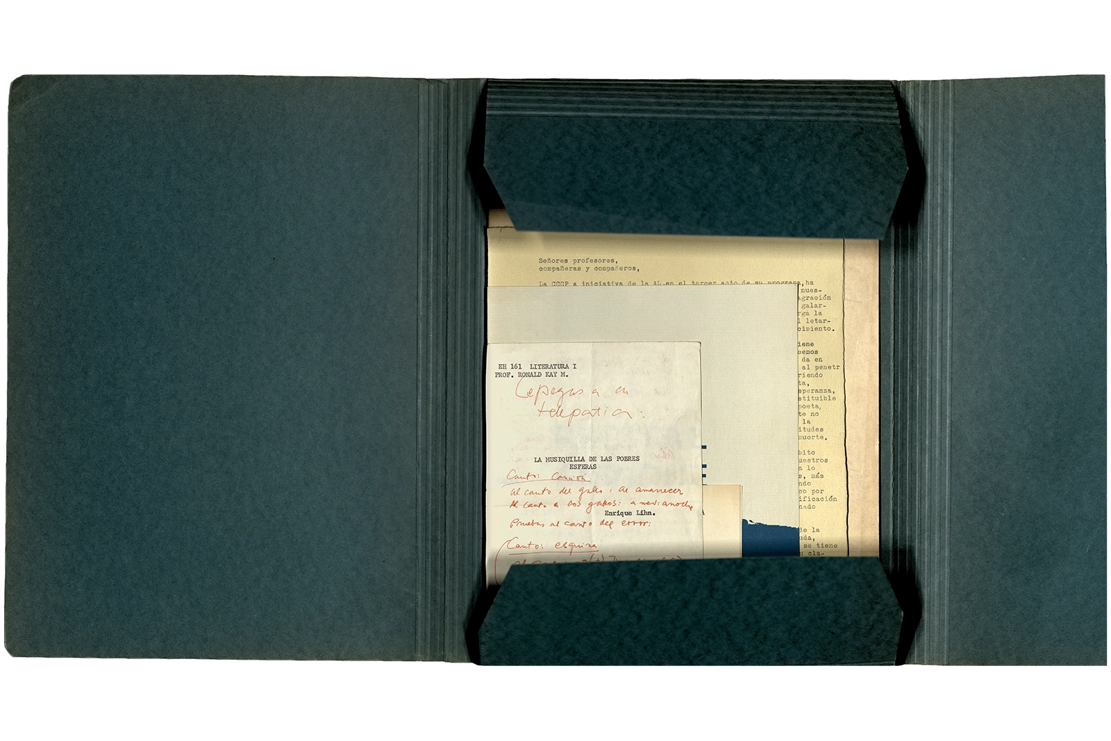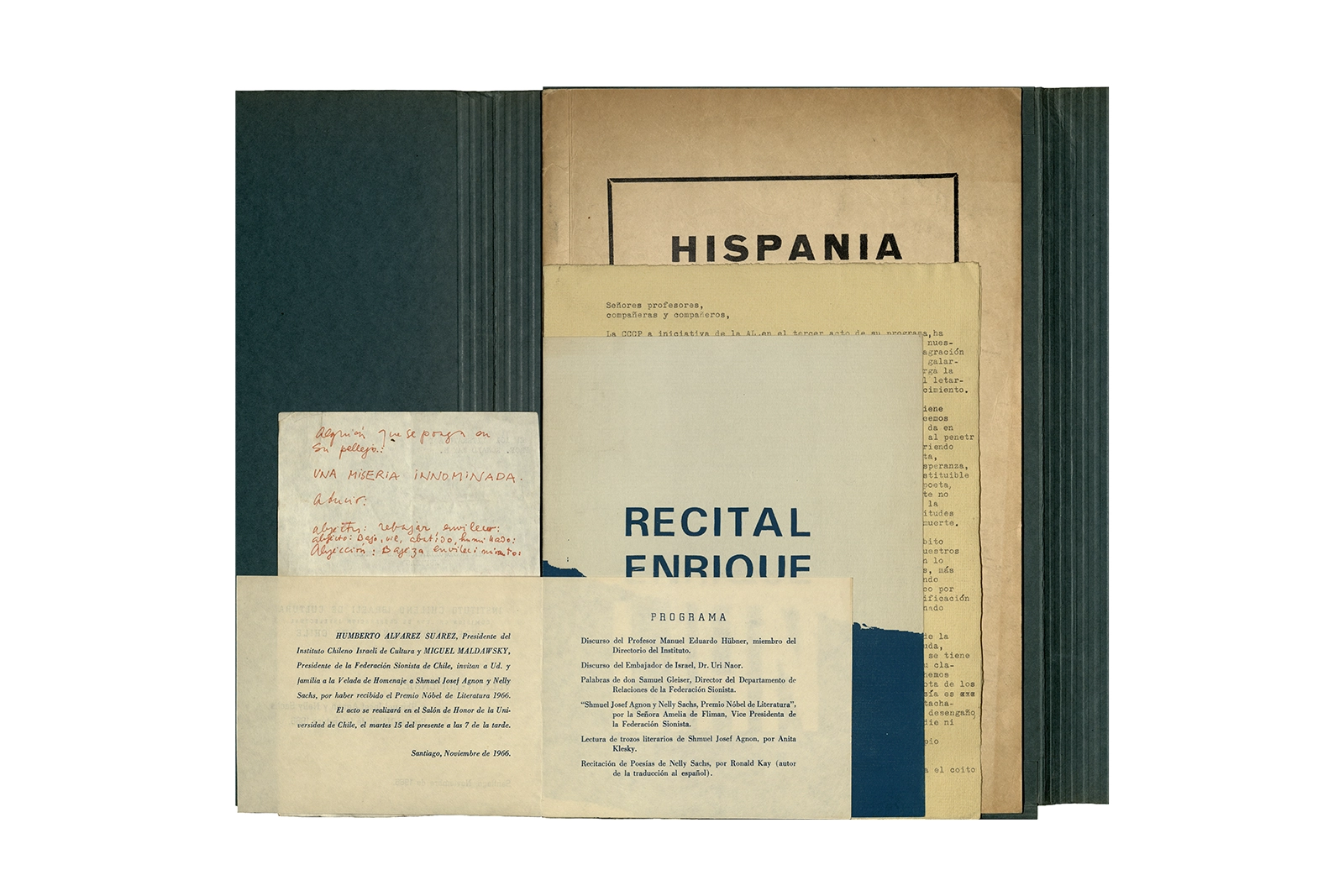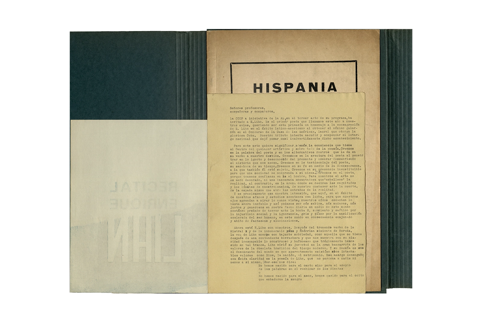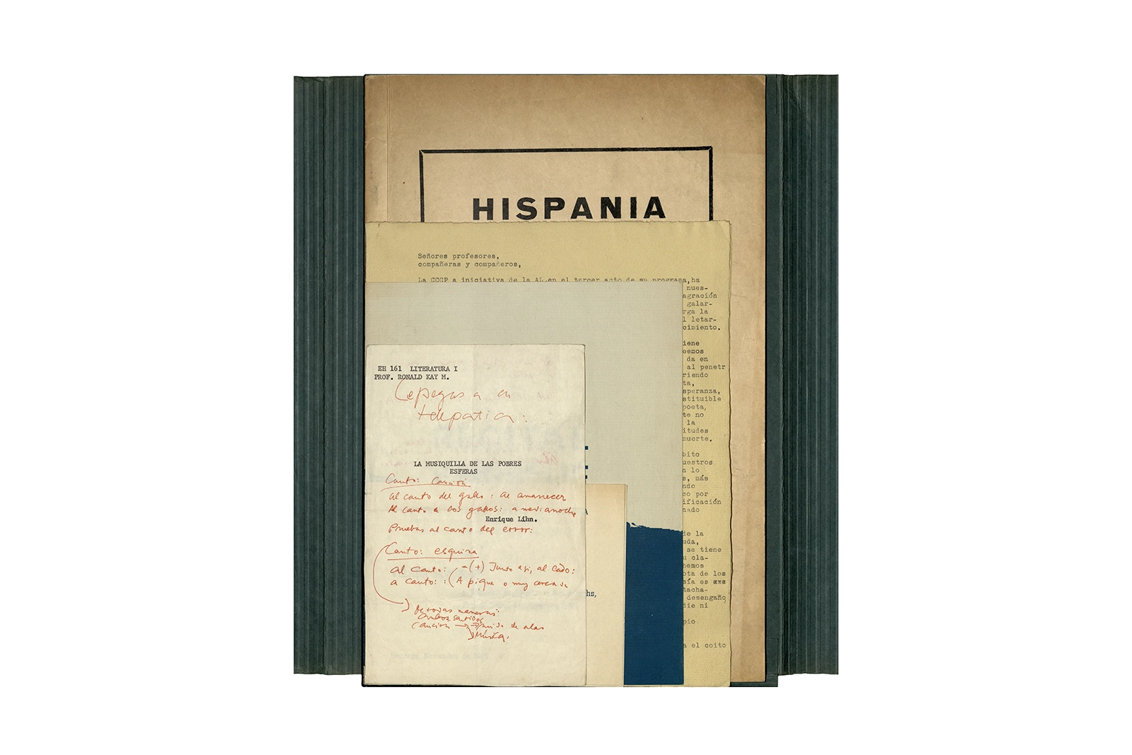 La carpeta contiene dos programas al “Recital Enrique Lihn” organizado por el Centro de alumnos del Instituto Pedagógico de la Universidad de Chile, el programa cuenta con una entrevista realizada por Federico Schopf a Lihn; en uno de los programas se encuentra el discurso de apertura al recital con correcciones manuscritas realizadas por Ronald Kay. A su vez la carpeta incluye dos programas a la velada-homenaje a Shmuel Josef Agnon y Nelly Sachs por haber recibido el Premio Nobel de Literatura 1966; una hoja con texto mecanografiado sobre Lihn y apuntes manuscritos con vocabulario; y la revista Hispania, publicación de1967, del Centro de Alumnos de Castellano que incluye el poema de Ronald Kay titulado “Puesto de guardia” ganador del primer premio en poesía del concurso literario 1966 del mismo Centro.
