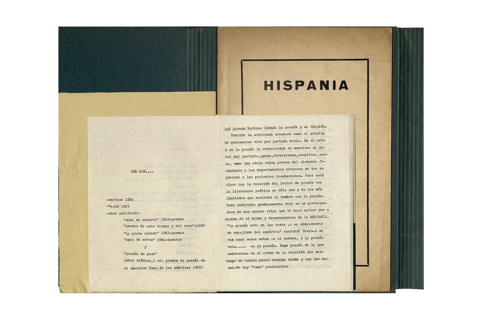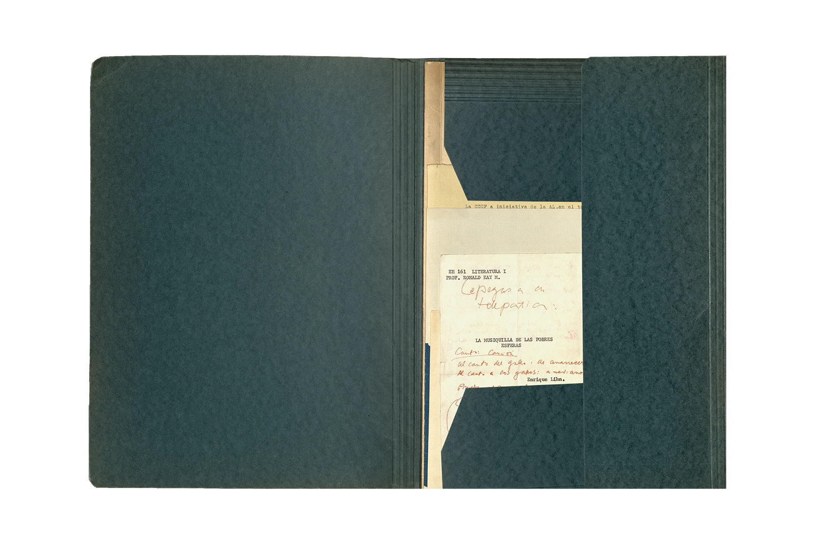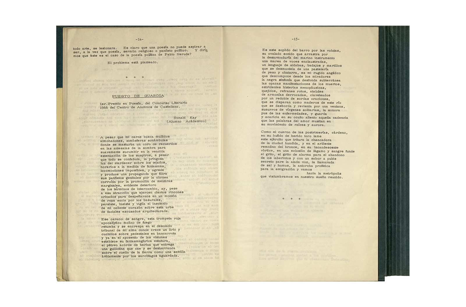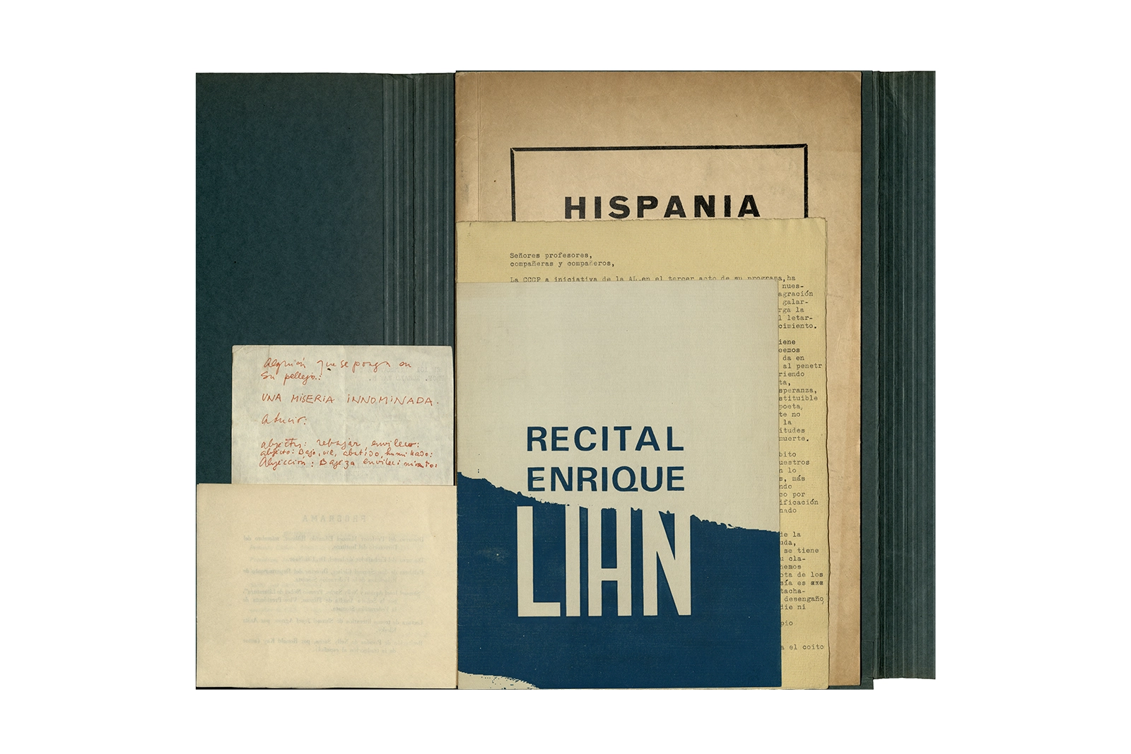 La carpeta contiene dos programas al “Recital Enrique Lihn” organizado por el Centro de alumnos del Instituto Pedagógico de la Universidad de Chile, el programa cuenta con una entrevista realizada por Federico Schopf a Lihn; en uno de los programas se encuentra el discurso de apertura al recital con correcciones manuscritas realizadas por Ronald Kay. A su vez la carpeta incluye dos programas a la velada-homenaje a Shmuel Josef Agnon y Nelly Sachs por haber recibido el Premio Nobel de Literatura 1966; una hoja con texto mecanografiado sobre Lihn y apuntes manuscritos con vocabulario; y la revista Hispania, publicación de1967, del Centro de Alumnos de Castellano que incluye el poema de Ronald Kay titulado “Puesto de guardia” ganador del primer premio en poesía del concurso literario 1966 del mismo Centro.