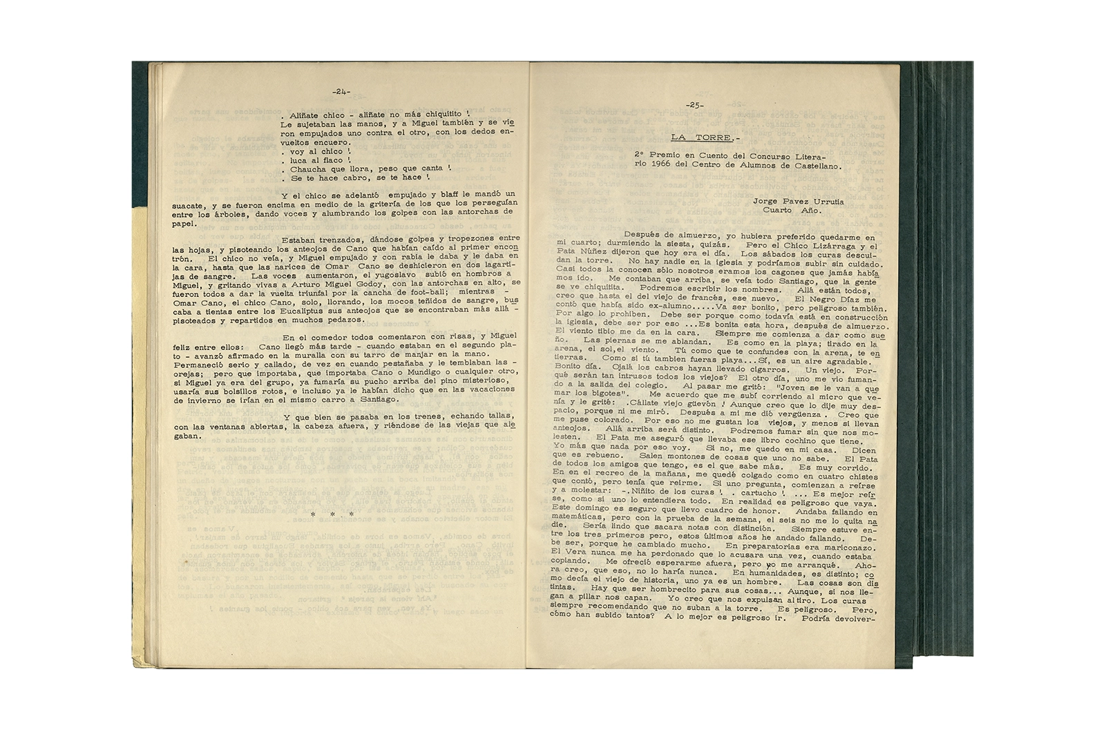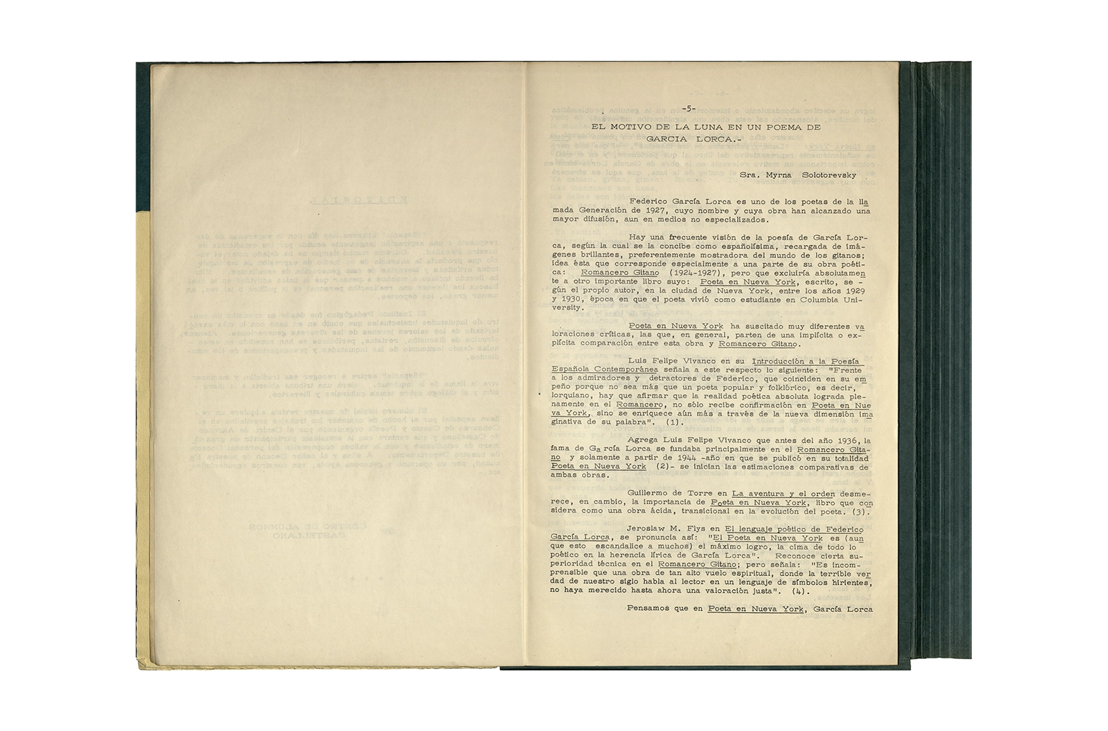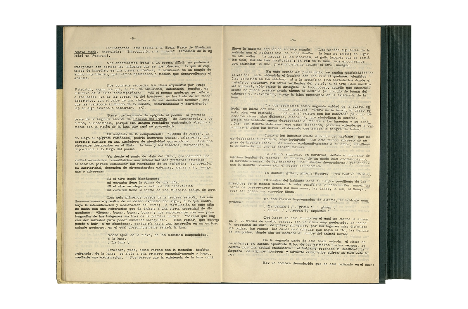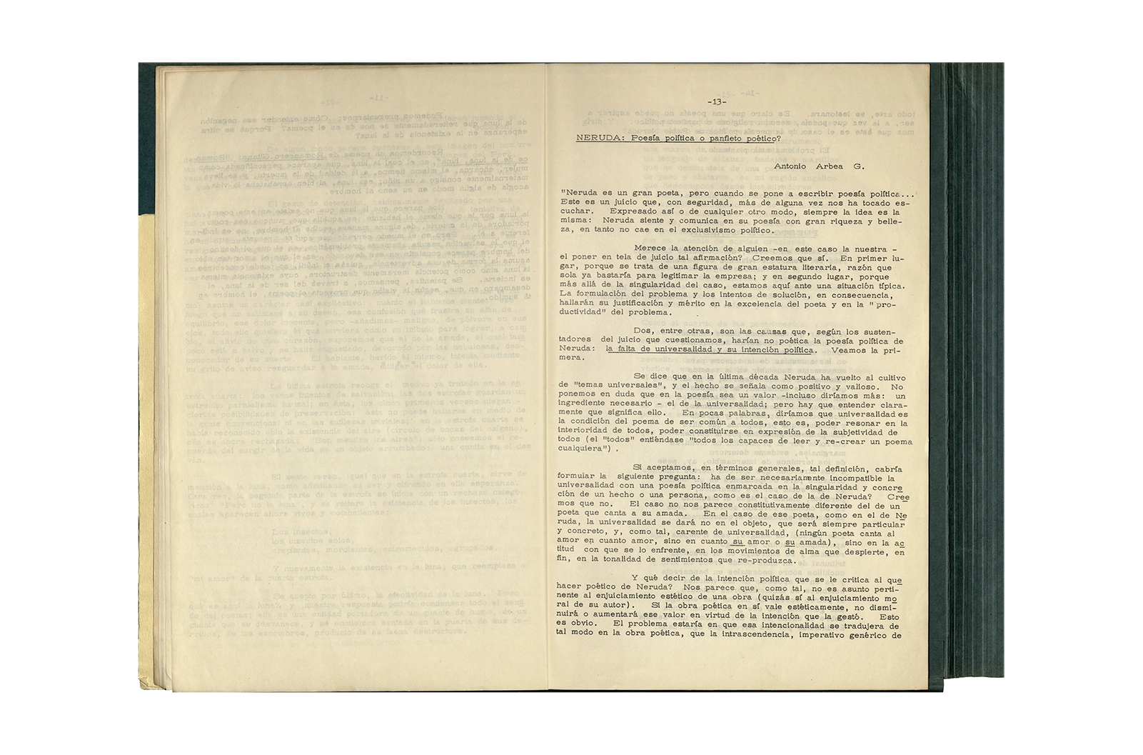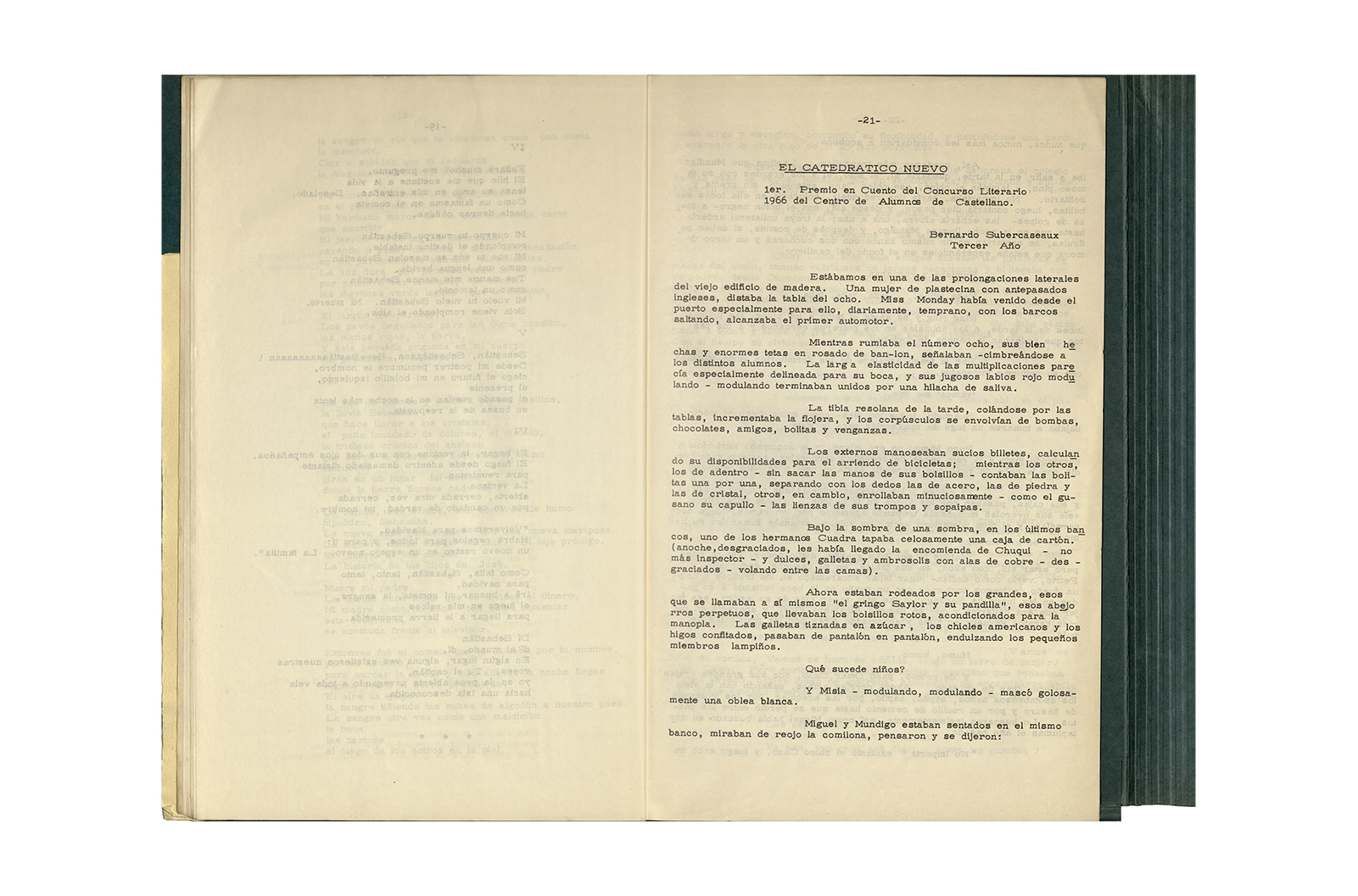La carpeta contiene dos programas al “Recital Enrique Lihn” organizado por el Centro de alumnos del Instituto Pedagógico de la Universidad de Chile, el programa cuenta con una entrevista realizada por Federico Schopf a Lihn; en uno de los programas se encuentra el discurso de apertura al recital con correcciones manuscritas realizadas por Ronald Kay. A su vez la carpeta incluye dos programas a la velada-homenaje a Shmuel Josef Agnon y Nelly Sachs por haber recibido el Premio Nobel de Literatura 1966; una hoja con texto mecanografiado sobre Lihn y apuntes manuscritos con vocabulario; y la revista Hispania, publicación de1967, del Centro de Alumnos de Castellano que incluye el poema de Ronald Kay titulado “Puesto de guardia” ganador del primer premio en poesía del concurso literario 1966 del mismo Centro.
