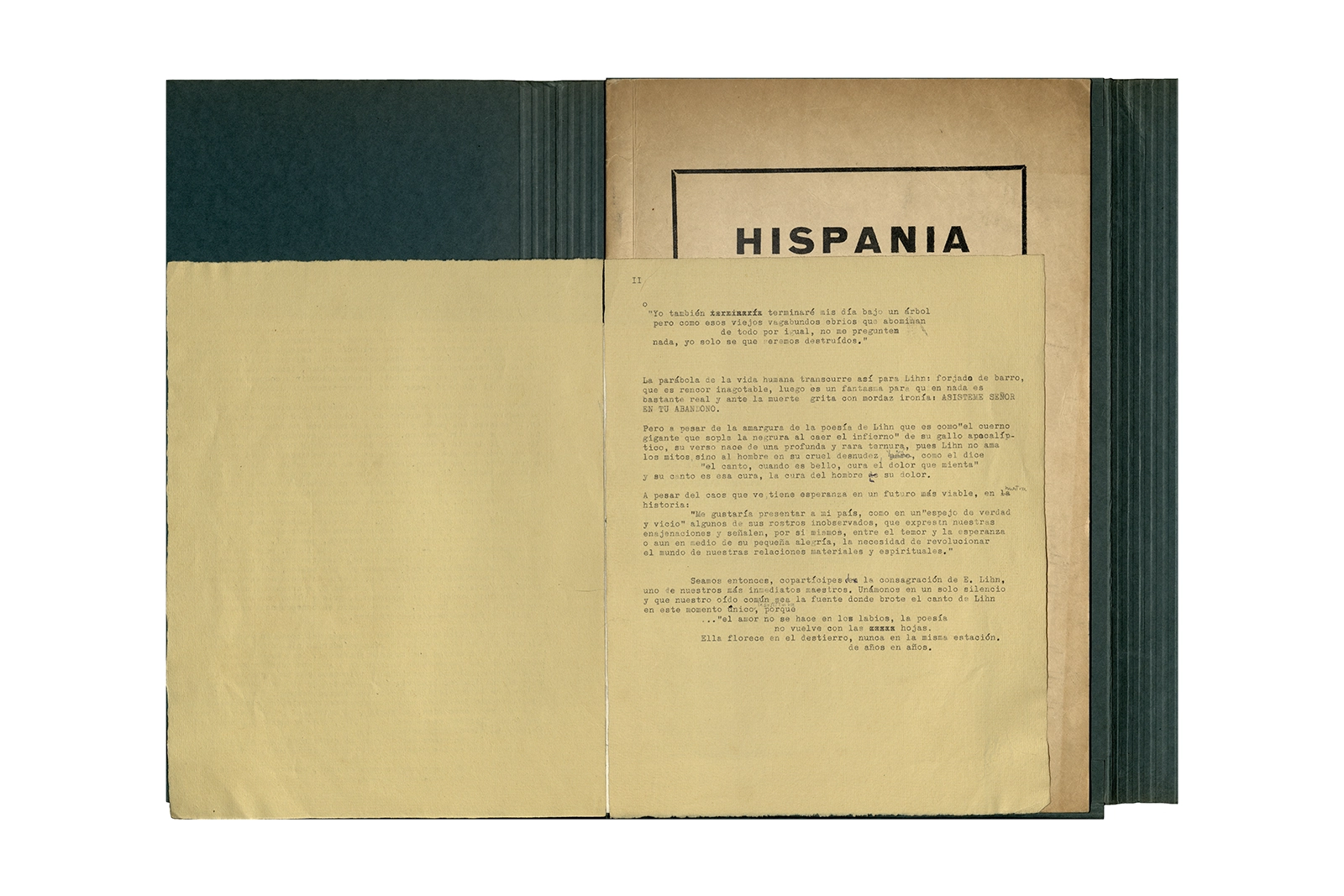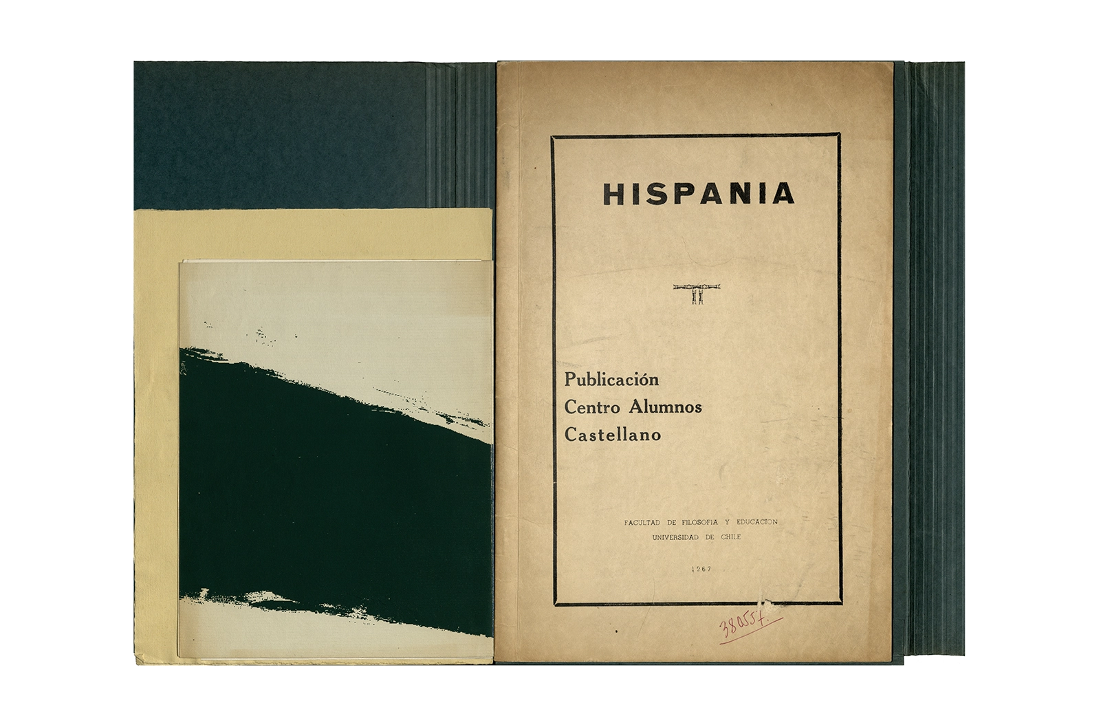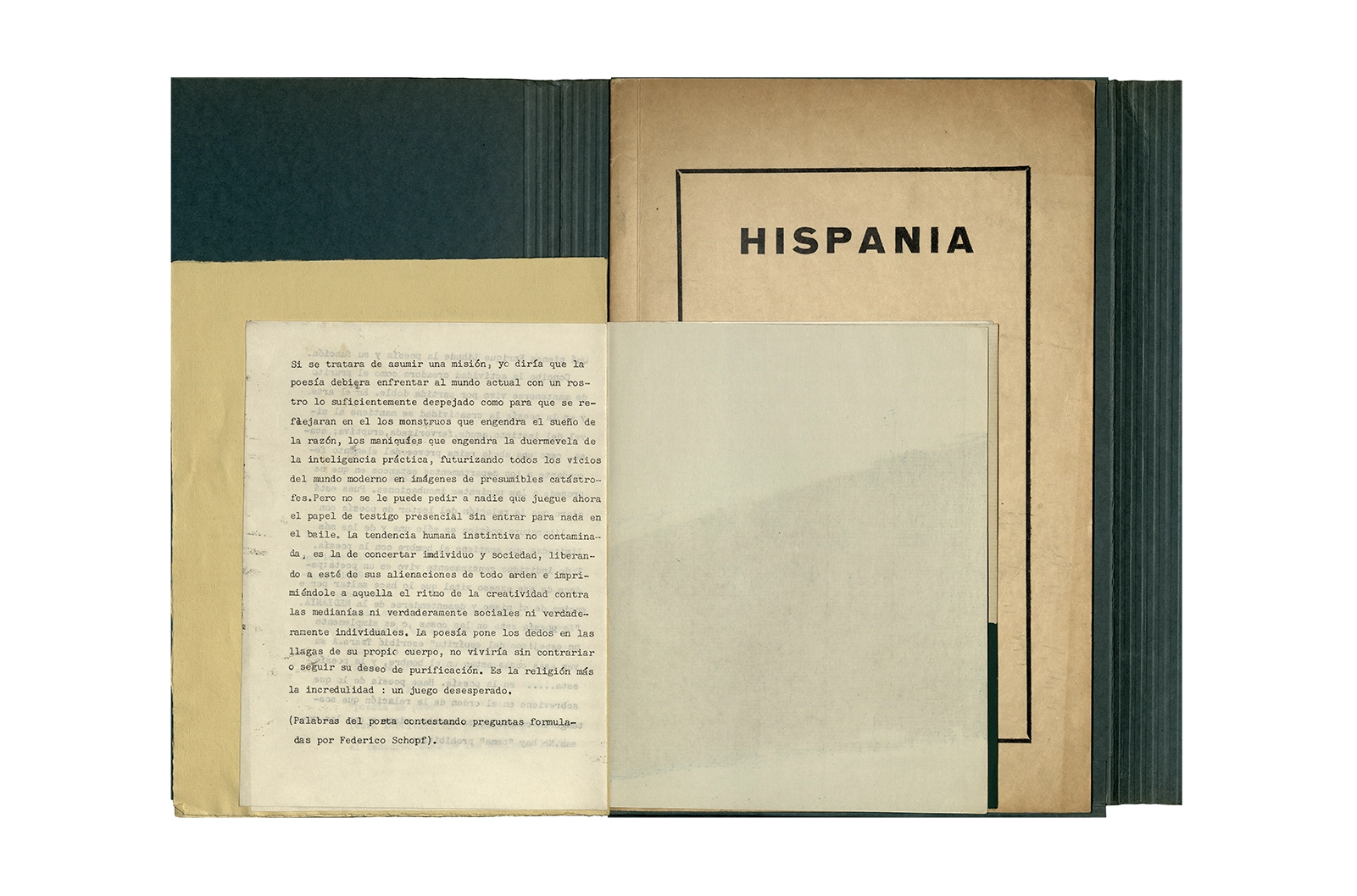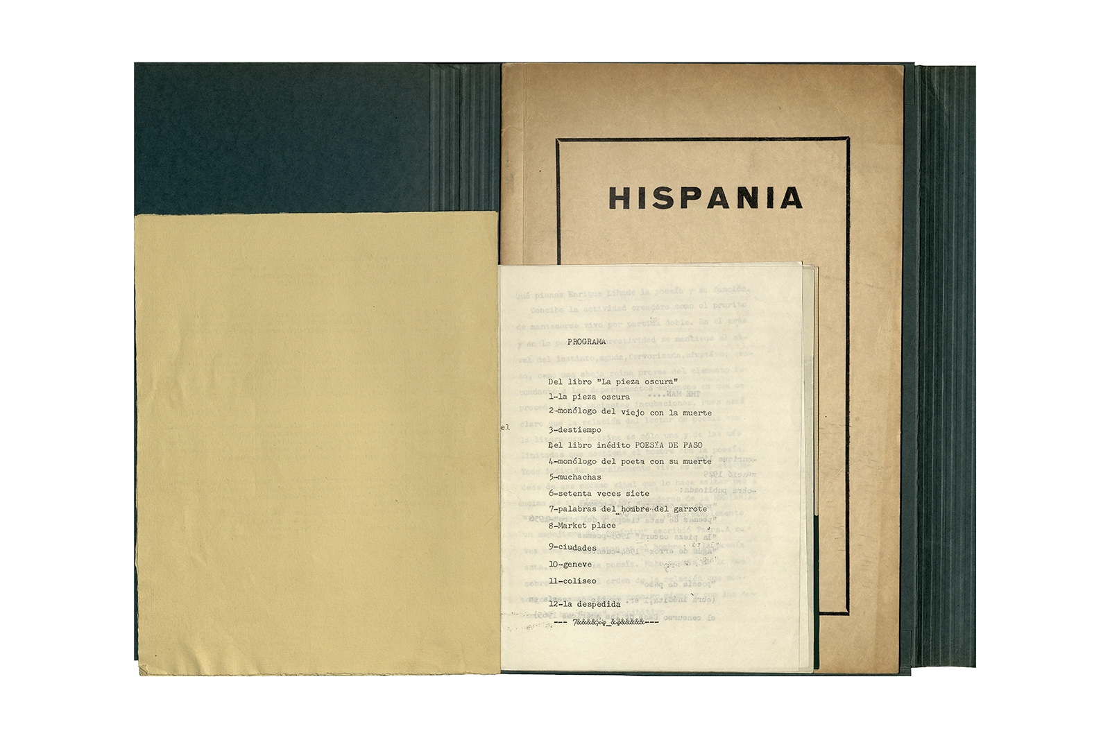 Carpeta de cartón marca ELBA color verde que contiene dos programas de evento con portadas serigrafiadas a color texto mecanografiado y hojas sueltas mecanografiadas en su interior; dos invitaciones en papel con impresión offset texto color azul; un papel manuscrito, una revista tapa cartón impresa en offset texto color negro.
