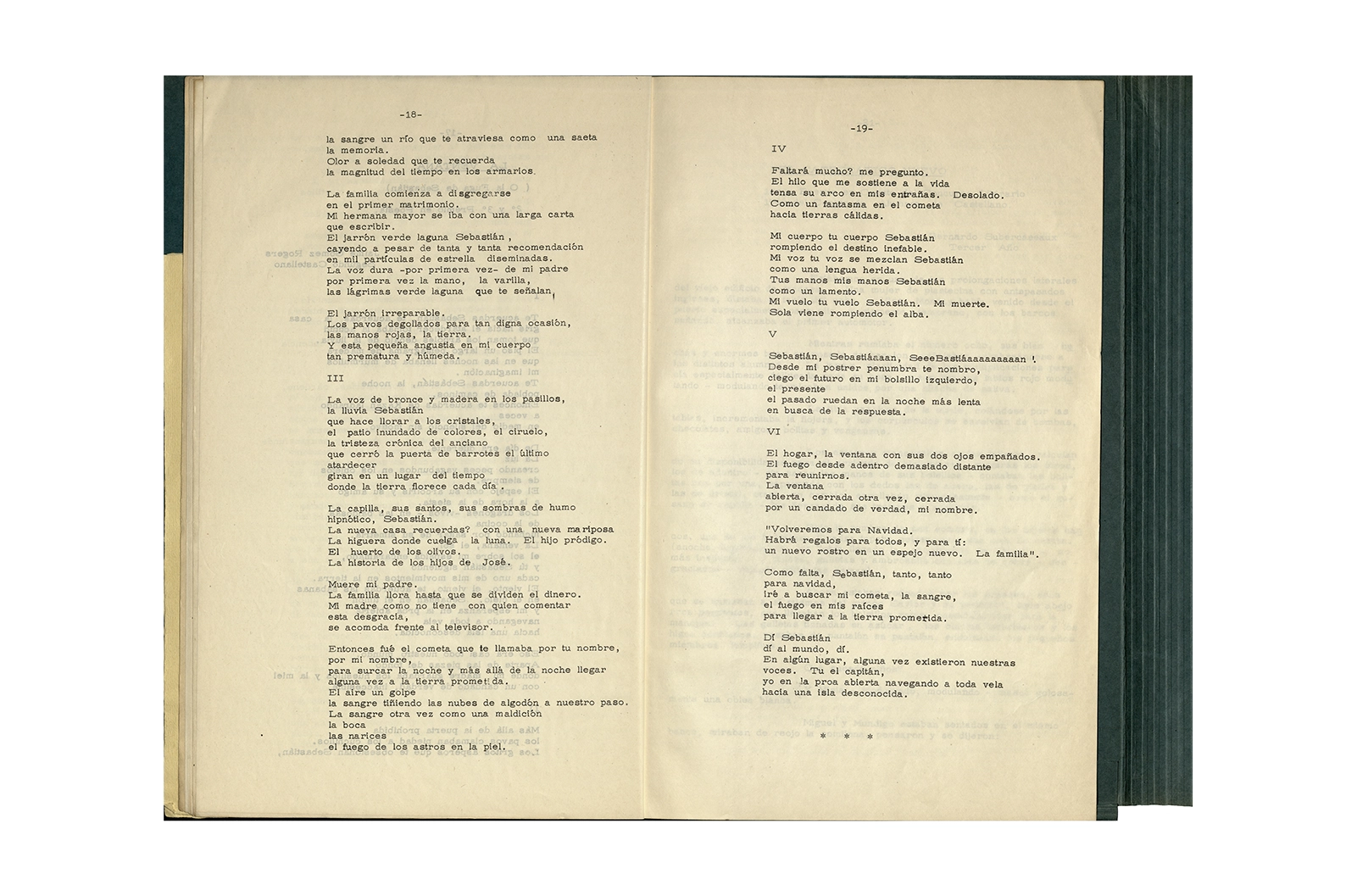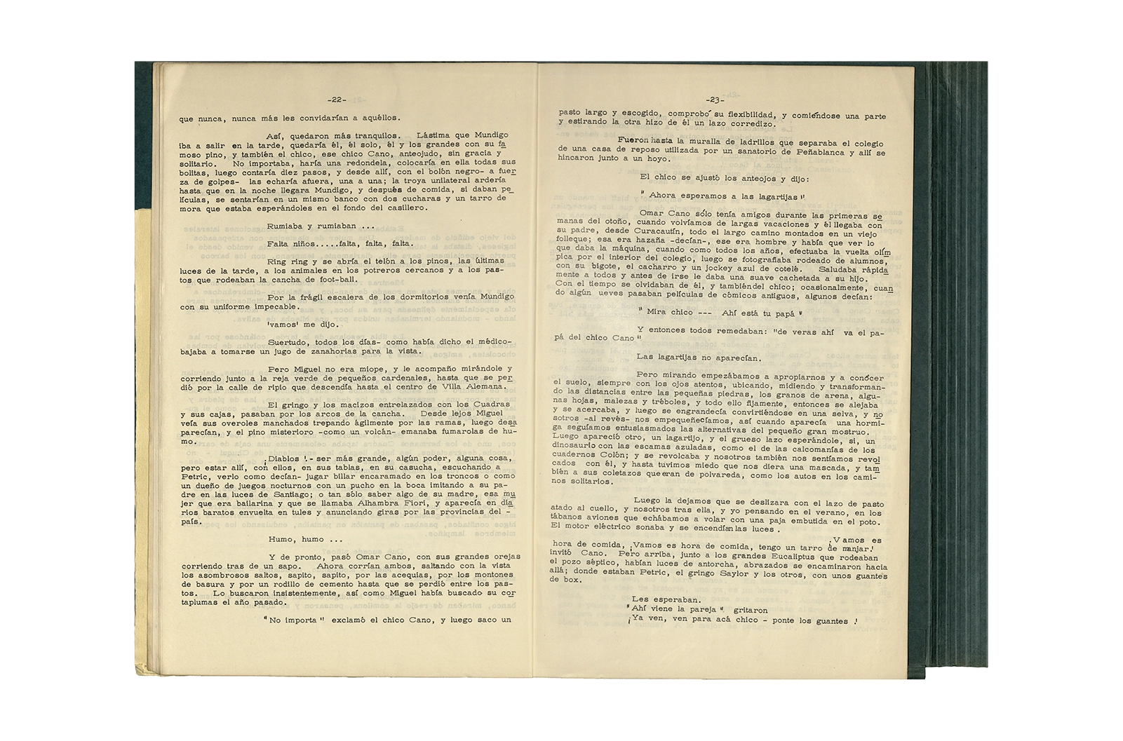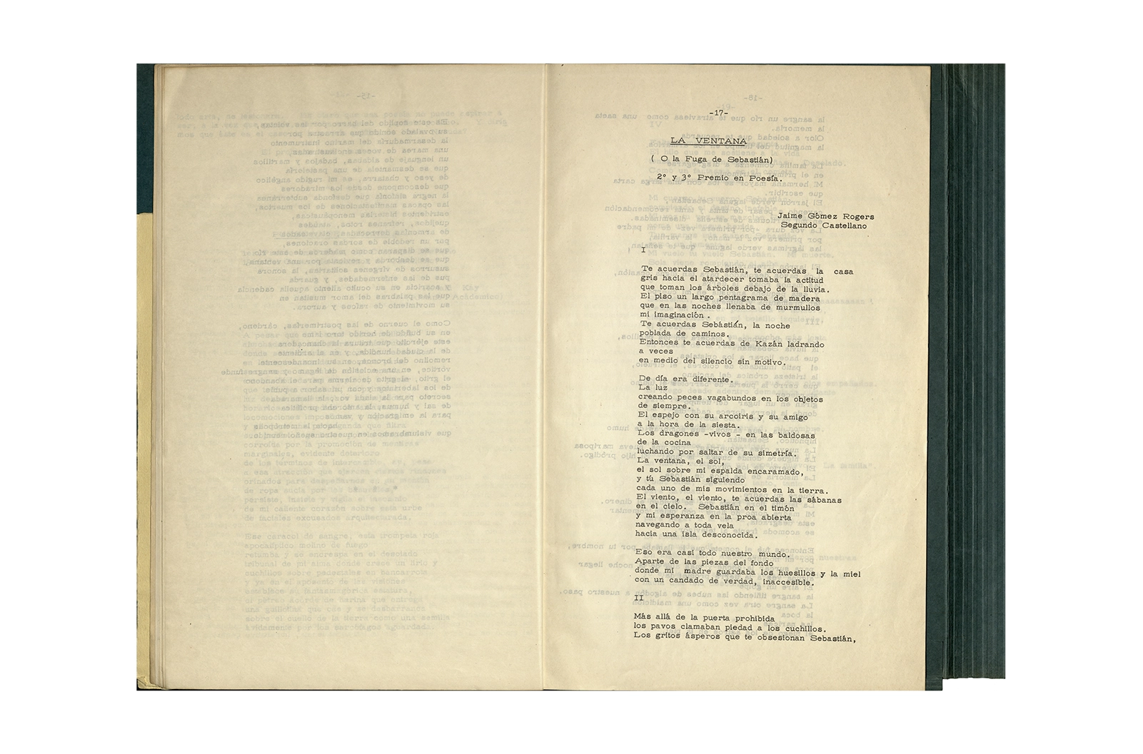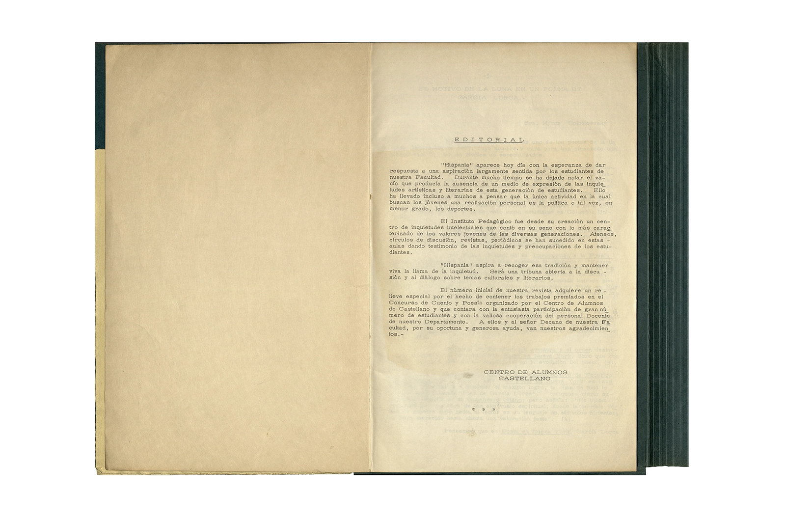 Carpeta de cartón marca ELBA color verde que contiene dos programas de evento con portadas serigrafiadas a color texto mecanografiado y hojas sueltas mecanografiadas en su interior; dos invitaciones en papel con impresión offset texto color azul; un papel manuscrito, una revista tapa cartón impresa en offset texto color negro.