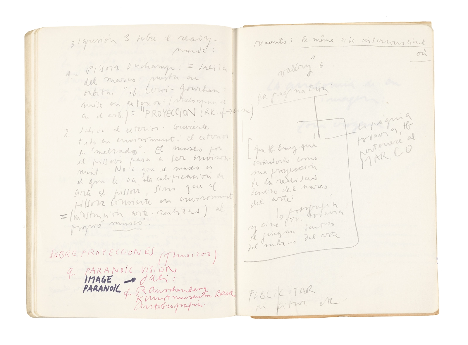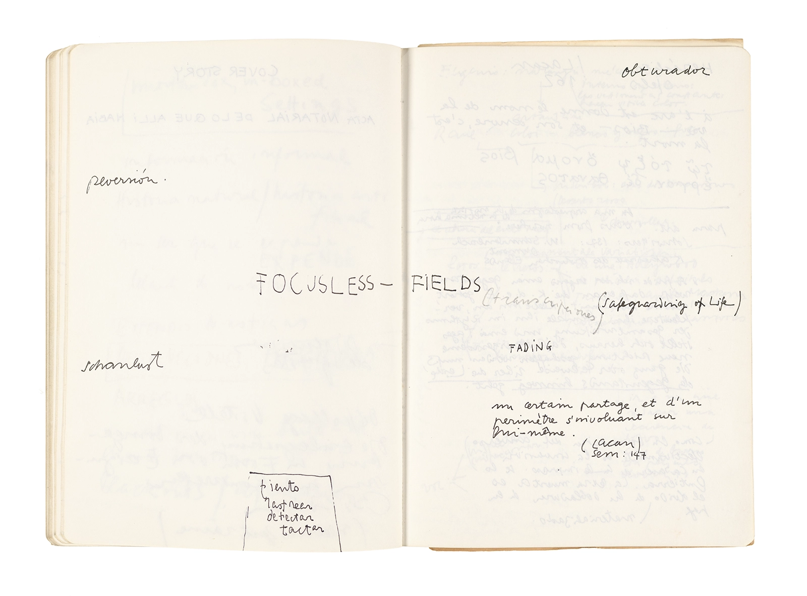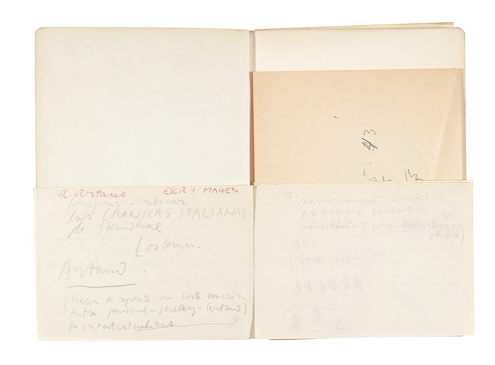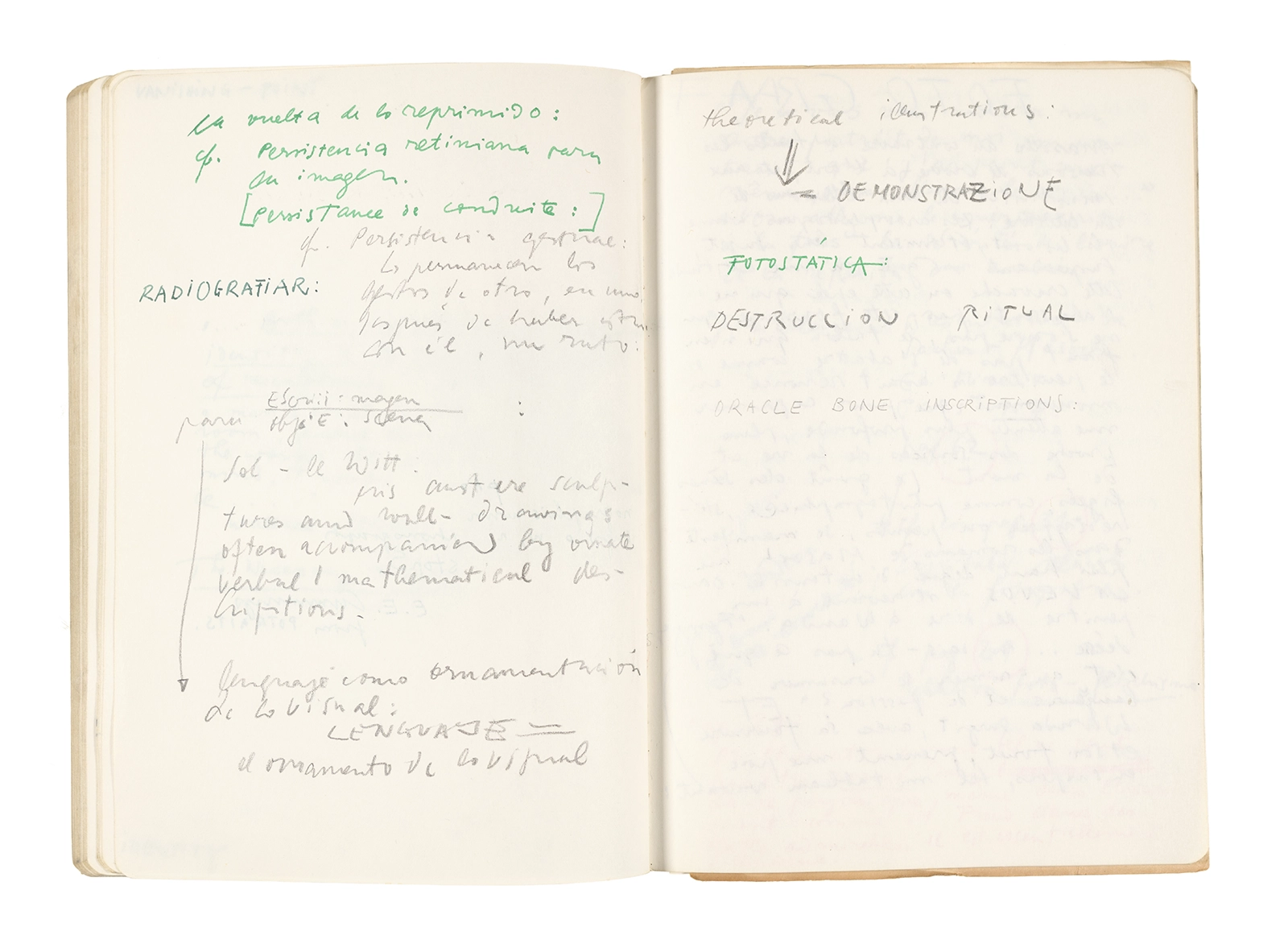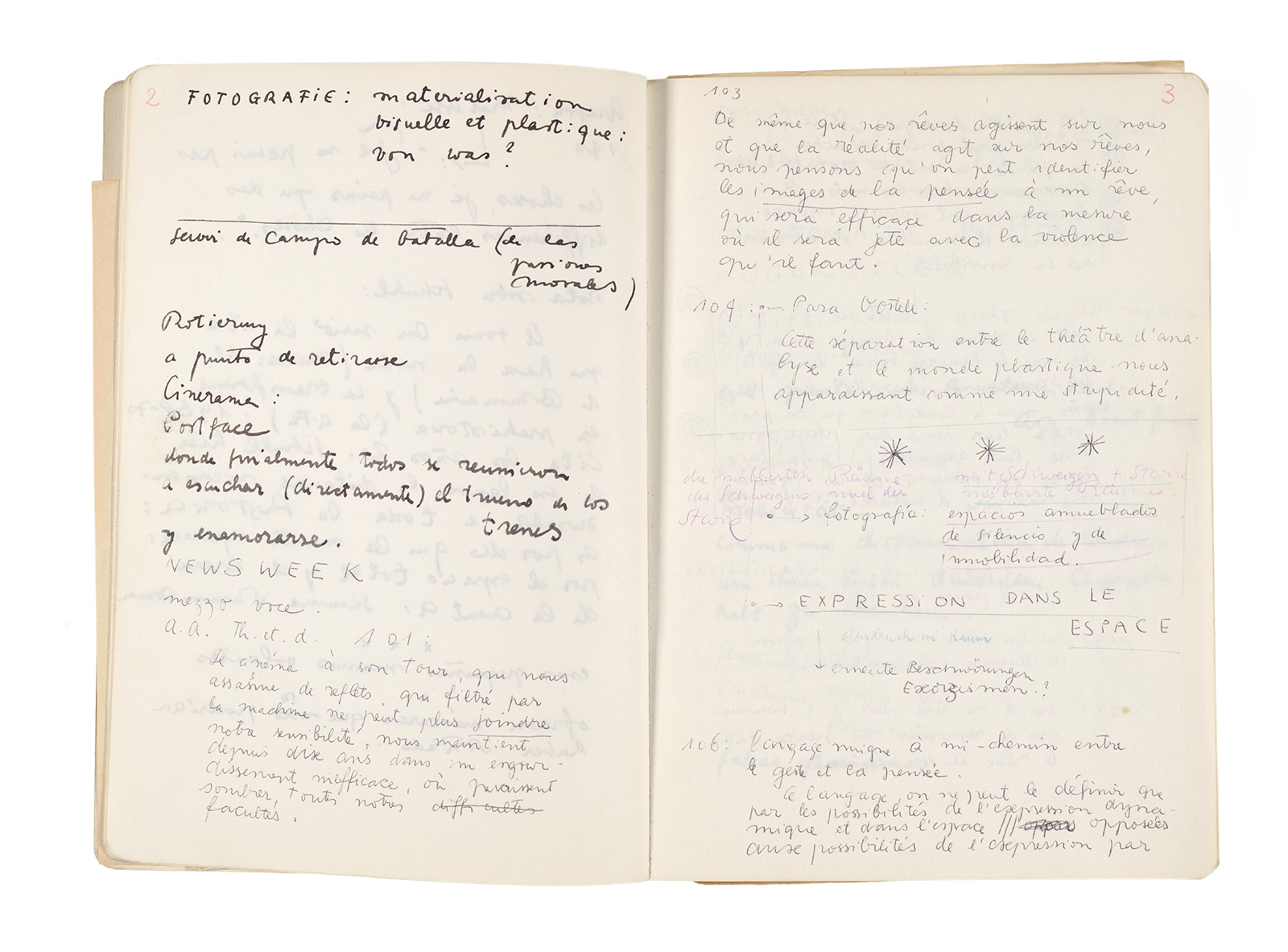 Este cuaderno contiene apuntes diversos, algunos de ellos vinculados a los seminarios “Una hermeneutica teórica y práctica de los escritos de Antonin Artaud” y “Escr:i:magen: Una sistematización de los ensayos teóricos de Stéphane Mallarmé”, dictado por Ronald Kay durante los años 1974 y 1975 en el Departamento de Estudios Humanísticos de la Universidad de Chile. Aquí se incluyen, además, notas sobre fotografía, sobre el concepto de “ready-made” y sobre los happenings de Wolf Vostell, así como también menciones a Paul Valéry, Ronald Kitaj, Roland Barthes, Martin Heidegger, Walter Benjamin, Maurice Merleau-Ponty, André Bazin, Marx Ernst, Wallace Stevens y E. E. Cummings, entre otros. Asimismo, este cuaderno contiene notas referentes a la revista “Manuscritos”.