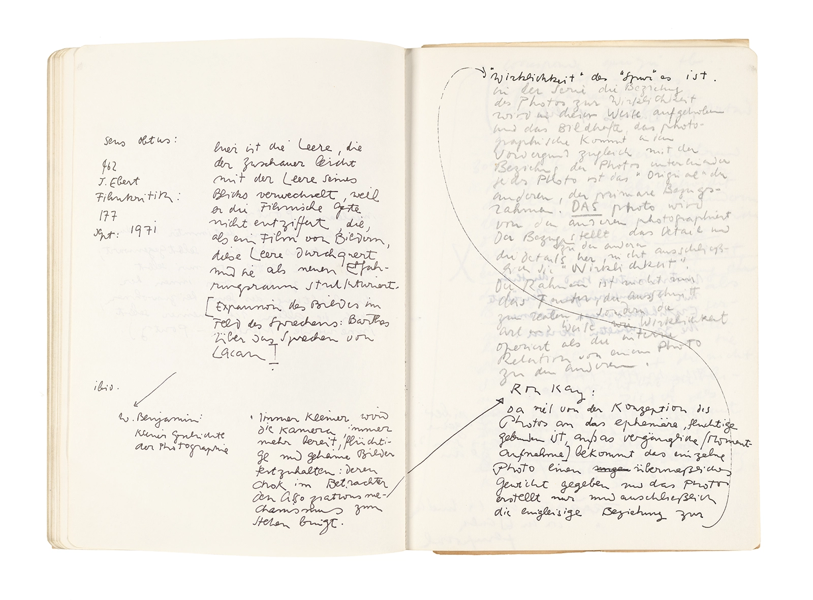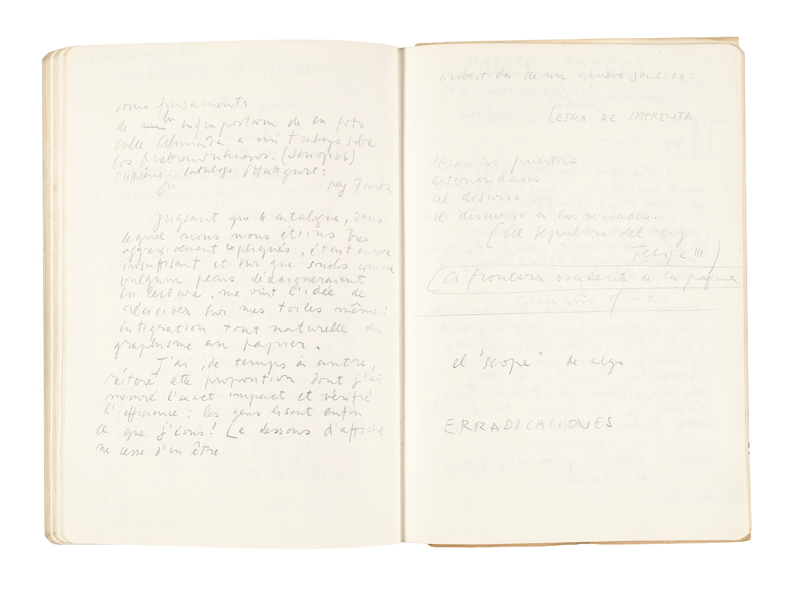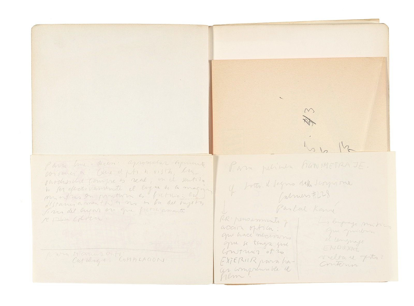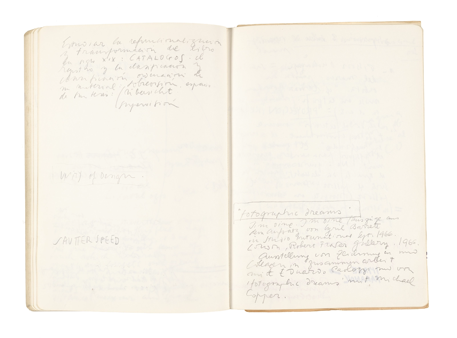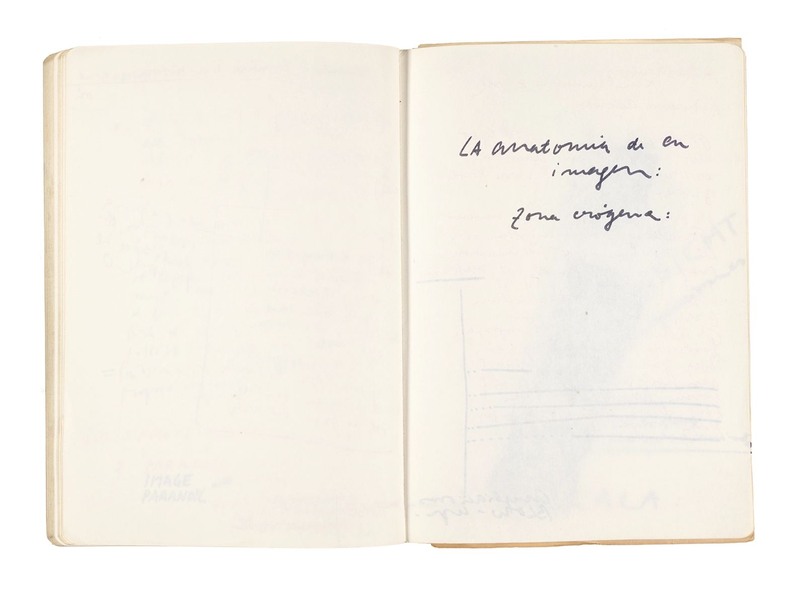 Este cuaderno contiene apuntes diversos, algunos de ellos vinculados a los seminarios “Una hermeneutica teórica y práctica de los escritos de Antonin Artaud” y “Escr:i:magen: Una sistematización de los ensayos teóricos de Stéphane Mallarmé”, dictado por Ronald Kay durante los años 1974 y 1975 en el Departamento de Estudios Humanísticos de la Universidad de Chile. Aquí se incluyen, además, notas sobre fotografía, sobre el concepto de “ready-made” y sobre los happenings de Wolf Vostell, así como también menciones a Paul Valéry, Ronald Kitaj, Roland Barthes, Martin Heidegger, Walter Benjamin, Maurice Merleau-Ponty, André Bazin, Marx Ernst, Wallace Stevens y E. E. Cummings, entre otros. Asimismo, este cuaderno contiene notas referentes a la revista “Manuscritos”.