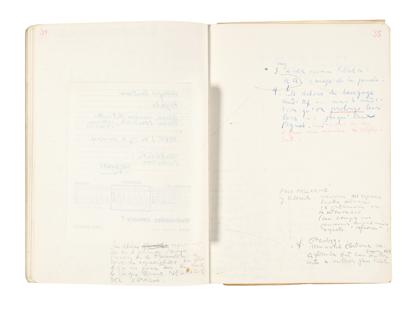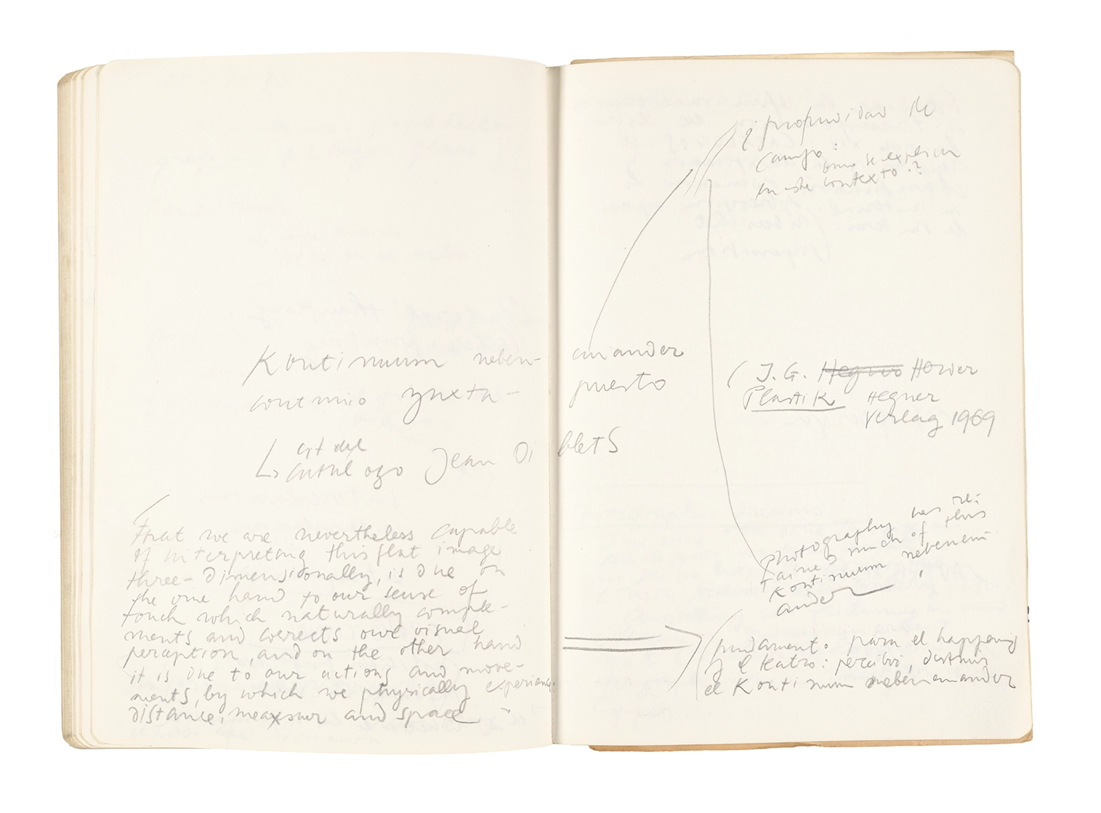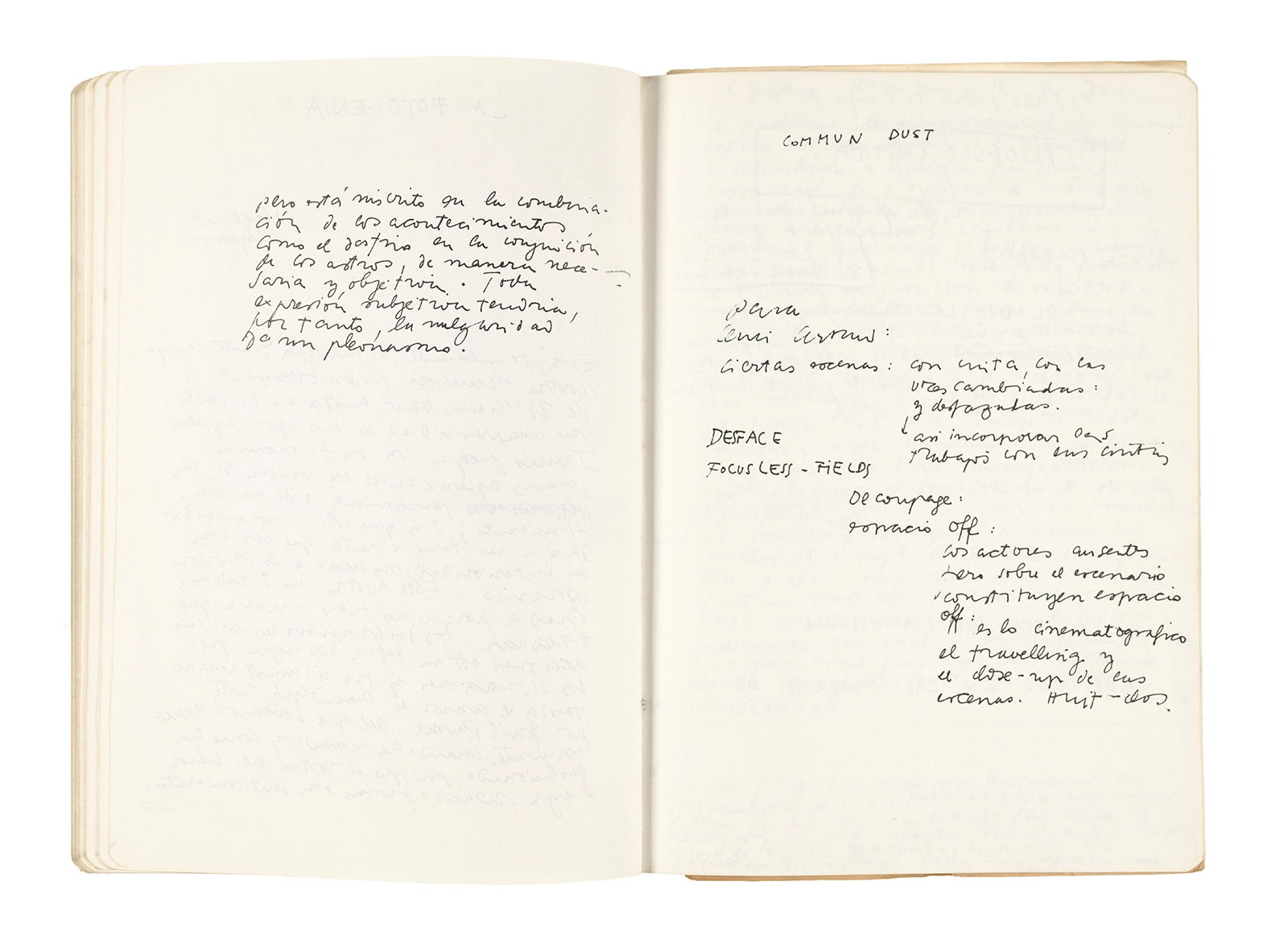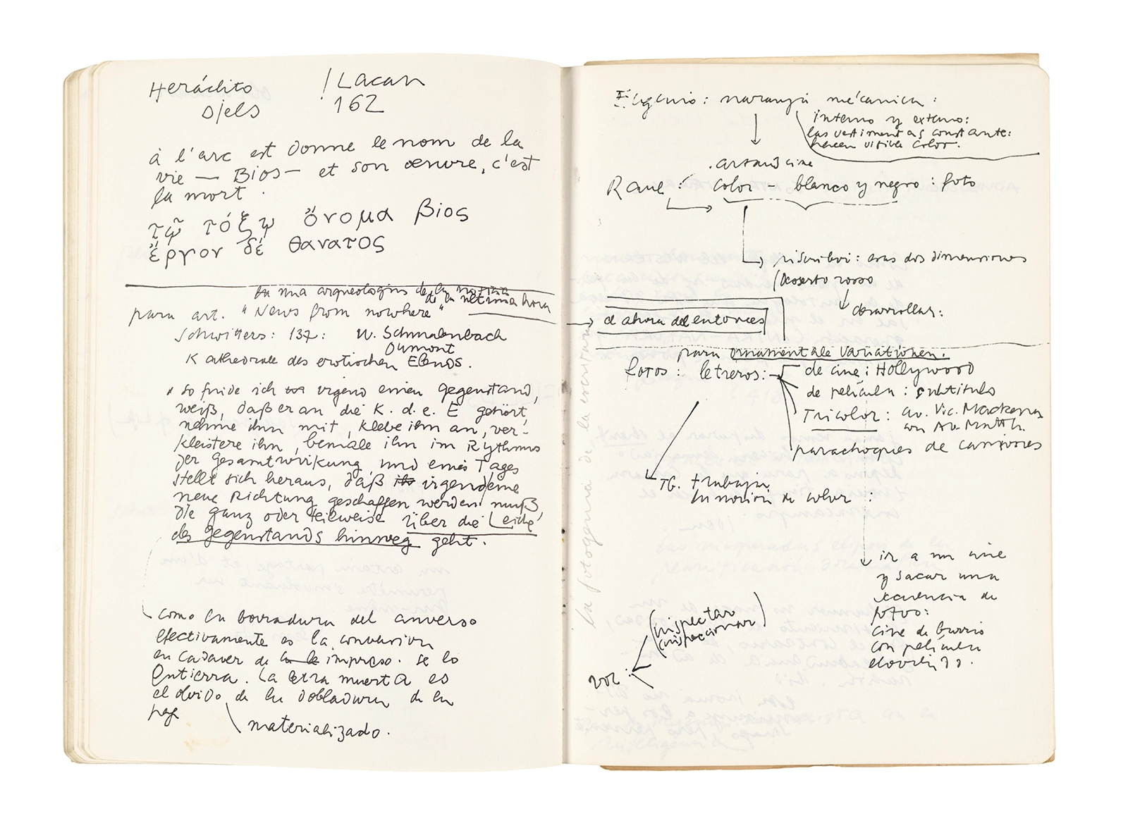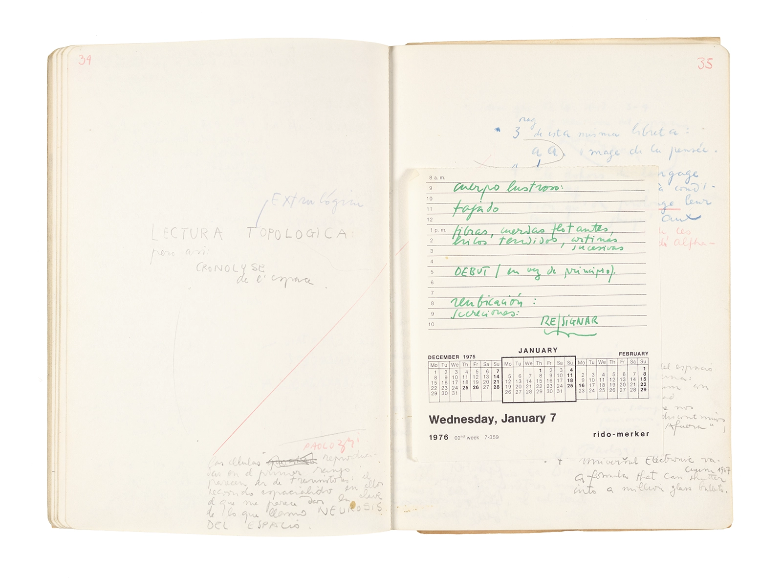 Este cuaderno contiene apuntes diversos, algunos de ellos vinculados a los seminarios “Una hermeneutica teórica y práctica de los escritos de Antonin Artaud” y “Escr:i:magen: Una sistematización de los ensayos teóricos de Stéphane Mallarmé”, dictado por Ronald Kay durante los años 1974 y 1975 en el Departamento de Estudios Humanísticos de la Universidad de Chile. Aquí se incluyen, además, notas sobre fotografía, sobre el concepto de “ready-made” y sobre los happenings de Wolf Vostell, así como también menciones a Paul Valéry, Ronald Kitaj, Roland Barthes, Martin Heidegger, Walter Benjamin, Maurice Merleau-Ponty, André Bazin, Marx Ernst, Wallace Stevens y E. E. Cummings, entre otros. Asimismo, este cuaderno contiene notas referentes a la revista “Manuscritos”.