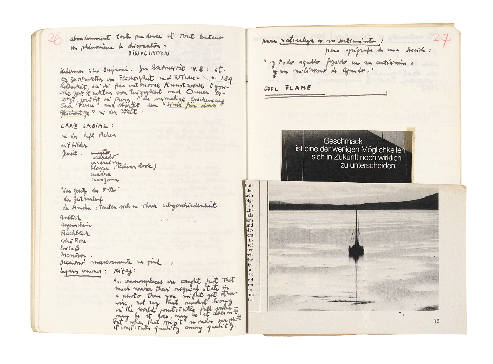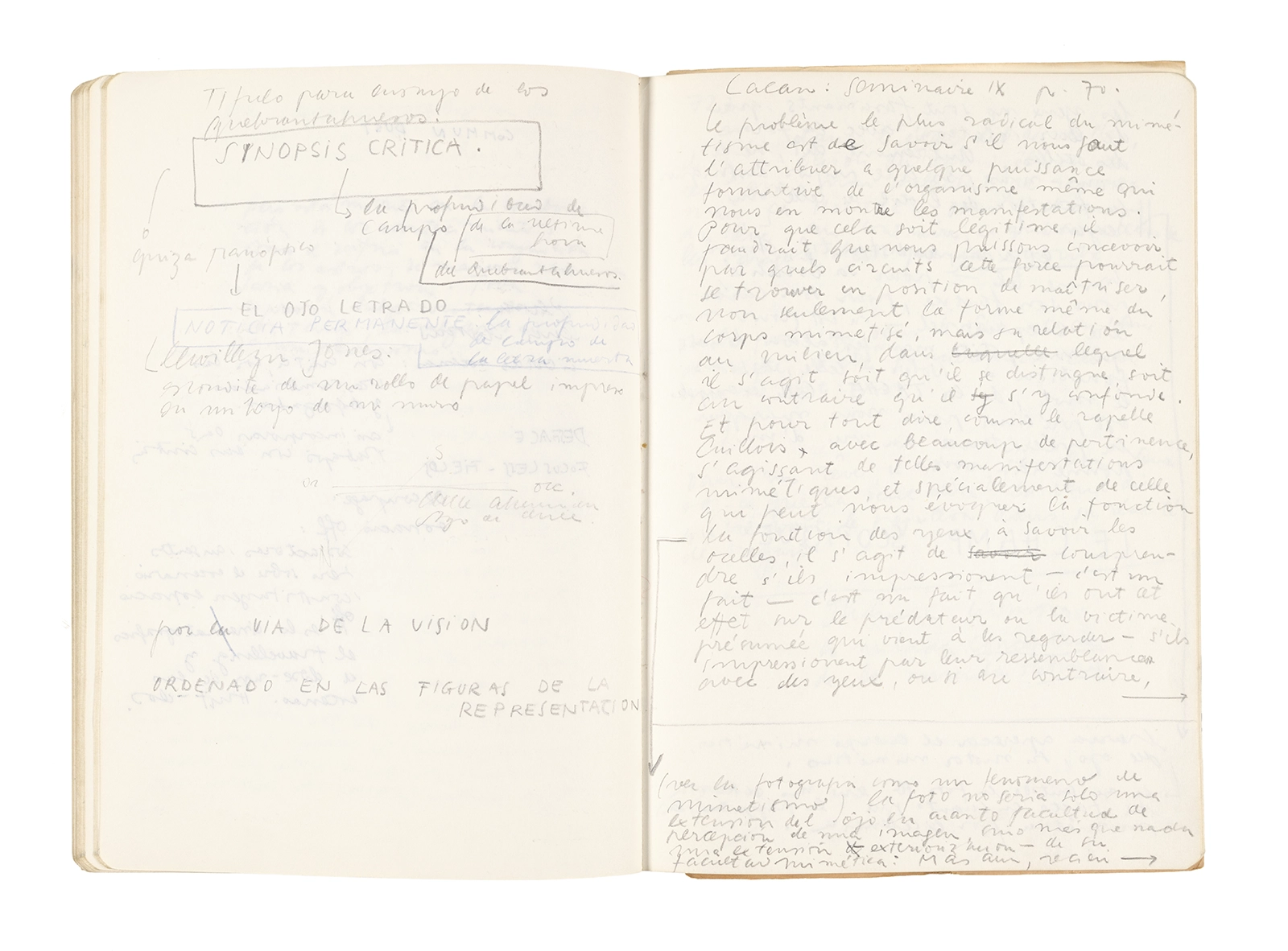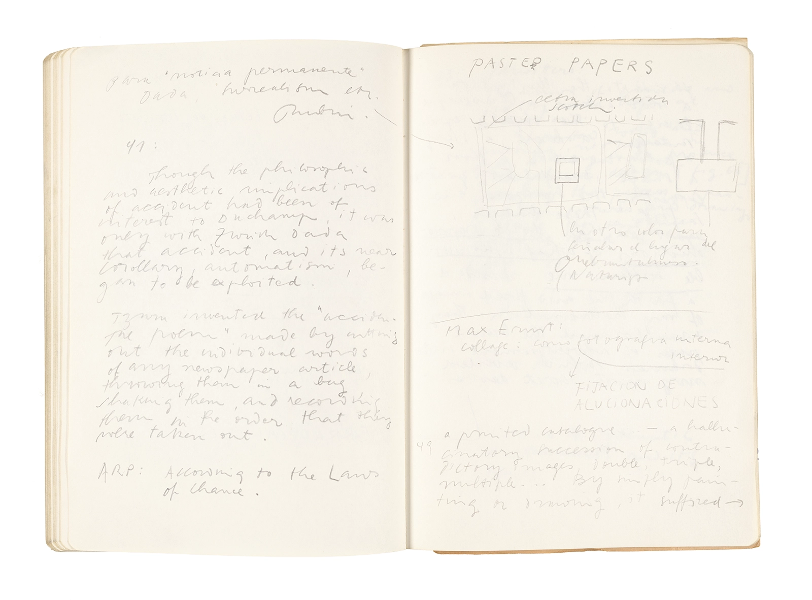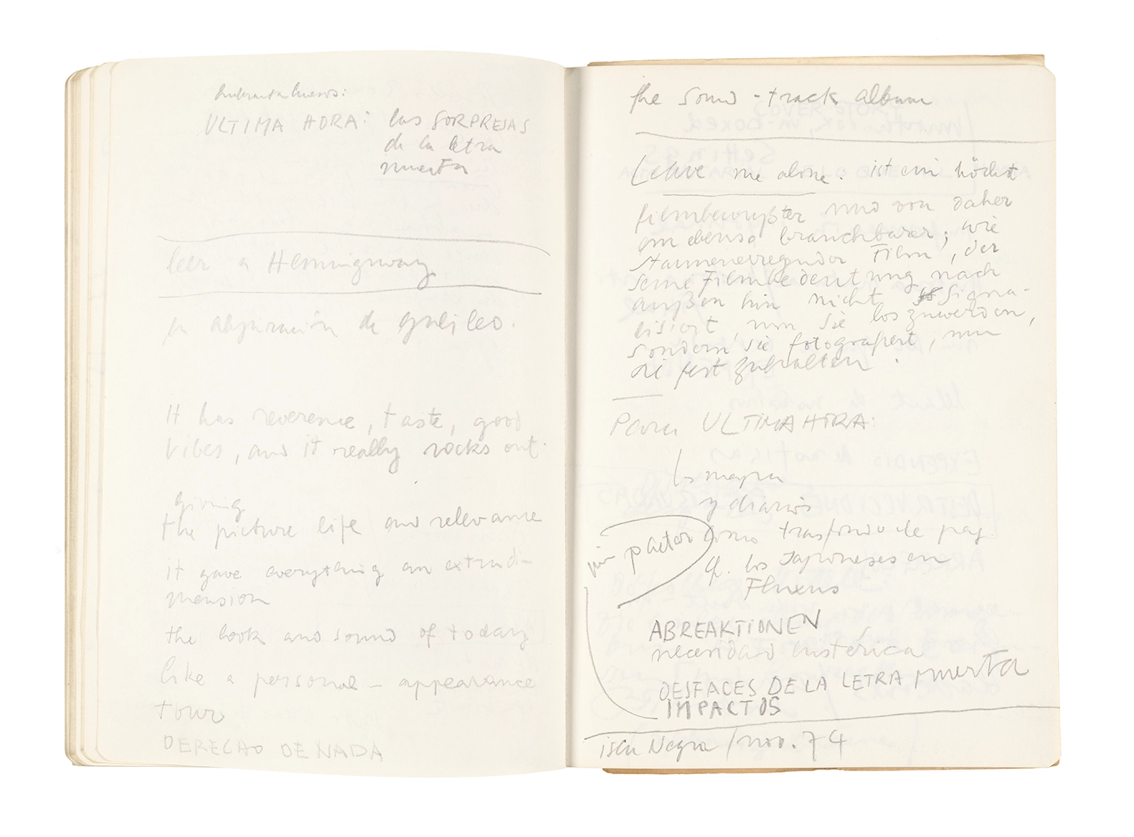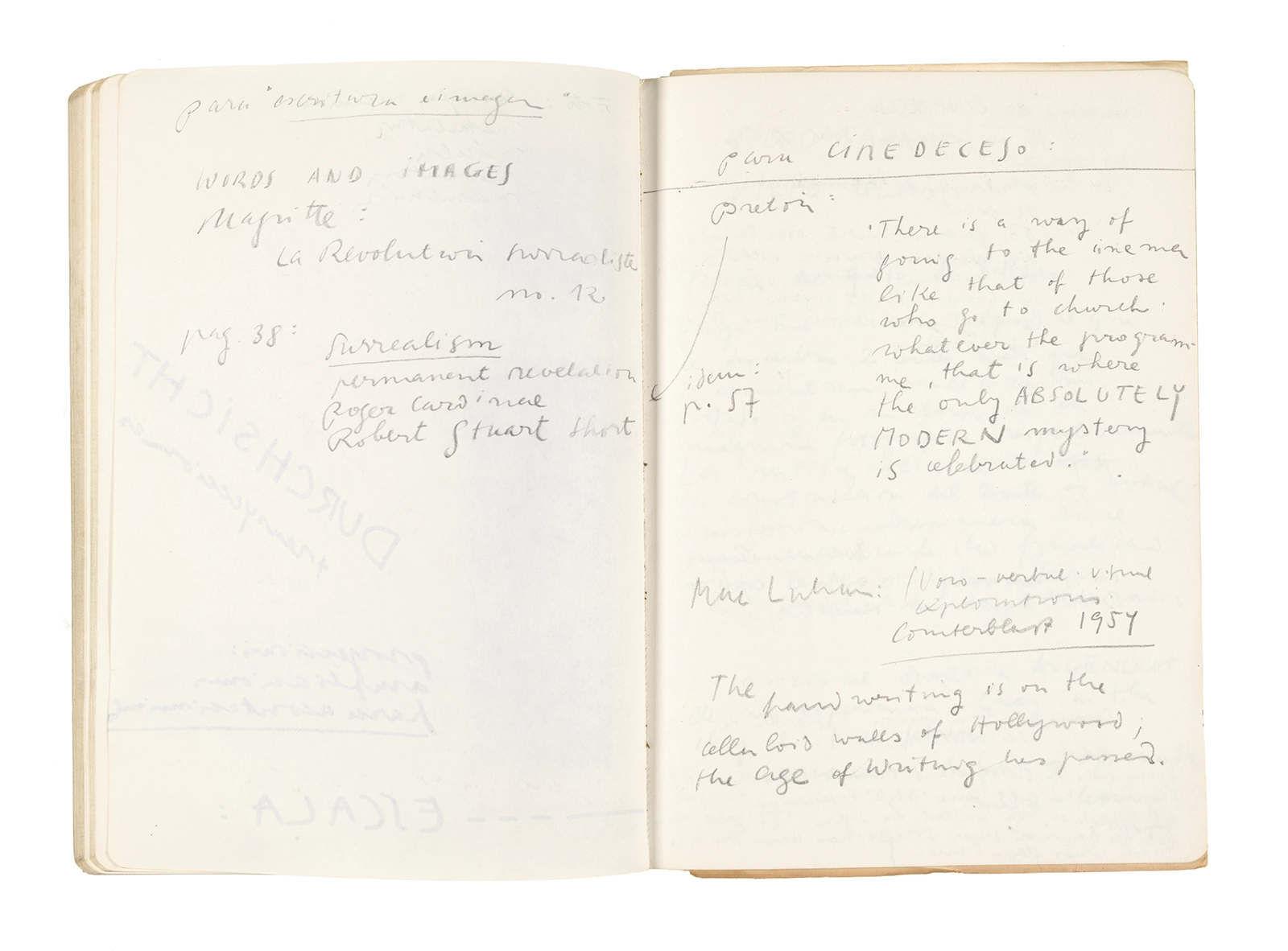 Este cuaderno contiene apuntes diversos, algunos de ellos vinculados a los seminarios “Una hermeneutica teórica y práctica de los escritos de Antonin Artaud” y “Escr:i:magen: Una sistematización de los ensayos teóricos de Stéphane Mallarmé”, dictado por Ronald Kay durante los años 1974 y 1975 en el Departamento de Estudios Humanísticos de la Universidad de Chile. Aquí se incluyen, además, notas sobre fotografía, sobre el concepto de “ready-made” y sobre los happenings de Wolf Vostell, así como también menciones a Paul Valéry, Ronald Kitaj, Roland Barthes, Martin Heidegger, Walter Benjamin, Maurice Merleau-Ponty, André Bazin, Marx Ernst, Wallace Stevens y E. E. Cummings, entre otros. Asimismo, este cuaderno contiene notas referentes a la revista “Manuscritos”.