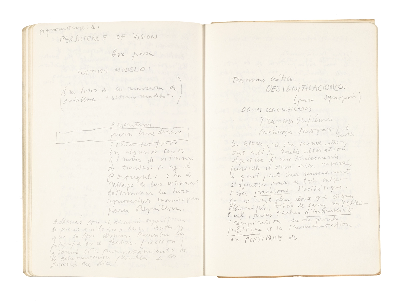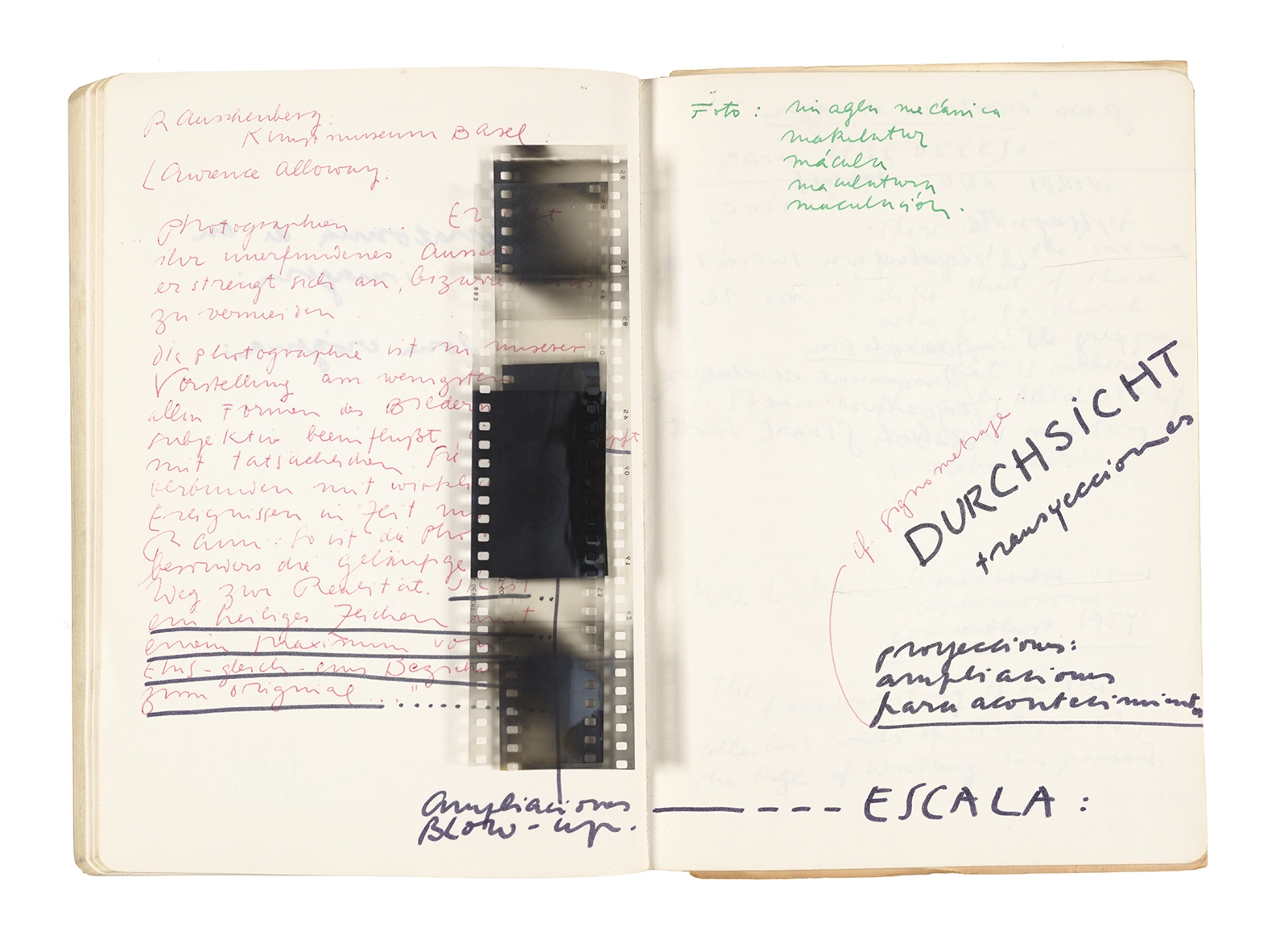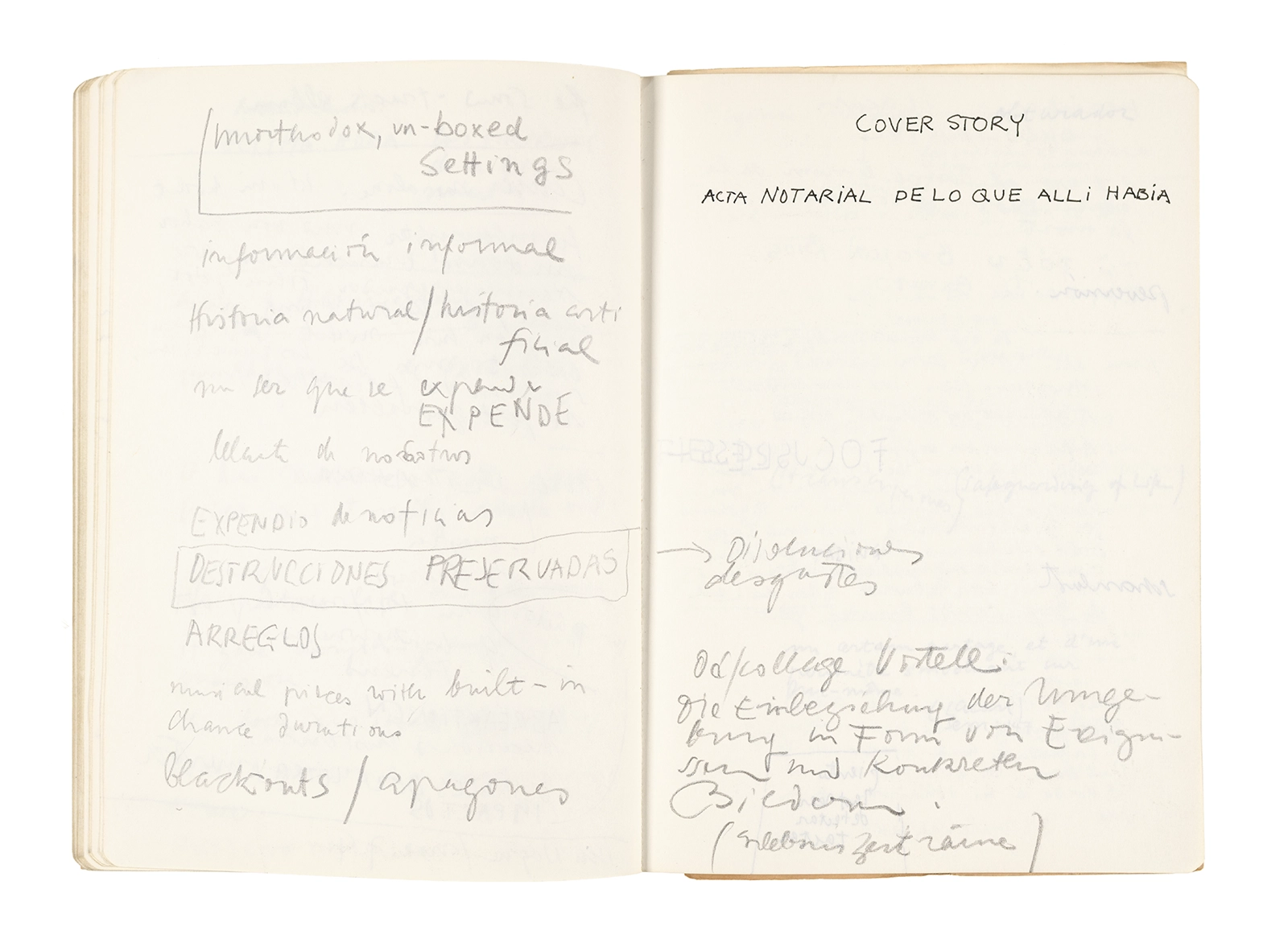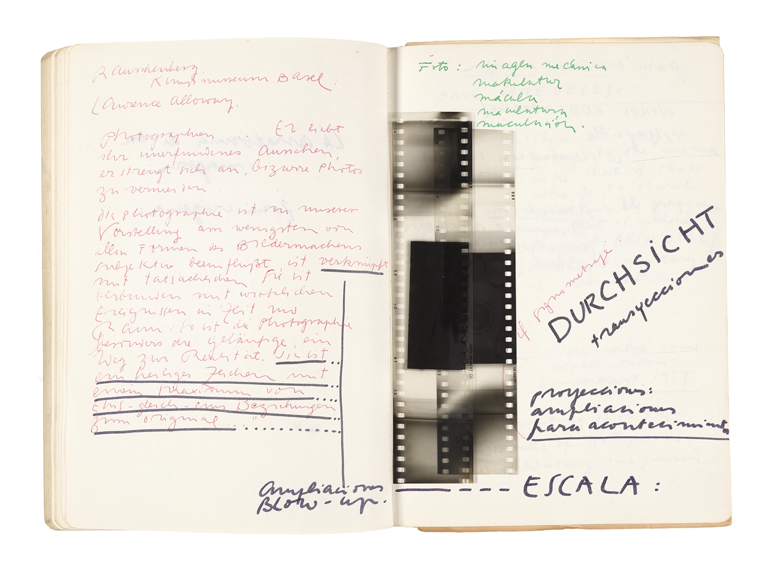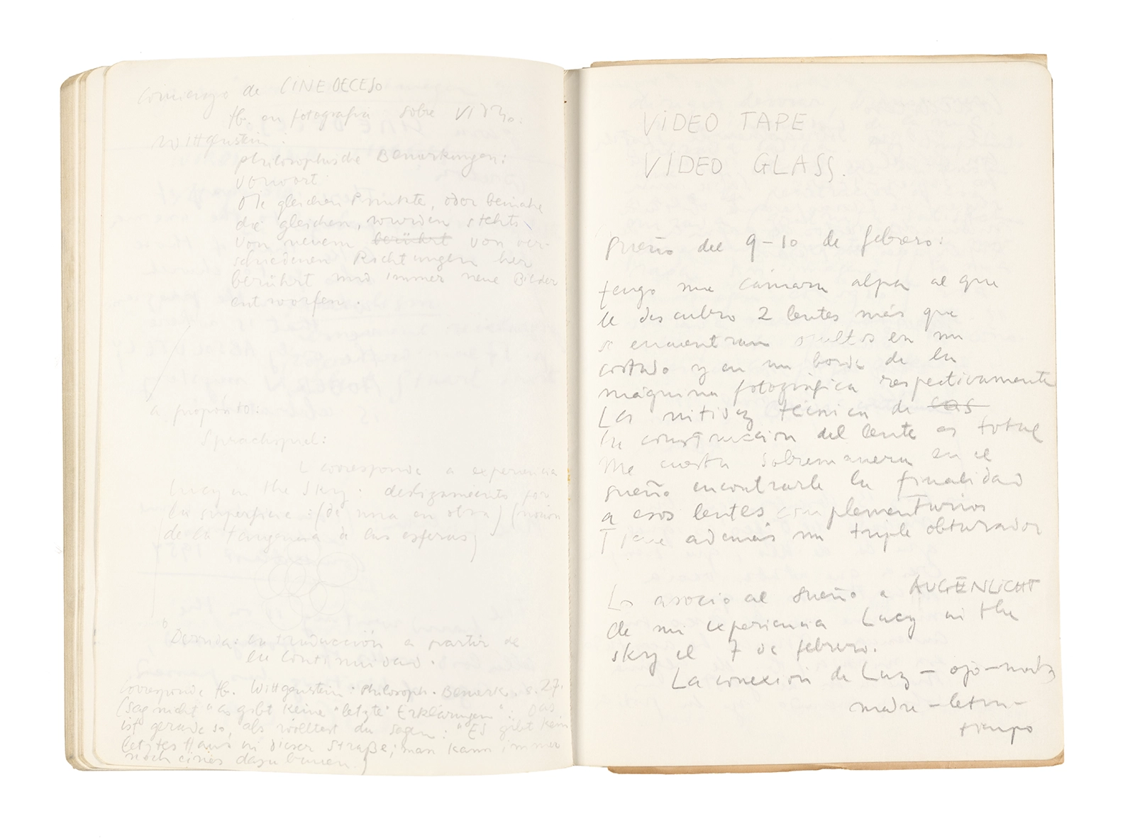 Este cuaderno contiene apuntes diversos, algunos de ellos vinculados a los seminarios “Una hermeneutica teórica y práctica de los escritos de Antonin Artaud” y “Escr:i:magen: Una sistematización de los ensayos teóricos de Stéphane Mallarmé”, dictado por Ronald Kay durante los años 1974 y 1975 en el Departamento de Estudios Humanísticos de la Universidad de Chile. Aquí se incluyen, además, notas sobre fotografía, sobre el concepto de “ready-made” y sobre los happenings de Wolf Vostell, así como también menciones a Paul Valéry, Ronald Kitaj, Roland Barthes, Martin Heidegger, Walter Benjamin, Maurice Merleau-Ponty, André Bazin, Marx Ernst, Wallace Stevens y E. E. Cummings, entre otros. Asimismo, este cuaderno contiene notas referentes a la revista “Manuscritos”.