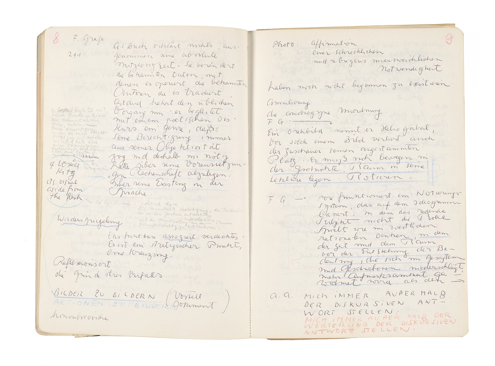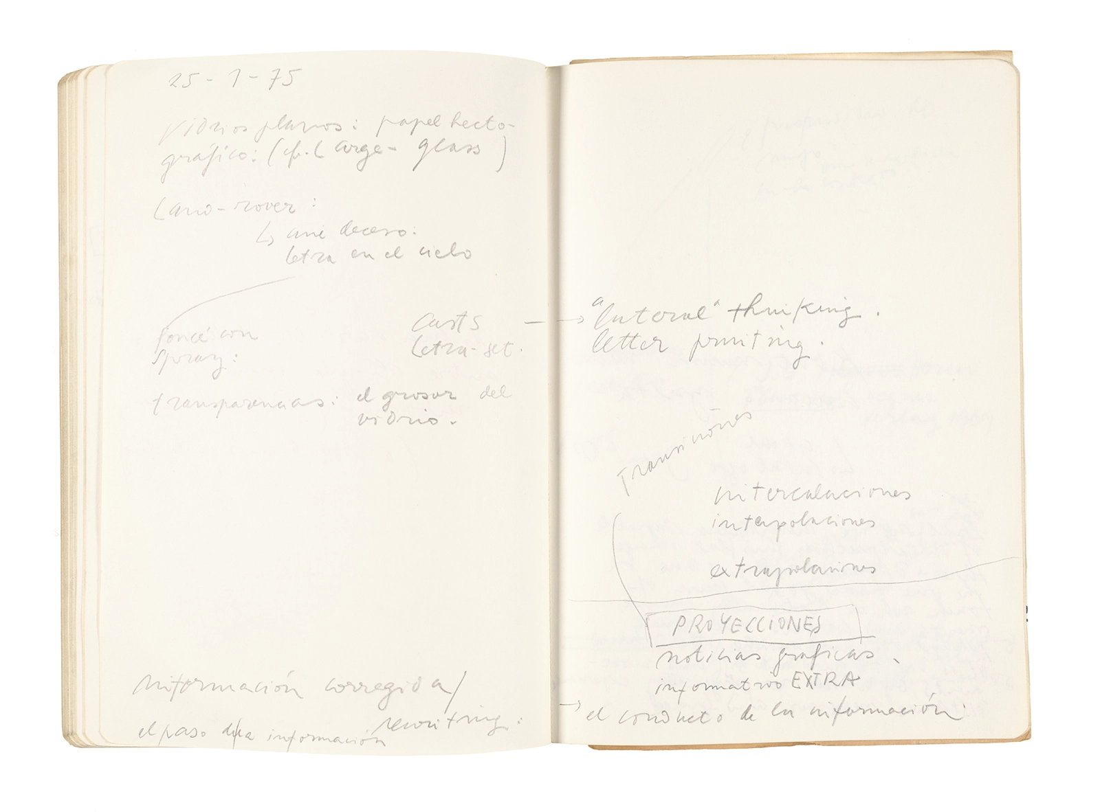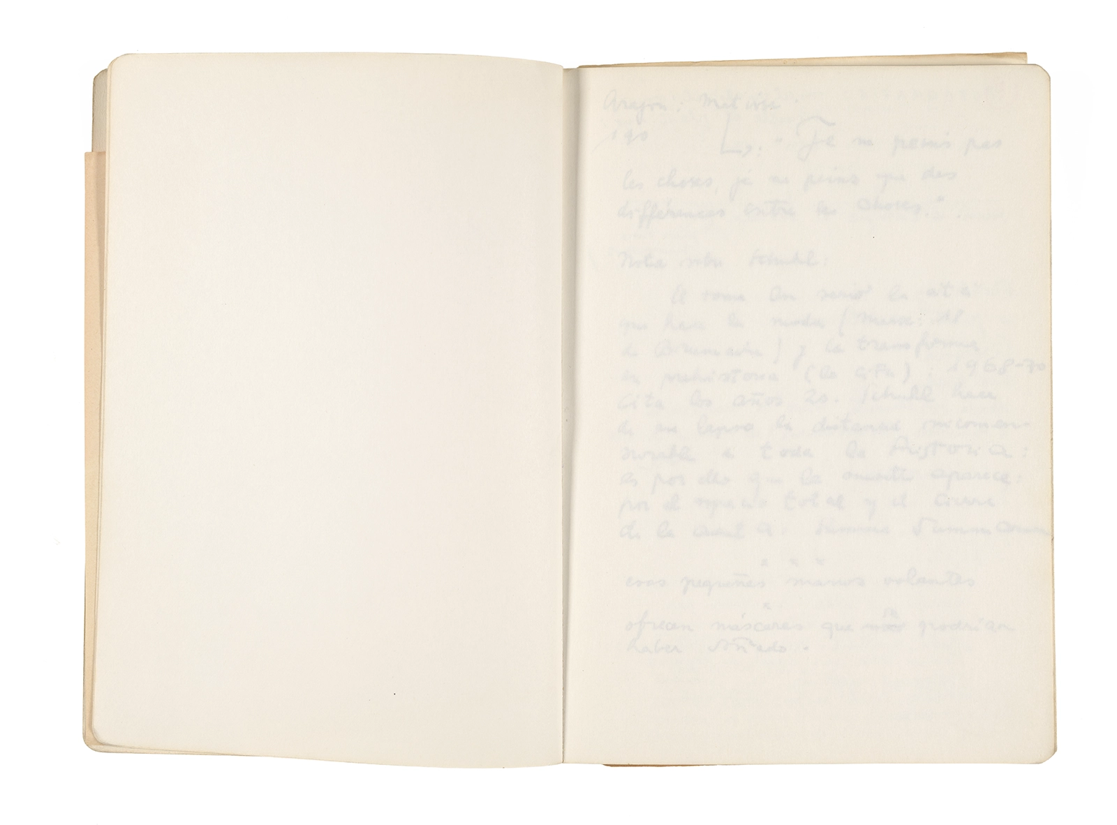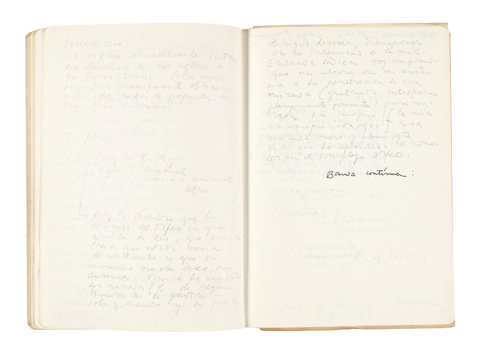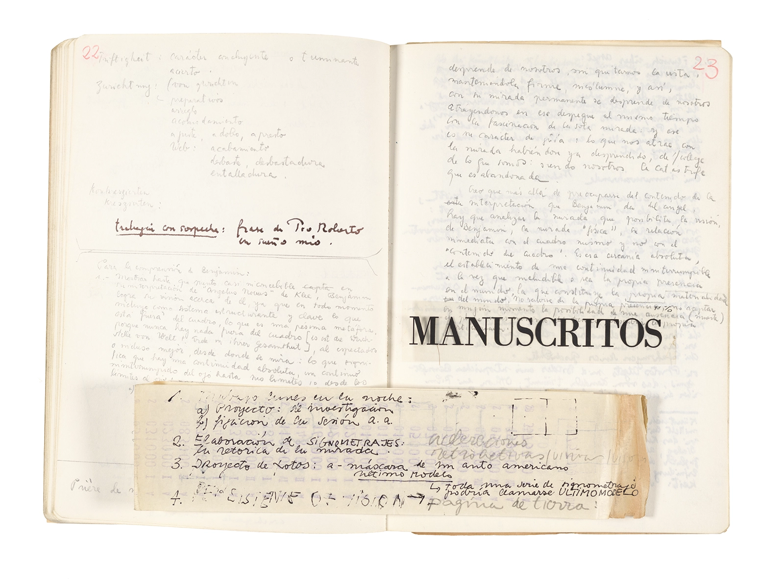 Este cuaderno contiene apuntes diversos, algunos de ellos vinculados a los seminarios “Una hermeneutica teórica y práctica de los escritos de Antonin Artaud” y “Escr:i:magen: Una sistematización de los ensayos teóricos de Stéphane Mallarmé”, dictado por Ronald Kay durante los años 1974 y 1975 en el Departamento de Estudios Humanísticos de la Universidad de Chile. Aquí se incluyen, además, notas sobre fotografía, sobre el concepto de “ready-made” y sobre los happenings de Wolf Vostell, así como también menciones a Paul Valéry, Ronald Kitaj, Roland Barthes, Martin Heidegger, Walter Benjamin, Maurice Merleau-Ponty, André Bazin, Marx Ernst, Wallace Stevens y E. E. Cummings, entre otros. Asimismo, este cuaderno contiene notas referentes a la revista “Manuscritos”.