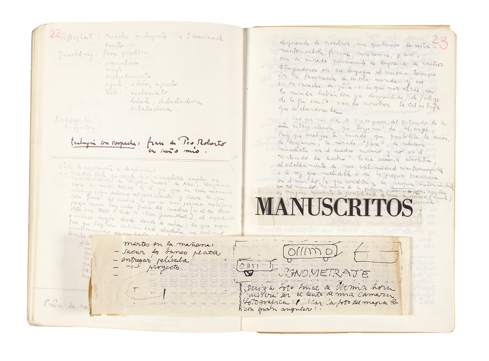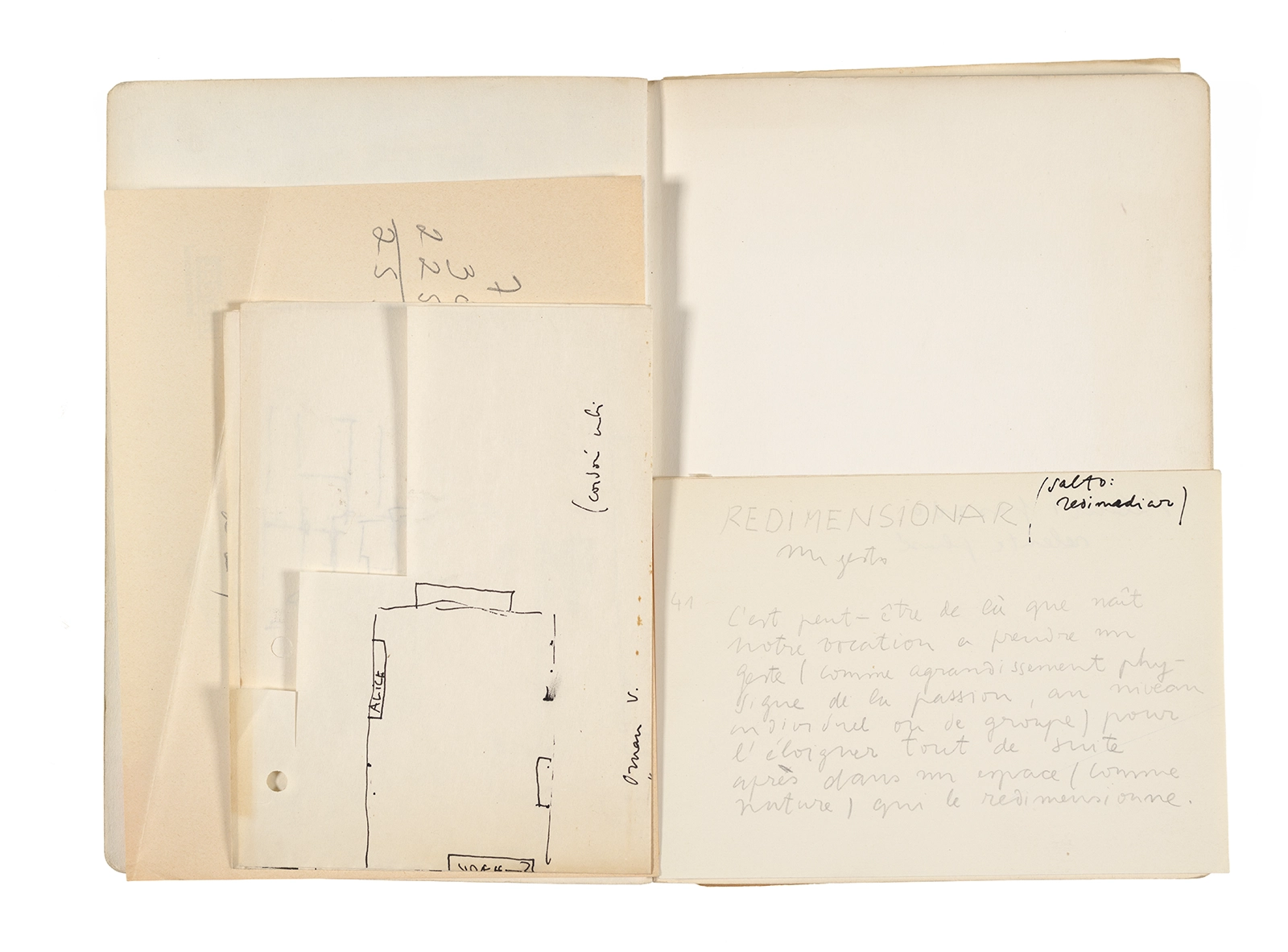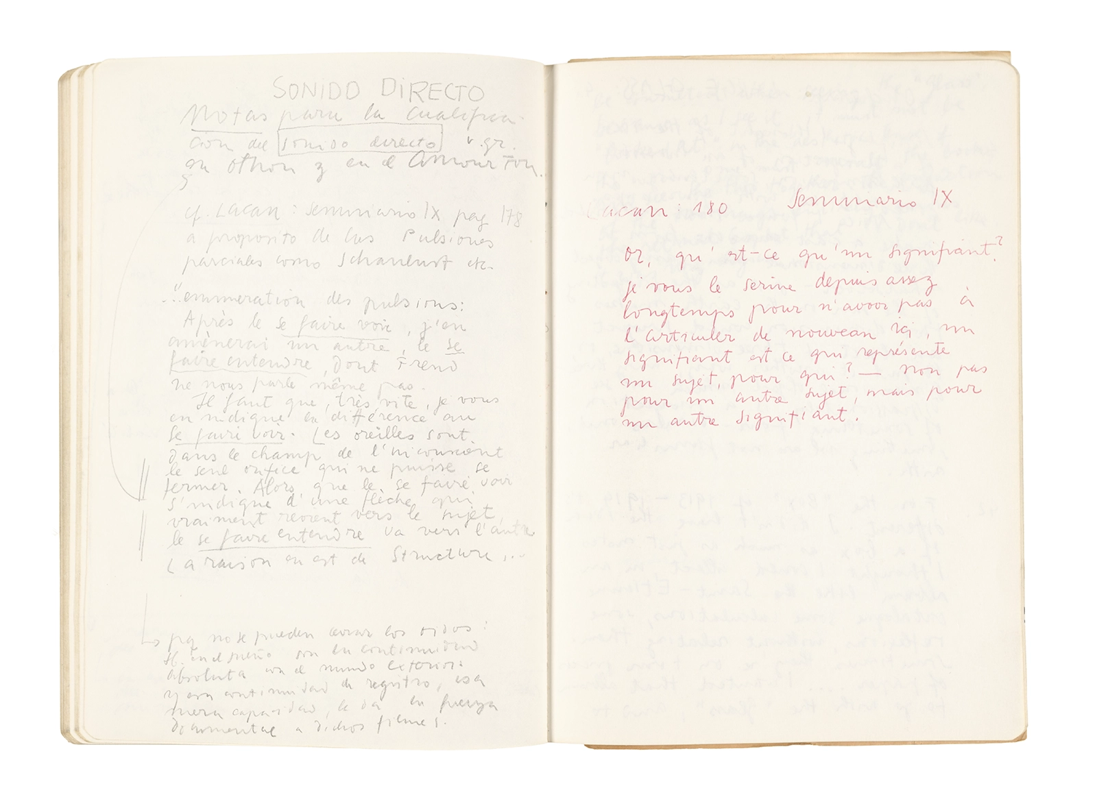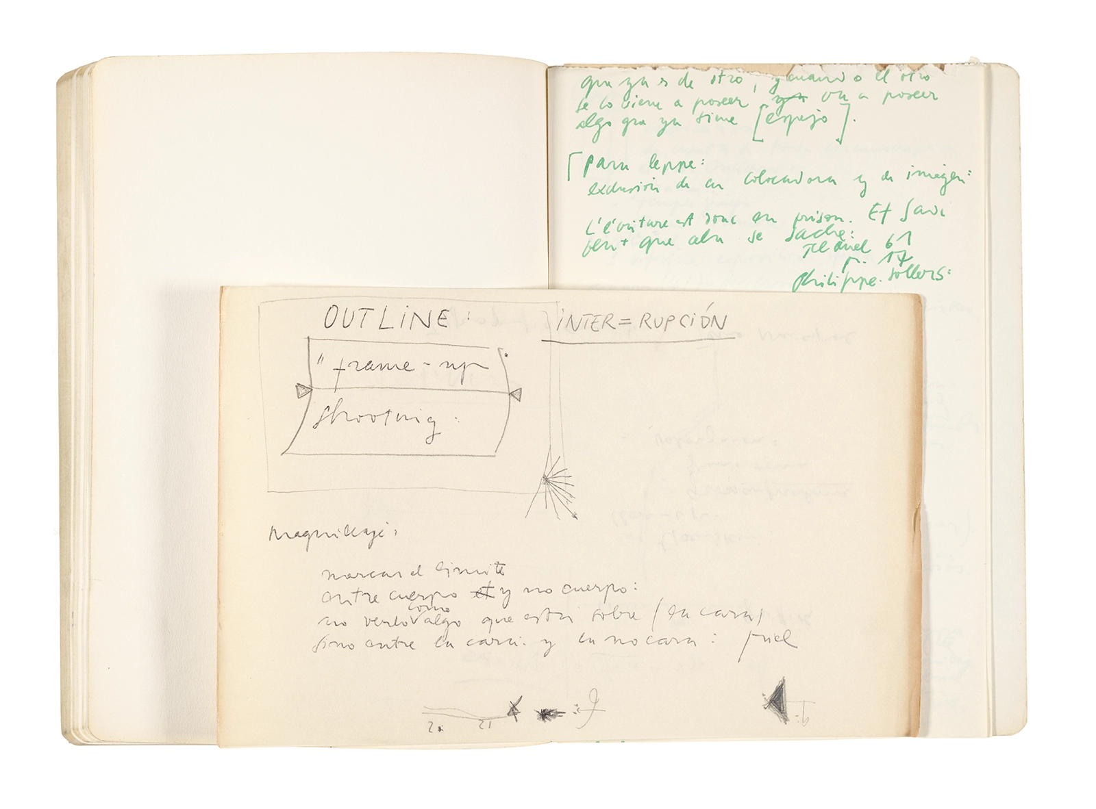 Este cuaderno contiene apuntes diversos, algunos de ellos vinculados a los seminarios “Una hermeneutica teórica y práctica de los escritos de Antonin Artaud” y “Escr:i:magen: Una sistematización de los ensayos teóricos de Stéphane Mallarmé”, dictado por Ronald Kay durante los años 1974 y 1975 en el Departamento de Estudios Humanísticos de la Universidad de Chile. Aquí se incluyen, además, notas sobre fotografía, sobre el concepto de “ready-made” y sobre los happenings de Wolf Vostell, así como también menciones a Paul Valéry, Ronald Kitaj, Roland Barthes, Martin Heidegger, Walter Benjamin, Maurice Merleau-Ponty, André Bazin, Marx Ernst, Wallace Stevens y E. E. Cummings, entre otros. Asimismo, este cuaderno contiene notas referentes a la revista “Manuscritos”.