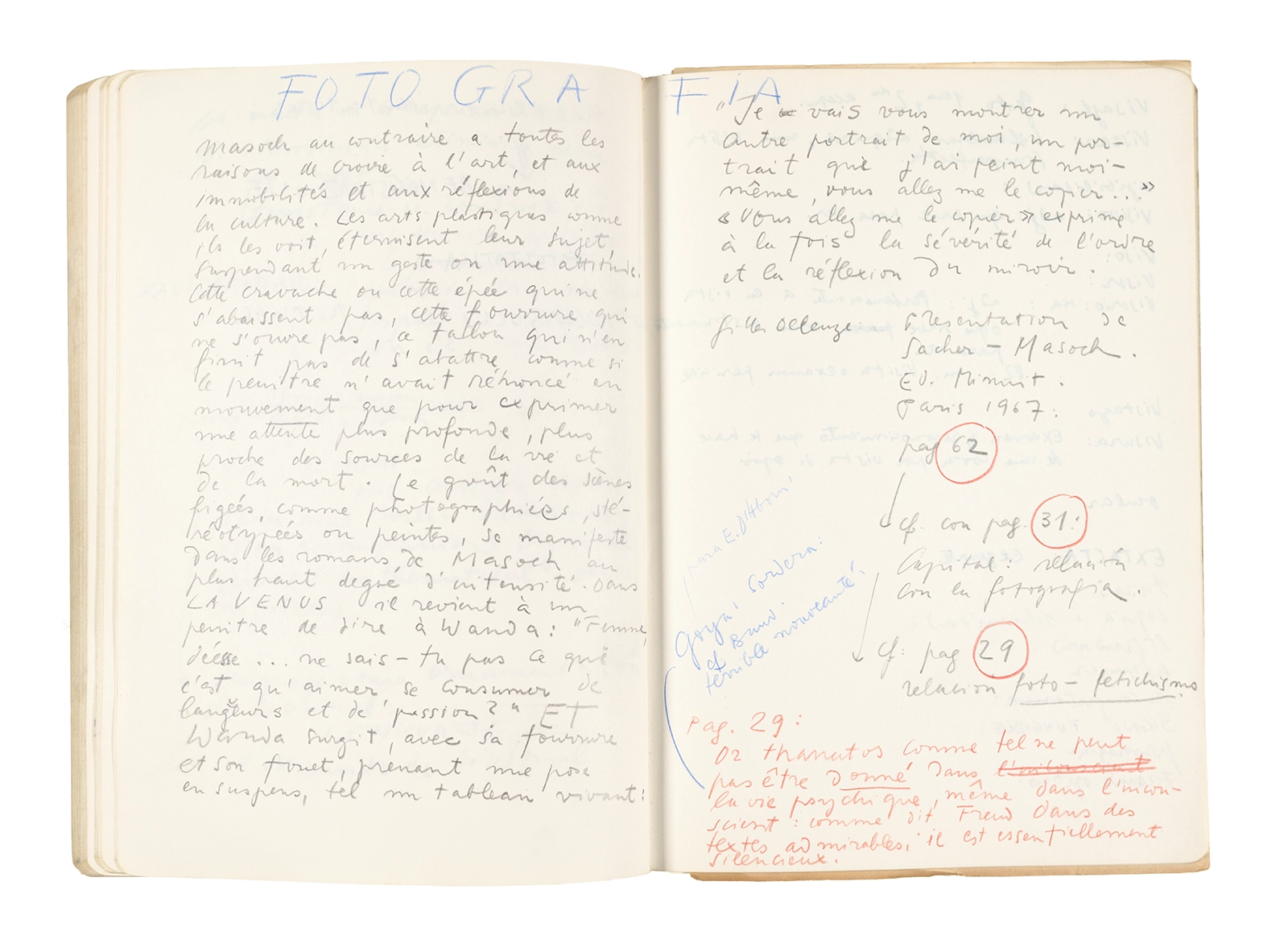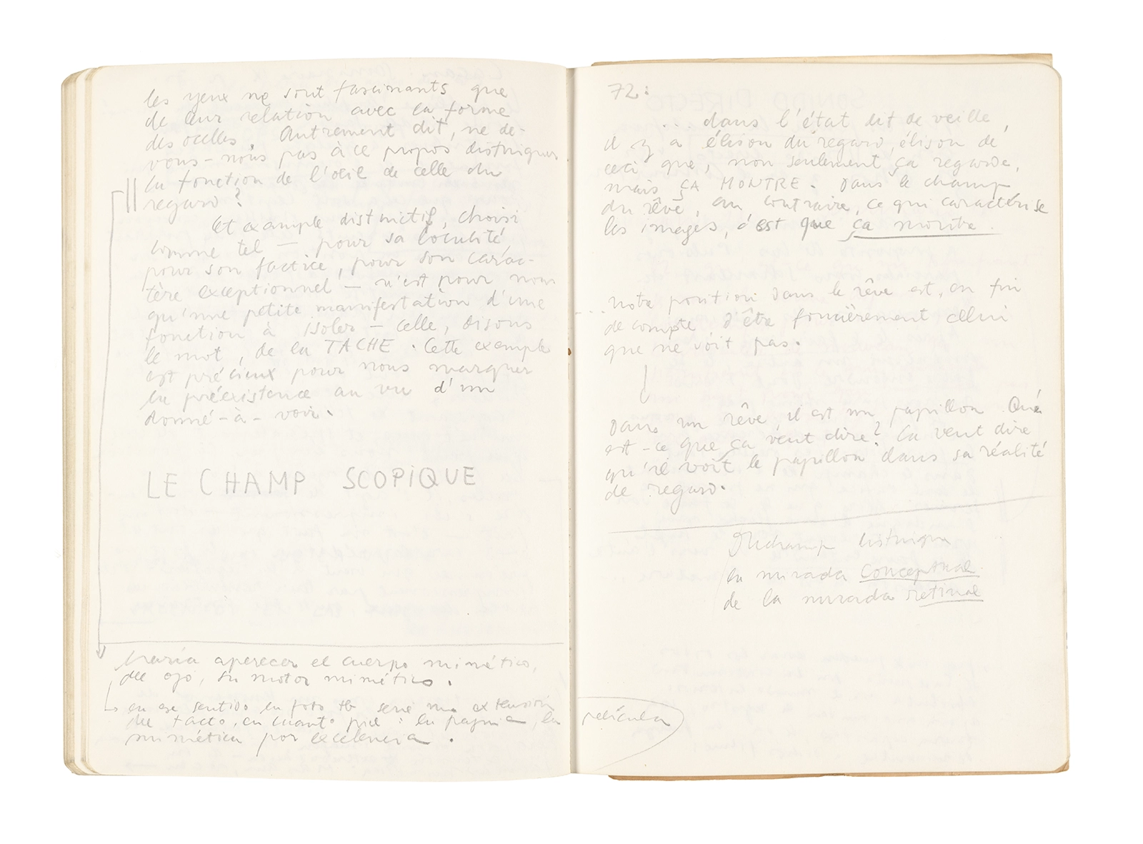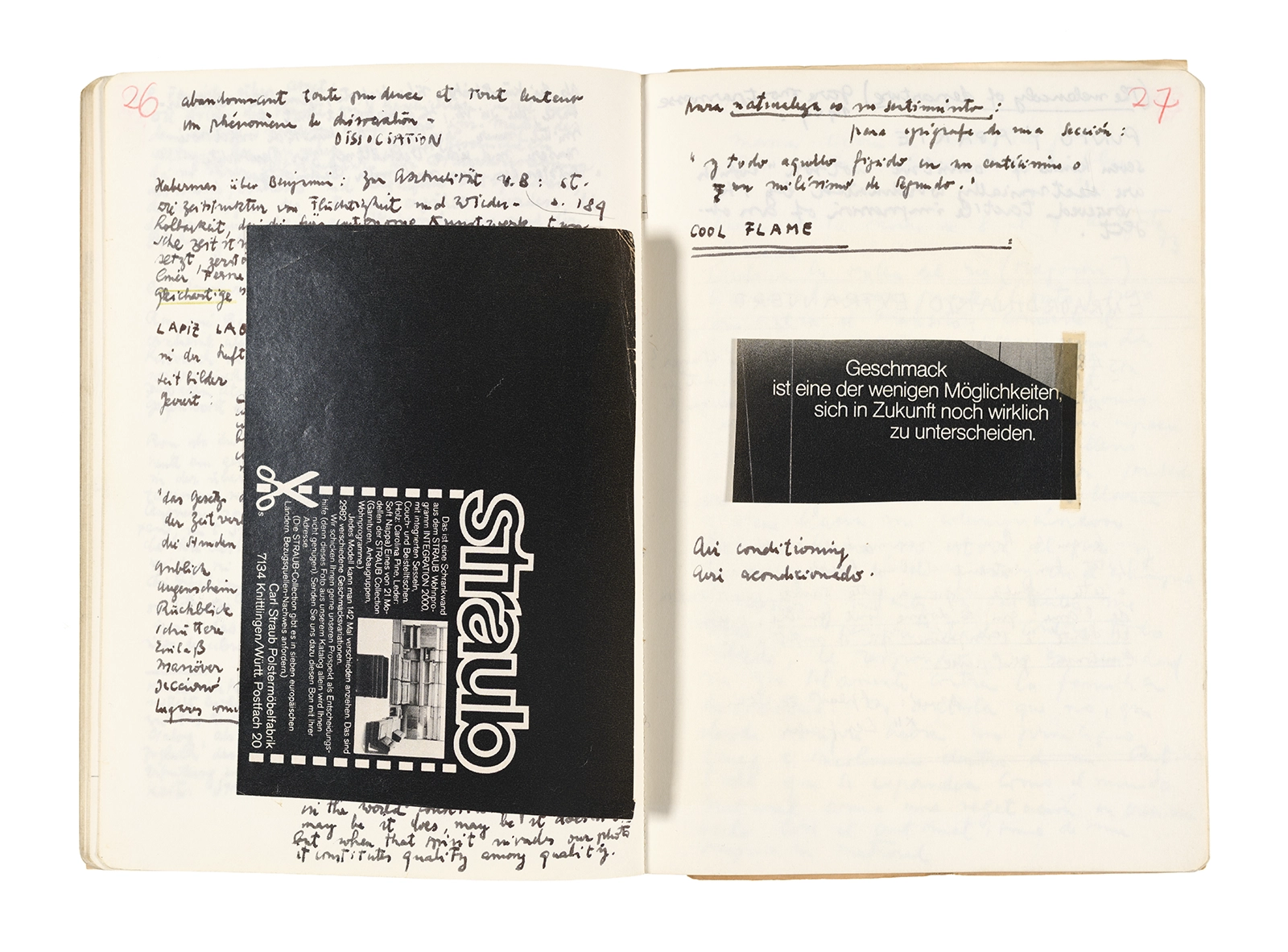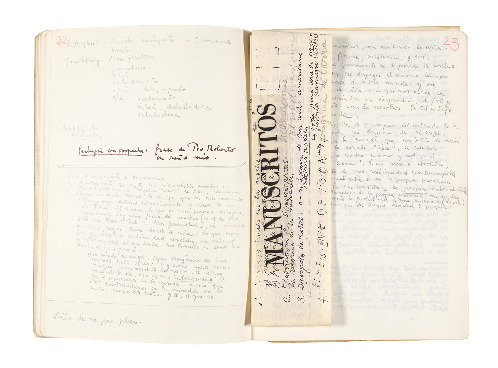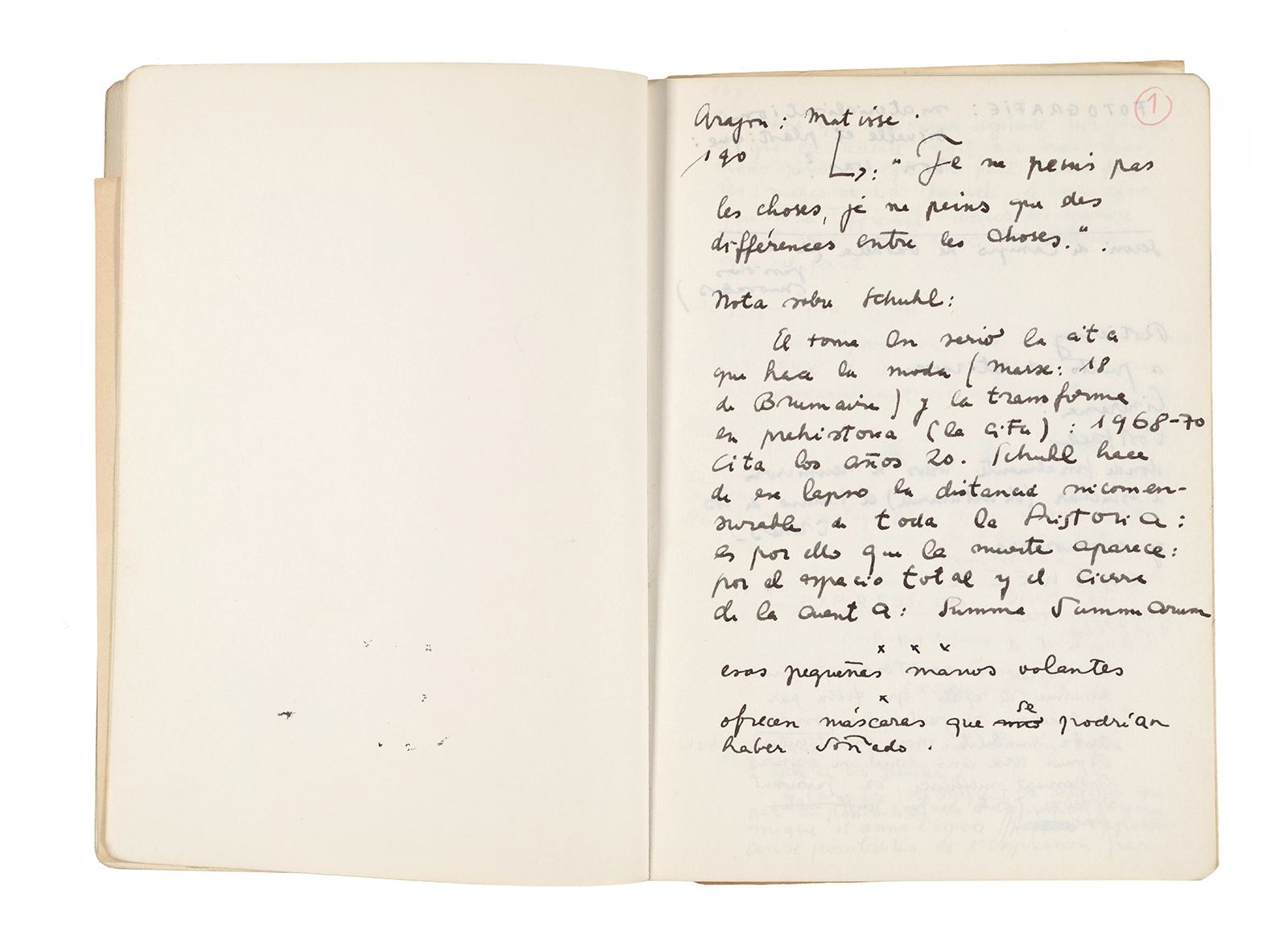 Este cuaderno contiene apuntes diversos, algunos de ellos vinculados a los seminarios “Una hermeneutica teórica y práctica de los escritos de Antonin Artaud” y “Escr:i:magen: Una sistematización de los ensayos teóricos de Stéphane Mallarmé”, dictado por Ronald Kay durante los años 1974 y 1975 en el Departamento de Estudios Humanísticos de la Universidad de Chile. Aquí se incluyen, además, notas sobre fotografía, sobre el concepto de “ready-made” y sobre los happenings de Wolf Vostell, así como también menciones a Paul Valéry, Ronald Kitaj, Roland Barthes, Martin Heidegger, Walter Benjamin, Maurice Merleau-Ponty, André Bazin, Marx Ernst, Wallace Stevens y E. E. Cummings, entre otros. Asimismo, este cuaderno contiene notas referentes a la revista “Manuscritos”.