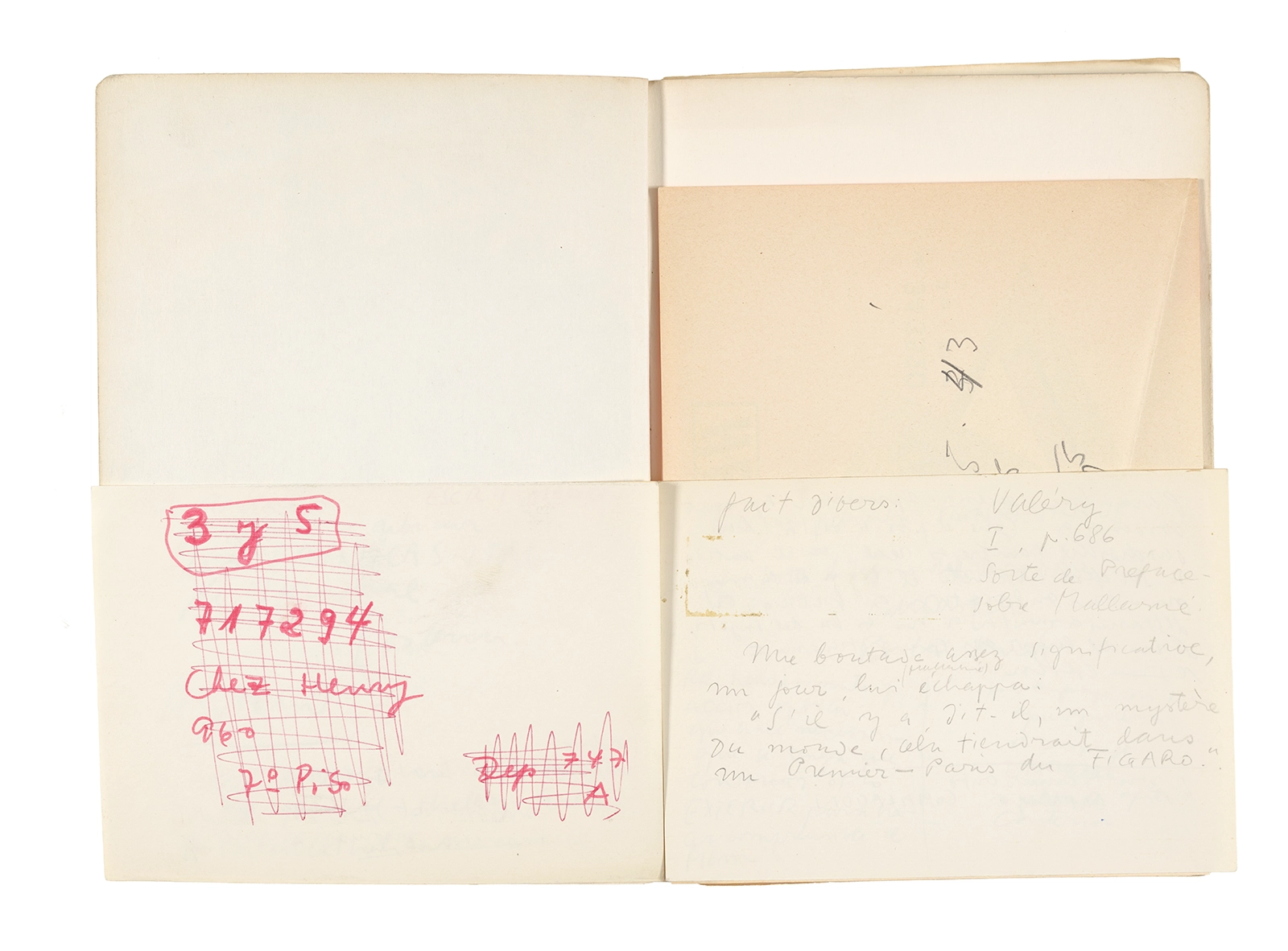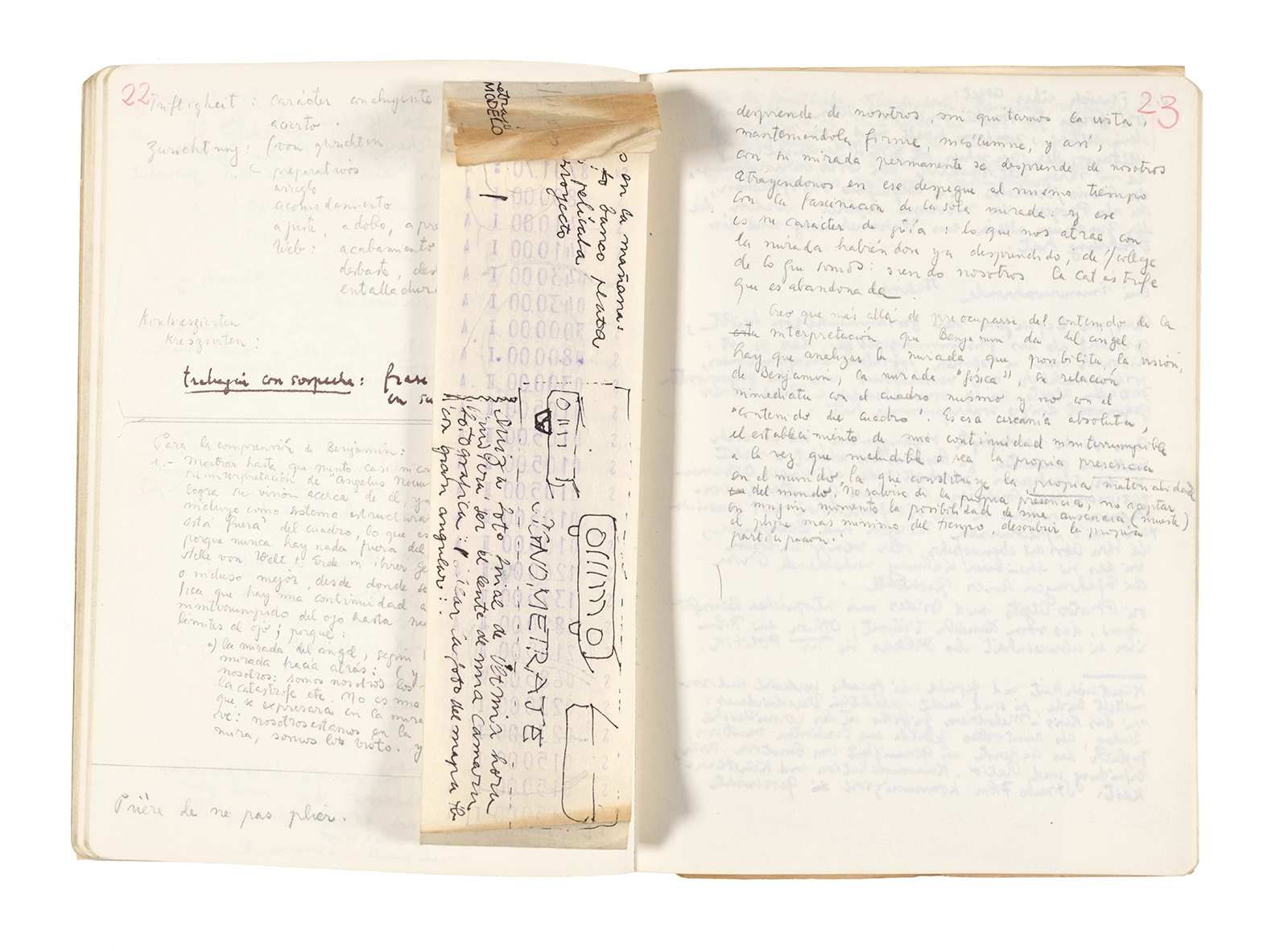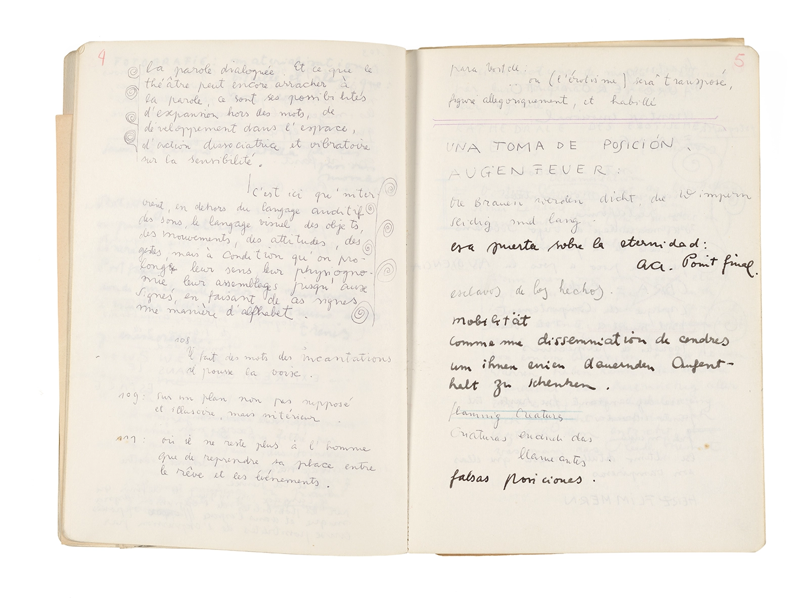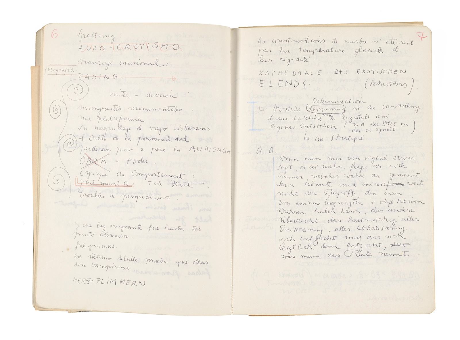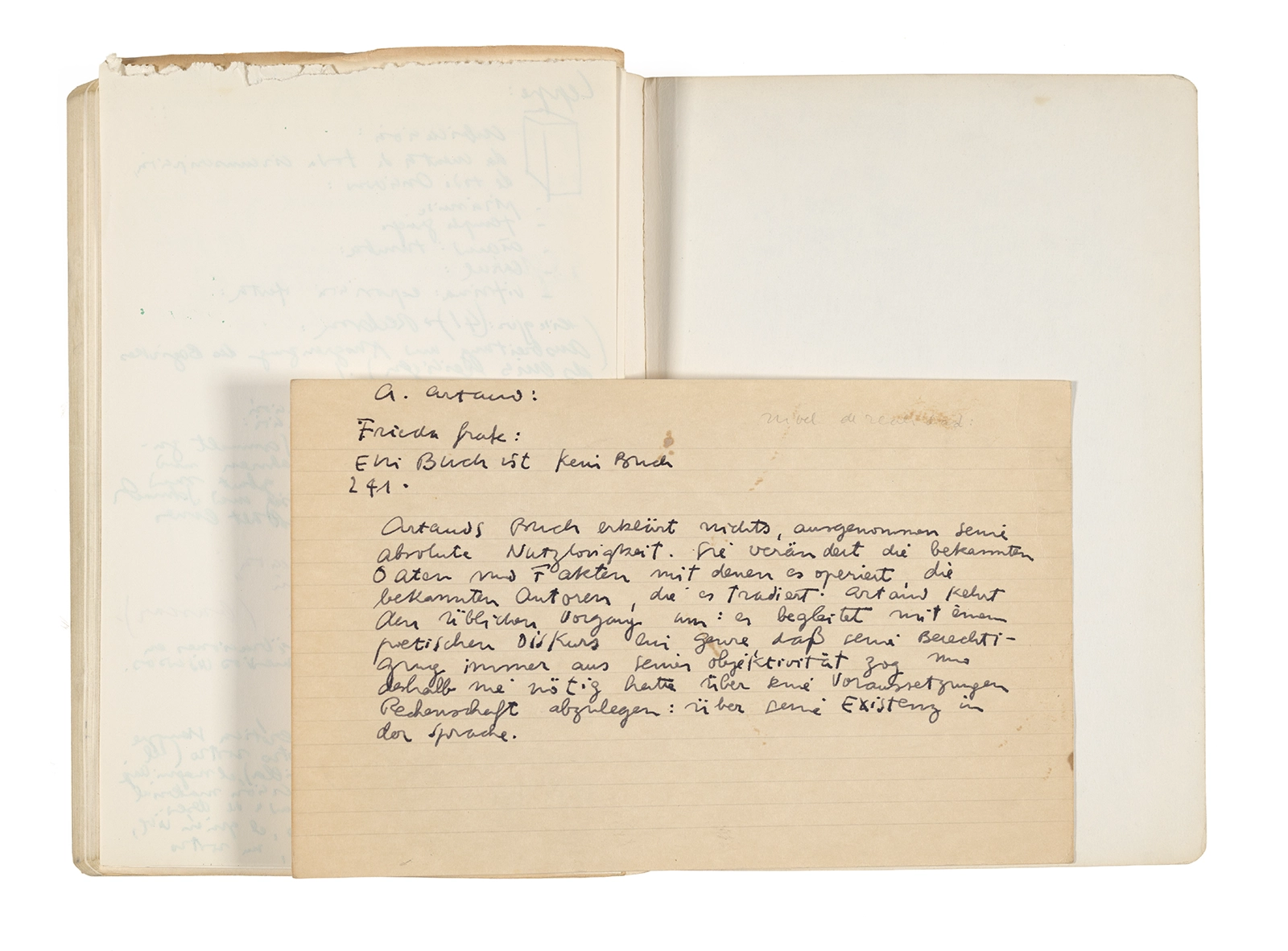 Este cuaderno contiene apuntes diversos, algunos de ellos vinculados a los seminarios “Una hermeneutica teórica y práctica de los escritos de Antonin Artaud” y “Escr:i:magen: Una sistematización de los ensayos teóricos de Stéphane Mallarmé”, dictado por Ronald Kay durante los años 1974 y 1975 en el Departamento de Estudios Humanísticos de la Universidad de Chile. Aquí se incluyen, además, notas sobre fotografía, sobre el concepto de “ready-made” y sobre los happenings de Wolf Vostell, así como también menciones a Paul Valéry, Ronald Kitaj, Roland Barthes, Martin Heidegger, Walter Benjamin, Maurice Merleau-Ponty, André Bazin, Marx Ernst, Wallace Stevens y E. E. Cummings, entre otros. Asimismo, este cuaderno contiene notas referentes a la revista “Manuscritos”.