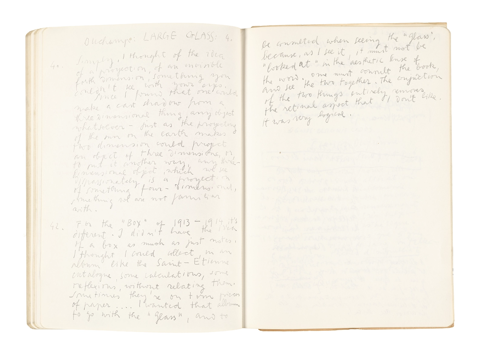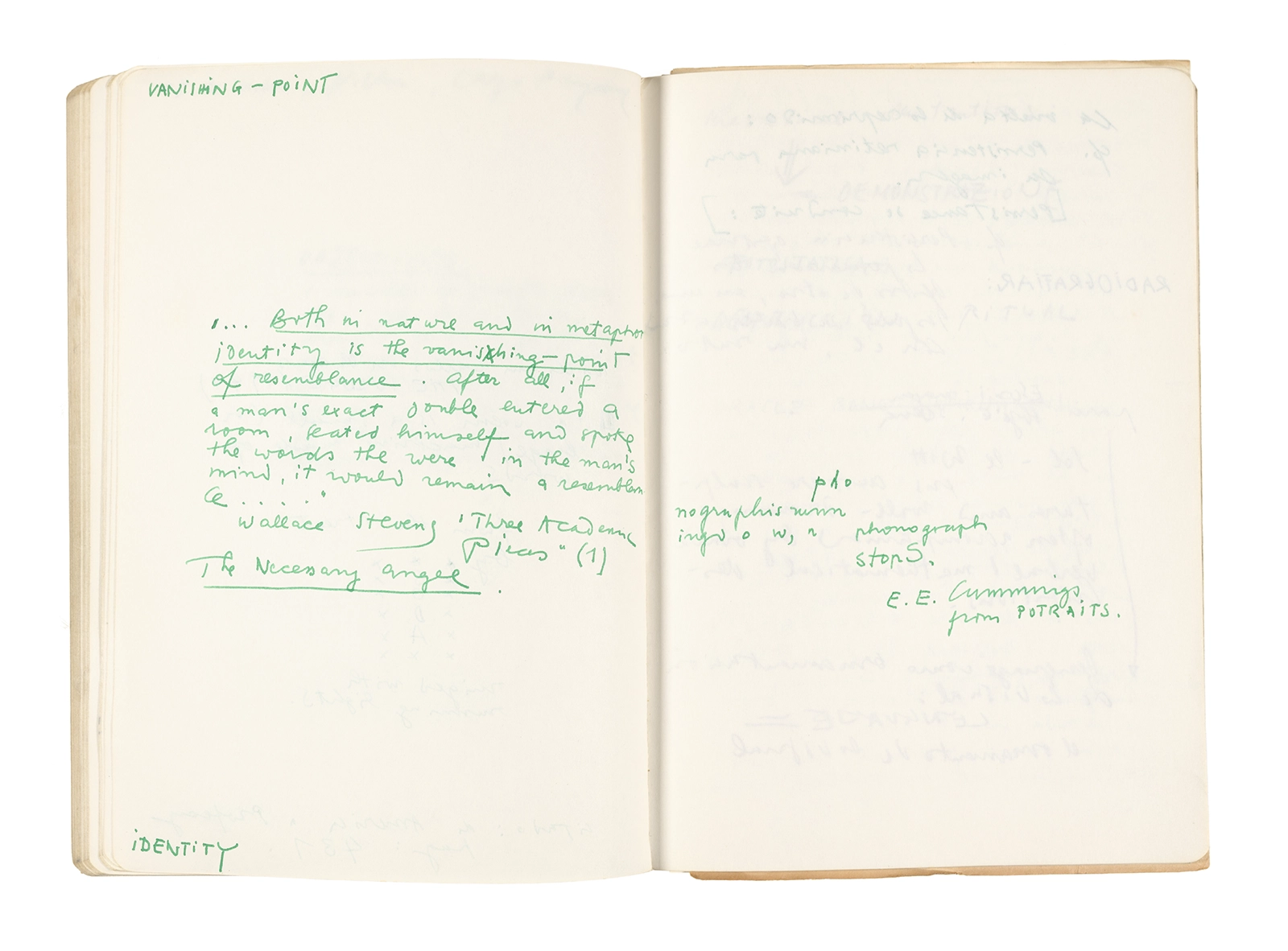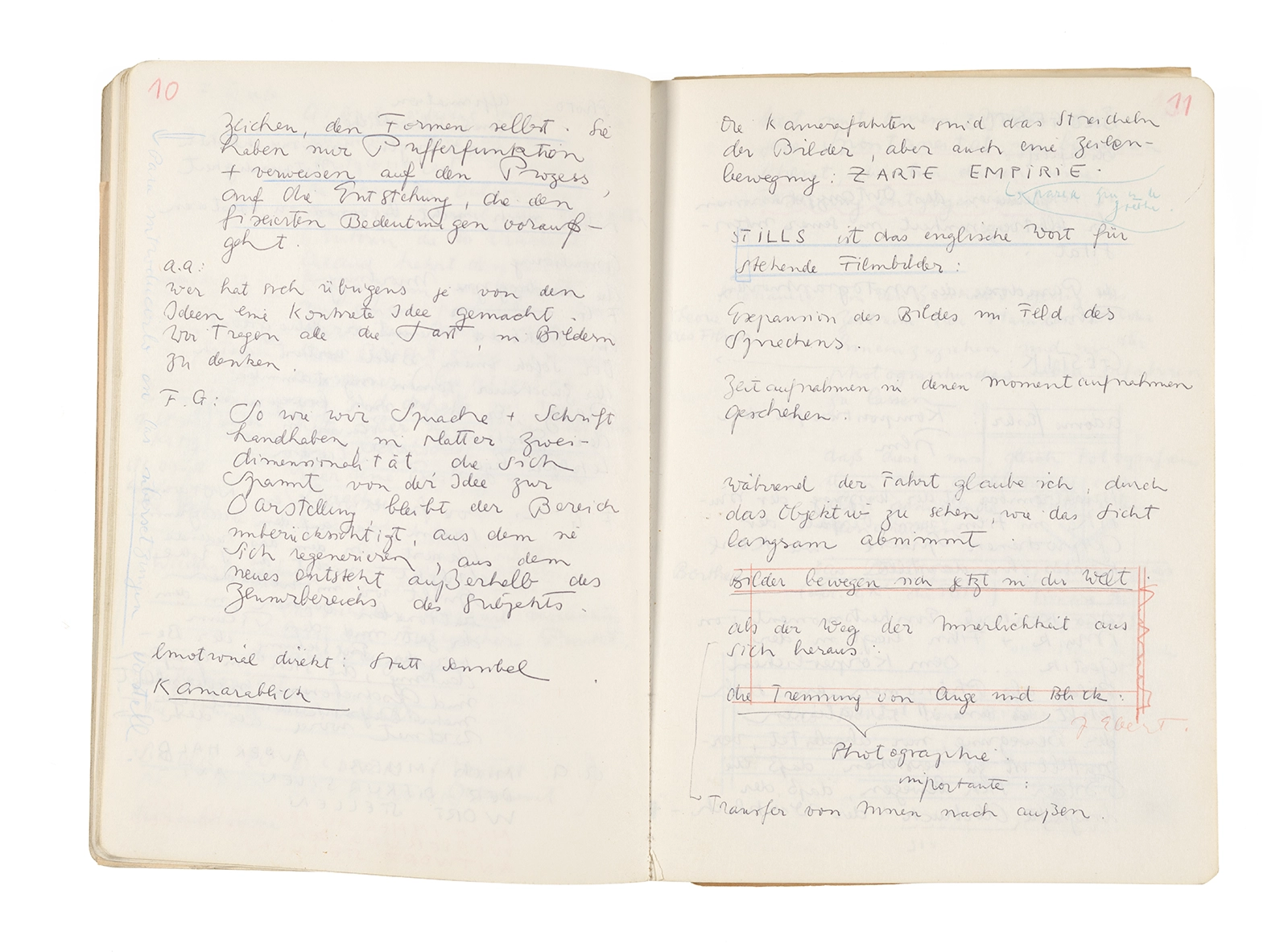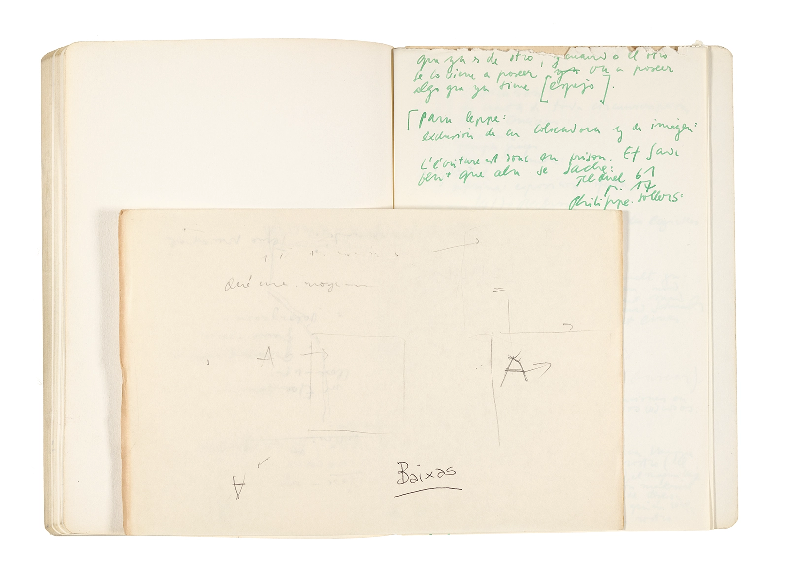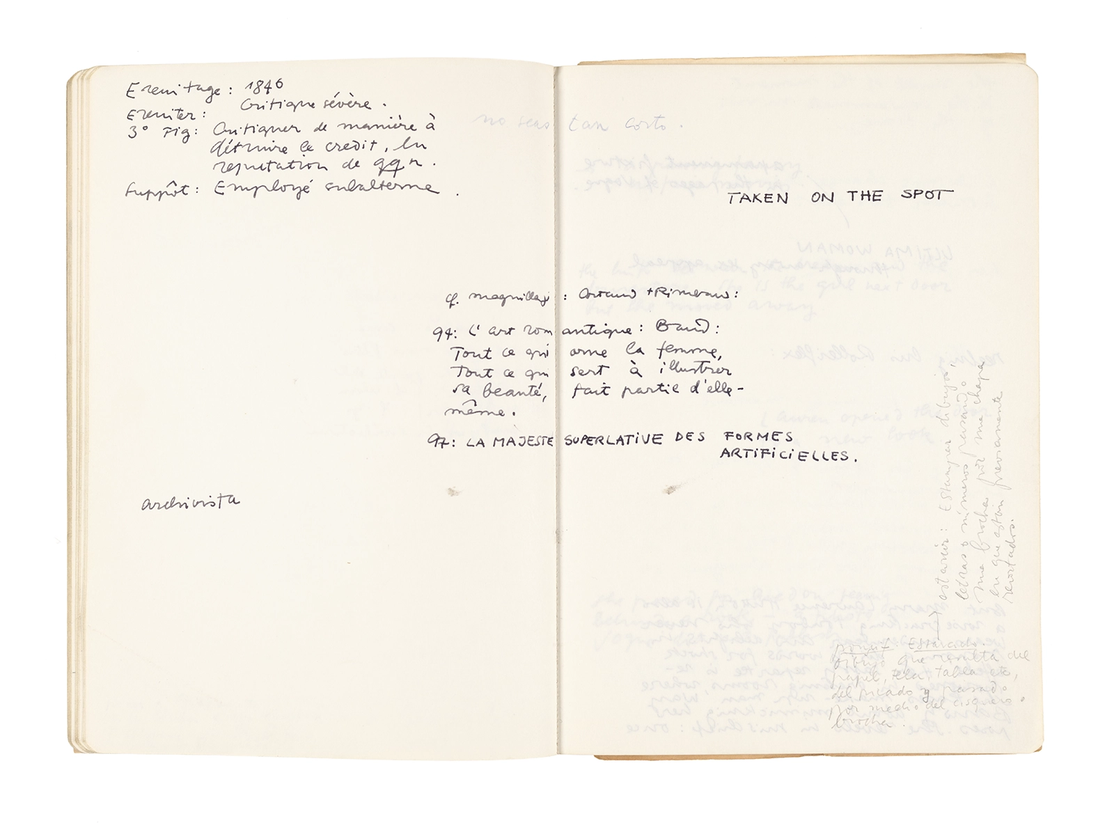 Este cuaderno contiene apuntes diversos, algunos de ellos vinculados a los seminarios “Una hermeneutica teórica y práctica de los escritos de Antonin Artaud” y “Escr:i:magen: Una sistematización de los ensayos teóricos de Stéphane Mallarmé”, dictado por Ronald Kay durante los años 1974 y 1975 en el Departamento de Estudios Humanísticos de la Universidad de Chile. Aquí se incluyen, además, notas sobre fotografía, sobre el concepto de “ready-made” y sobre los happenings de Wolf Vostell, así como también menciones a Paul Valéry, Ronald Kitaj, Roland Barthes, Martin Heidegger, Walter Benjamin, Maurice Merleau-Ponty, André Bazin, Marx Ernst, Wallace Stevens y E. E. Cummings, entre otros. Asimismo, este cuaderno contiene notas referentes a la revista “Manuscritos”.