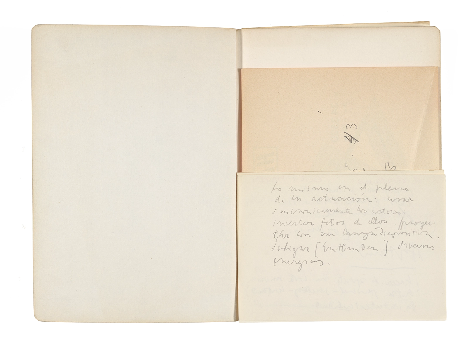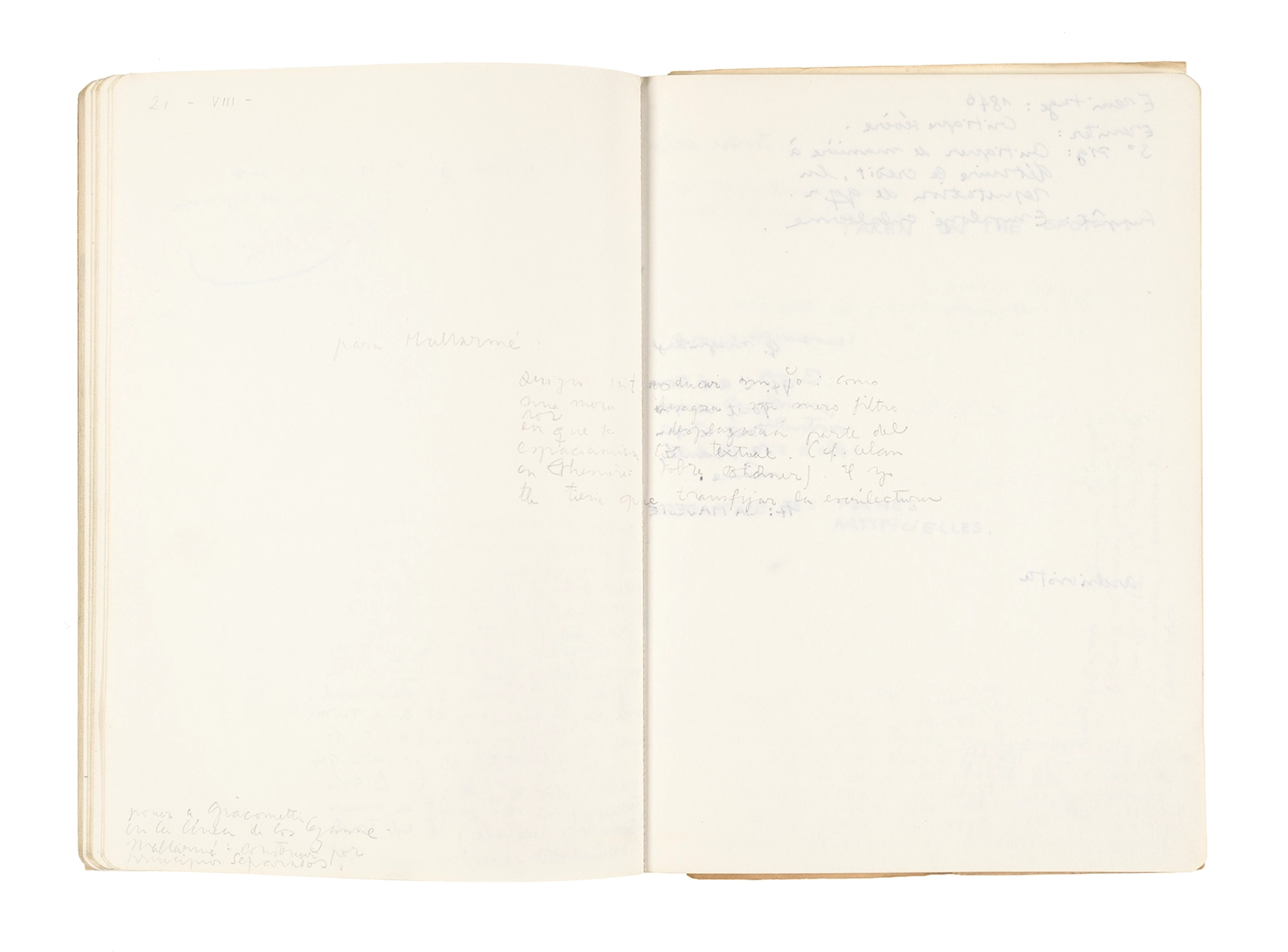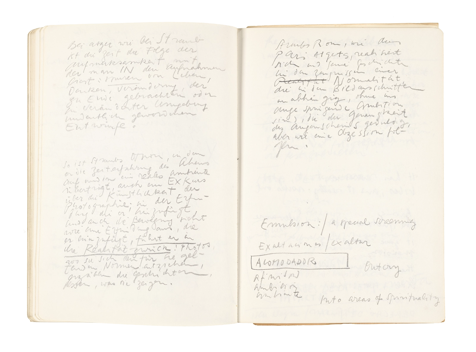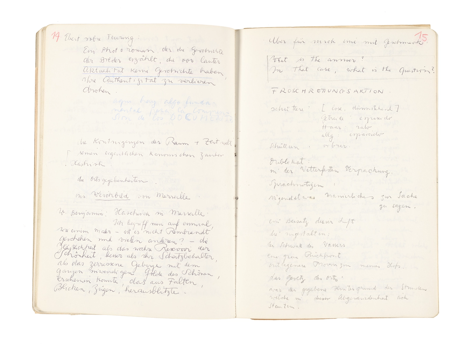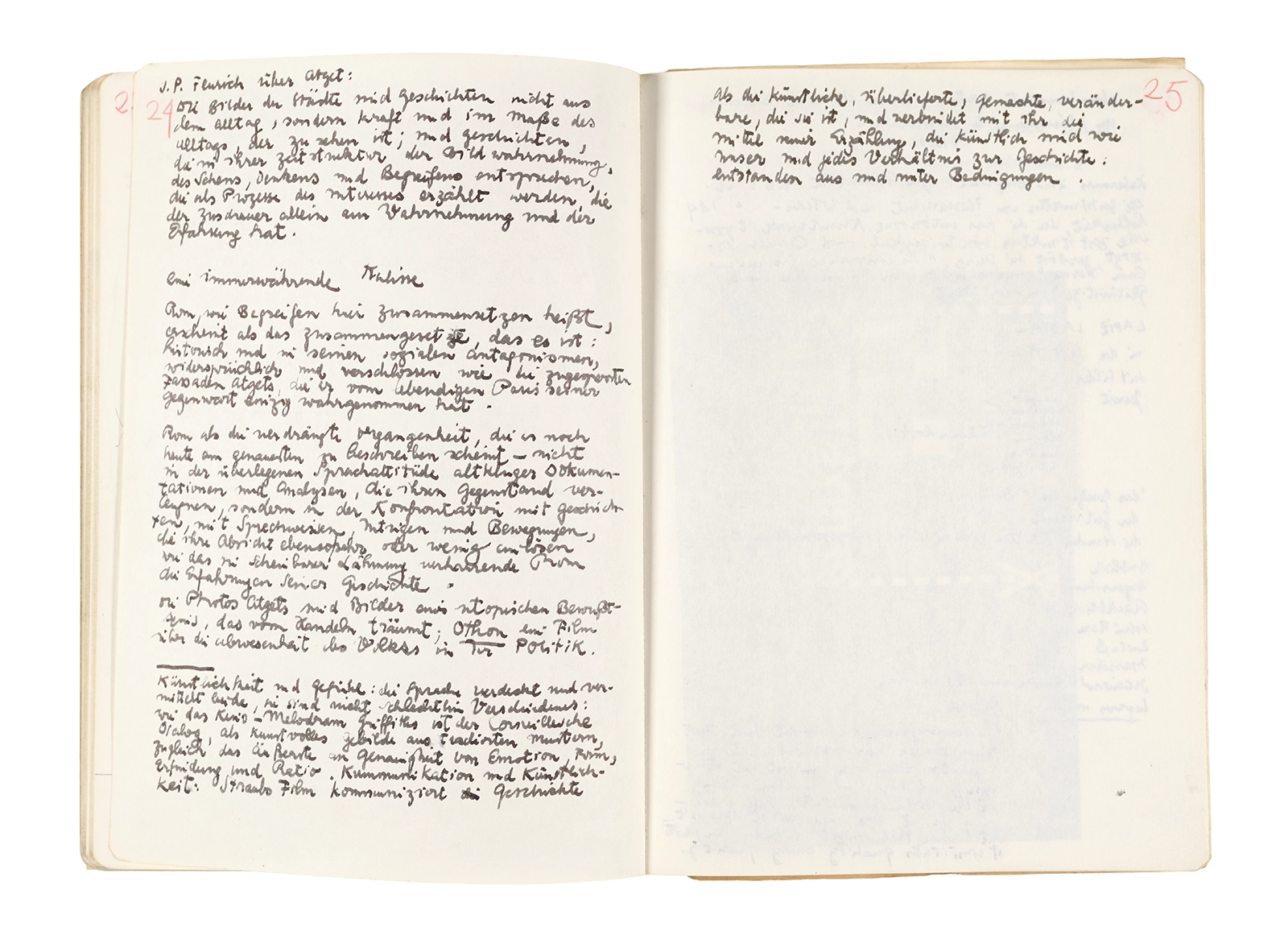 Este cuaderno contiene apuntes diversos, algunos de ellos vinculados a los seminarios “Una hermeneutica teórica y práctica de los escritos de Antonin Artaud” y “Escr:i:magen: Una sistematización de los ensayos teóricos de Stéphane Mallarmé”, dictado por Ronald Kay durante los años 1974 y 1975 en el Departamento de Estudios Humanísticos de la Universidad de Chile. Aquí se incluyen, además, notas sobre fotografía, sobre el concepto de “ready-made” y sobre los happenings de Wolf Vostell, así como también menciones a Paul Valéry, Ronald Kitaj, Roland Barthes, Martin Heidegger, Walter Benjamin, Maurice Merleau-Ponty, André Bazin, Marx Ernst, Wallace Stevens y E. E. Cummings, entre otros. Asimismo, este cuaderno contiene notas referentes a la revista “Manuscritos”.