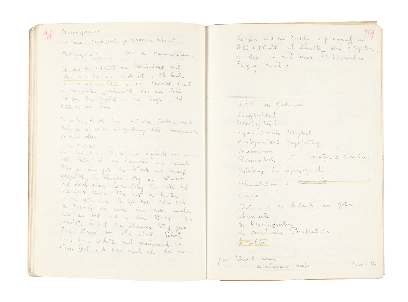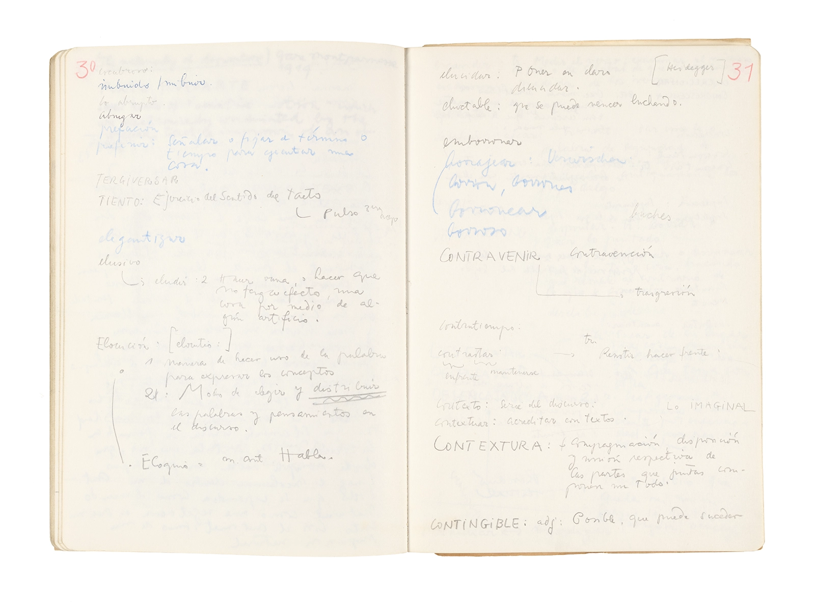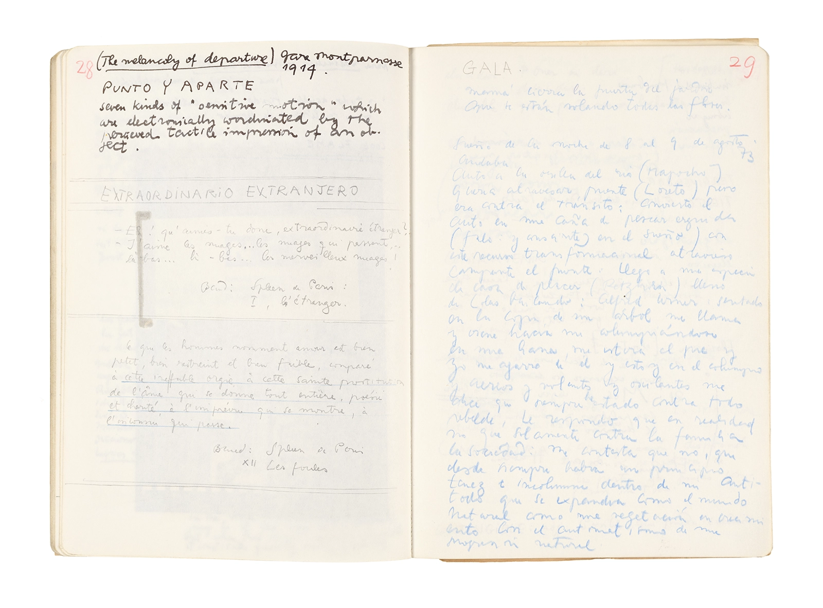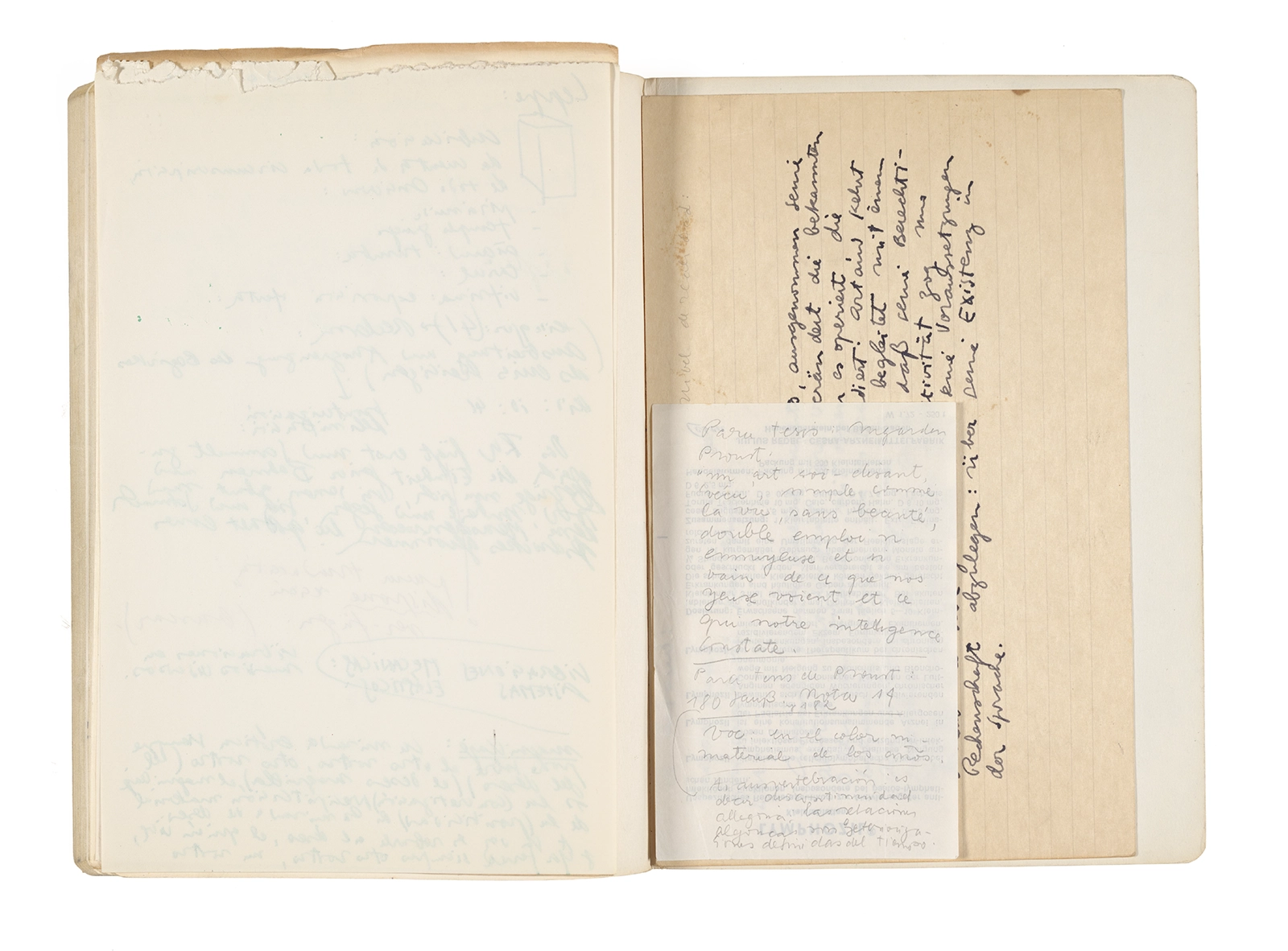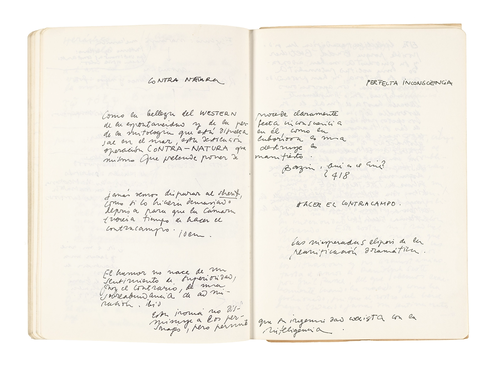 Este cuaderno contiene apuntes diversos, algunos de ellos vinculados a los seminarios “Una hermeneutica teórica y práctica de los escritos de Antonin Artaud” y “Escr:i:magen: Una sistematización de los ensayos teóricos de Stéphane Mallarmé”, dictado por Ronald Kay durante los años 1974 y 1975 en el Departamento de Estudios Humanísticos de la Universidad de Chile. Aquí se incluyen, además, notas sobre fotografía, sobre el concepto de “ready-made” y sobre los happenings de Wolf Vostell, así como también menciones a Paul Valéry, Ronald Kitaj, Roland Barthes, Martin Heidegger, Walter Benjamin, Maurice Merleau-Ponty, André Bazin, Marx Ernst, Wallace Stevens y E. E. Cummings, entre otros. Asimismo, este cuaderno contiene notas referentes a la revista “Manuscritos”.