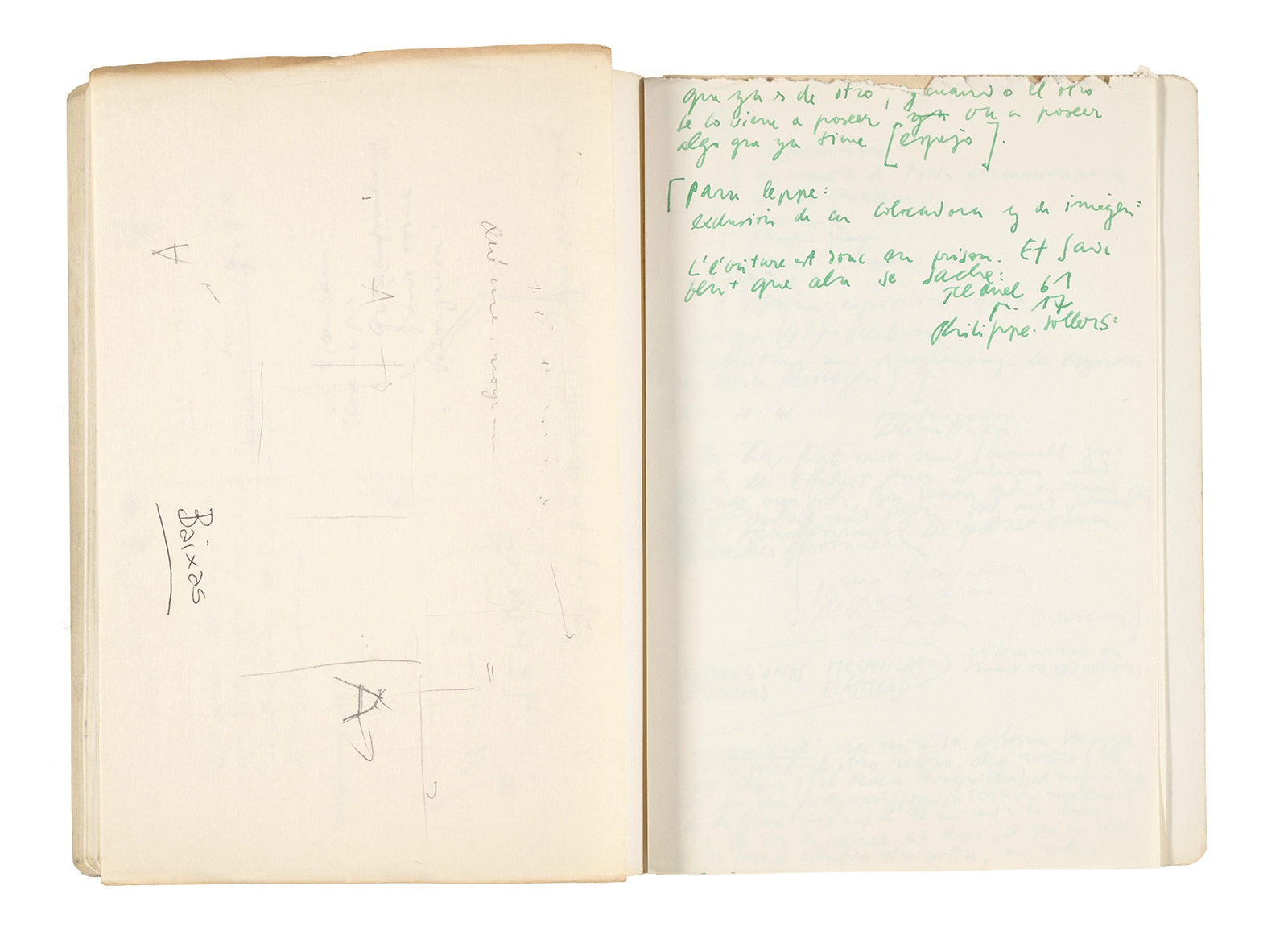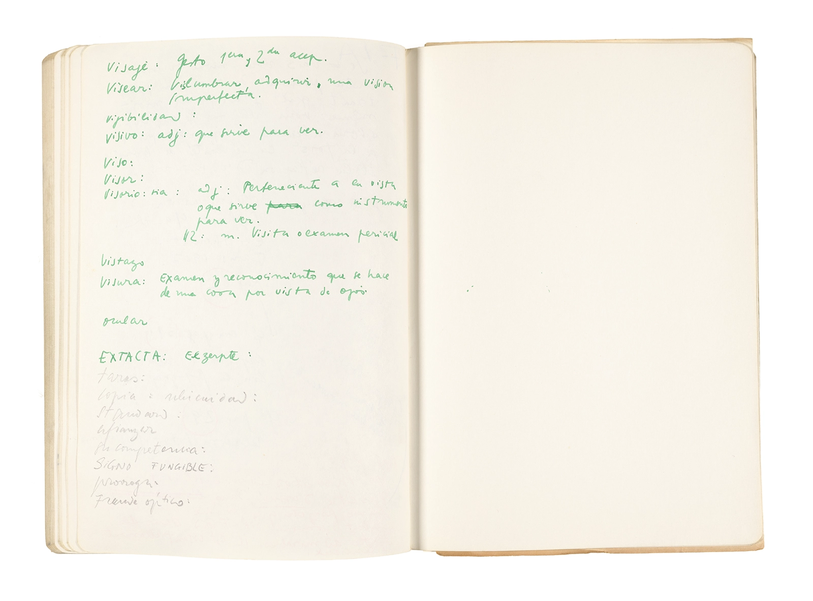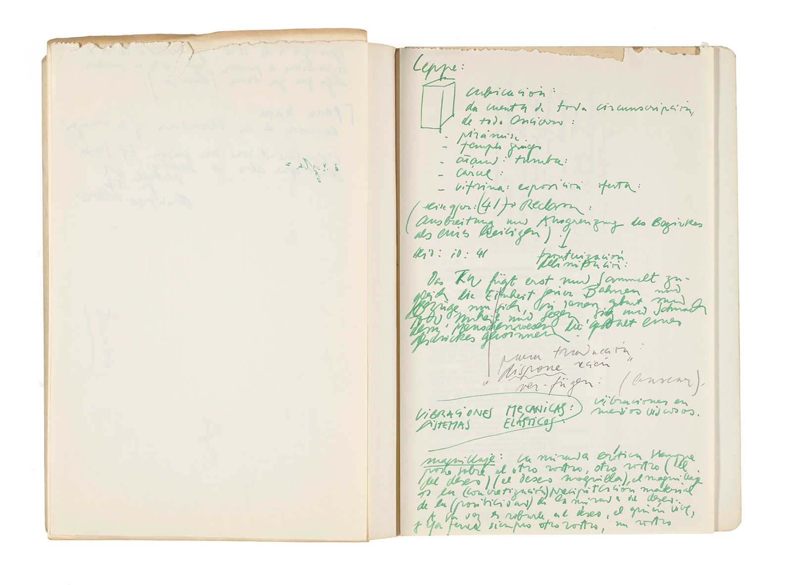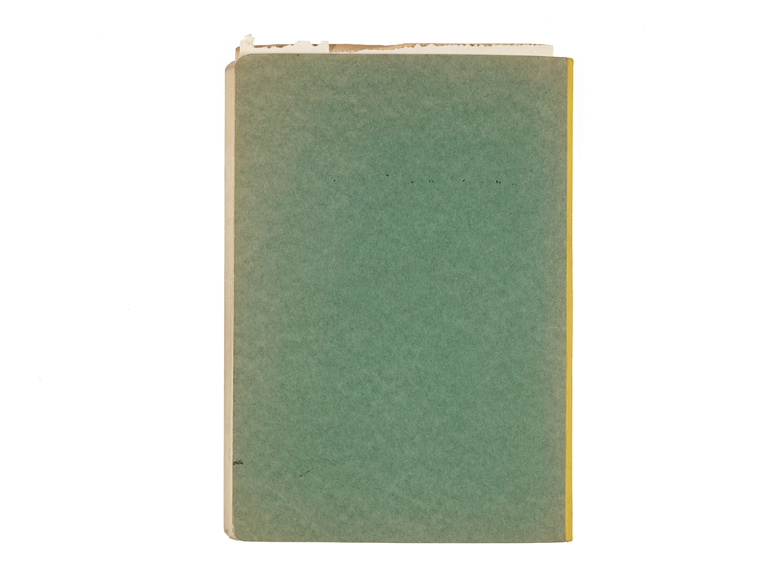 Cuaderno con tapa de cartón, encuadernación rústica cosida y lomo de tela, verde agua, lomo amarillo, apuntes manuscritos en tinta y grafito.