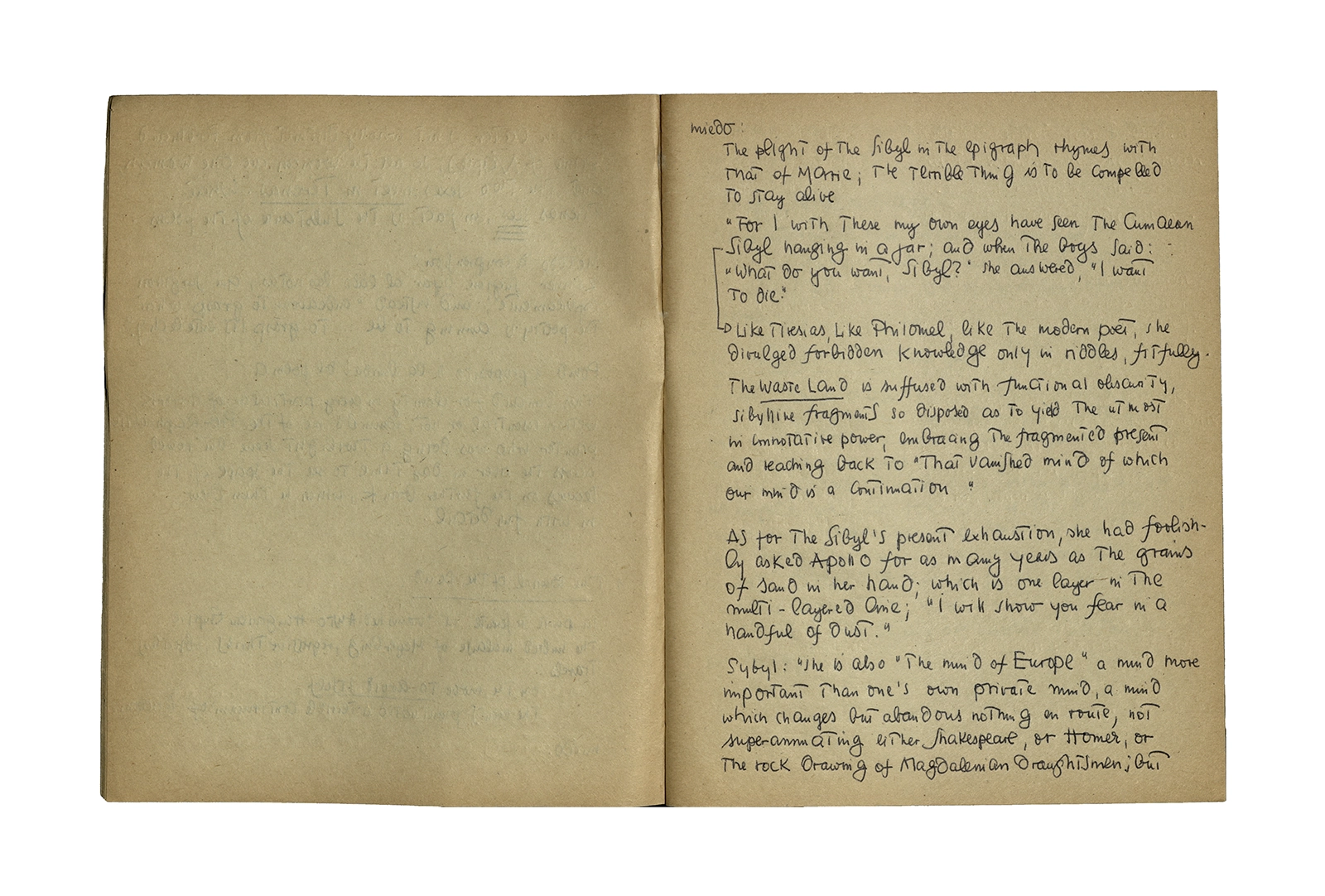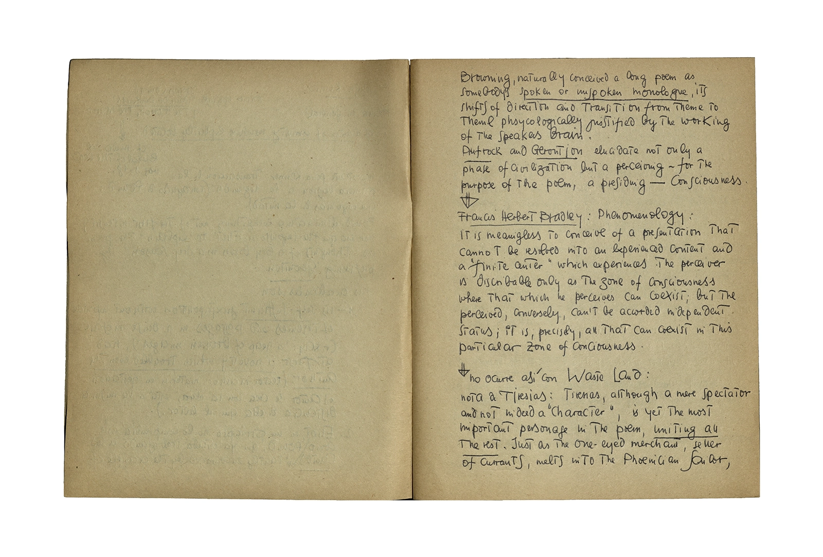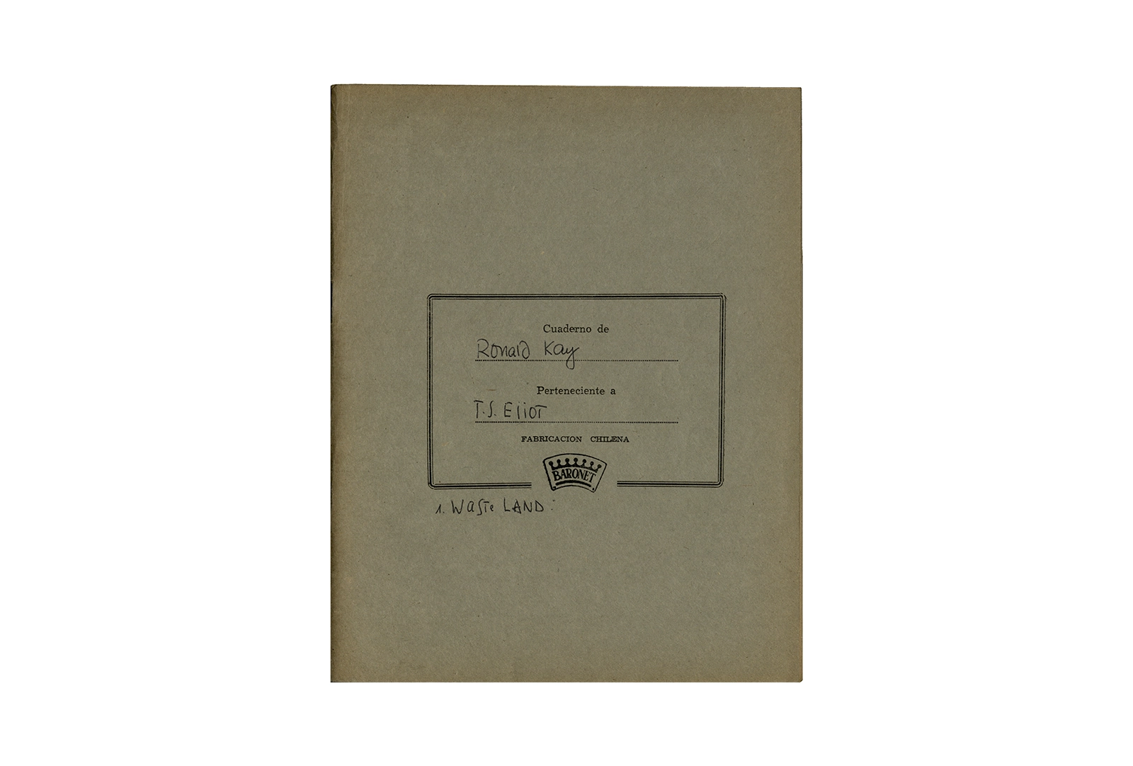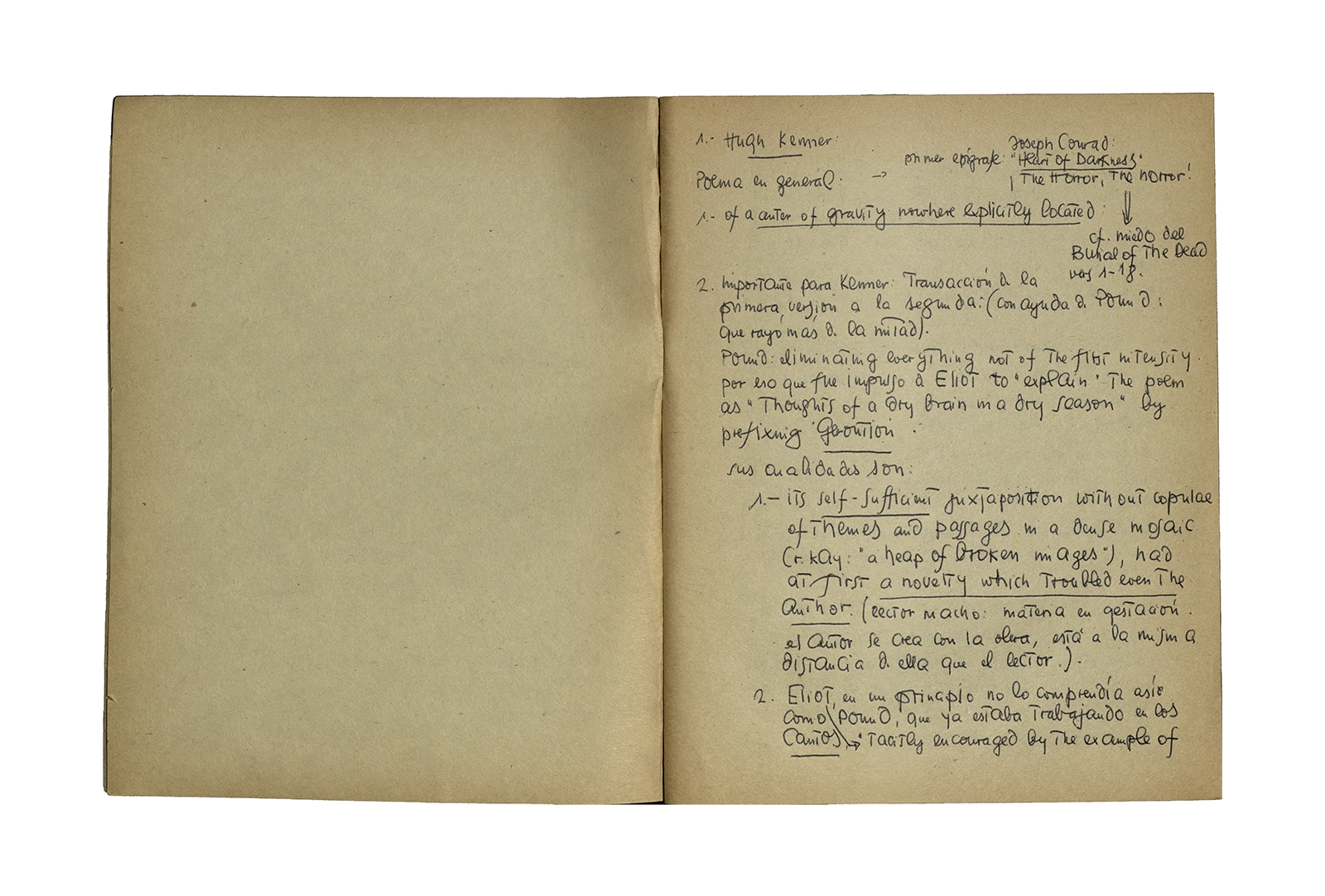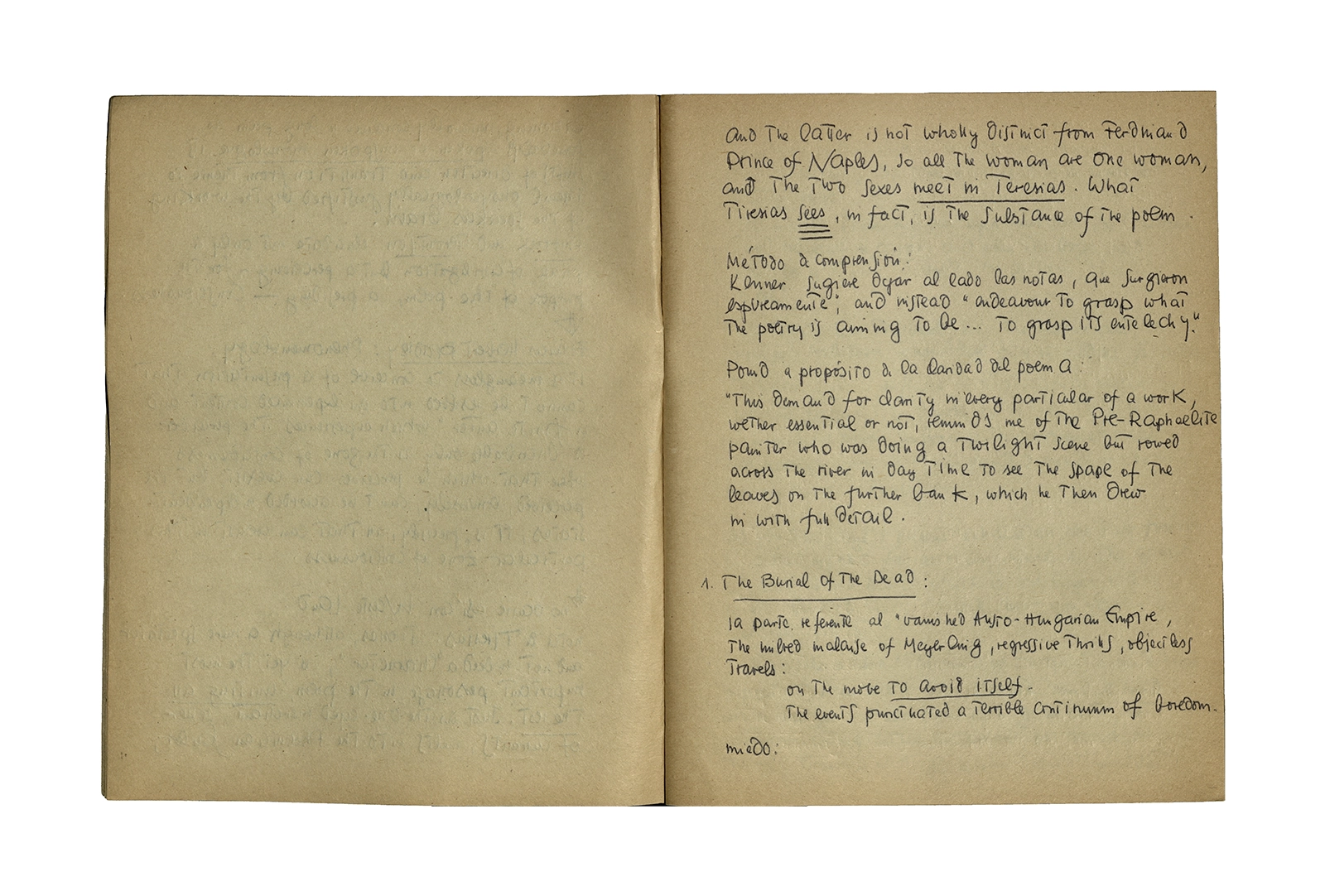 Cuaderno que contiene parte de la traducción del poema de Thomas Stearns Eliot “Waste Land”, y apuntes sobre estudios de otros autores en el tema. Principalmente se centra en la primera parte del poema con “The burial of the death”.