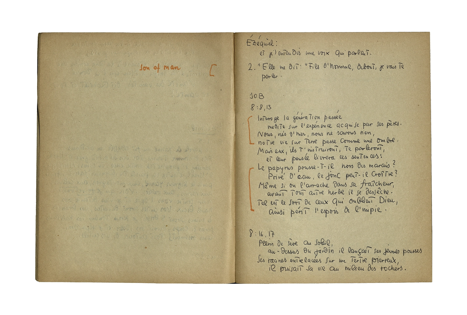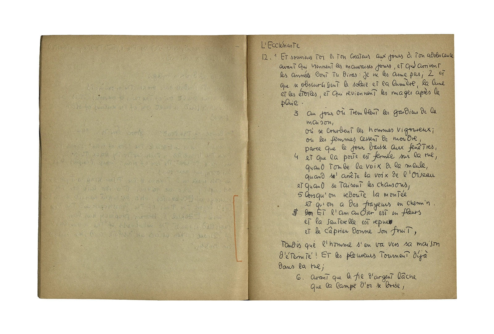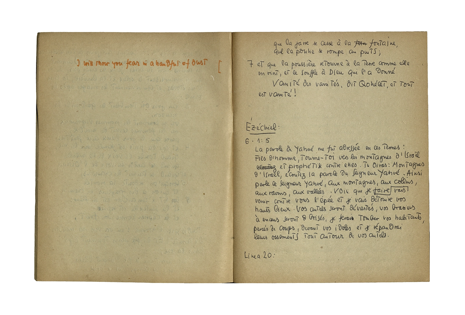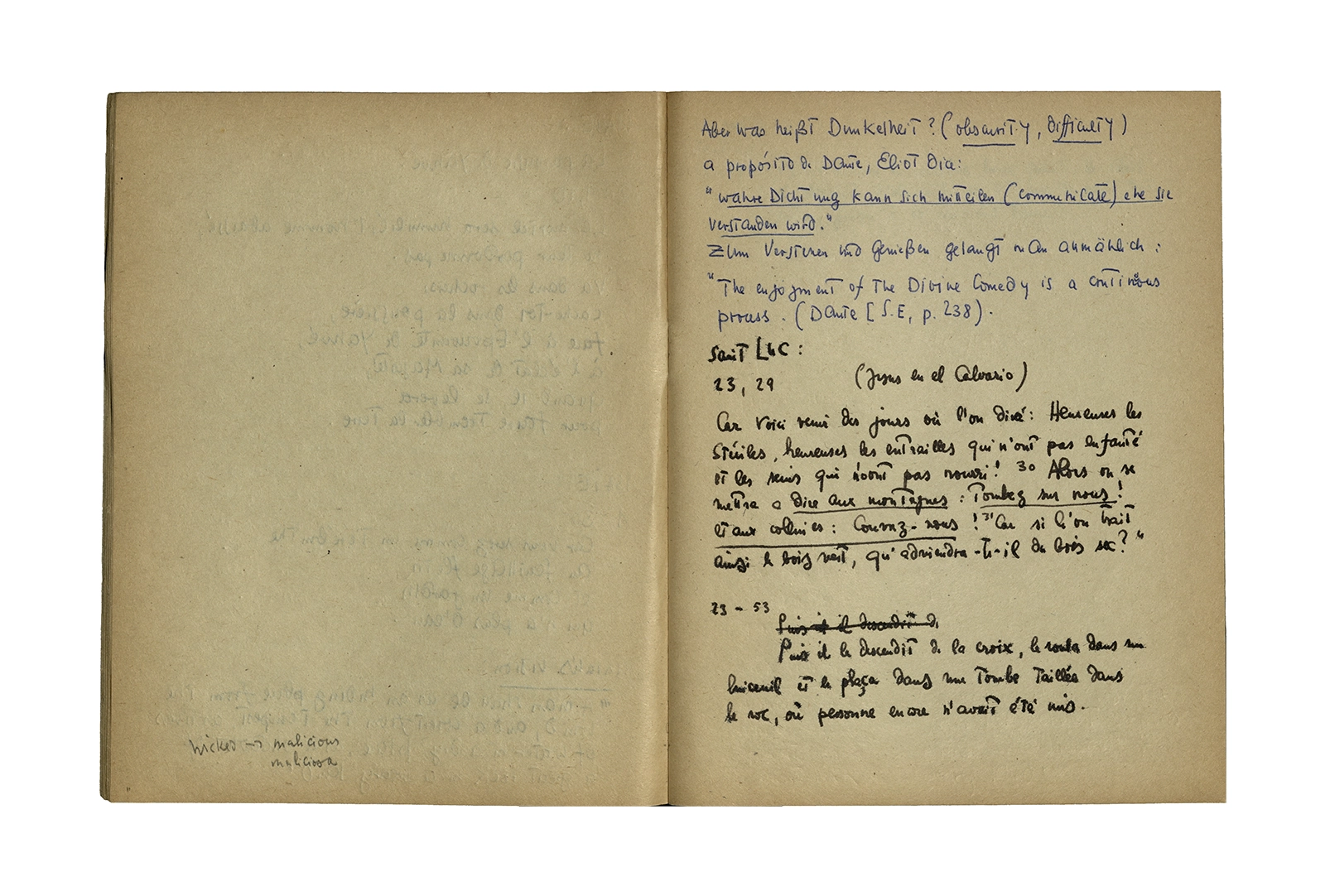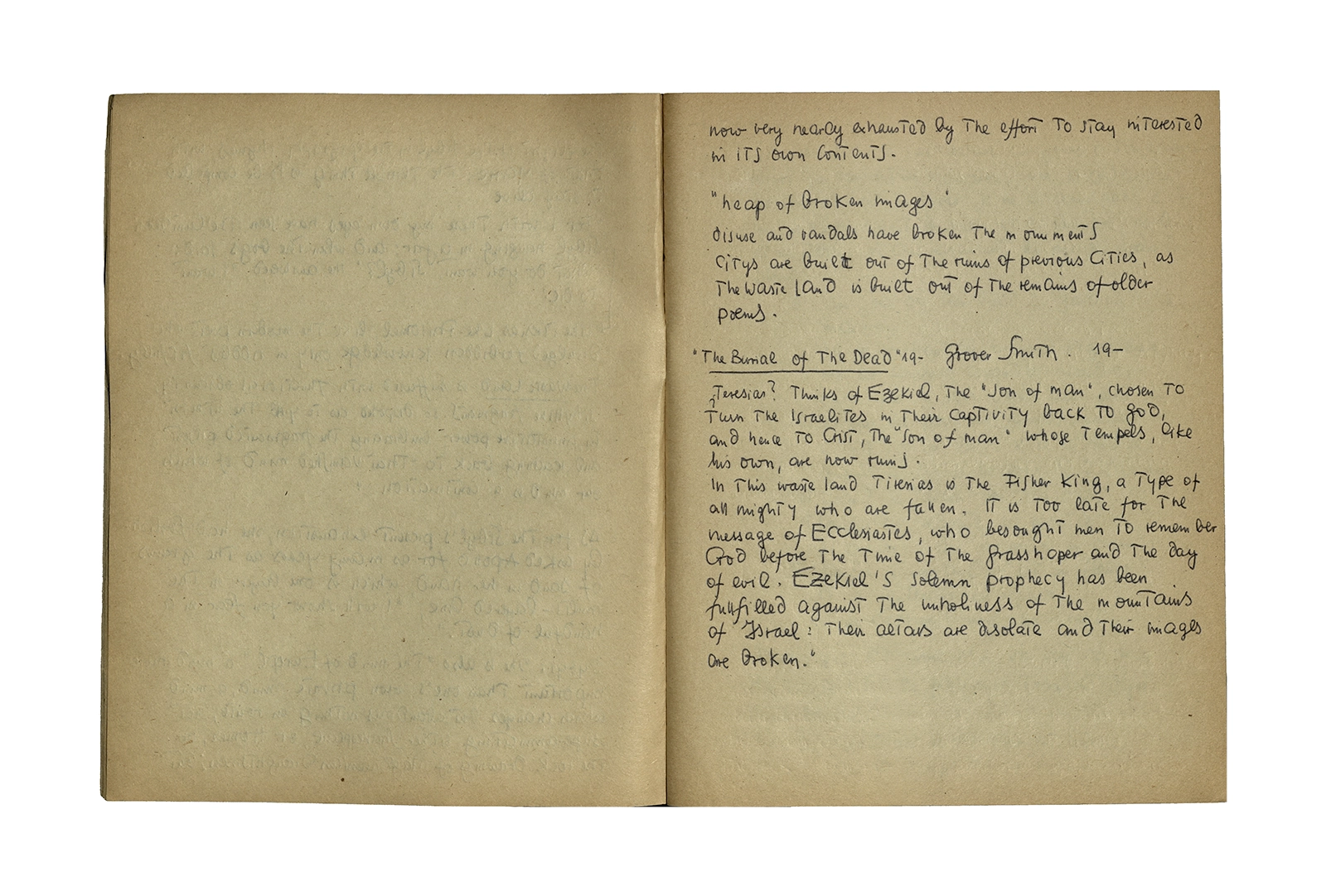 Cuaderno que contiene parte de la traducción del poema de Thomas Stearns Eliot “Waste Land”, y apuntes sobre estudios de otros autores en el tema. Principalmente se centra en la primera parte del poema con “The burial of the death”.