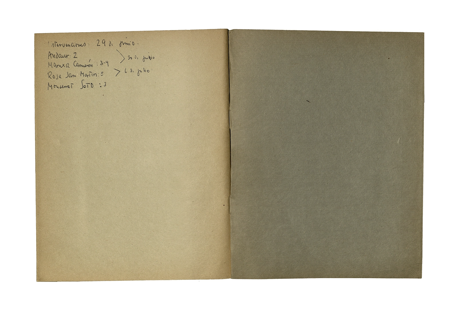 Cuaderno de papel con hojas de roneo, unido al lomo por clips metálicos, tapa blanda. Hojas manuscritas con tinta negra, lápiz pasta y scripto.