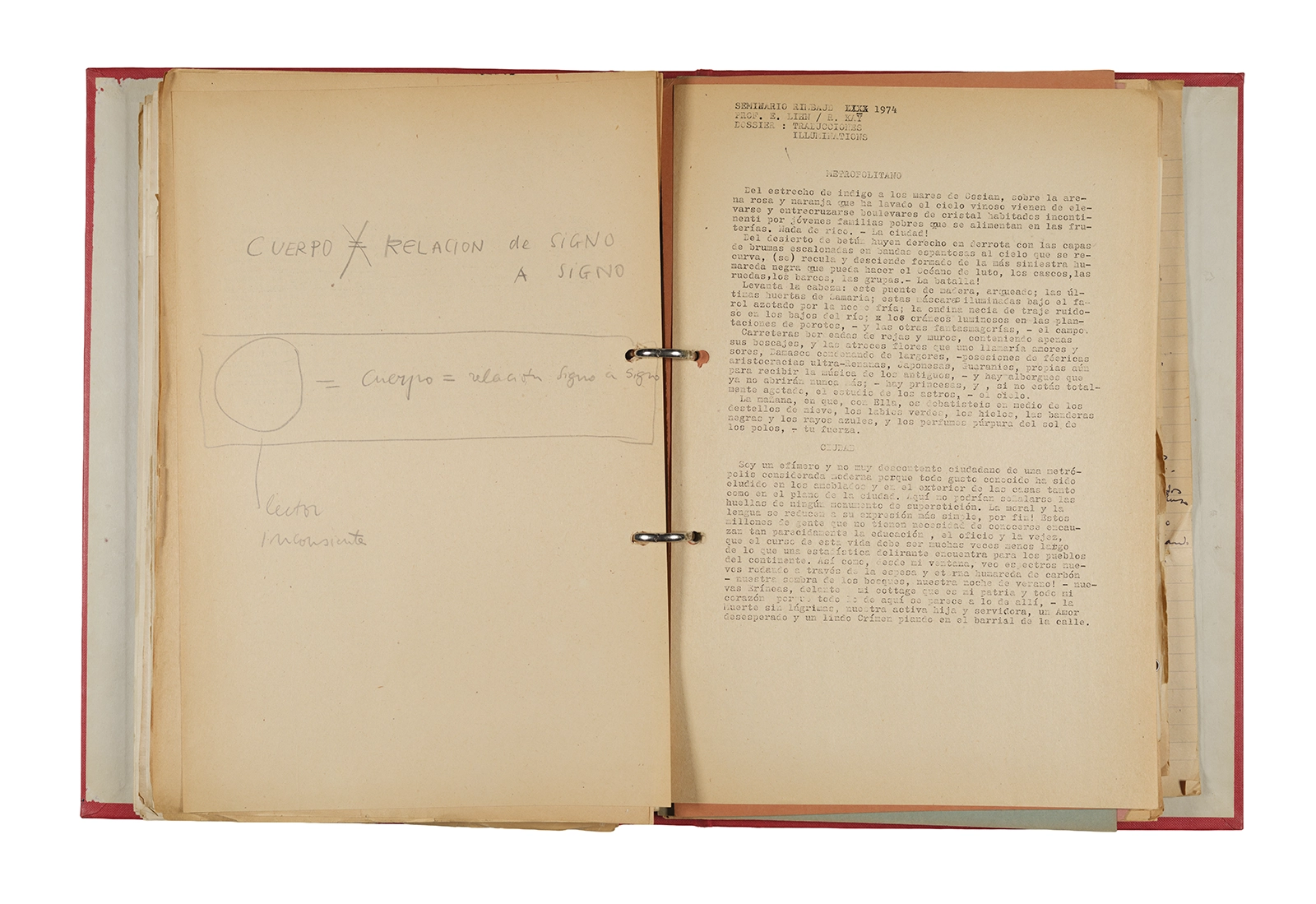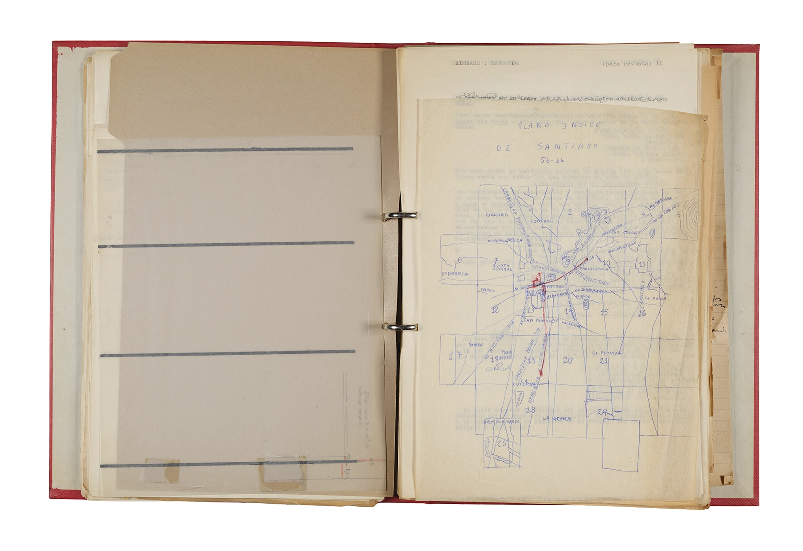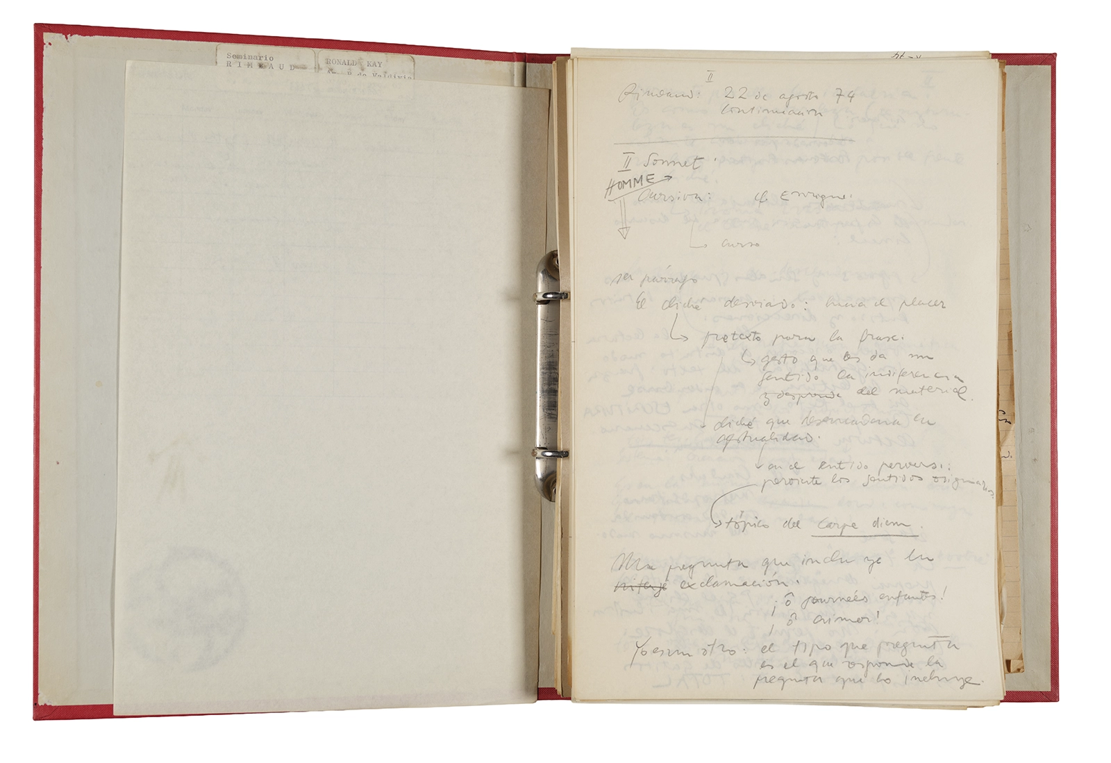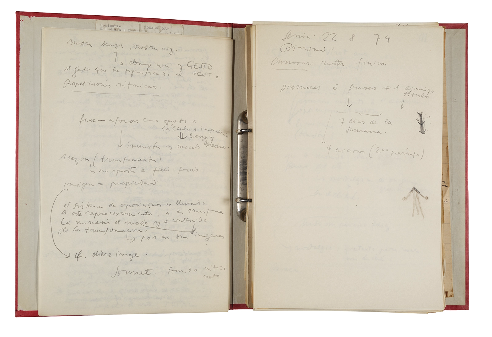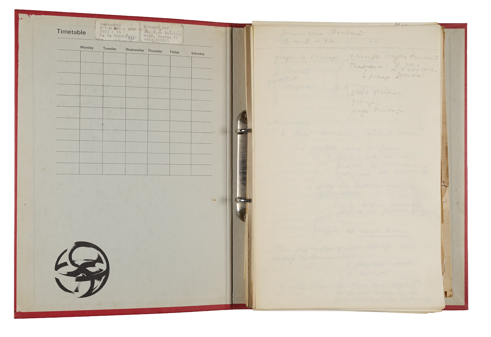 Esta carpeta reúne distintos materiales vinculados al seminario colectivo sobre la poesía de Arthur Rimbaud dictados por Ronald Kay y Enrique Lihn entre 1973 y 1974 en el Departamento de Estudios Humanísticos de la Universidad de Chile. Contiene un análisis mecanografiado del poema “Devoción” de Rimbaud, un dossier preparado para las sesiones del Seminario realizadas durante 1974 con la traducción de veinte textos de “Iluminaciones”, con correcciones y comentarios, así como una selección más breve de traducciones rotuladas “Manuscritos ya publicados por el Departamento de Estudios Humanísticos”. Se incluye aquí también el dibujo de un plano de Santiago, distintos trabajo realizados en el marco del Seminario —entre ellos, el texto “Texto y ‘Realidad'” de Patricio Marchant—, y listas de asistencia de las sesiones realizadas durante noviembre de 1973. Por último, esta carpeta contiene también una serie de diagramas y viñetas con planificaciones de posibles acciones en el espacio público. Estos últimos documentos, fechados en octubre de 1974, incluyen los nombres de los siguientes participantes del seminario Signometraje, también dictado por Kay en el DEH: Juan Balbontín, Diamela Eltit, Catalina Parra y Raúl Zurita.