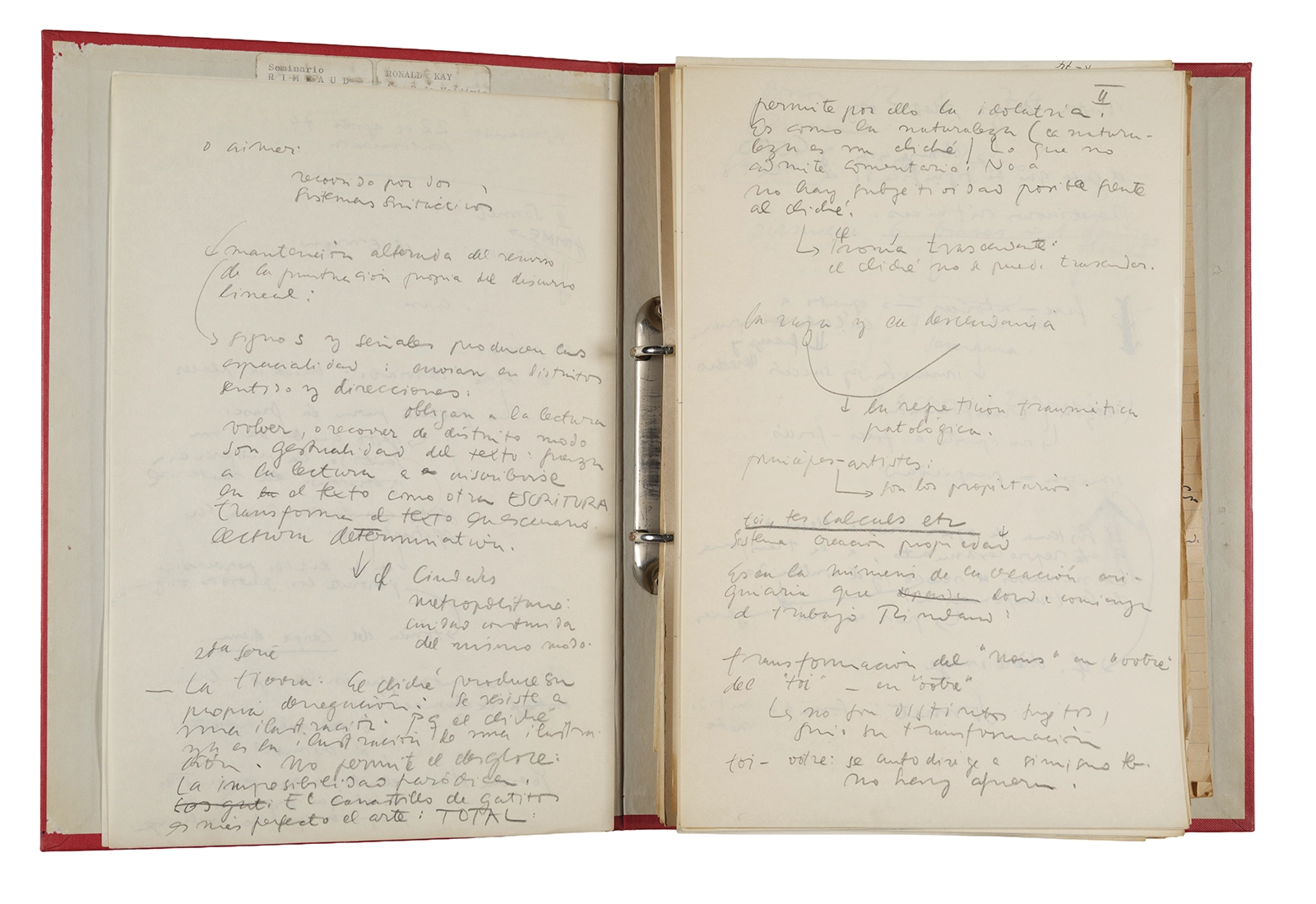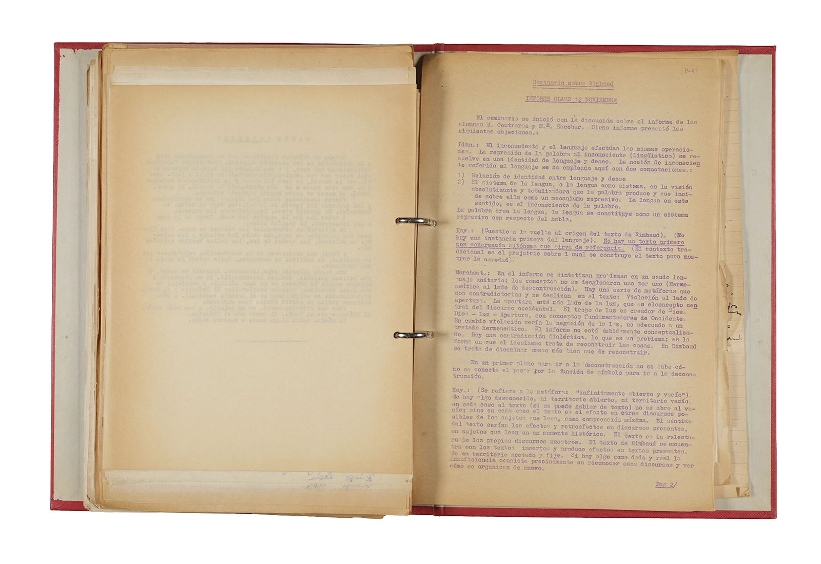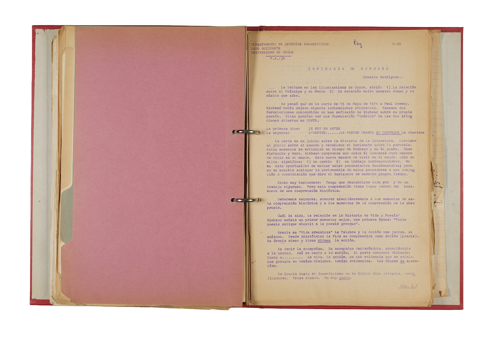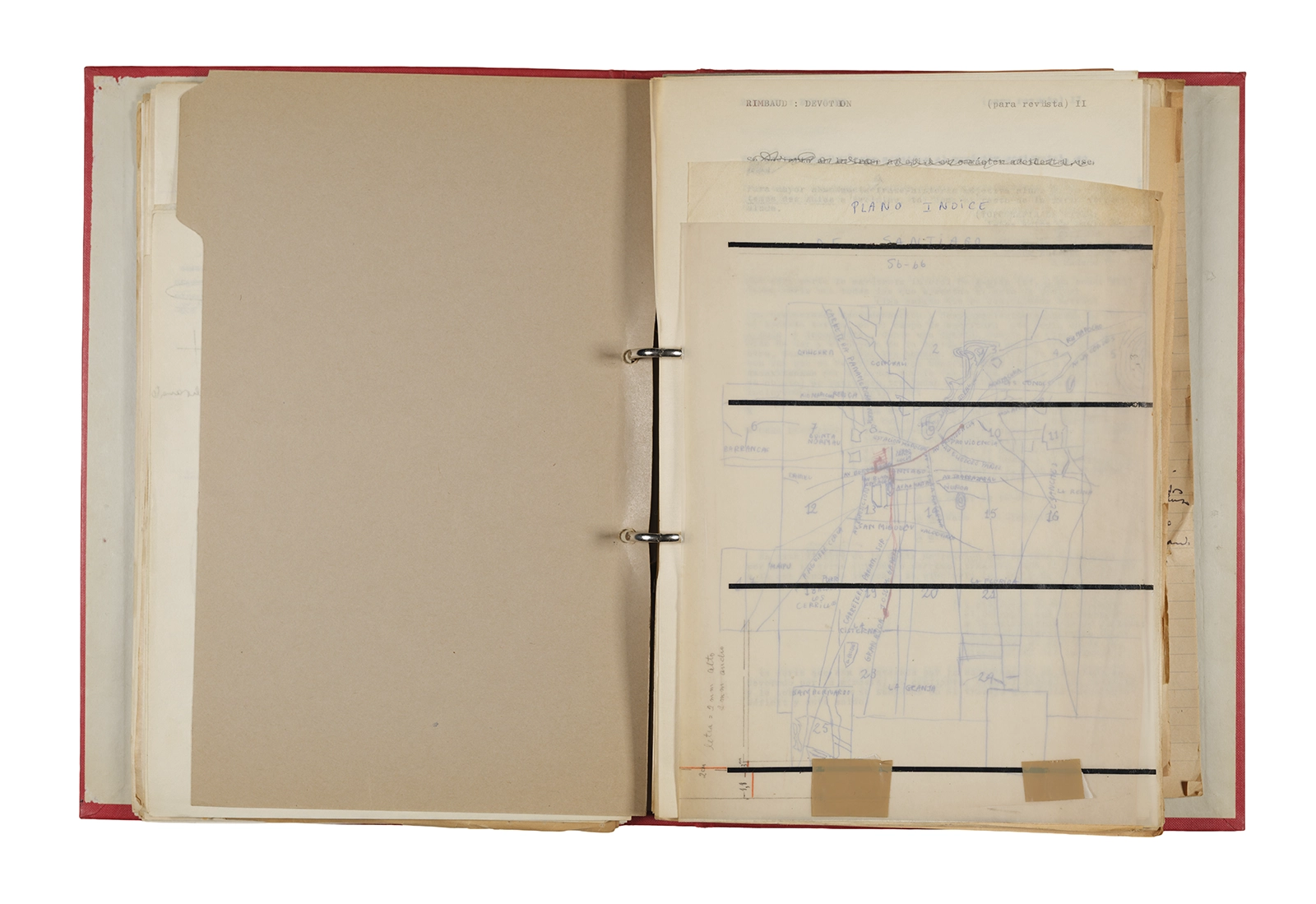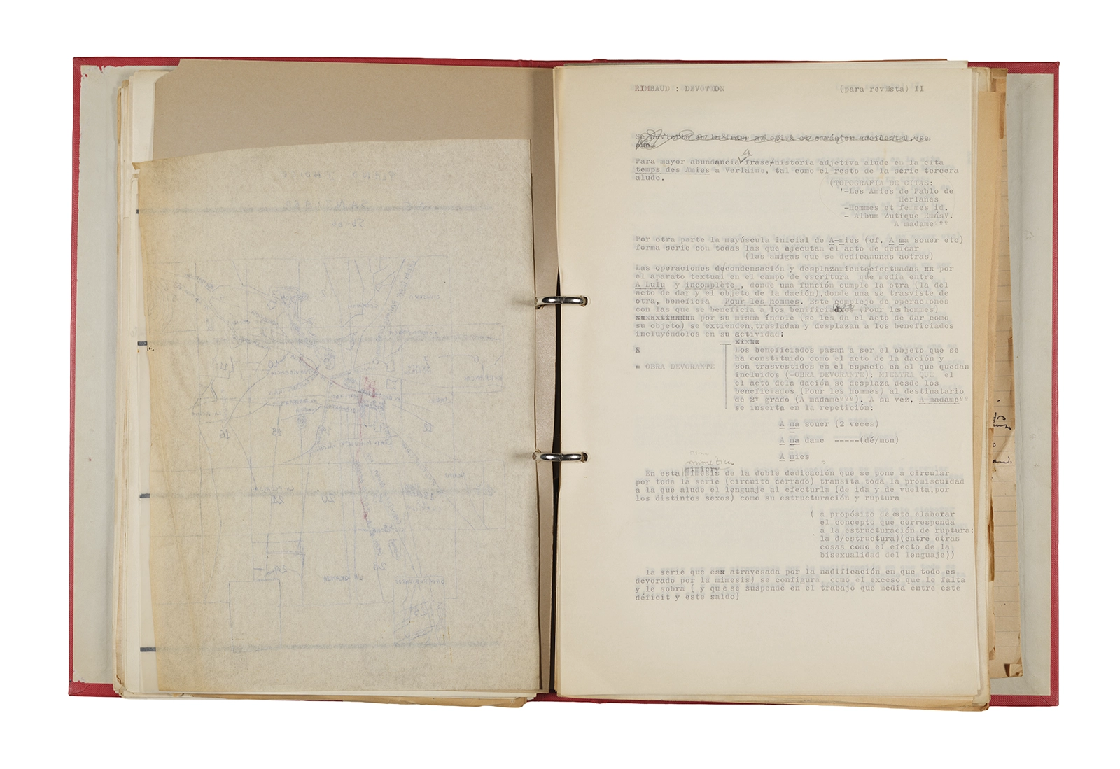Esta carpeta reúne distintos materiales vinculados al seminario colectivo sobre la poesía de Arthur Rimbaud dictados por Ronald Kay y Enrique Lihn entre 1973 y 1974 en el Departamento de Estudios Humanísticos de la Universidad de Chile. Contiene un análisis mecanografiado del poema “Devoción” de Rimbaud, un dossier preparado para las sesiones del Seminario realizadas durante 1974 con la traducción de veinte textos de “Iluminaciones”, con correcciones y comentarios, así como una selección más breve de traducciones rotuladas “Manuscritos ya publicados por el Departamento de Estudios Humanísticos”. Se incluye aquí también el dibujo de un plano de Santiago, distintos trabajo realizados en el marco del Seminario —entre ellos, el texto “Texto y ‘Realidad'” de Patricio Marchant—, y listas de asistencia de las sesiones realizadas durante noviembre de 1973. Por último, esta carpeta contiene también una serie de diagramas y viñetas con planificaciones de posibles acciones en el espacio público. Estos últimos documentos, fechados en octubre de 1974, incluyen los nombres de los siguientes participantes del seminario Signometraje, también dictado por Kay en el DEH: Juan Balbontín, Diamela Eltit, Catalina Parra y Raúl Zurita.