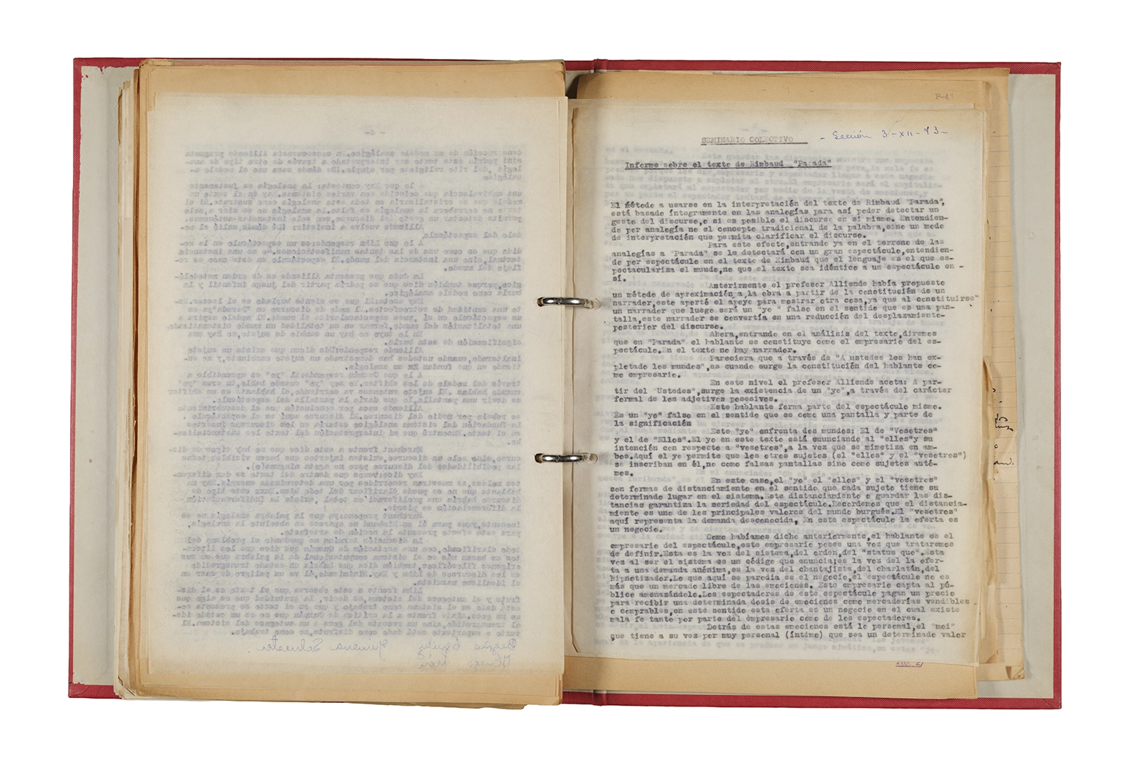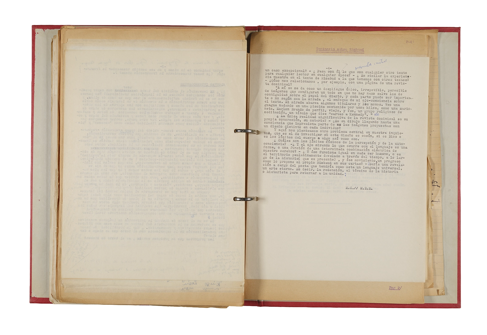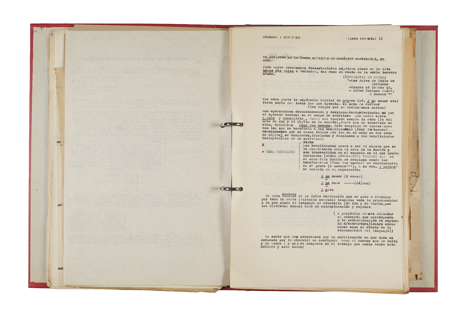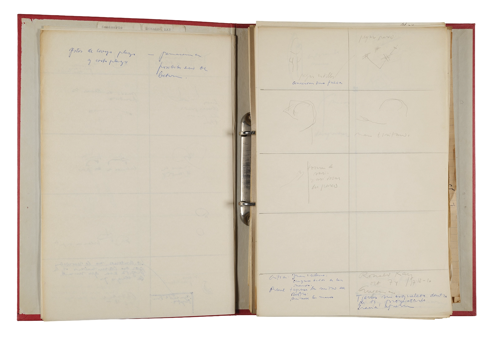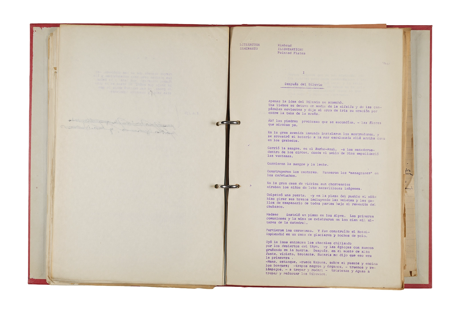 Esta carpeta reúne distintos materiales vinculados al seminario colectivo sobre la poesía de Arthur Rimbaud dictados por Ronald Kay y Enrique Lihn entre 1973 y 1974 en el Departamento de Estudios Humanísticos de la Universidad de Chile. Contiene un análisis mecanografiado del poema “Devoción” de Rimbaud, un dossier preparado para las sesiones del Seminario realizadas durante 1974 con la traducción de veinte textos de “Iluminaciones”, con correcciones y comentarios, así como una selección más breve de traducciones rotuladas “Manuscritos ya publicados por el Departamento de Estudios Humanísticos”. Se incluye aquí también el dibujo de un plano de Santiago, distintos trabajo realizados en el marco del Seminario —entre ellos, el texto “Texto y ‘Realidad'” de Patricio Marchant—, y listas de asistencia de las sesiones realizadas durante noviembre de 1973. Por último, esta carpeta contiene también una serie de diagramas y viñetas con planificaciones de posibles acciones en el espacio público. Estos últimos documentos, fechados en octubre de 1974, incluyen los nombres de los siguientes participantes del seminario Signometraje, también dictado por Kay en el DEH: Juan Balbontín, Diamela Eltit, Catalina Parra y Raúl Zurita.