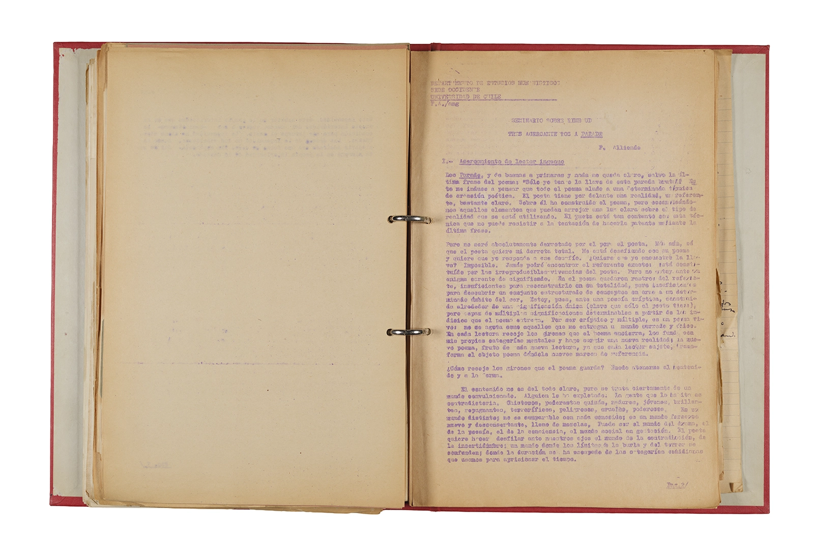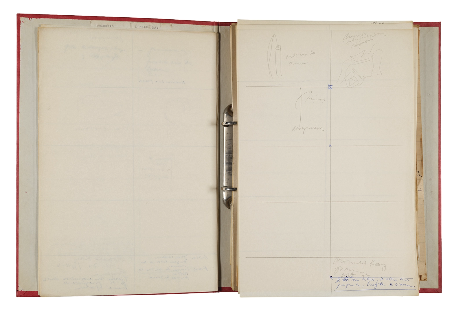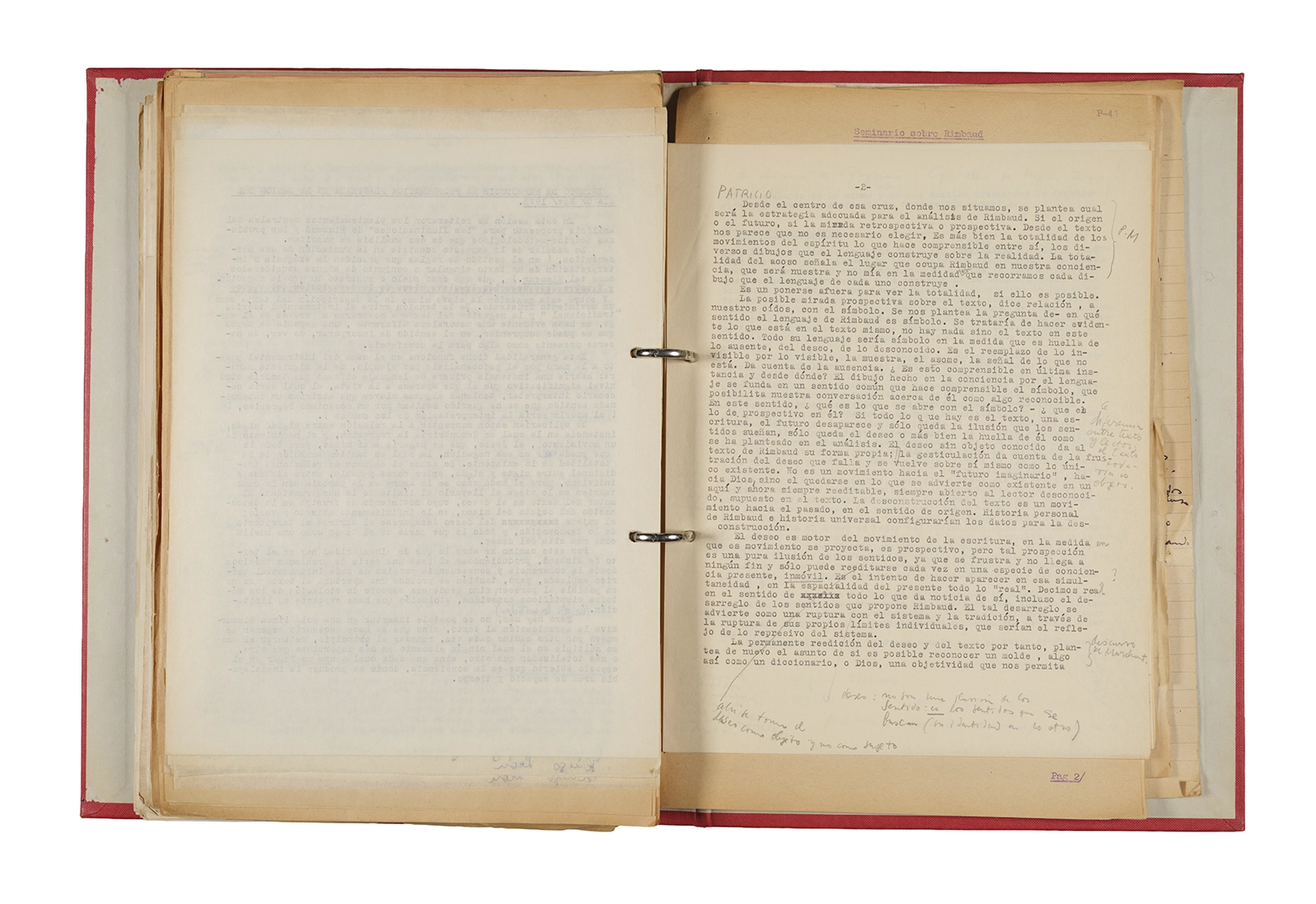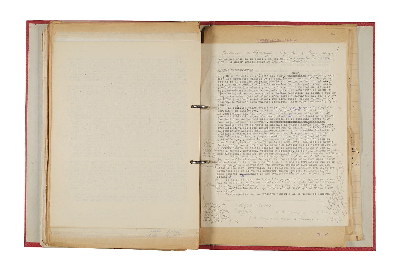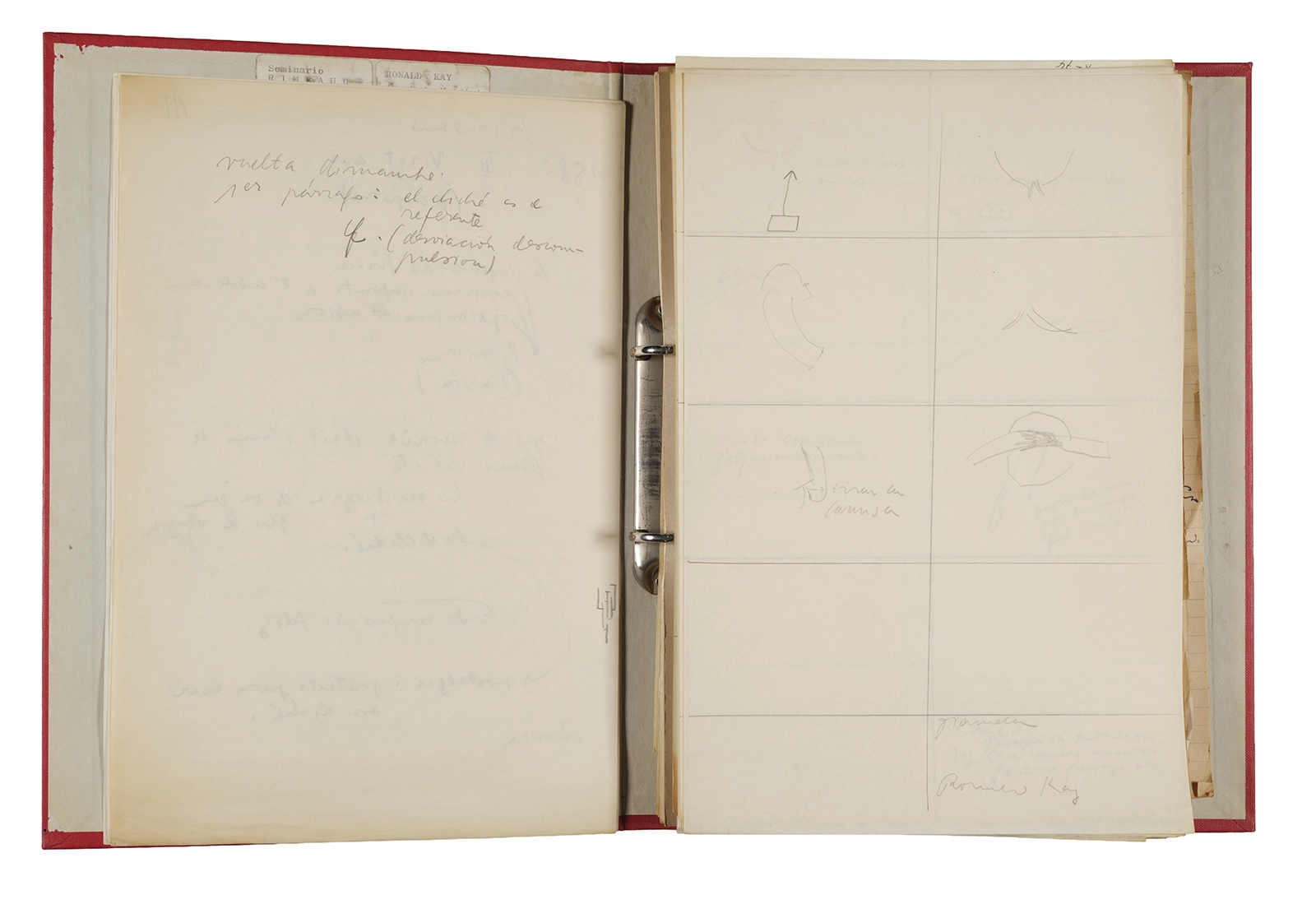 Esta carpeta reúne distintos materiales vinculados al seminario colectivo sobre la poesía de Arthur Rimbaud dictados por Ronald Kay y Enrique Lihn entre 1973 y 1974 en el Departamento de Estudios Humanísticos de la Universidad de Chile. Contiene un análisis mecanografiado del poema “Devoción” de Rimbaud, un dossier preparado para las sesiones del Seminario realizadas durante 1974 con la traducción de veinte textos de “Iluminaciones”, con correcciones y comentarios, así como una selección más breve de traducciones rotuladas “Manuscritos ya publicados por el Departamento de Estudios Humanísticos”. Se incluye aquí también el dibujo de un plano de Santiago, distintos trabajo realizados en el marco del Seminario —entre ellos, el texto “Texto y ‘Realidad'” de Patricio Marchant—, y listas de asistencia de las sesiones realizadas durante noviembre de 1973. Por último, esta carpeta contiene también una serie de diagramas y viñetas con planificaciones de posibles acciones en el espacio público. Estos últimos documentos, fechados en octubre de 1974, incluyen los nombres de los siguientes participantes del seminario Signometraje, también dictado por Kay en el DEH: Juan Balbontín, Diamela Eltit, Catalina Parra y Raúl Zurita.