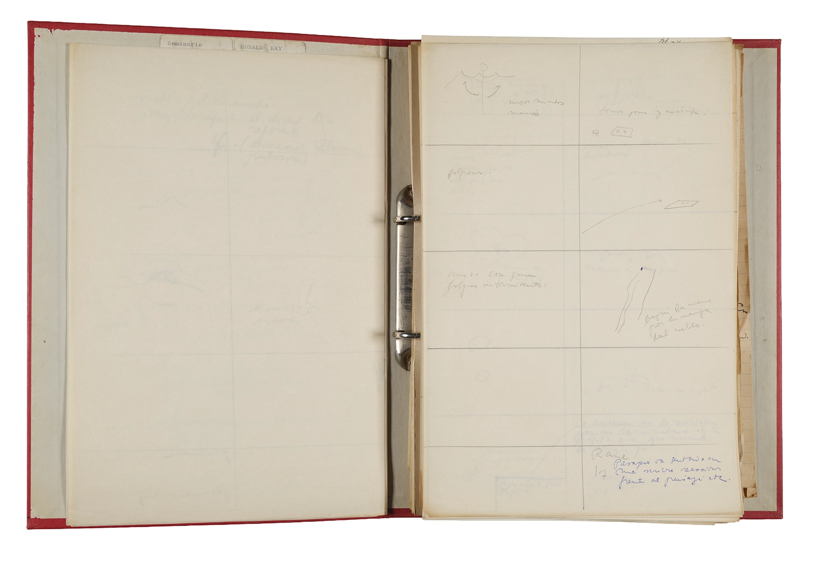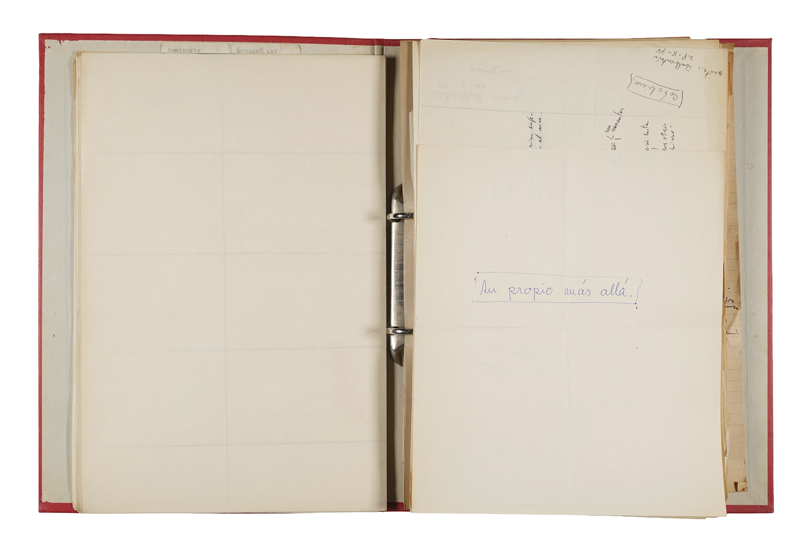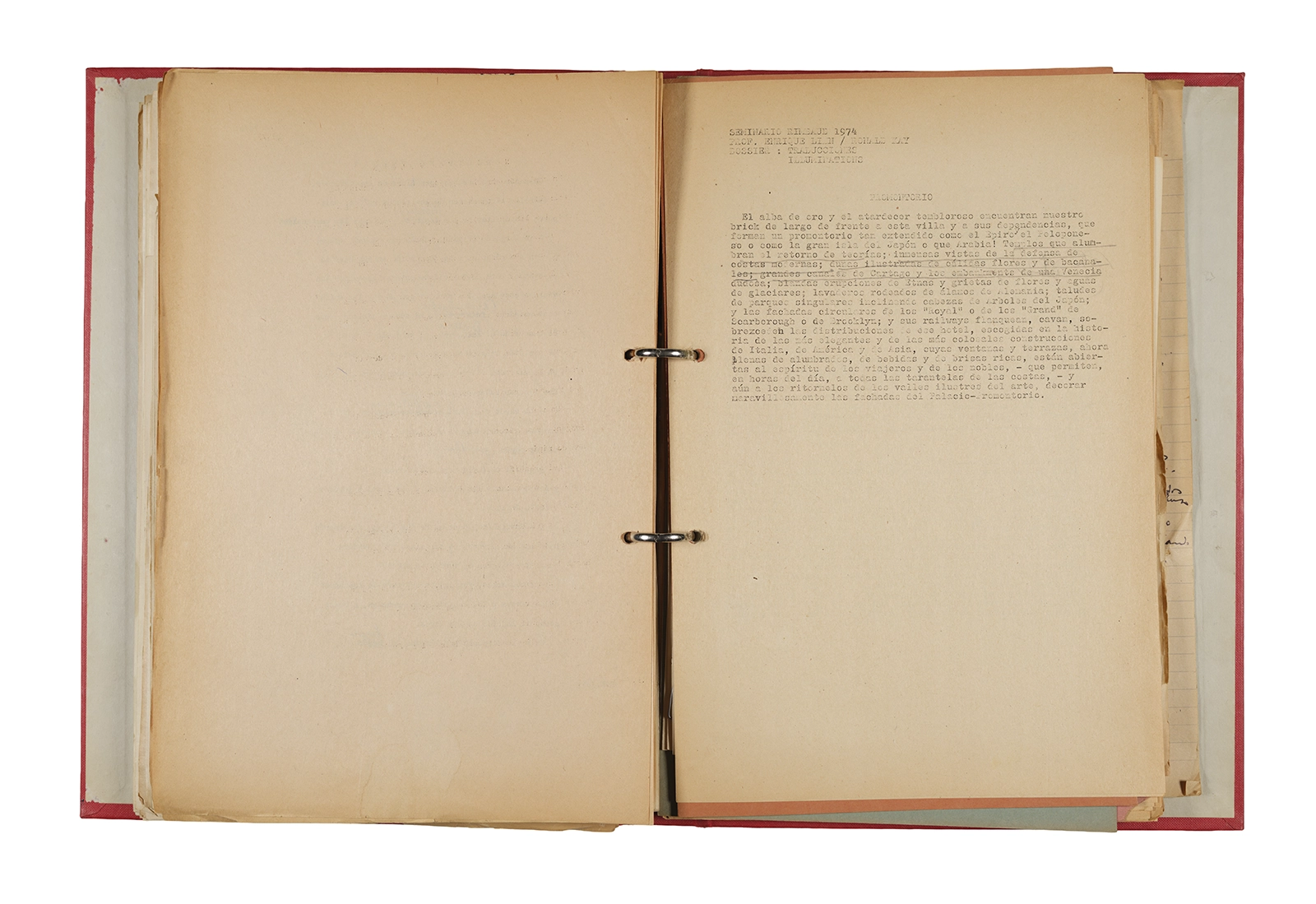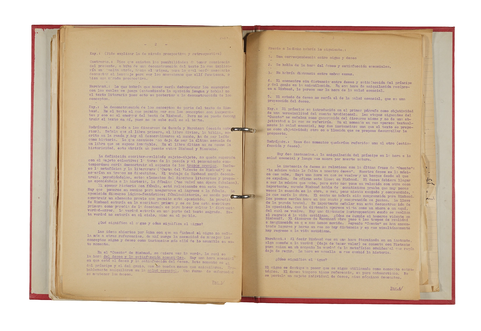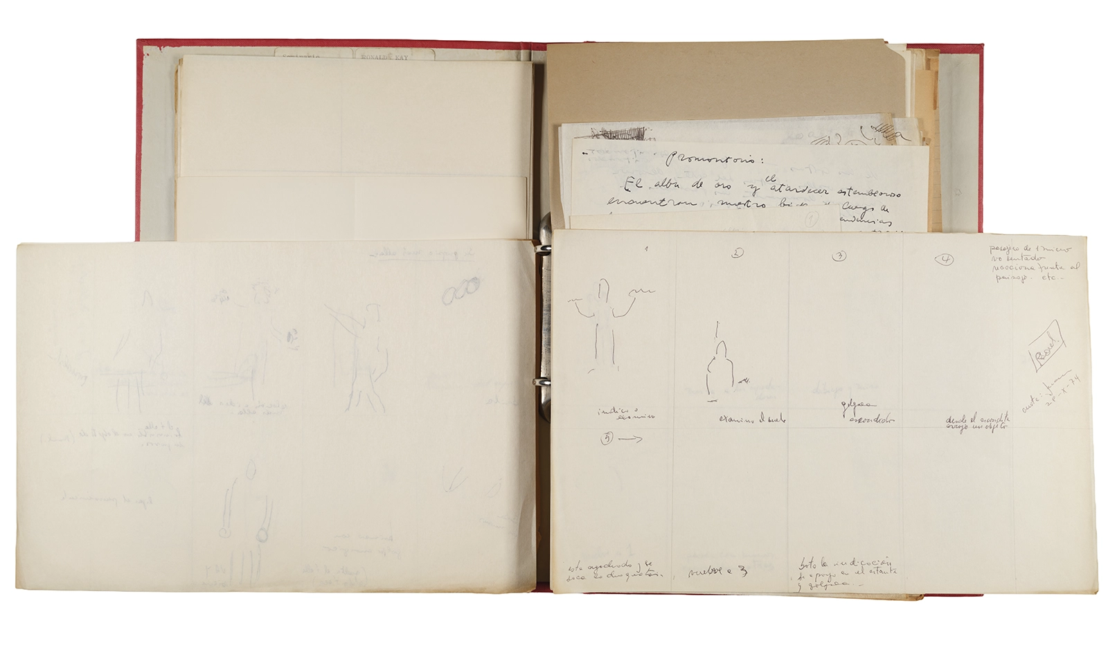 Esta carpeta reúne distintos materiales vinculados al seminario colectivo sobre la poesía de Arthur Rimbaud dictados por Ronald Kay y Enrique Lihn entre 1973 y 1974 en el Departamento de Estudios Humanísticos de la Universidad de Chile. Contiene un análisis mecanografiado del poema “Devoción” de Rimbaud, un dossier preparado para las sesiones del Seminario realizadas durante 1974 con la traducción de veinte textos de “Iluminaciones”, con correcciones y comentarios, así como una selección más breve de traducciones rotuladas “Manuscritos ya publicados por el Departamento de Estudios Humanísticos”. Se incluye aquí también el dibujo de un plano de Santiago, distintos trabajo realizados en el marco del Seminario —entre ellos, el texto “Texto y ‘Realidad'” de Patricio Marchant—, y listas de asistencia de las sesiones realizadas durante noviembre de 1973. Por último, esta carpeta contiene también una serie de diagramas y viñetas con planificaciones de posibles acciones en el espacio público. Estos últimos documentos, fechados en octubre de 1974, incluyen los nombres de los siguientes participantes del seminario Signometraje, también dictado por Kay en el DEH: Juan Balbontín, Diamela Eltit, Catalina Parra y Raúl Zurita.