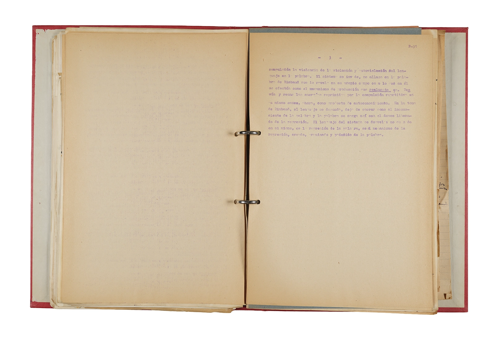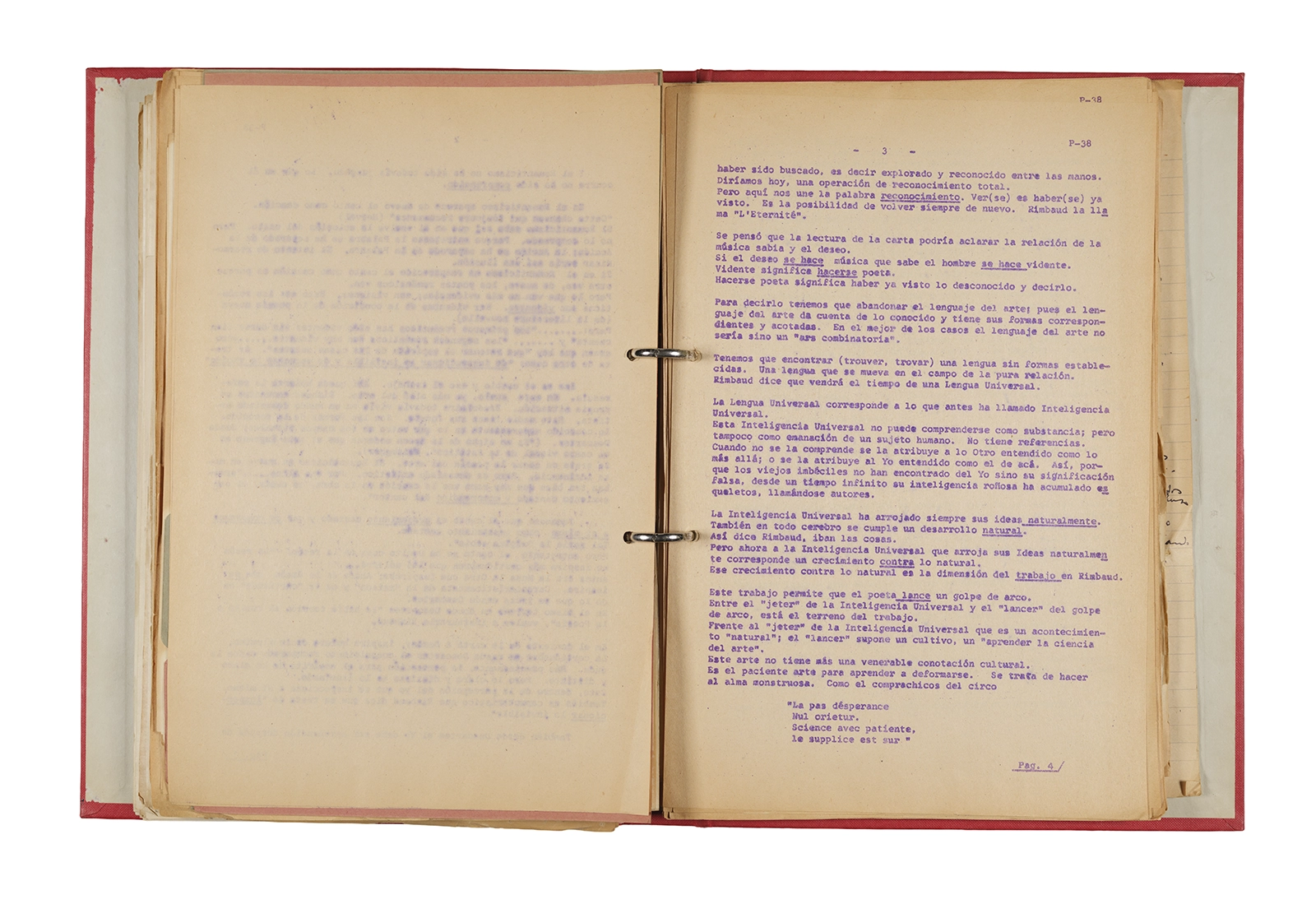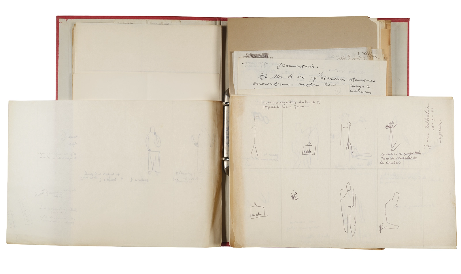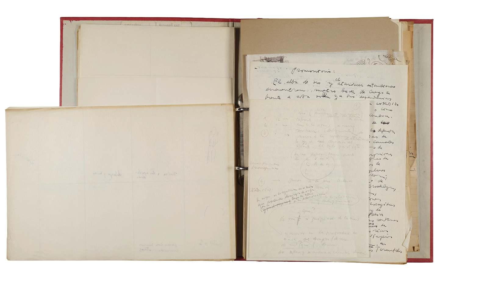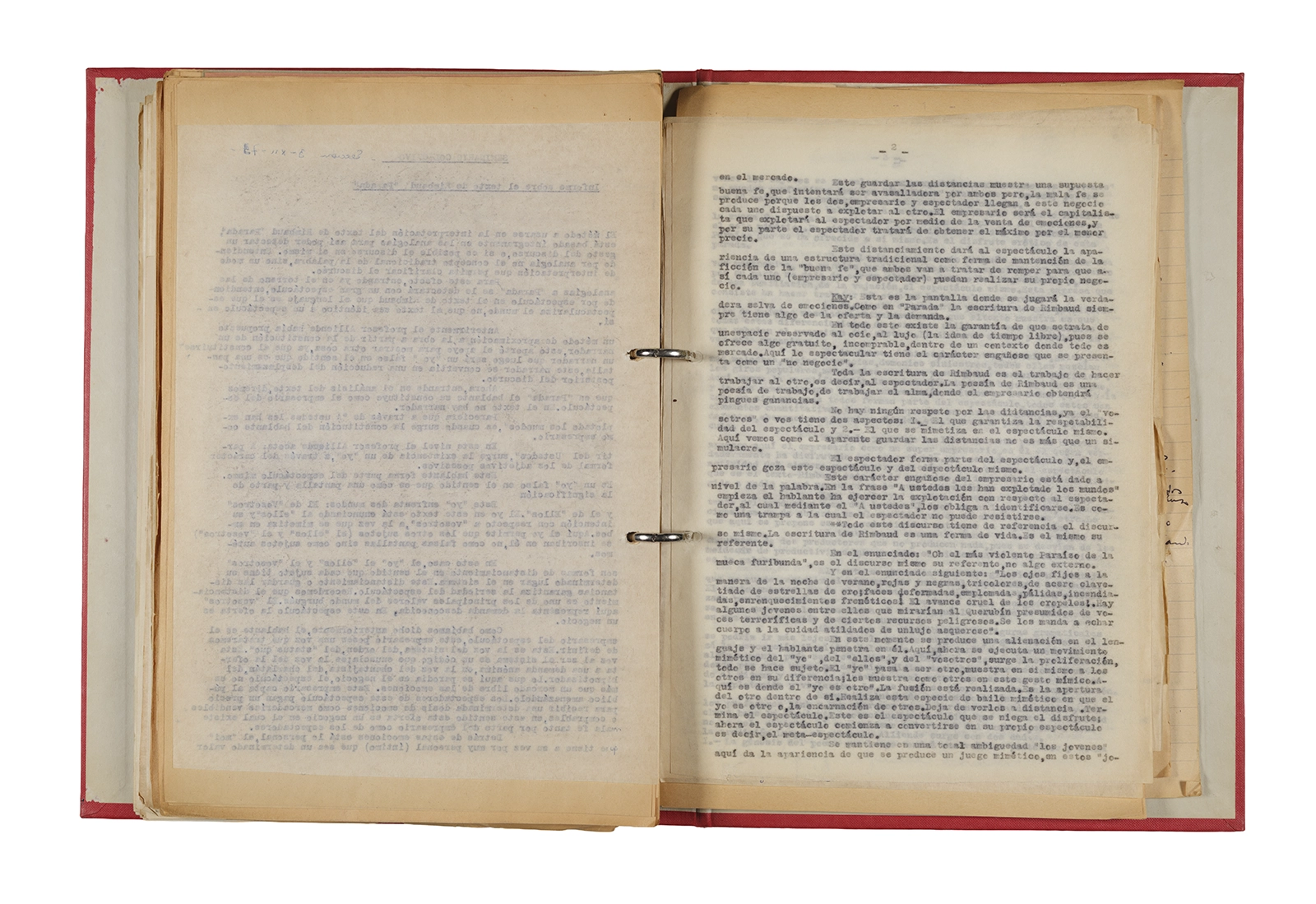 Esta carpeta reúne distintos materiales vinculados al seminario colectivo sobre la poesía de Arthur Rimbaud dictados por Ronald Kay y Enrique Lihn entre 1973 y 1974 en el Departamento de Estudios Humanísticos de la Universidad de Chile. Contiene un análisis mecanografiado del poema “Devoción” de Rimbaud, un dossier preparado para las sesiones del Seminario realizadas durante 1974 con la traducción de veinte textos de “Iluminaciones”, con correcciones y comentarios, así como una selección más breve de traducciones rotuladas “Manuscritos ya publicados por el Departamento de Estudios Humanísticos”. Se incluye aquí también el dibujo de un plano de Santiago, distintos trabajo realizados en el marco del Seminario —entre ellos, el texto “Texto y ‘Realidad'” de Patricio Marchant—, y listas de asistencia de las sesiones realizadas durante noviembre de 1973. Por último, esta carpeta contiene también una serie de diagramas y viñetas con planificaciones de posibles acciones en el espacio público. Estos últimos documentos, fechados en octubre de 1974, incluyen los nombres de los siguientes participantes del seminario Signometraje, también dictado por Kay en el DEH: Juan Balbontín, Diamela Eltit, Catalina Parra y Raúl Zurita.