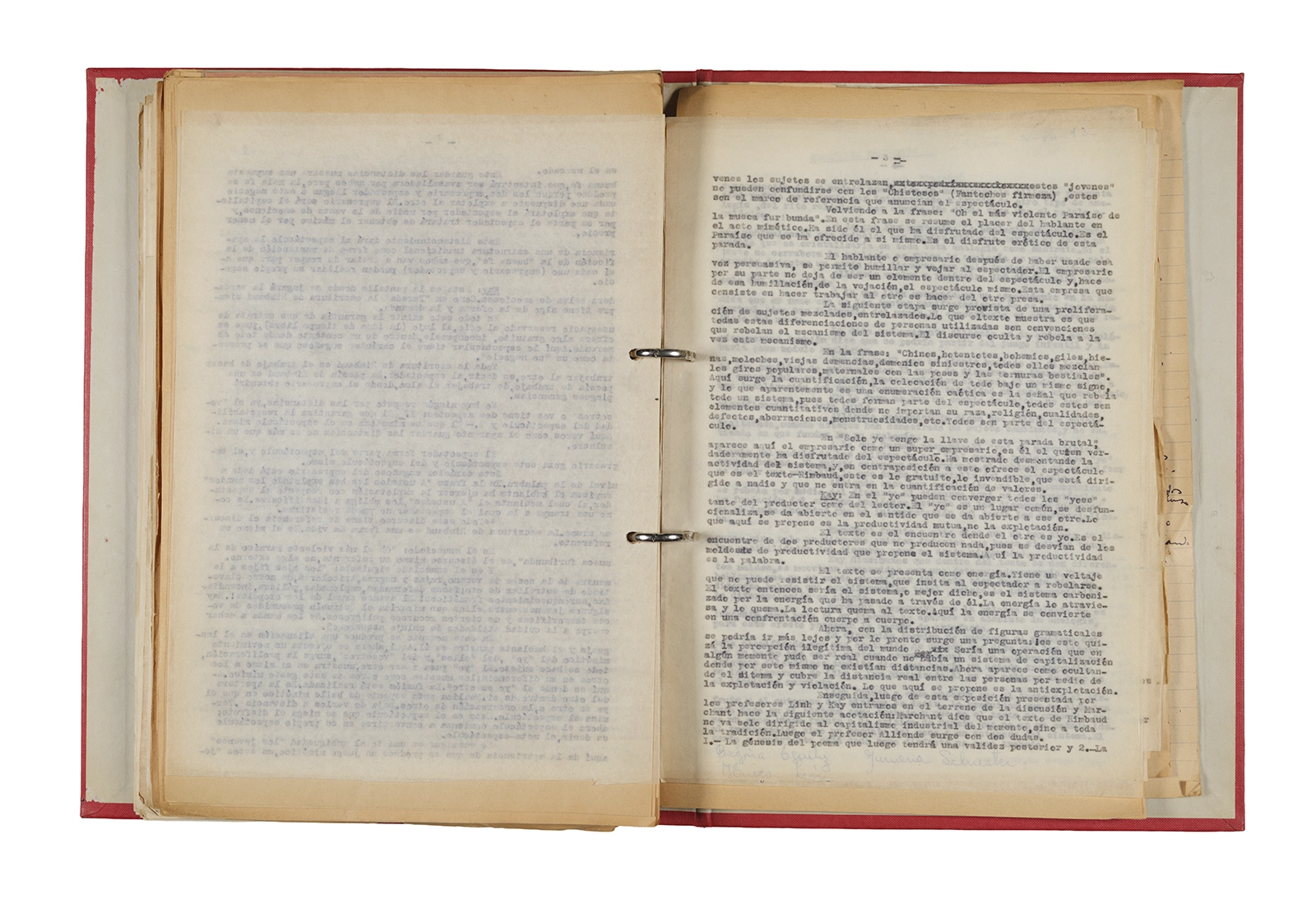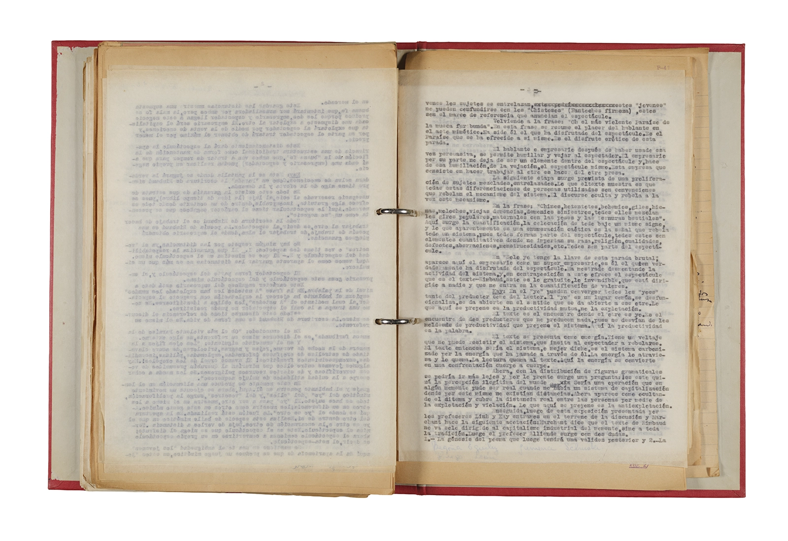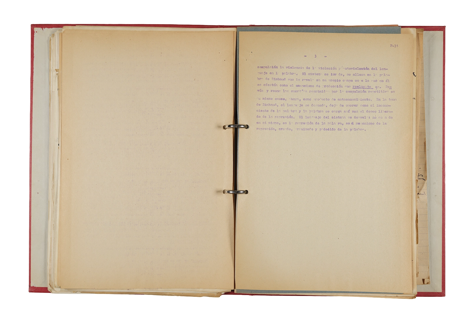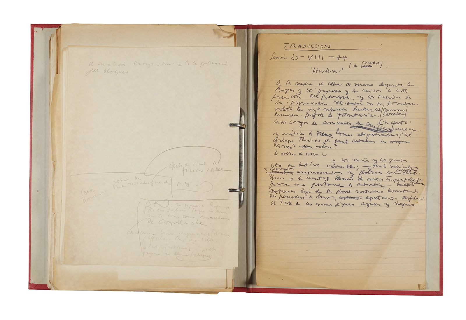 Esta carpeta reúne distintos materiales vinculados al seminario colectivo sobre la poesía de Arthur Rimbaud dictados por Ronald Kay y Enrique Lihn entre 1973 y 1974 en el Departamento de Estudios Humanísticos de la Universidad de Chile. Contiene un análisis mecanografiado del poema “Devoción” de Rimbaud, un dossier preparado para las sesiones del Seminario realizadas durante 1974 con la traducción de veinte textos de “Iluminaciones”, con correcciones y comentarios, así como una selección más breve de traducciones rotuladas “Manuscritos ya publicados por el Departamento de Estudios Humanísticos”. Se incluye aquí también el dibujo de un plano de Santiago, distintos trabajo realizados en el marco del Seminario —entre ellos, el texto “Texto y ‘Realidad'” de Patricio Marchant—, y listas de asistencia de las sesiones realizadas durante noviembre de 1973. Por último, esta carpeta contiene también una serie de diagramas y viñetas con planificaciones de posibles acciones en el espacio público. Estos últimos documentos, fechados en octubre de 1974, incluyen los nombres de los siguientes participantes del seminario Signometraje, también dictado por Kay en el DEH: Juan Balbontín, Diamela Eltit, Catalina Parra y Raúl Zurita.