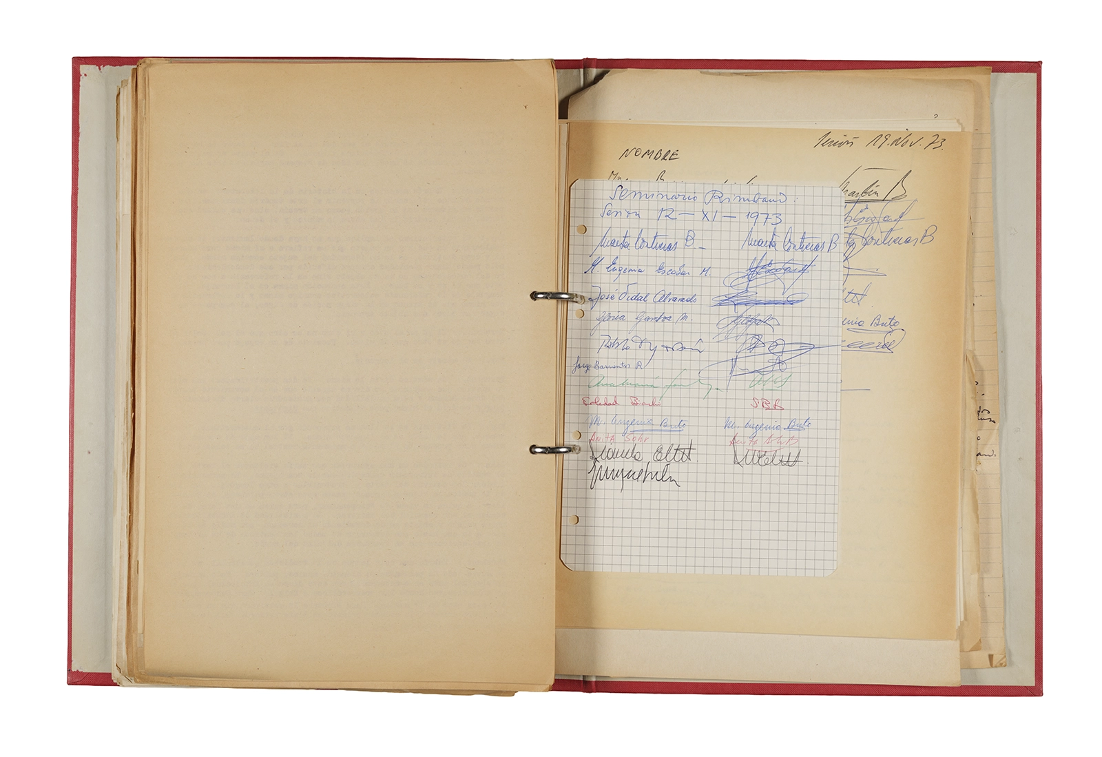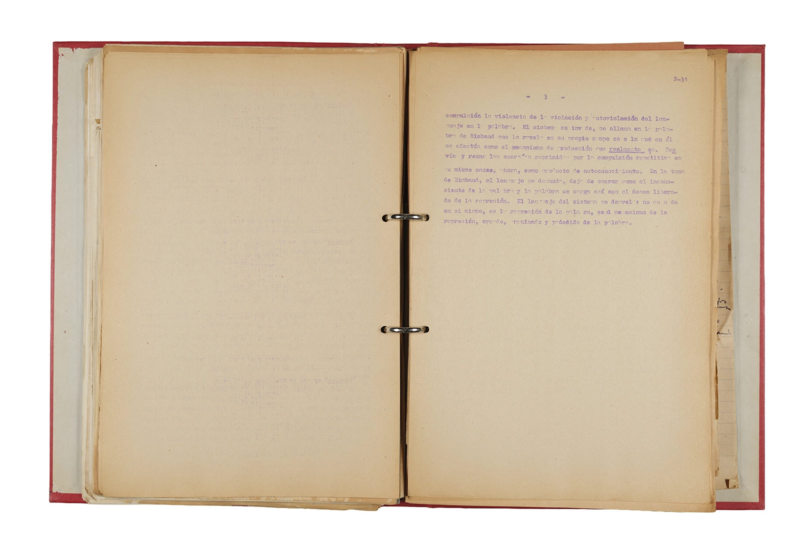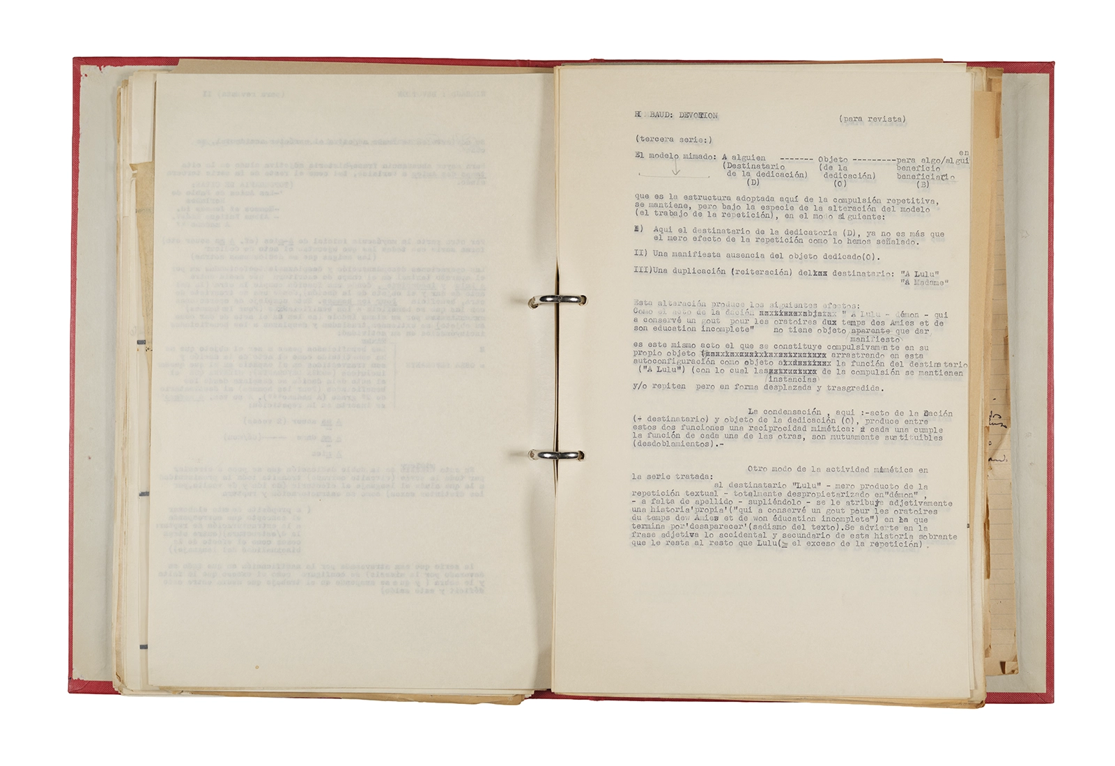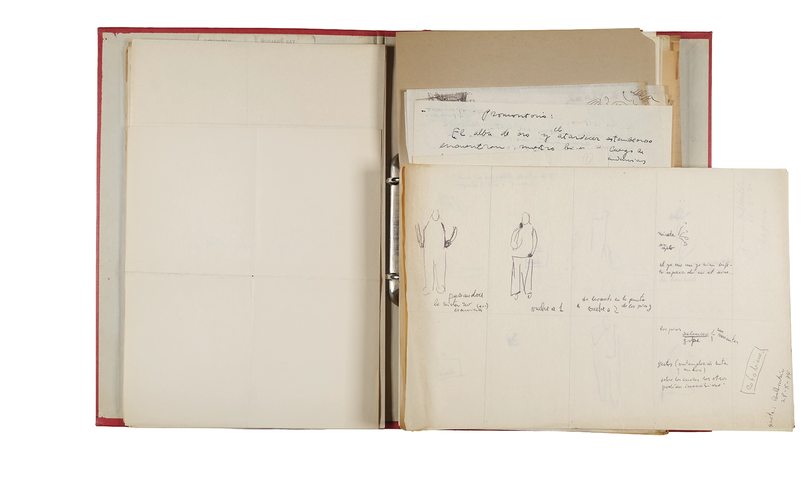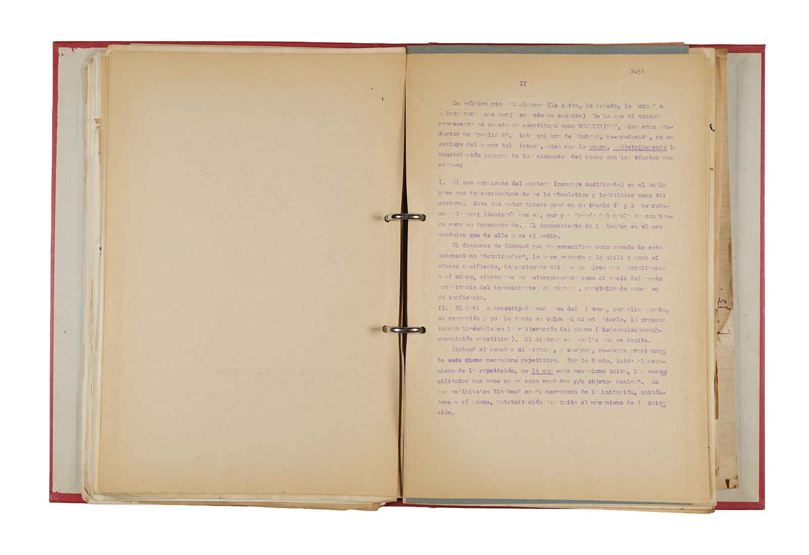 Esta carpeta reúne distintos materiales vinculados al seminario colectivo sobre la poesía de Arthur Rimbaud dictados por Ronald Kay y Enrique Lihn entre 1973 y 1974 en el Departamento de Estudios Humanísticos de la Universidad de Chile. Contiene un análisis mecanografiado del poema “Devoción” de Rimbaud, un dossier preparado para las sesiones del Seminario realizadas durante 1974 con la traducción de veinte textos de “Iluminaciones”, con correcciones y comentarios, así como una selección más breve de traducciones rotuladas “Manuscritos ya publicados por el Departamento de Estudios Humanísticos”. Se incluye aquí también el dibujo de un plano de Santiago, distintos trabajo realizados en el marco del Seminario —entre ellos, el texto “Texto y ‘Realidad'” de Patricio Marchant—, y listas de asistencia de las sesiones realizadas durante noviembre de 1973. Por último, esta carpeta contiene también una serie de diagramas y viñetas con planificaciones de posibles acciones en el espacio público. Estos últimos documentos, fechados en octubre de 1974, incluyen los nombres de los siguientes participantes del seminario Signometraje, también dictado por Kay en el DEH: Juan Balbontín, Diamela Eltit, Catalina Parra y Raúl Zurita.