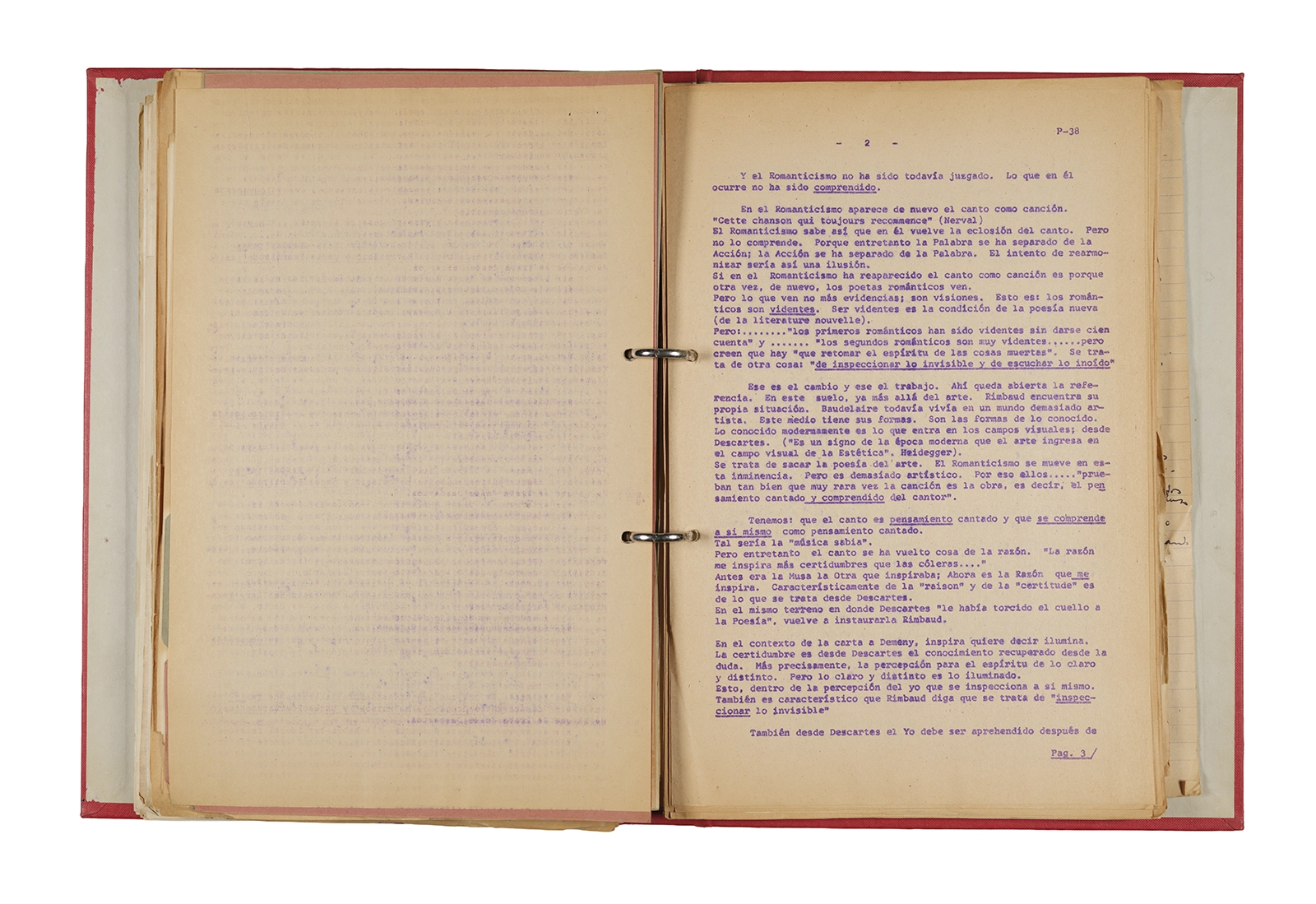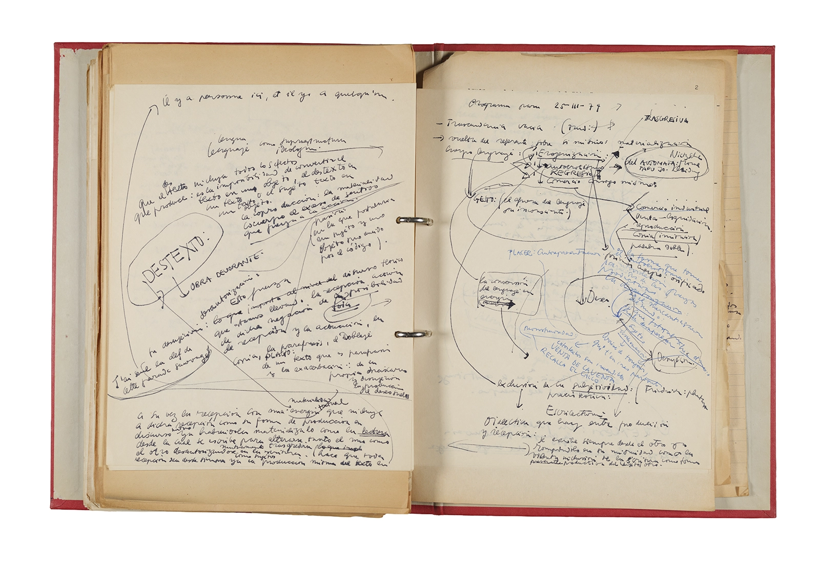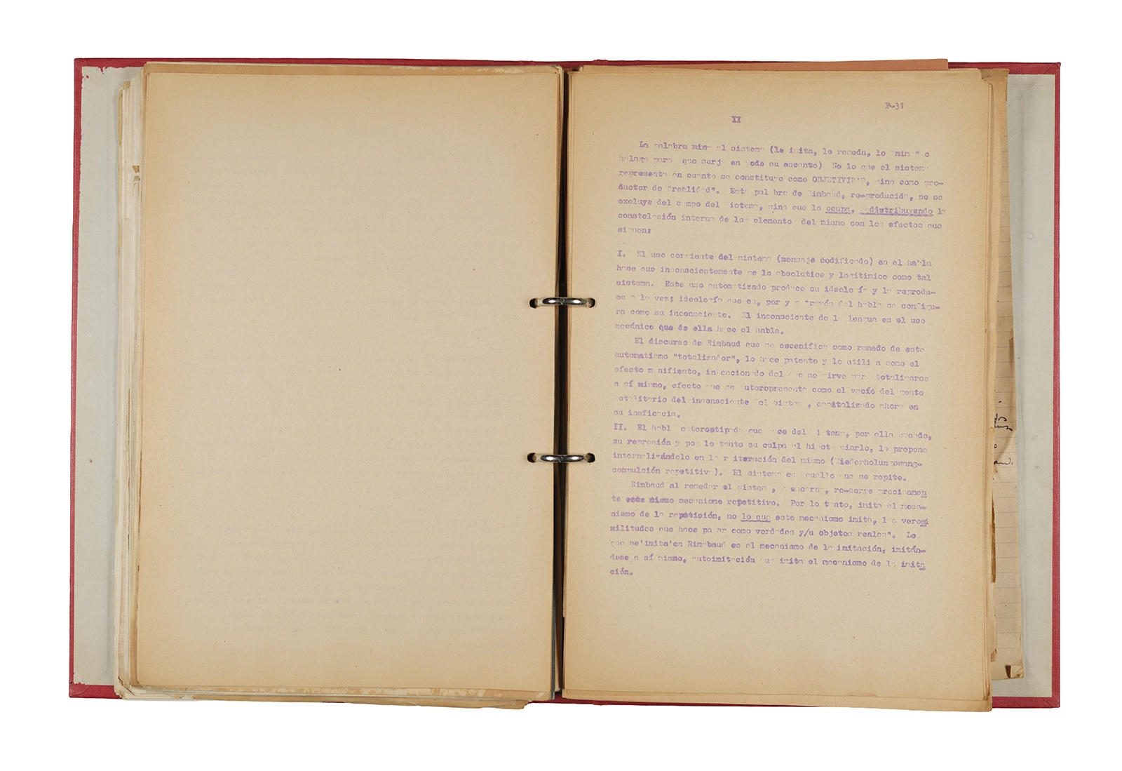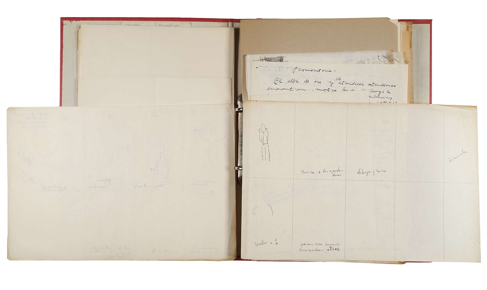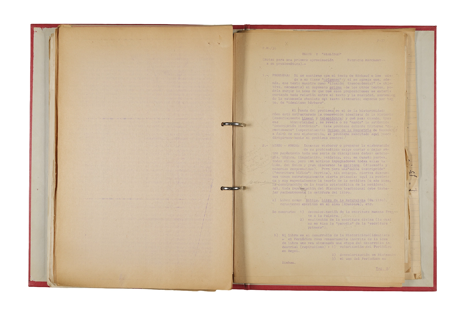 Esta carpeta reúne distintos materiales vinculados al seminario colectivo sobre la poesía de Arthur Rimbaud dictados por Ronald Kay y Enrique Lihn entre 1973 y 1974 en el Departamento de Estudios Humanísticos de la Universidad de Chile. Contiene un análisis mecanografiado del poema “Devoción” de Rimbaud, un dossier preparado para las sesiones del Seminario realizadas durante 1974 con la traducción de veinte textos de “Iluminaciones”, con correcciones y comentarios, así como una selección más breve de traducciones rotuladas “Manuscritos ya publicados por el Departamento de Estudios Humanísticos”. Se incluye aquí también el dibujo de un plano de Santiago, distintos trabajo realizados en el marco del Seminario —entre ellos, el texto “Texto y ‘Realidad'” de Patricio Marchant—, y listas de asistencia de las sesiones realizadas durante noviembre de 1973. Por último, esta carpeta contiene también una serie de diagramas y viñetas con planificaciones de posibles acciones en el espacio público. Estos últimos documentos, fechados en octubre de 1974, incluyen los nombres de los siguientes participantes del seminario Signometraje, también dictado por Kay en el DEH: Juan Balbontín, Diamela Eltit, Catalina Parra y Raúl Zurita.