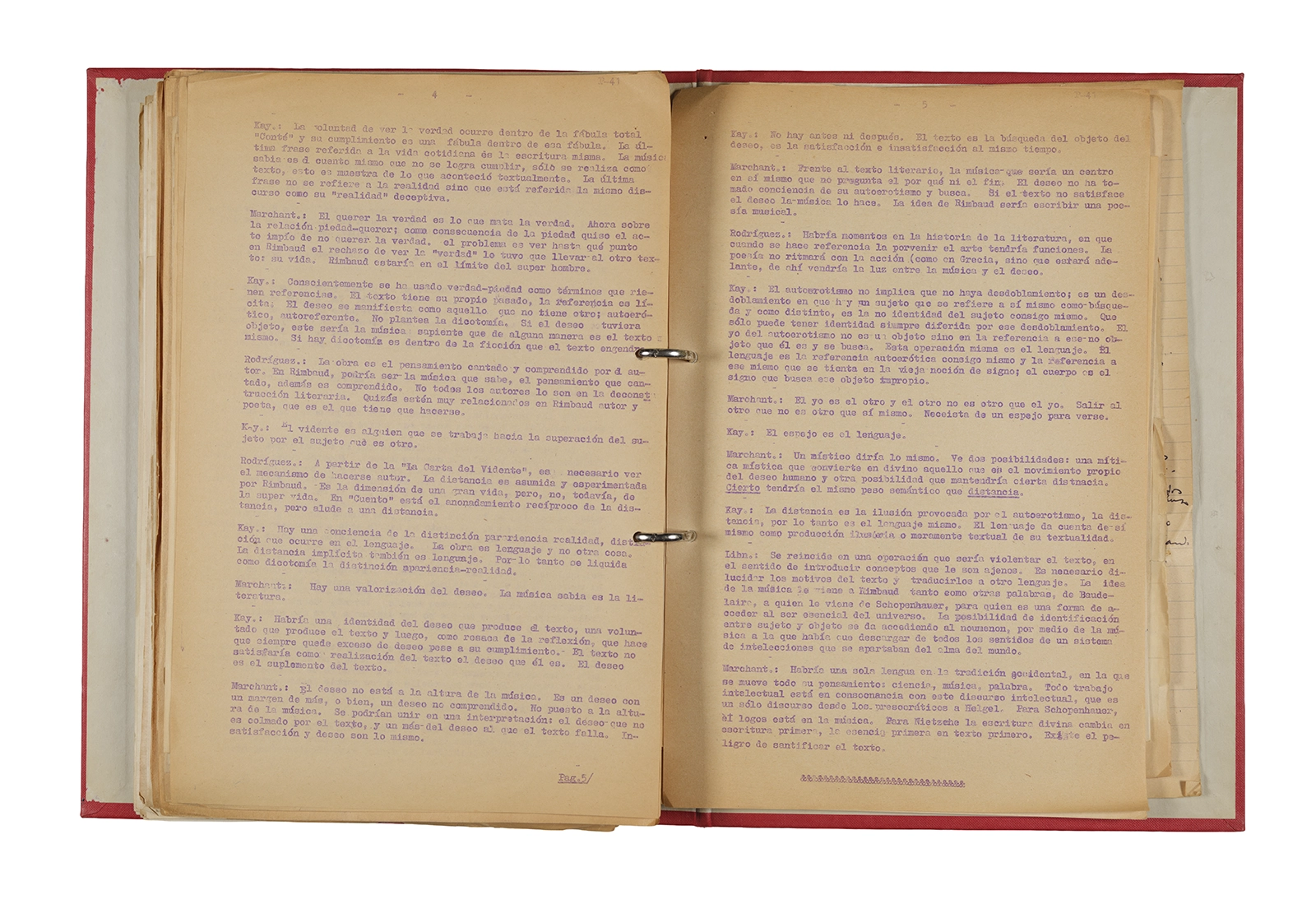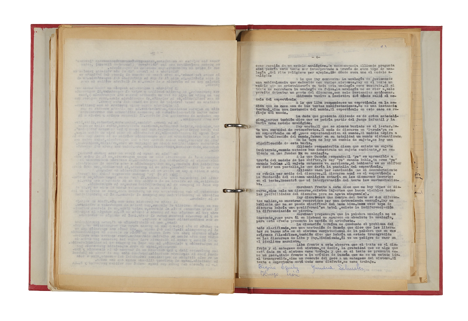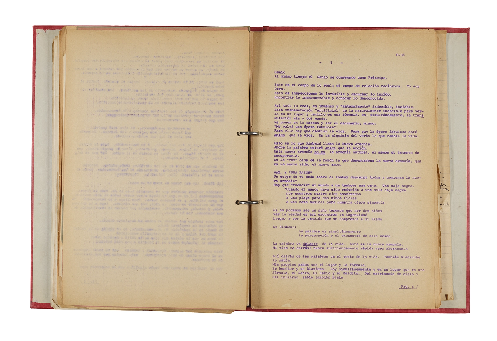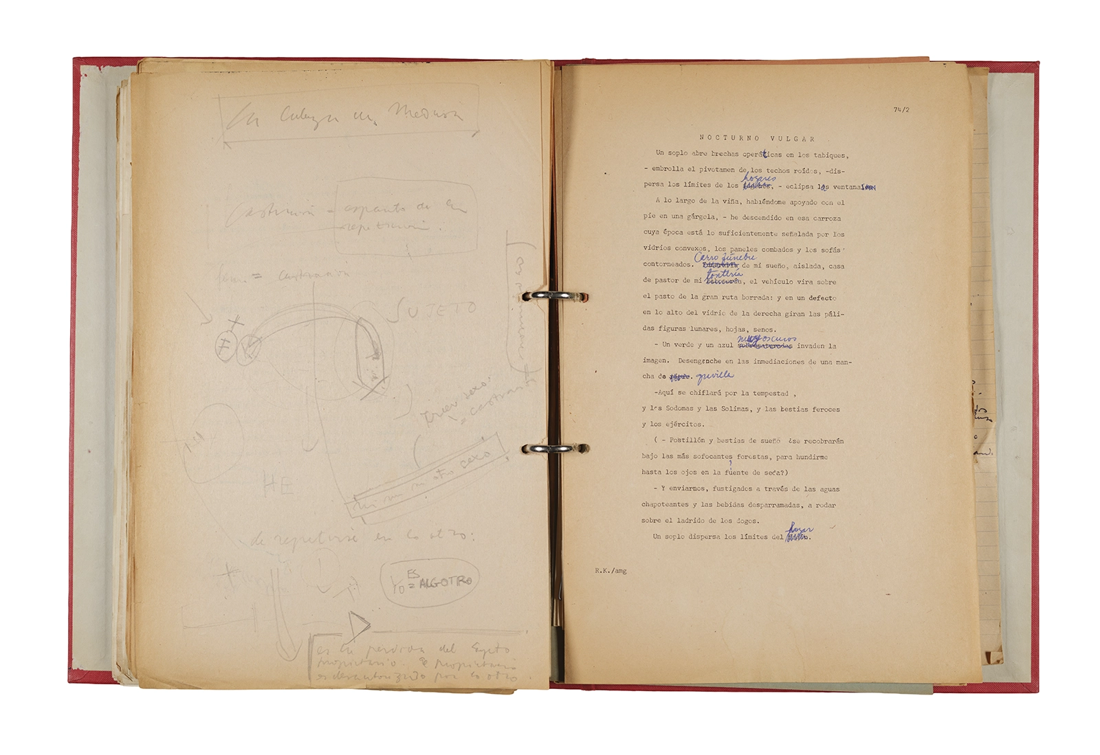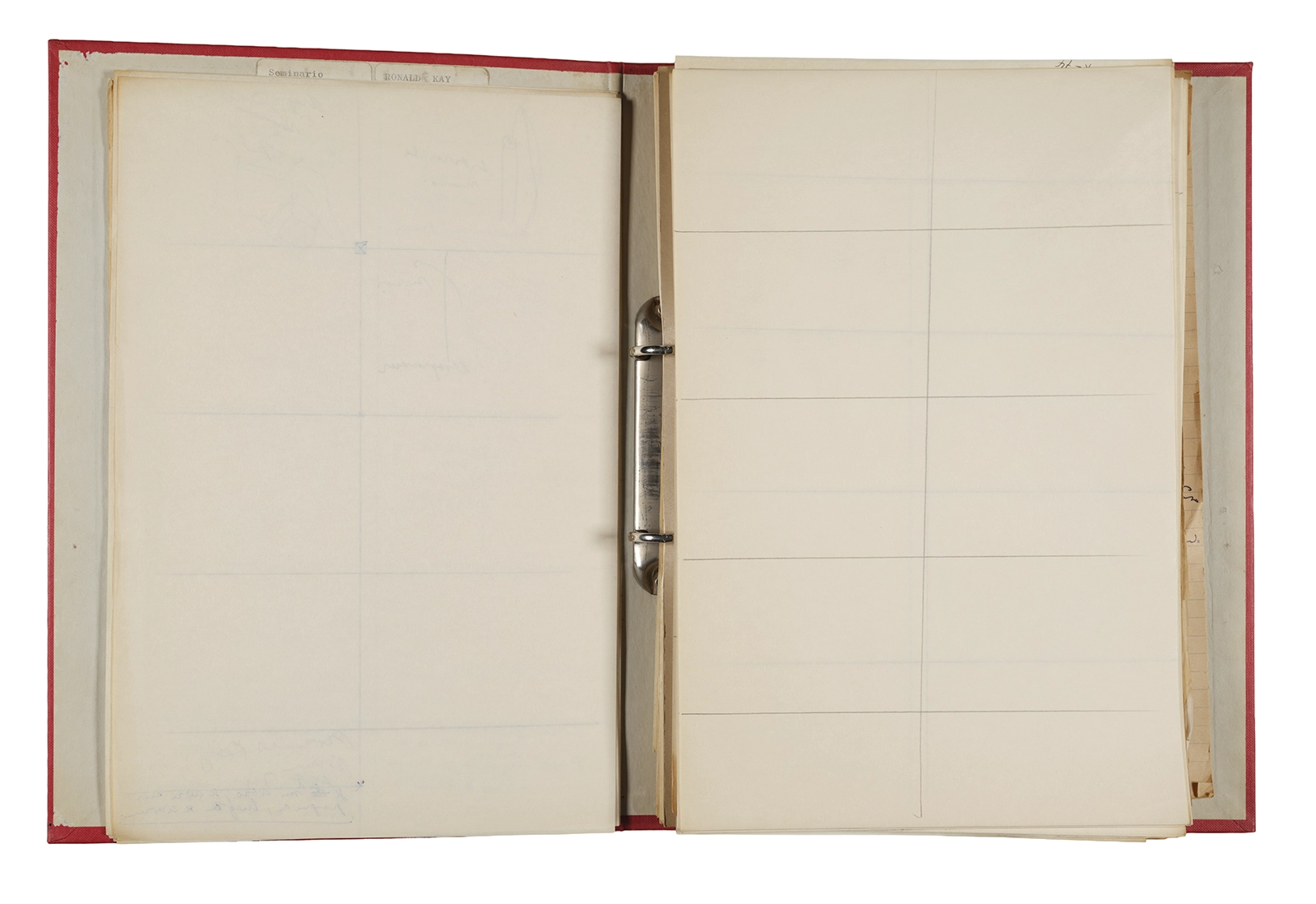Esta carpeta reúne distintos materiales vinculados al seminario colectivo sobre la poesía de Arthur Rimbaud dictados por Ronald Kay y Enrique Lihn entre 1973 y 1974 en el Departamento de Estudios Humanísticos de la Universidad de Chile. Contiene un análisis mecanografiado del poema “Devoción” de Rimbaud, un dossier preparado para las sesiones del Seminario realizadas durante 1974 con la traducción de veinte textos de “Iluminaciones”, con correcciones y comentarios, así como una selección más breve de traducciones rotuladas “Manuscritos ya publicados por el Departamento de Estudios Humanísticos”. Se incluye aquí también el dibujo de un plano de Santiago, distintos trabajo realizados en el marco del Seminario —entre ellos, el texto “Texto y ‘Realidad'” de Patricio Marchant—, y listas de asistencia de las sesiones realizadas durante noviembre de 1973. Por último, esta carpeta contiene también una serie de diagramas y viñetas con planificaciones de posibles acciones en el espacio público. Estos últimos documentos, fechados en octubre de 1974, incluyen los nombres de los siguientes participantes del seminario Signometraje, también dictado por Kay en el DEH: Juan Balbontín, Diamela Eltit, Catalina Parra y Raúl Zurita.