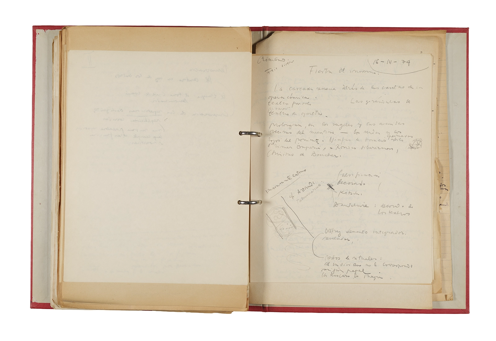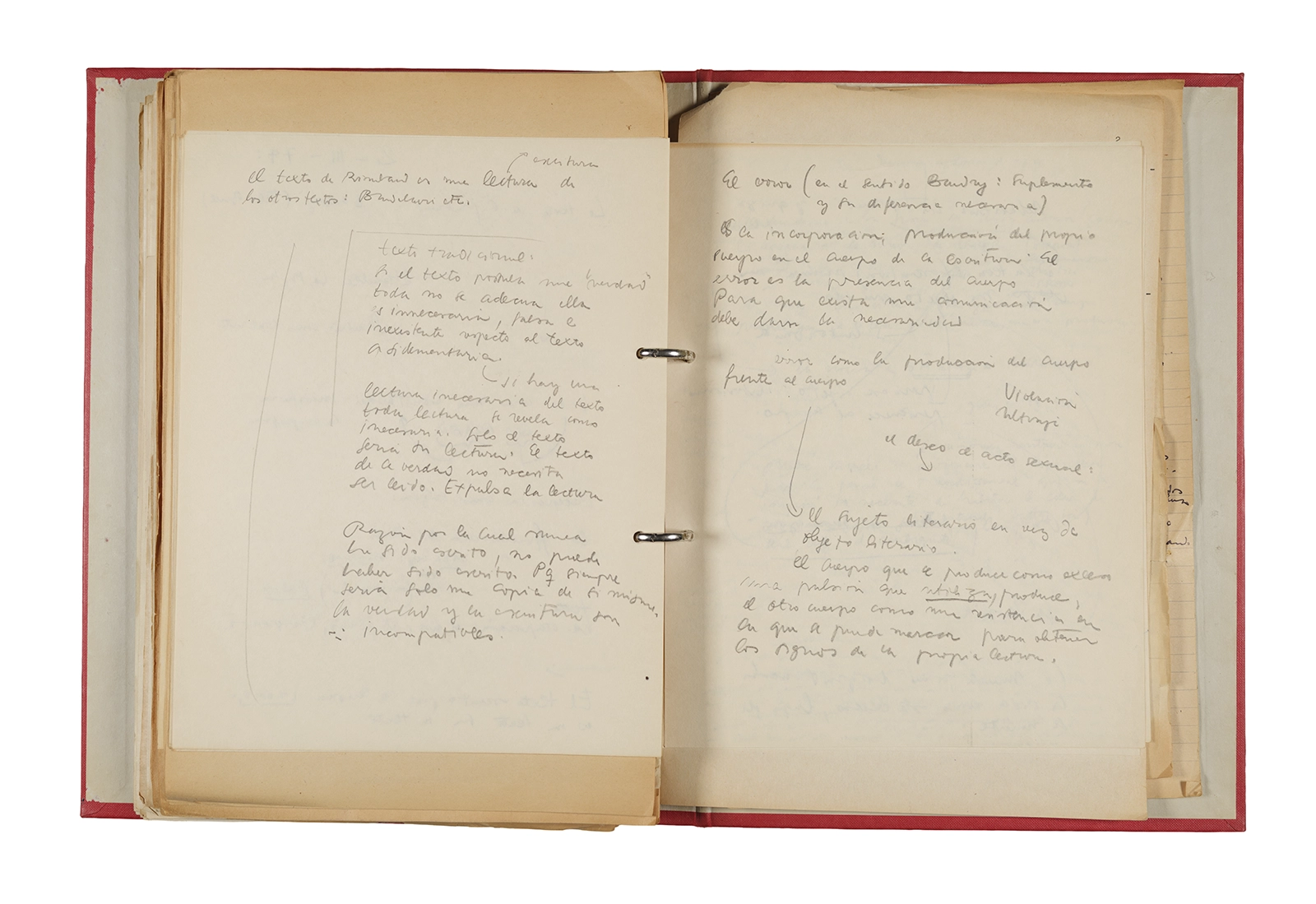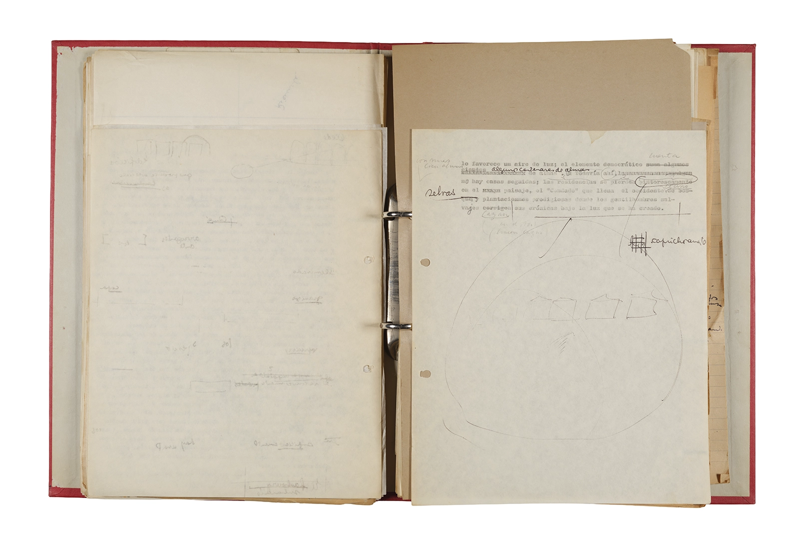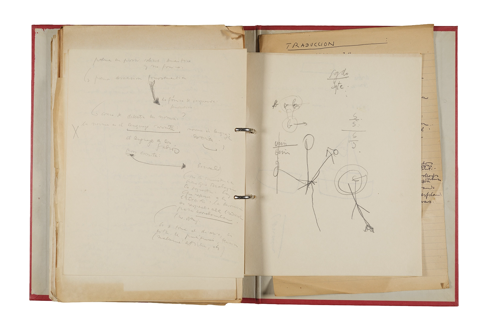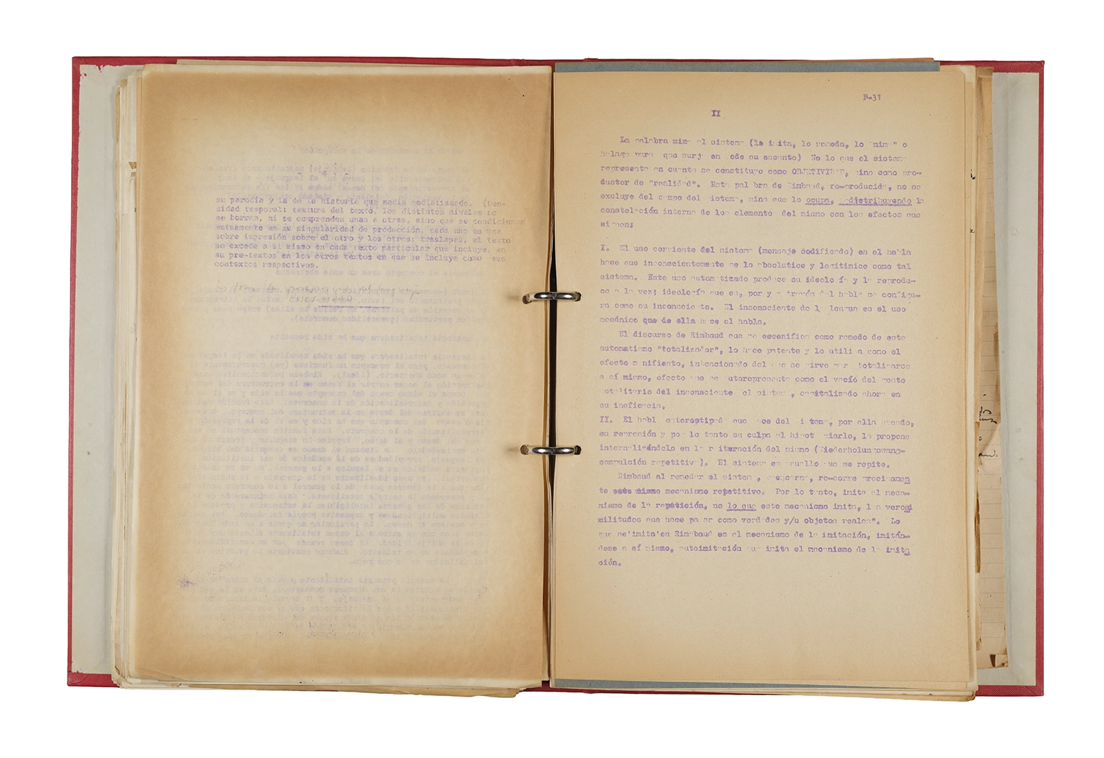 Esta carpeta reúne distintos materiales vinculados al seminario colectivo sobre la poesía de Arthur Rimbaud dictados por Ronald Kay y Enrique Lihn entre 1973 y 1974 en el Departamento de Estudios Humanísticos de la Universidad de Chile. Contiene un análisis mecanografiado del poema “Devoción” de Rimbaud, un dossier preparado para las sesiones del Seminario realizadas durante 1974 con la traducción de veinte textos de “Iluminaciones”, con correcciones y comentarios, así como una selección más breve de traducciones rotuladas “Manuscritos ya publicados por el Departamento de Estudios Humanísticos”. Se incluye aquí también el dibujo de un plano de Santiago, distintos trabajo realizados en el marco del Seminario —entre ellos, el texto “Texto y ‘Realidad'” de Patricio Marchant—, y listas de asistencia de las sesiones realizadas durante noviembre de 1973. Por último, esta carpeta contiene también una serie de diagramas y viñetas con planificaciones de posibles acciones en el espacio público. Estos últimos documentos, fechados en octubre de 1974, incluyen los nombres de los siguientes participantes del seminario Signometraje, también dictado por Kay en el DEH: Juan Balbontín, Diamela Eltit, Catalina Parra y Raúl Zurita.